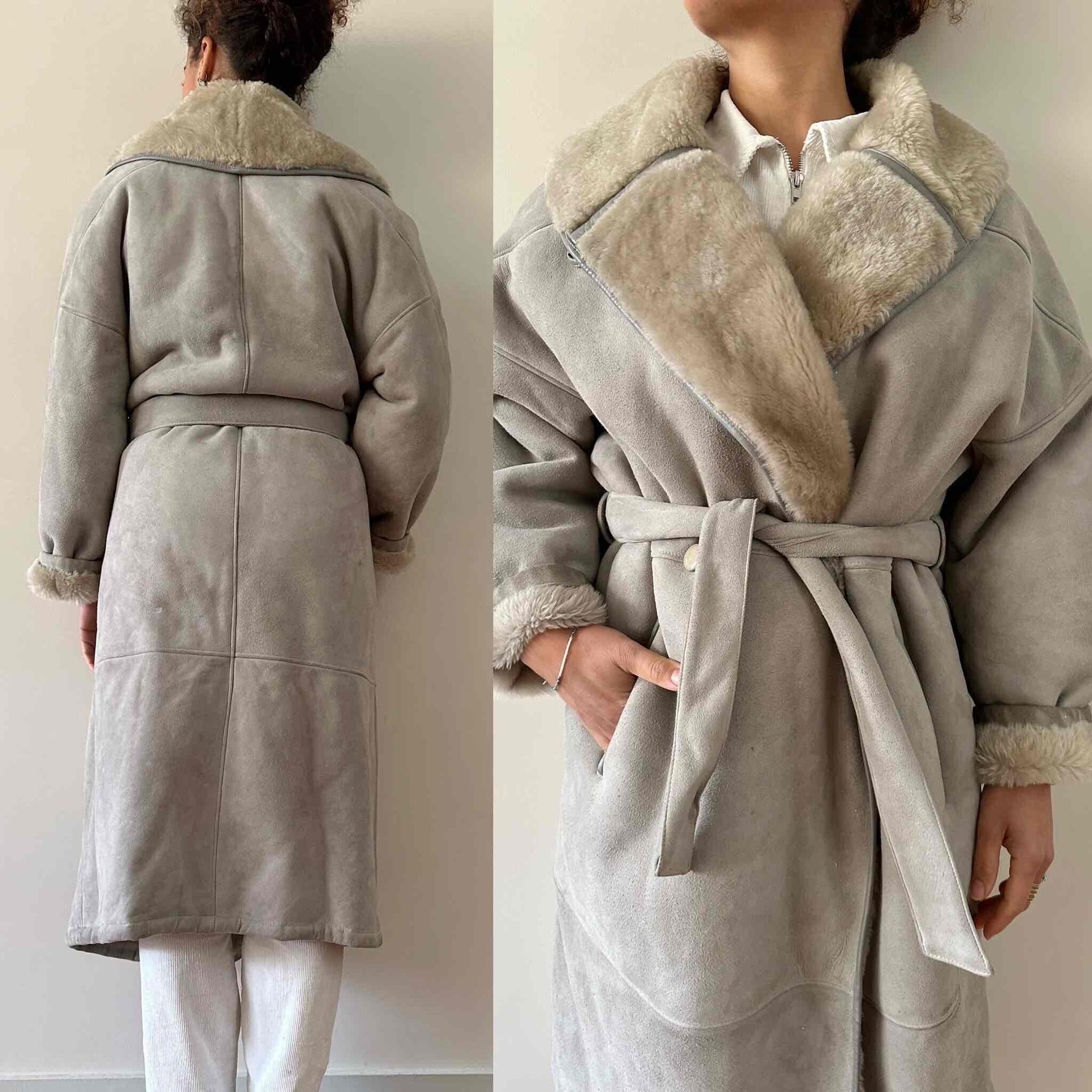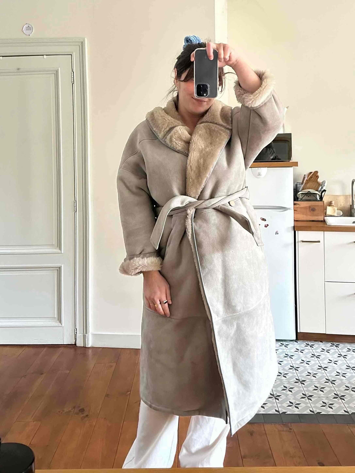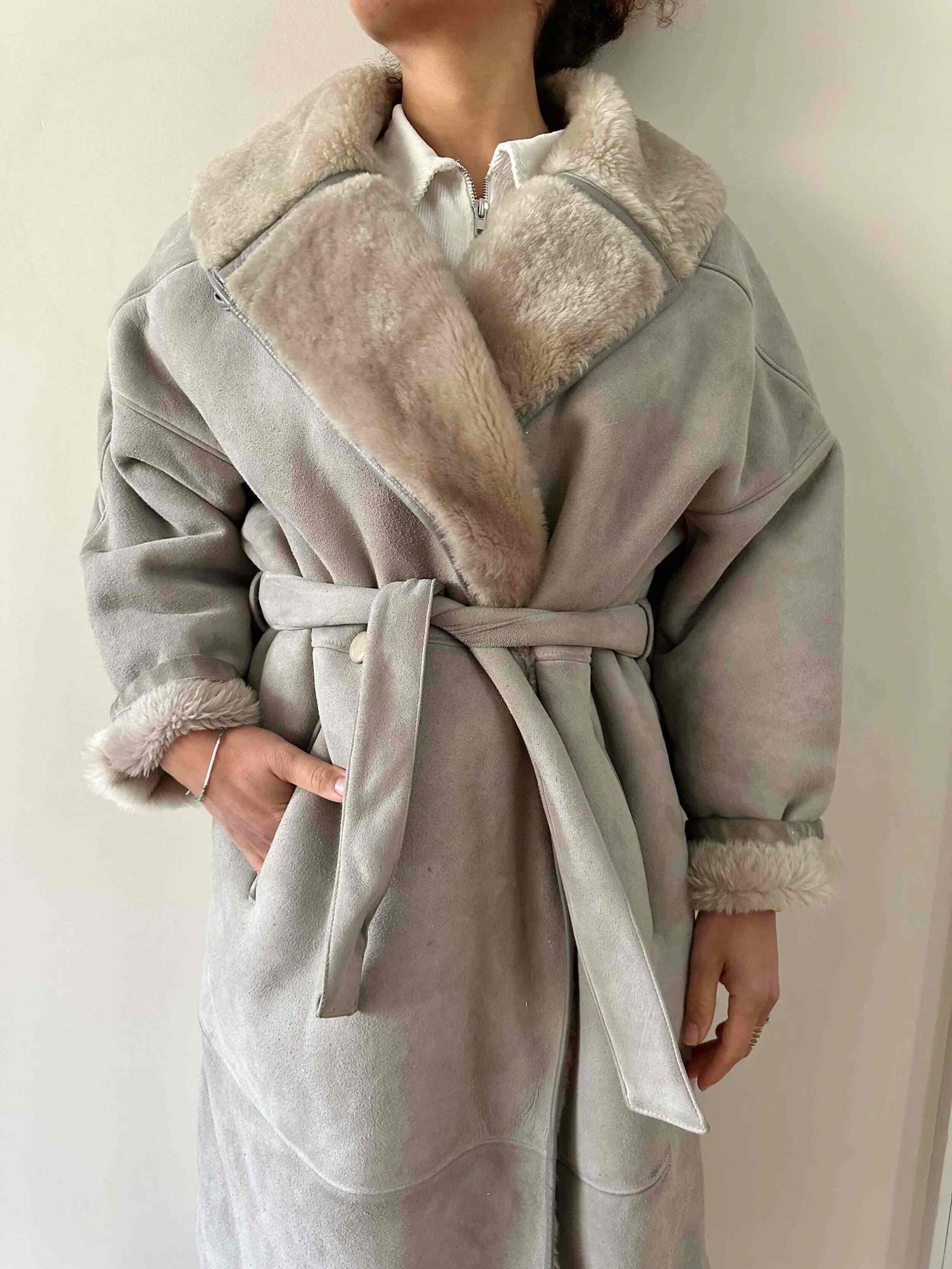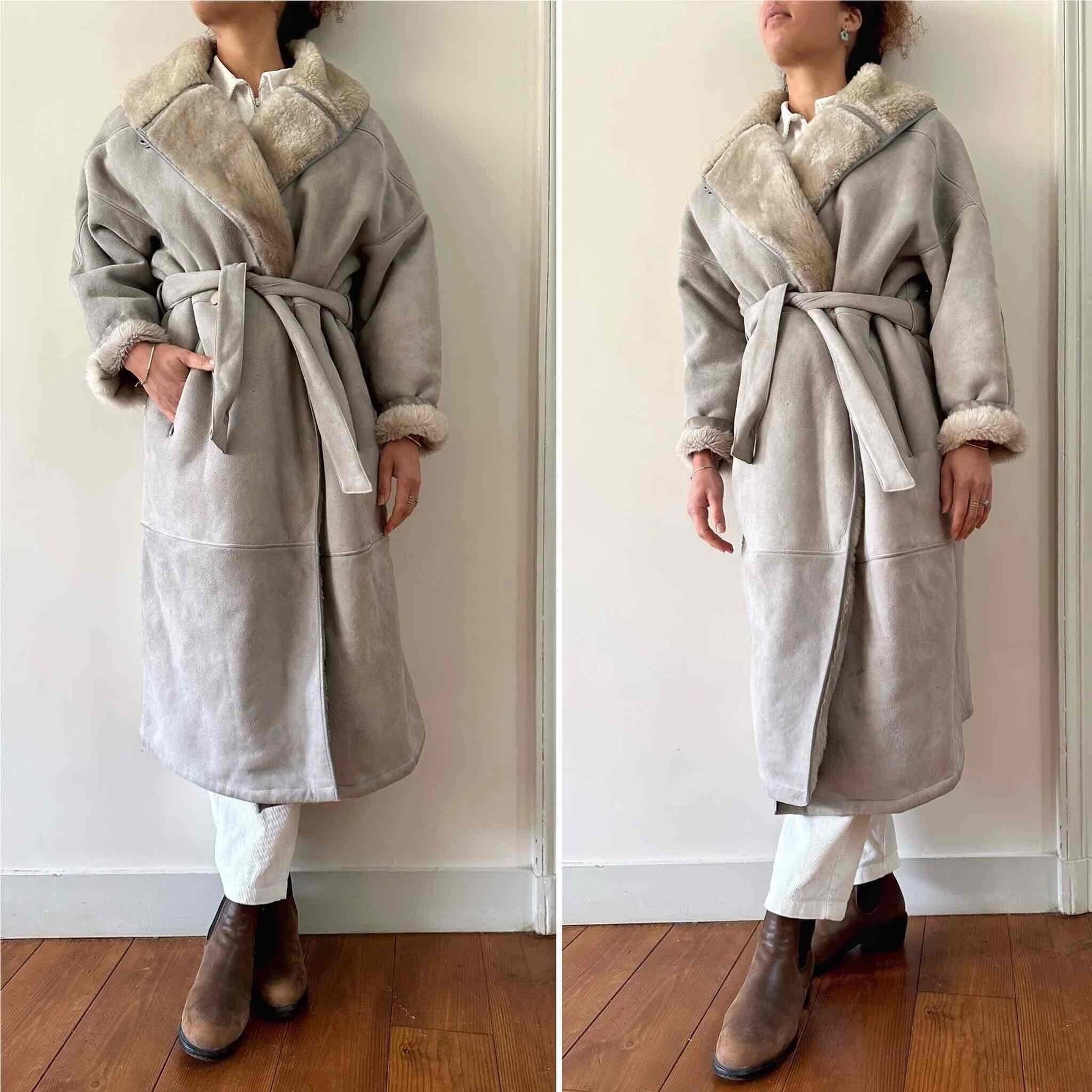 Prix unitaire parPeau lainee en mouton retourné extérieur daim velouté gris clair, intérieur mouton beige, forme Penny lane longue, boutonnage croisé et ceinture à nouer façon peignoir, grand col châle, fabriqué en Italie, taille 38 porté ici sur une personne T36 et une personne T40.