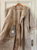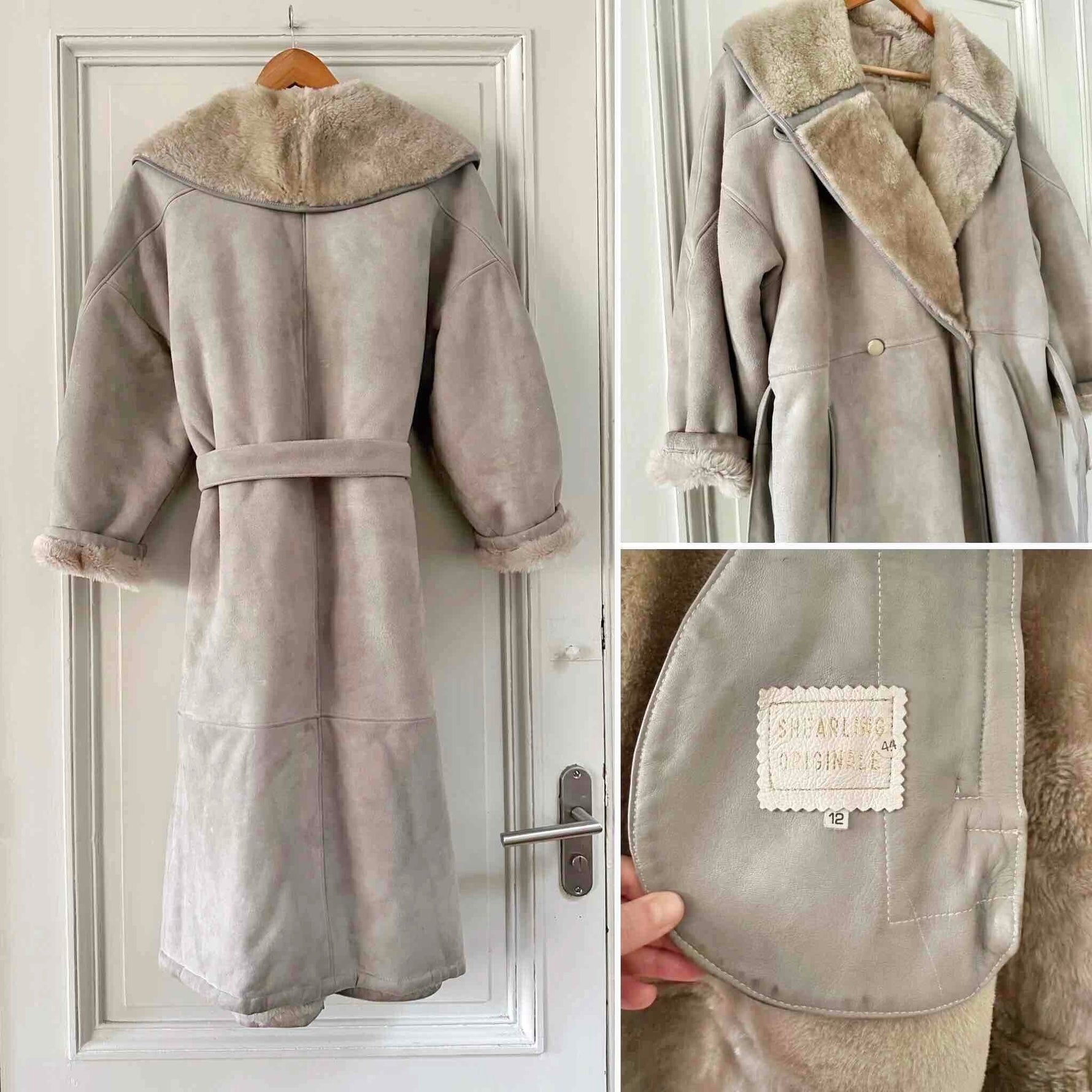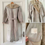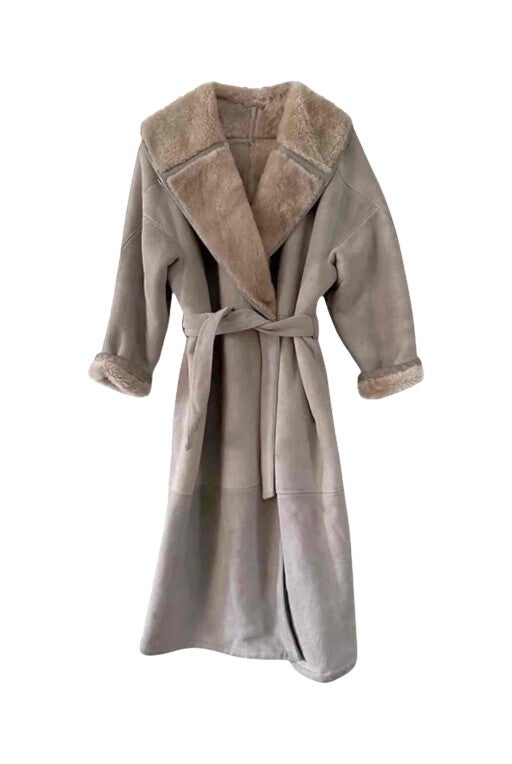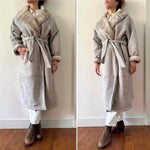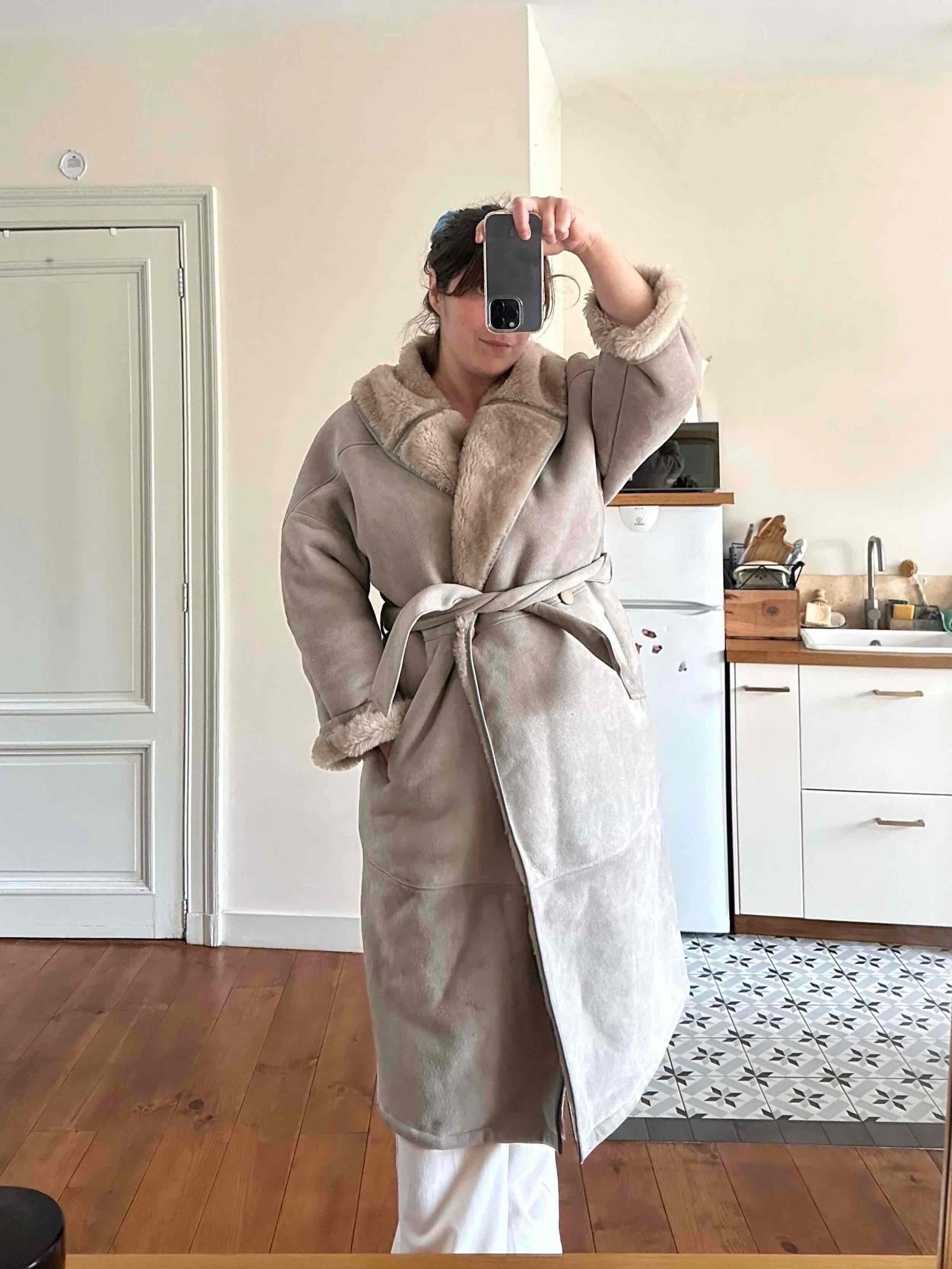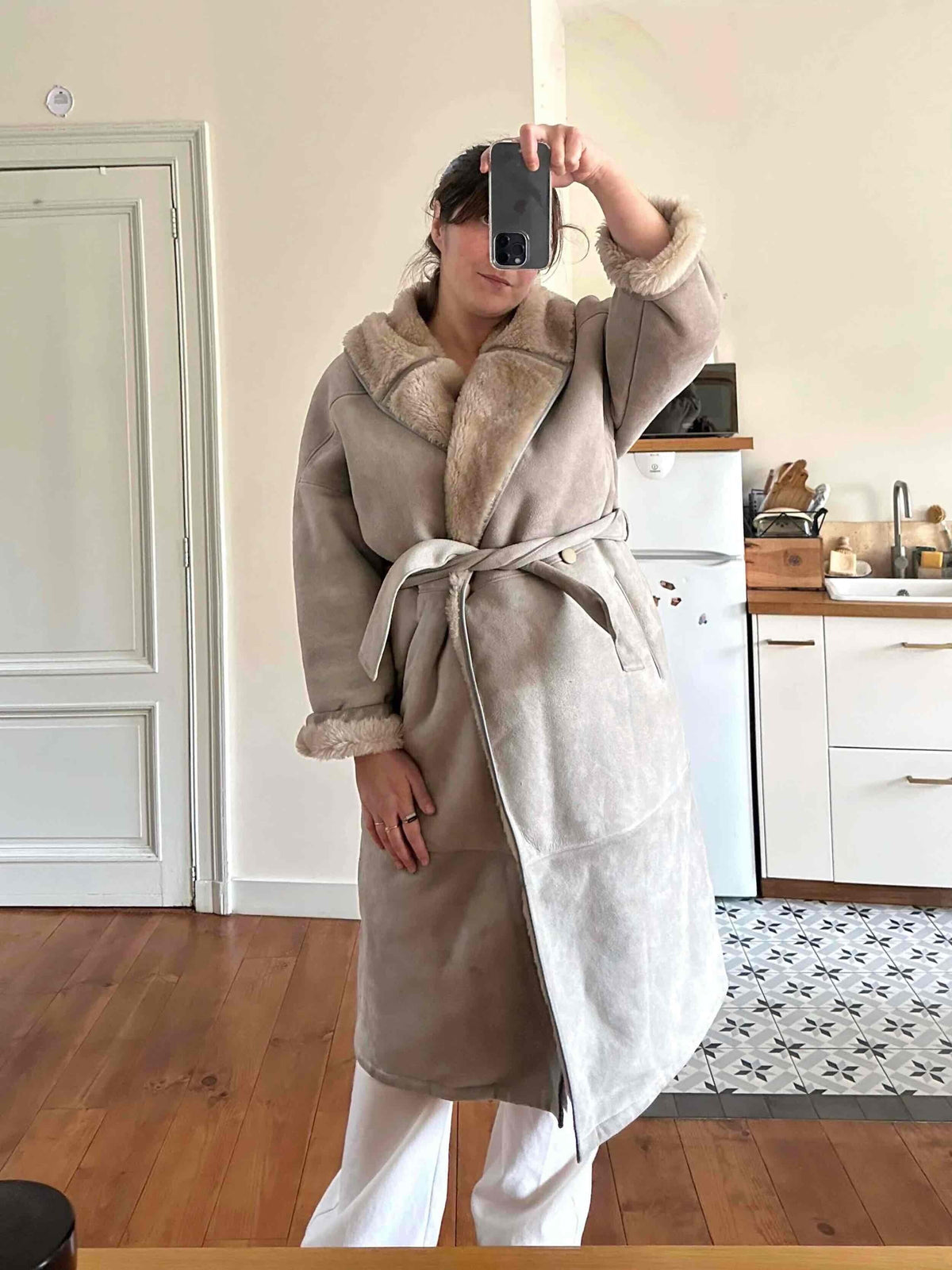 Prix unitaire parPeau lainee en mouton retourné extérieur daim velouté gris clair, intérieur mouton beige, forme Penny lane longue, boutonnage croisé et ceinture à nouer façon peignoir, grand col châle, fabriqué en Italie, taille 38 porté ici sur une personne T36 et une personne T40.