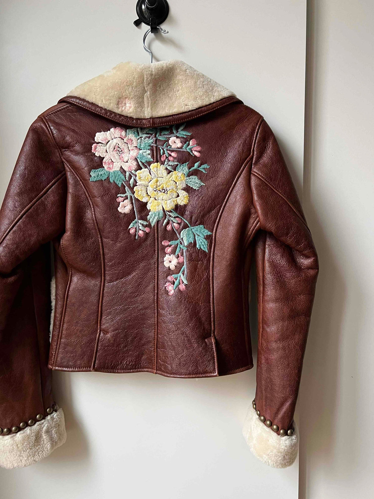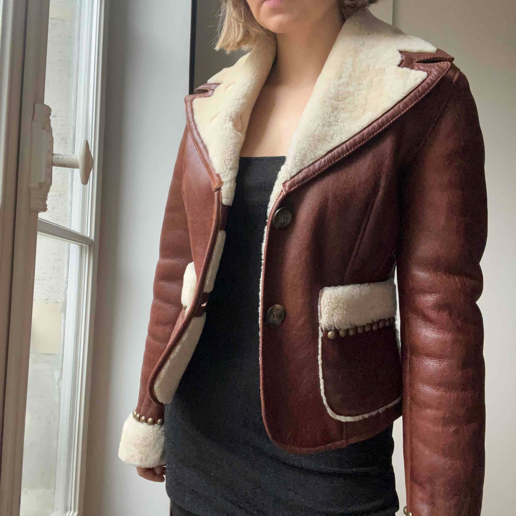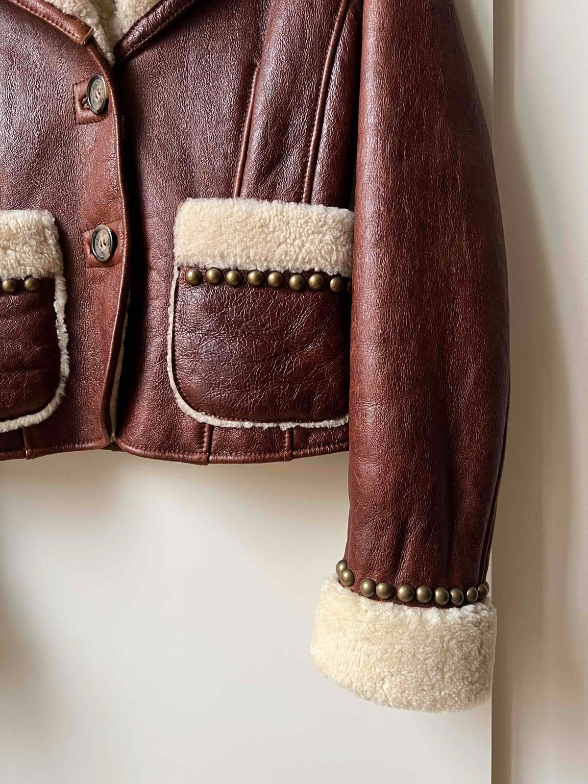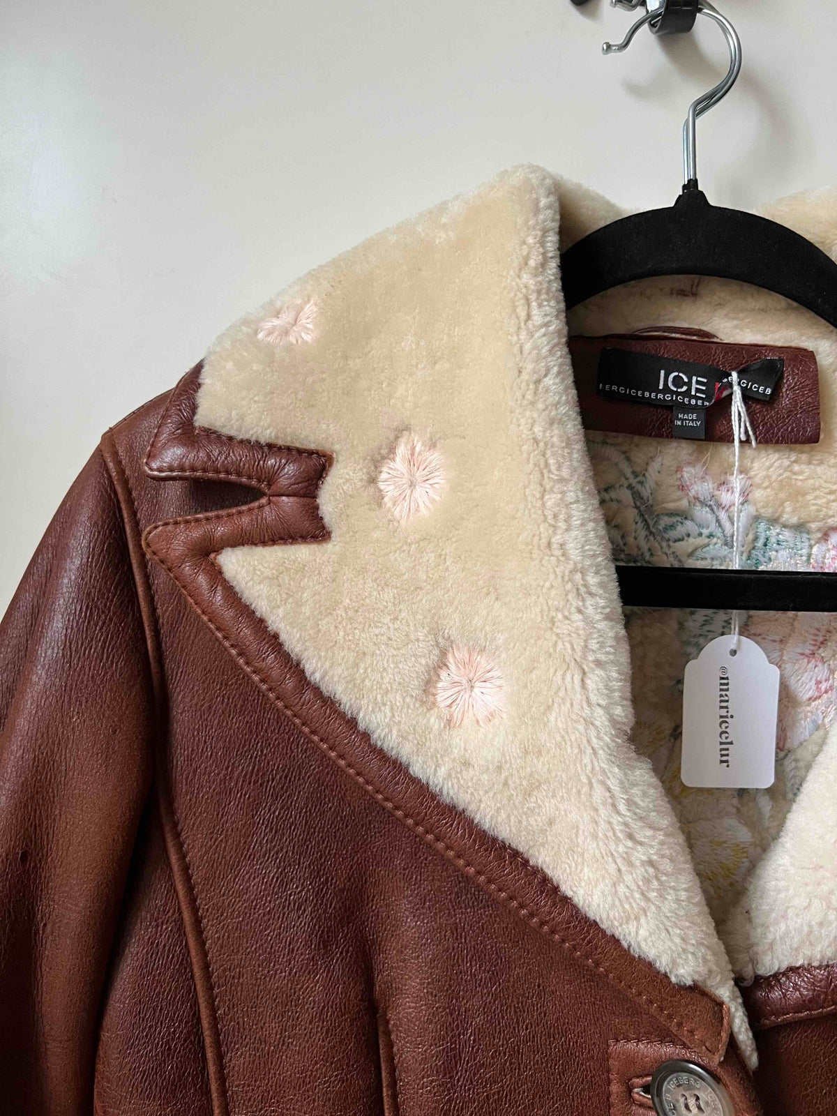 Prix unitaire parManteau court en peau lainée marron et beige de la marque Iceberg. Convient pour une taille XS ou S. Décoré de clous en métal et brodé de fleurs dans le dos. Aucun défaut. Intérieur en mouton très doux.