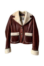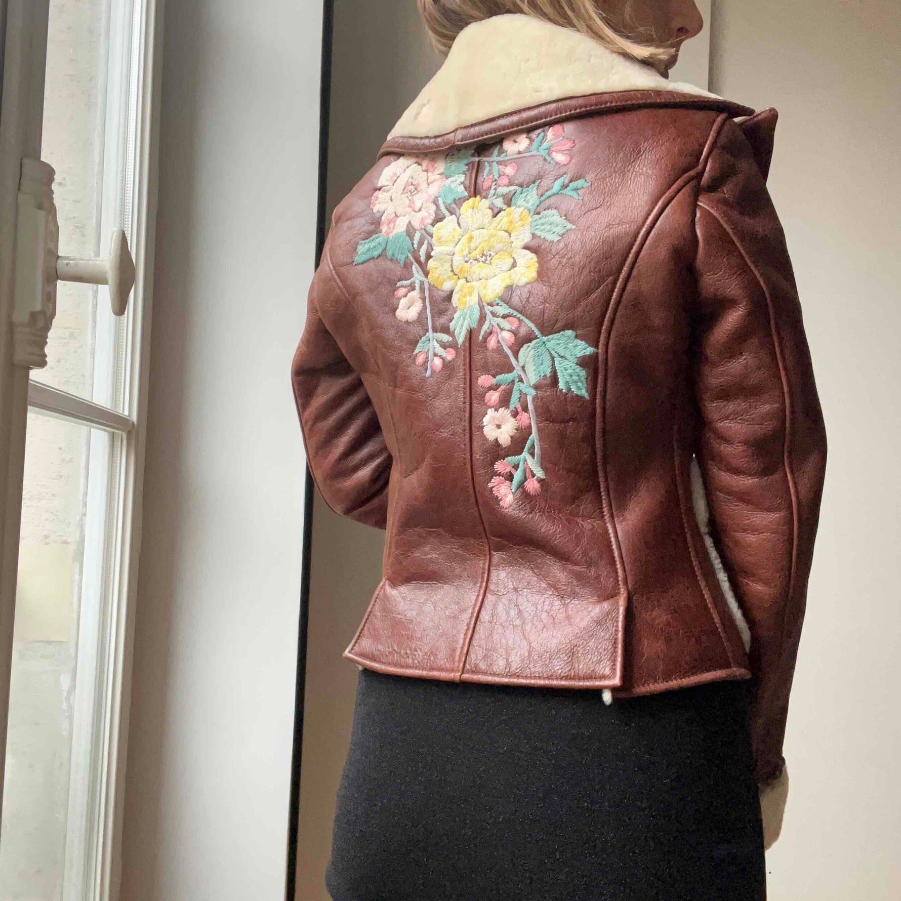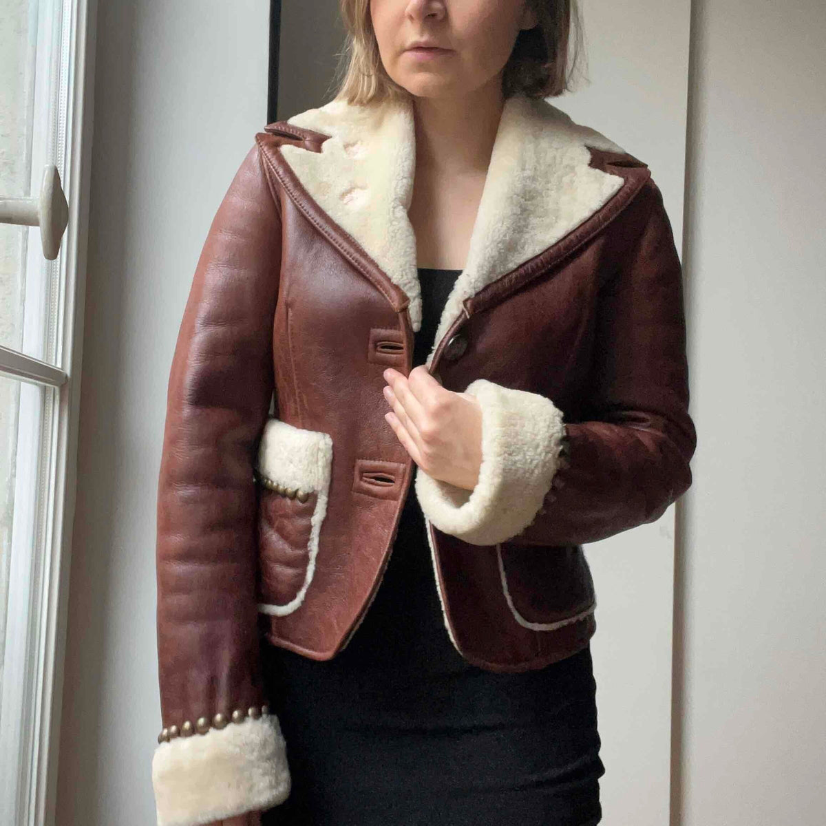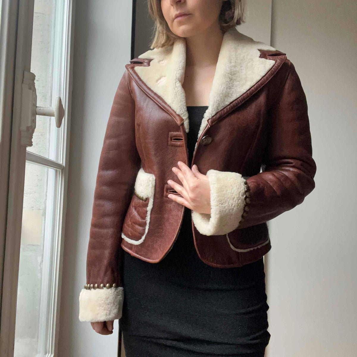 Prix unitaire parManteau court en peau lainée marron et beige de la marque Iceberg. Convient pour une taille XS ou S. Décoré de clous en métal et brodé de fleurs dans le dos. Aucun défaut. Intérieur en mouton très doux.
