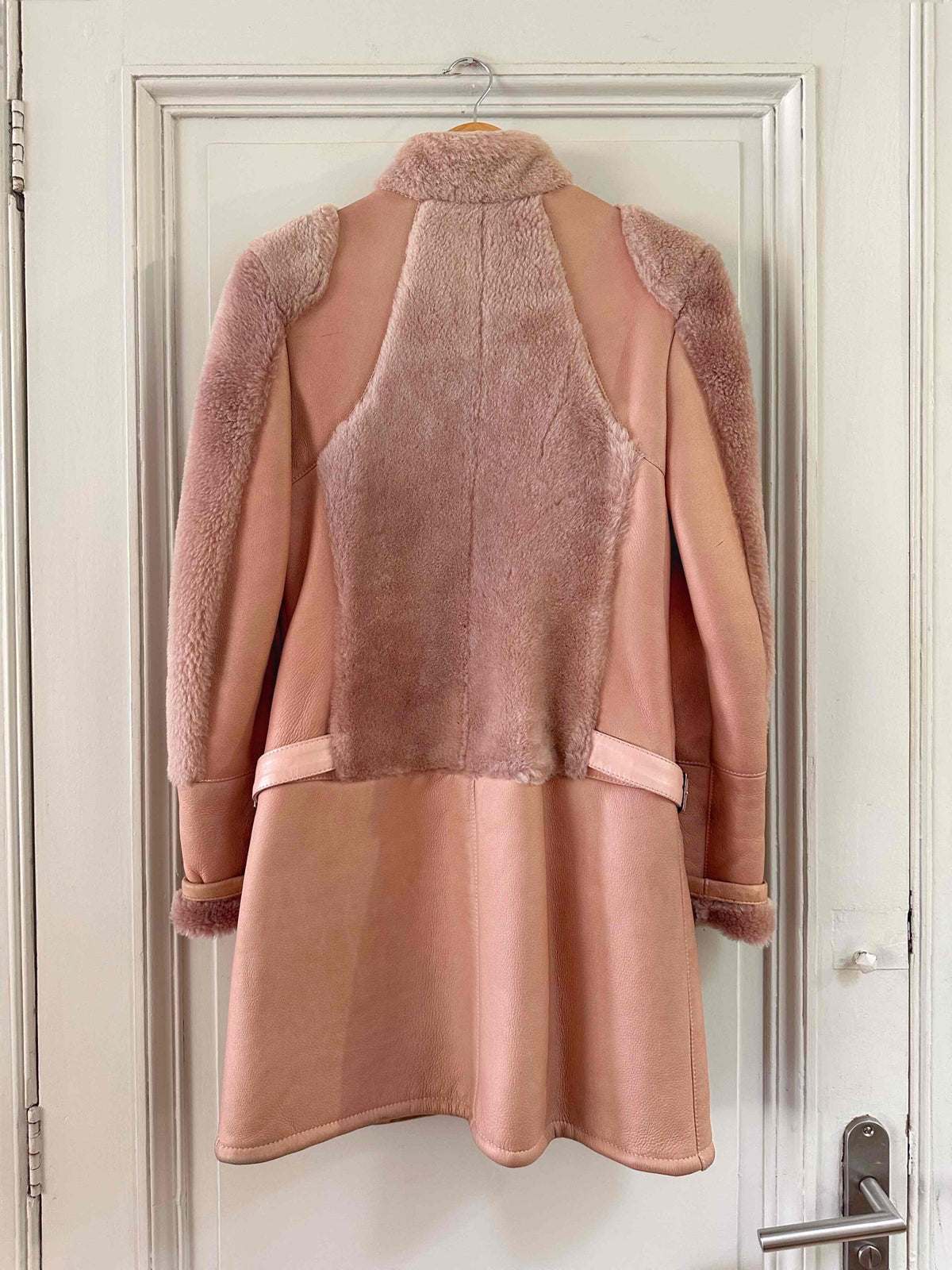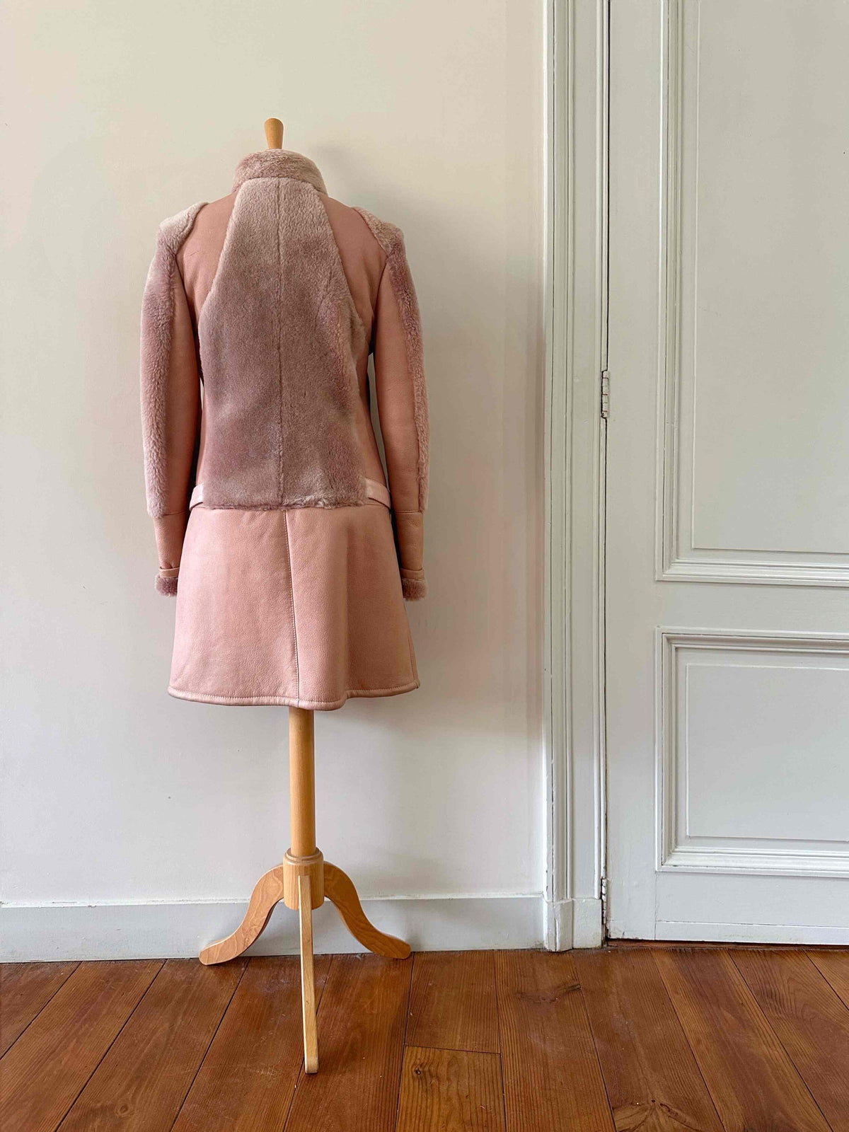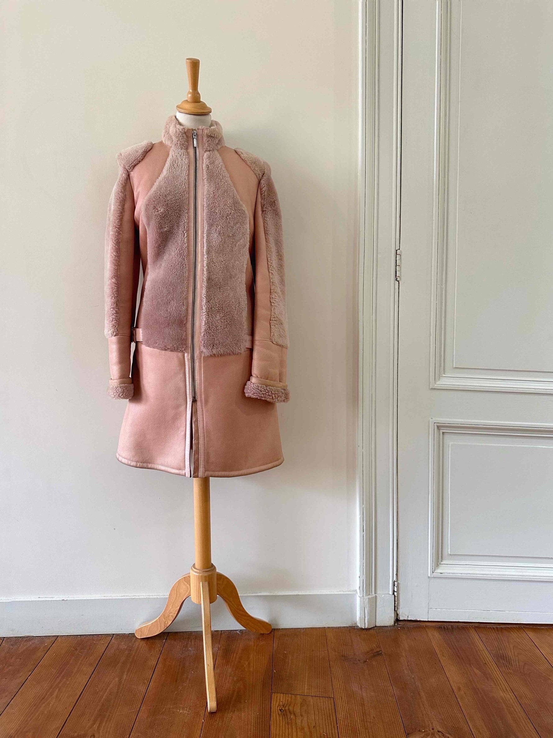 Prix unitaire parPeau lainee en mouton retourné, exterieur cuir rose poudré et empiecements en mouton rose, fabriqué en Biélorussie, convient aux tailles 34 et 36 porté ici sur un mannequin T36. Superbe piece des années 90s.