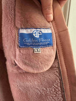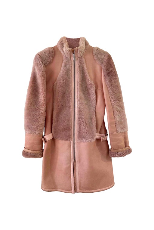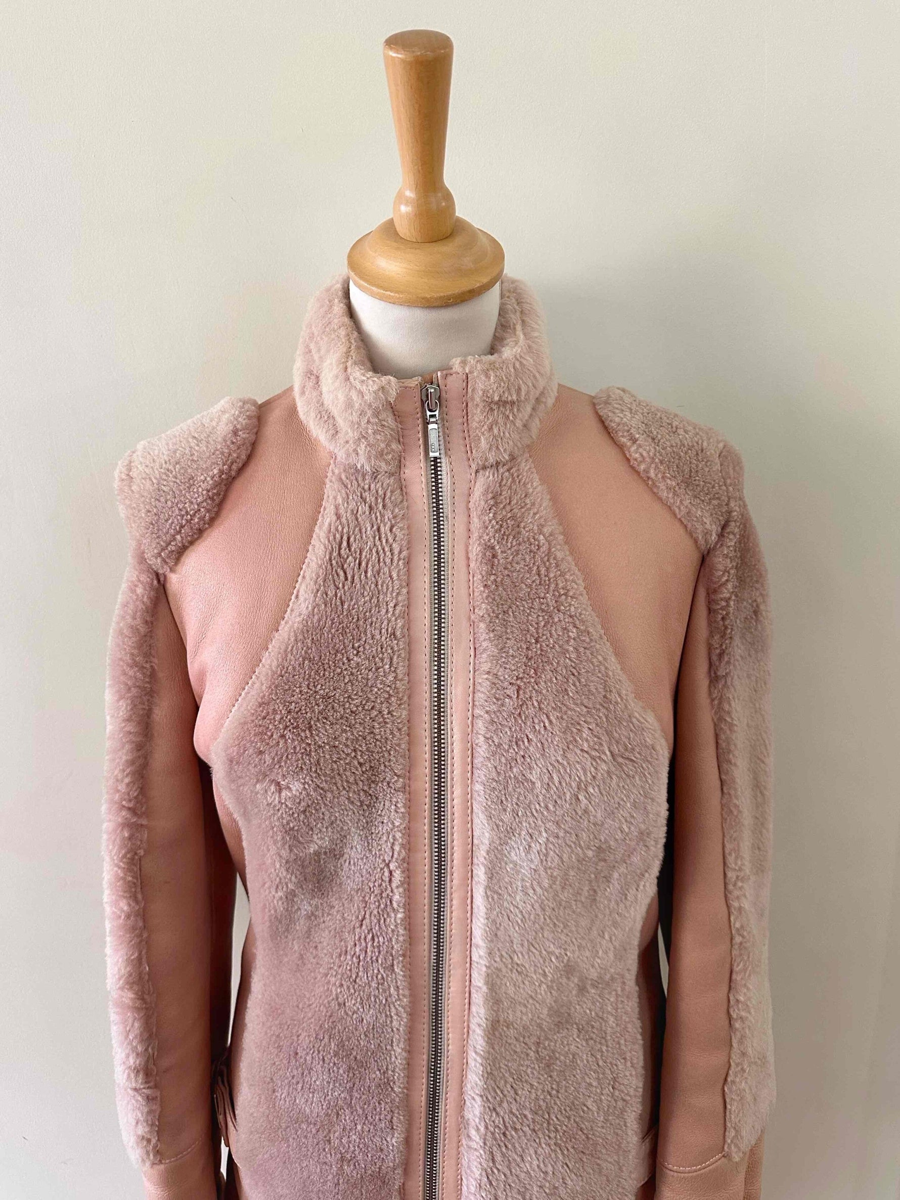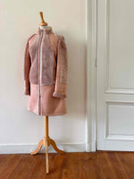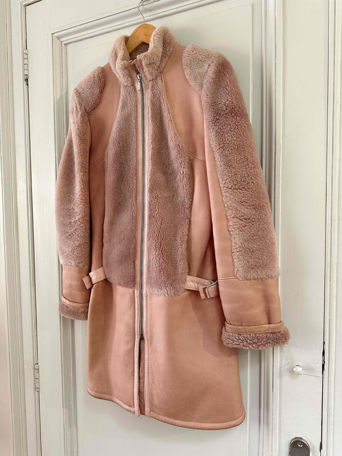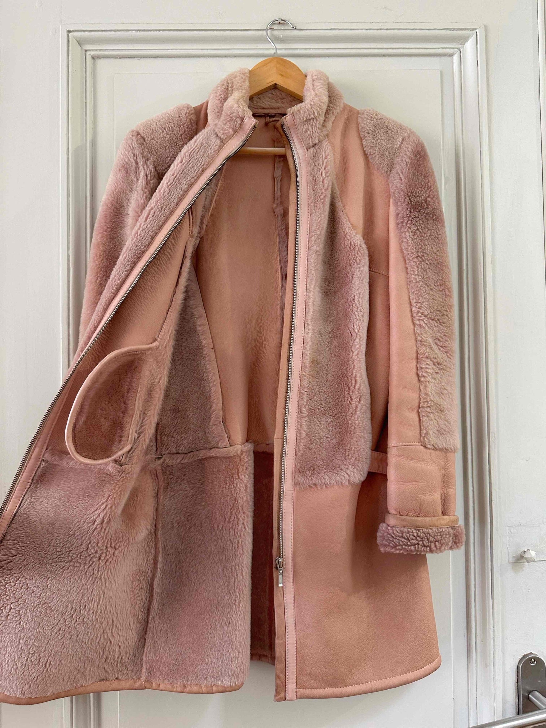 Prix unitaire parPeau lainee en mouton retourné, exterieur cuir rose poudré et empiecements en mouton rose, fabriqué en Biélorussie, convient aux tailles 34 et 36 porté ici sur un mannequin T36. Superbe piece des années 90s.