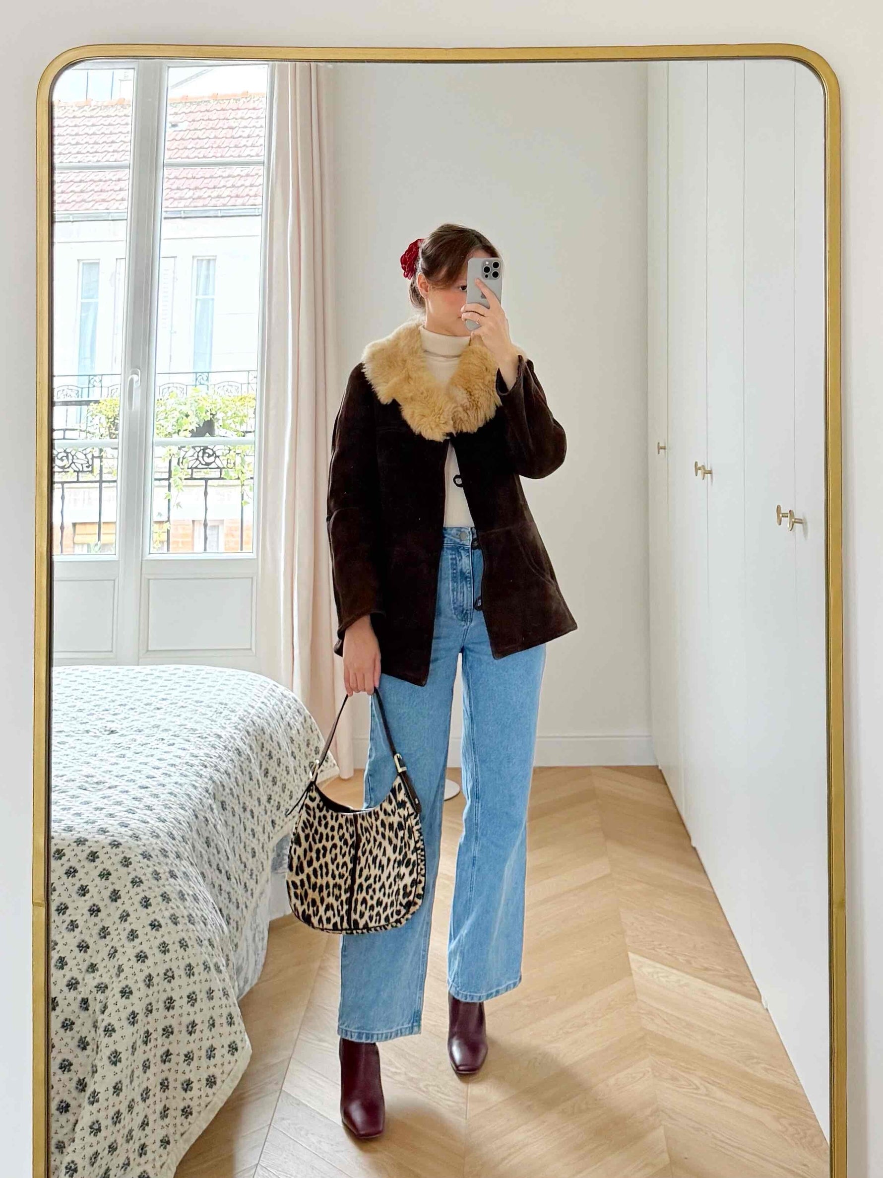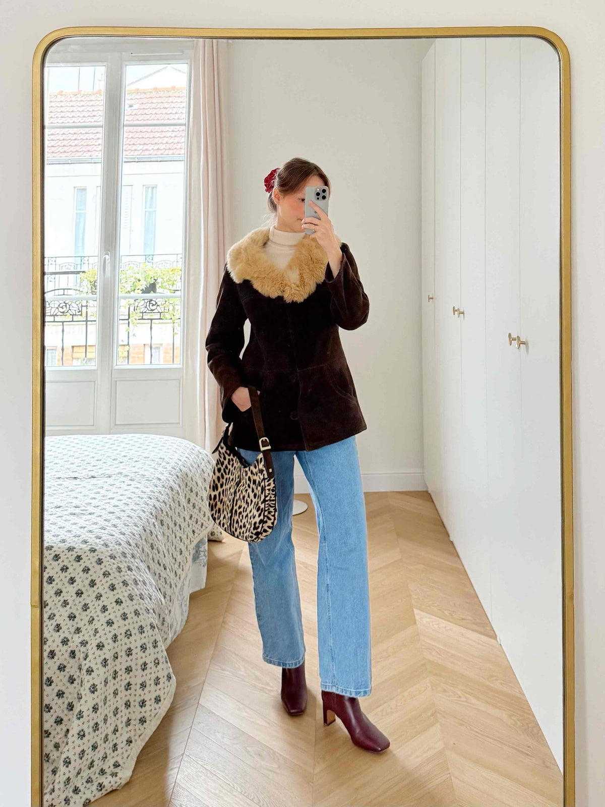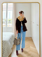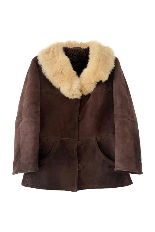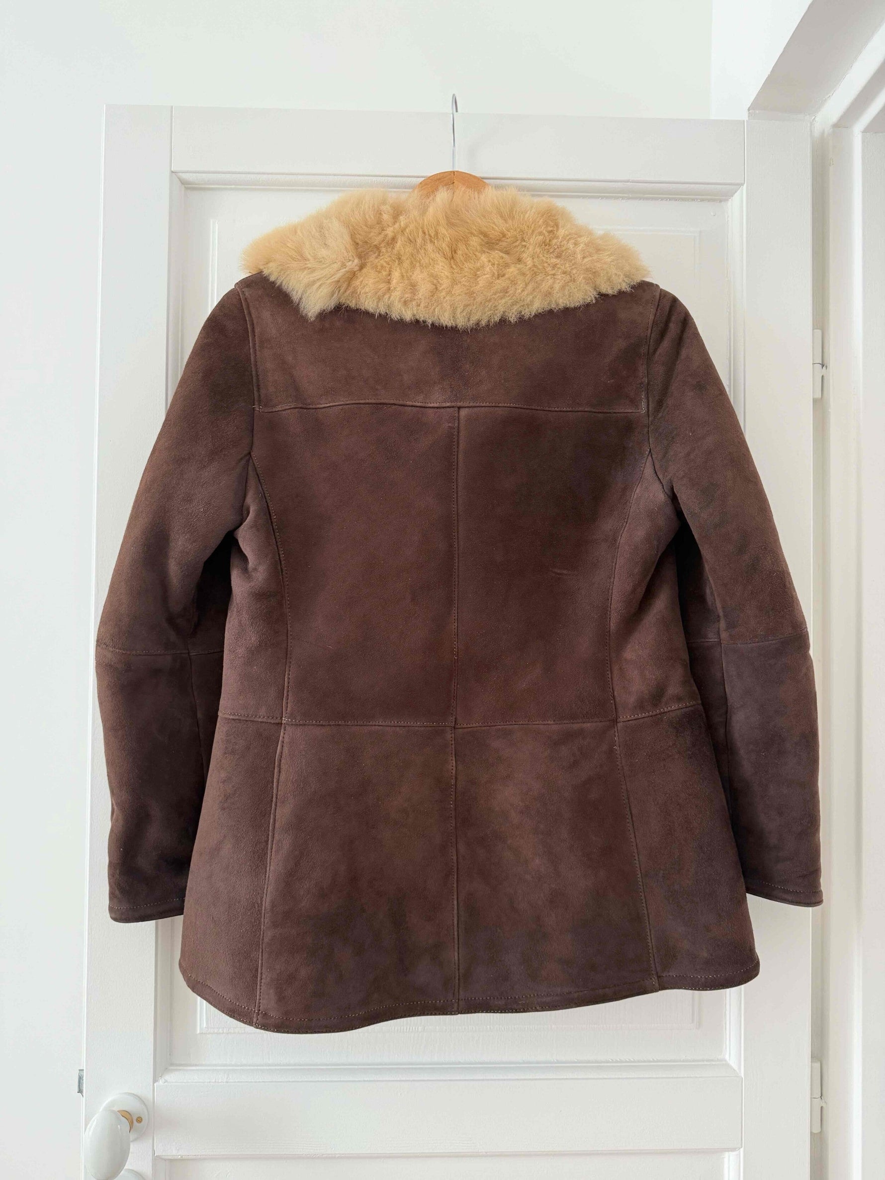 Peau lainée en daim chocolat, col en laine beige, entièrement fourré à l’intérieur, légère et agréable à porter.