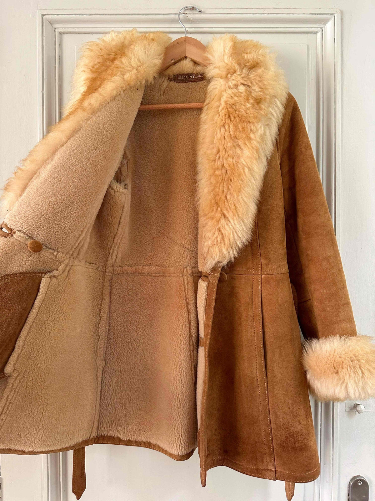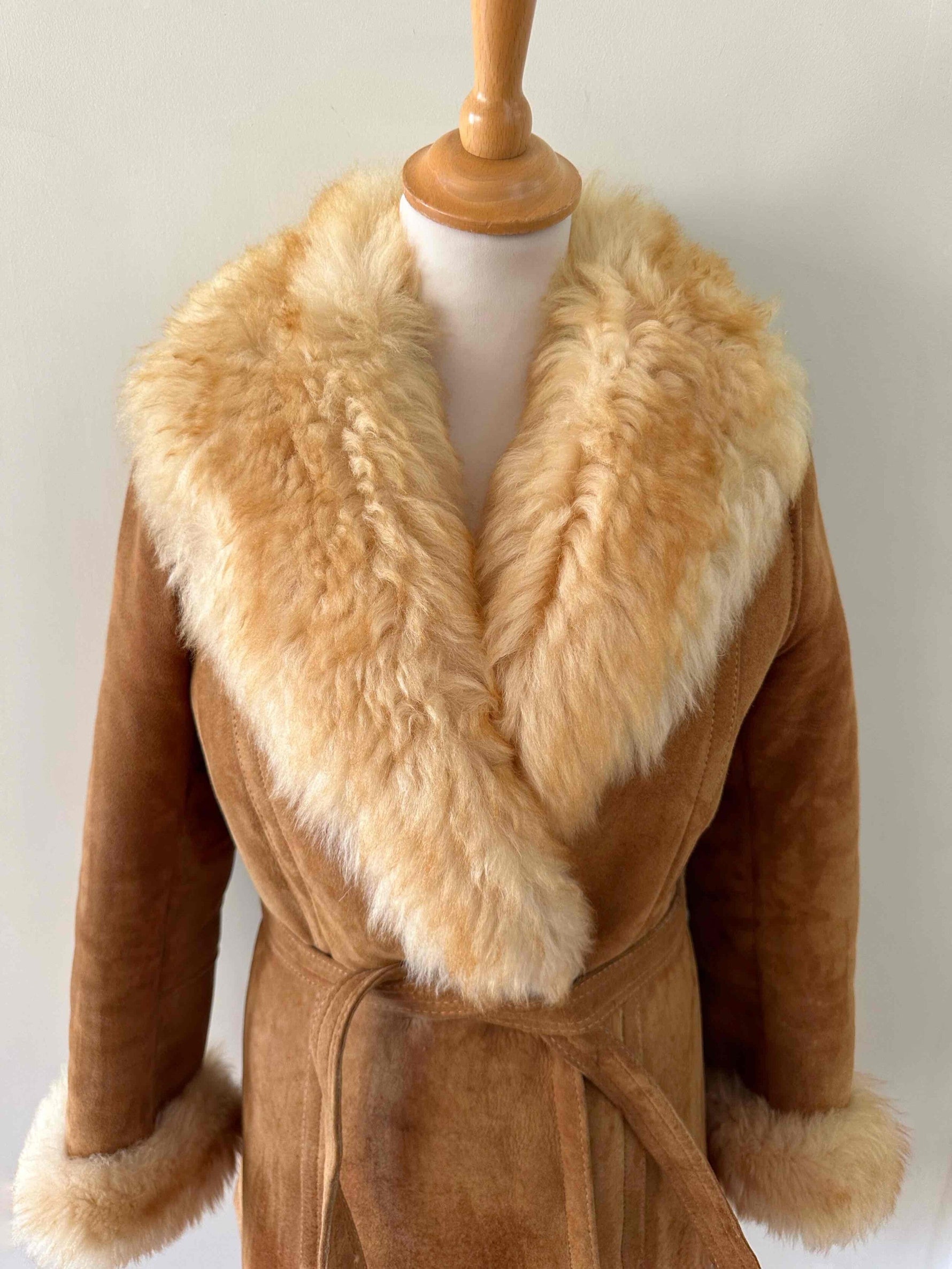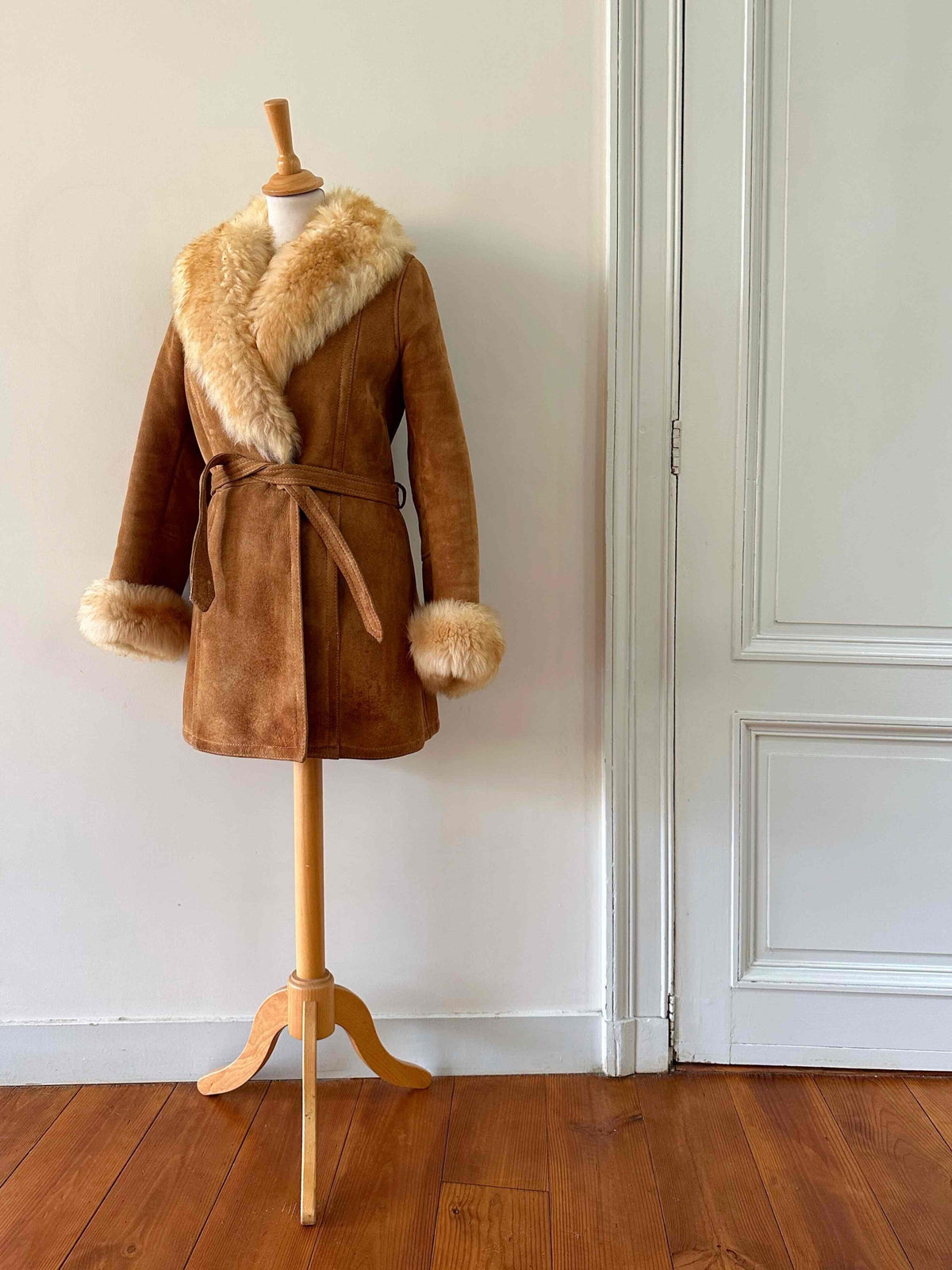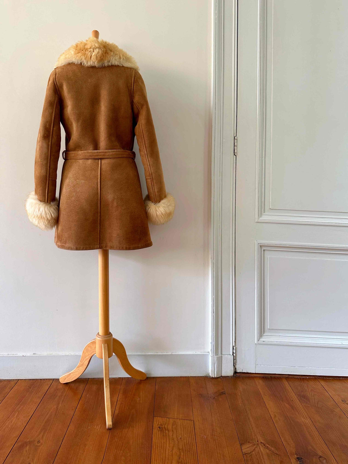 Prix unitaire parPennylane en peau lainée, mouton retourné extérieur daim caramel, intérieur laine de mouton écru beige, col et poignet en fourrure de mouton poils longs.