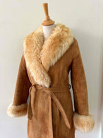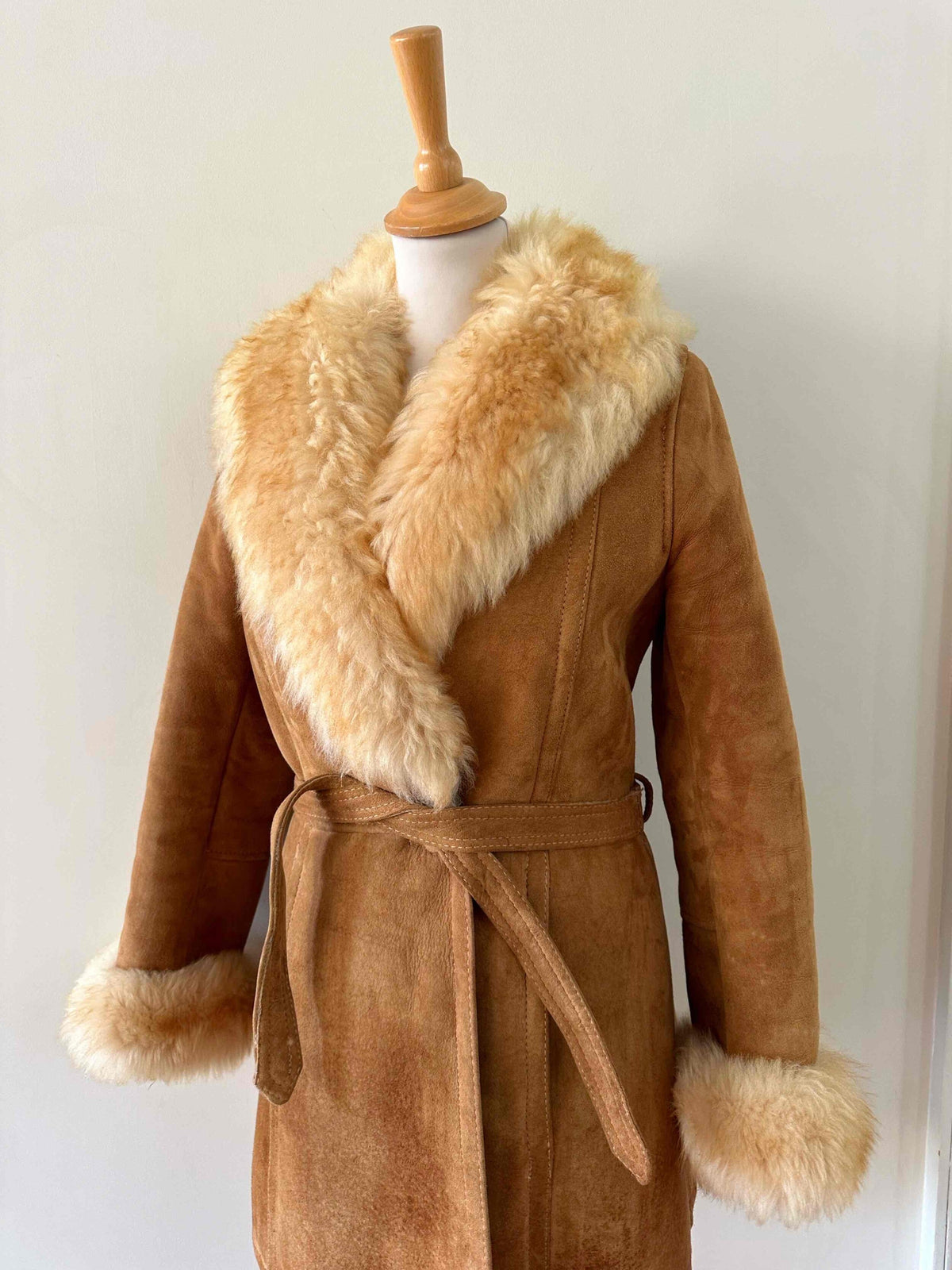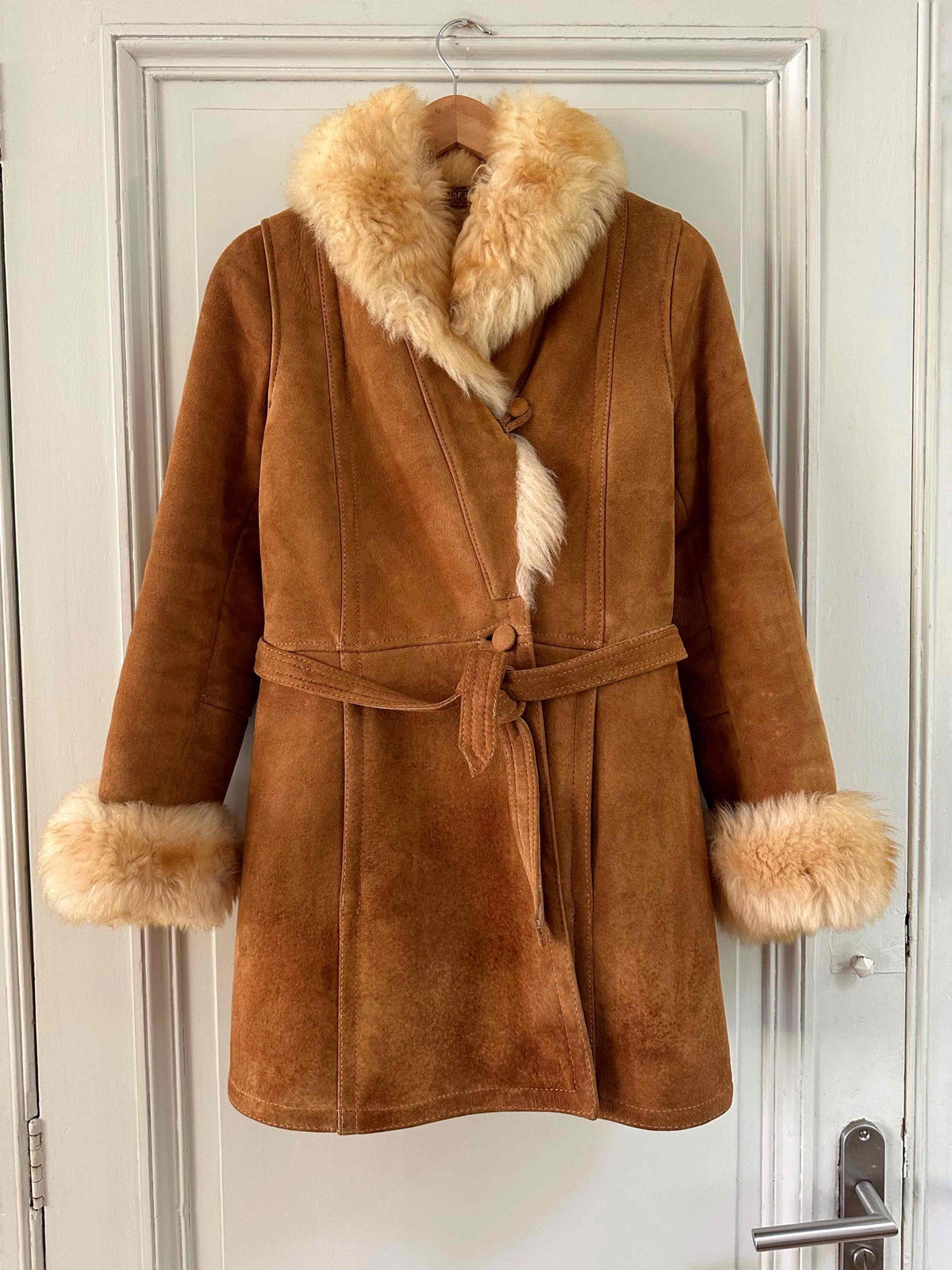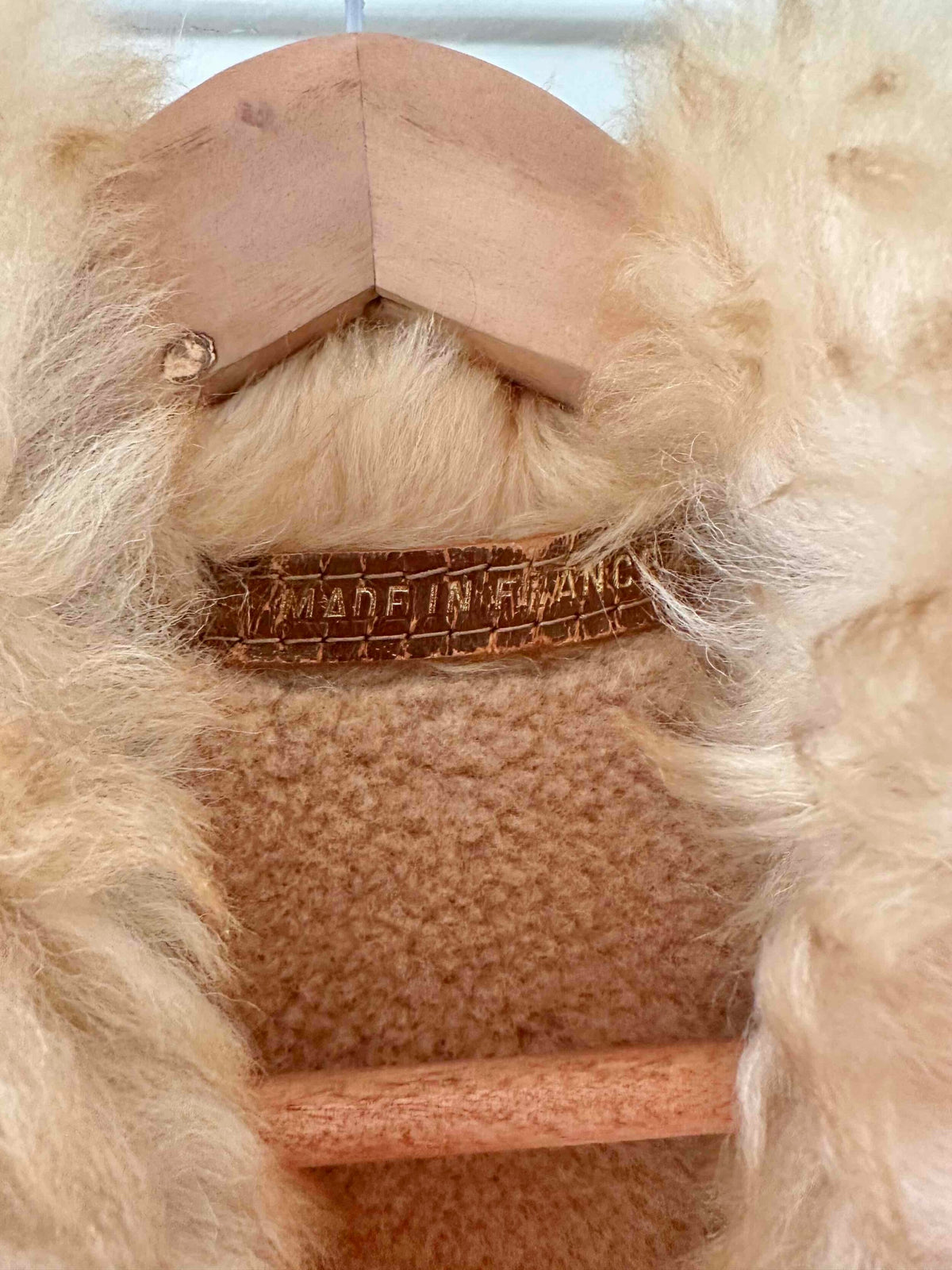 Prix unitaire parPennylane en peau lainée, mouton retourné extérieur daim caramel, intérieur laine de mouton écru beige, col et poignet en fourrure de mouton poils longs.