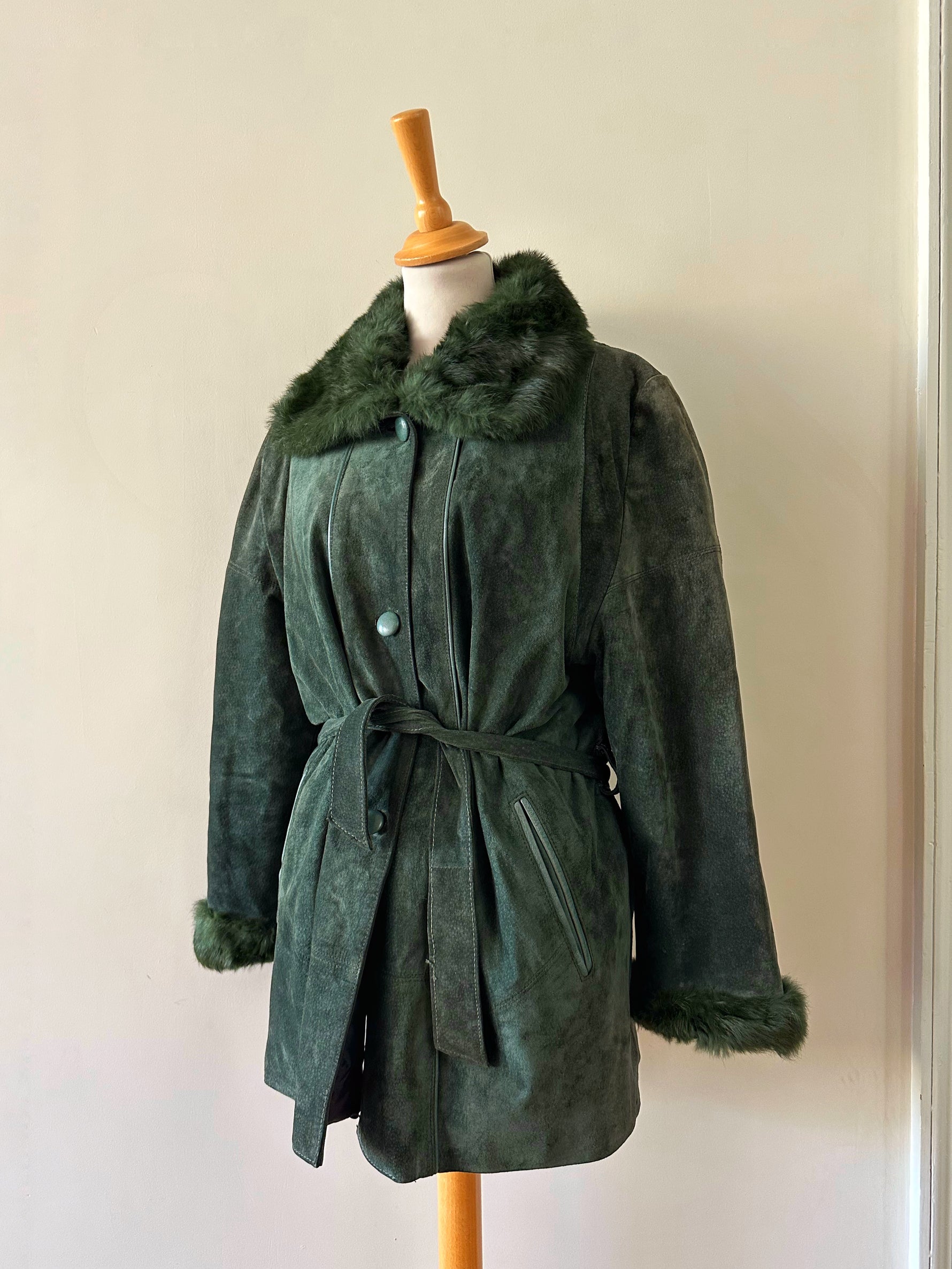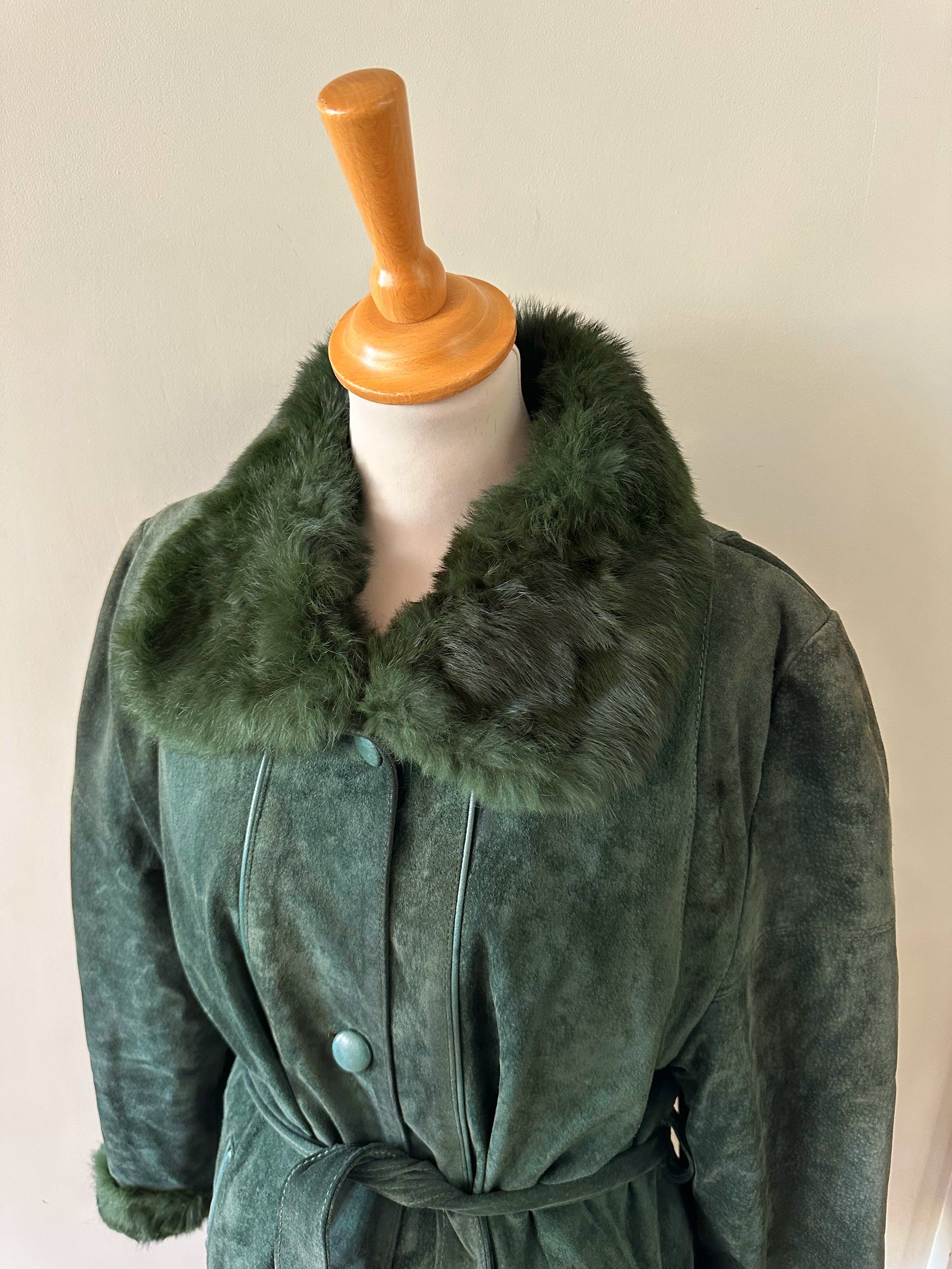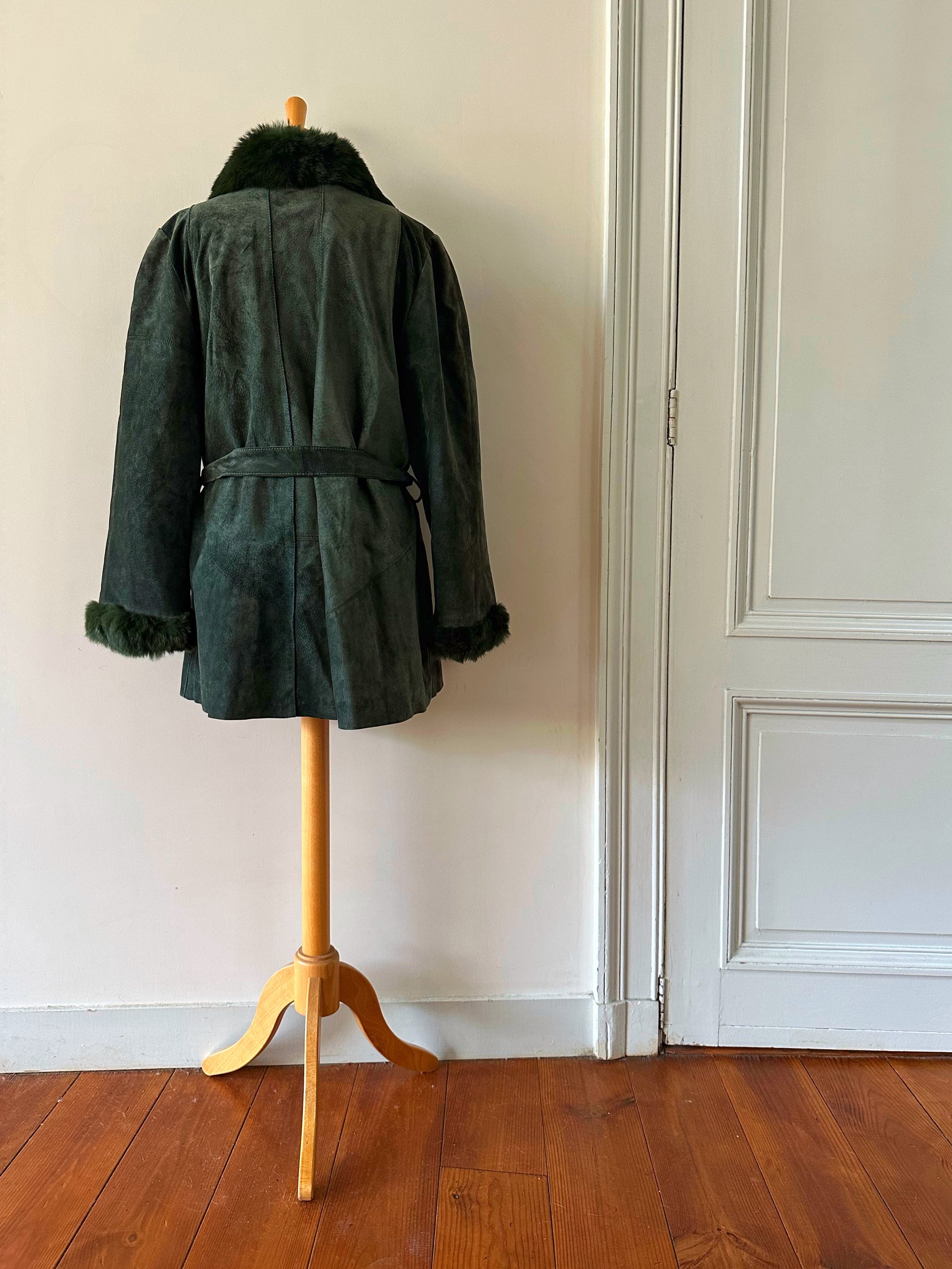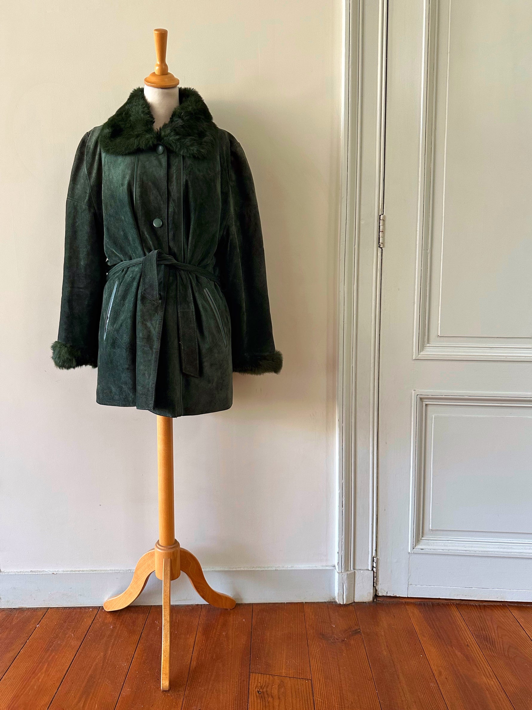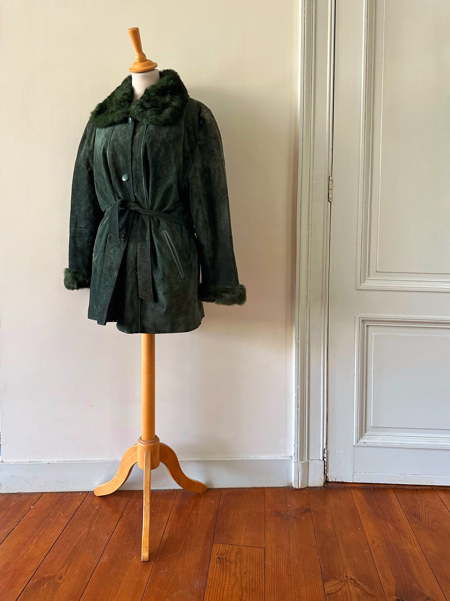 Saharienne en peau et fourrure, en daim vert bouteille, col et poignets en fourrure de lapin, interieur matelassé, ceinture taille à nouer, boutonné, fabriquée en Italie, taille 38 porté ici sur un mannequin T36 et sur une personne T40. Aisselles 48cm, longueur 75cm.