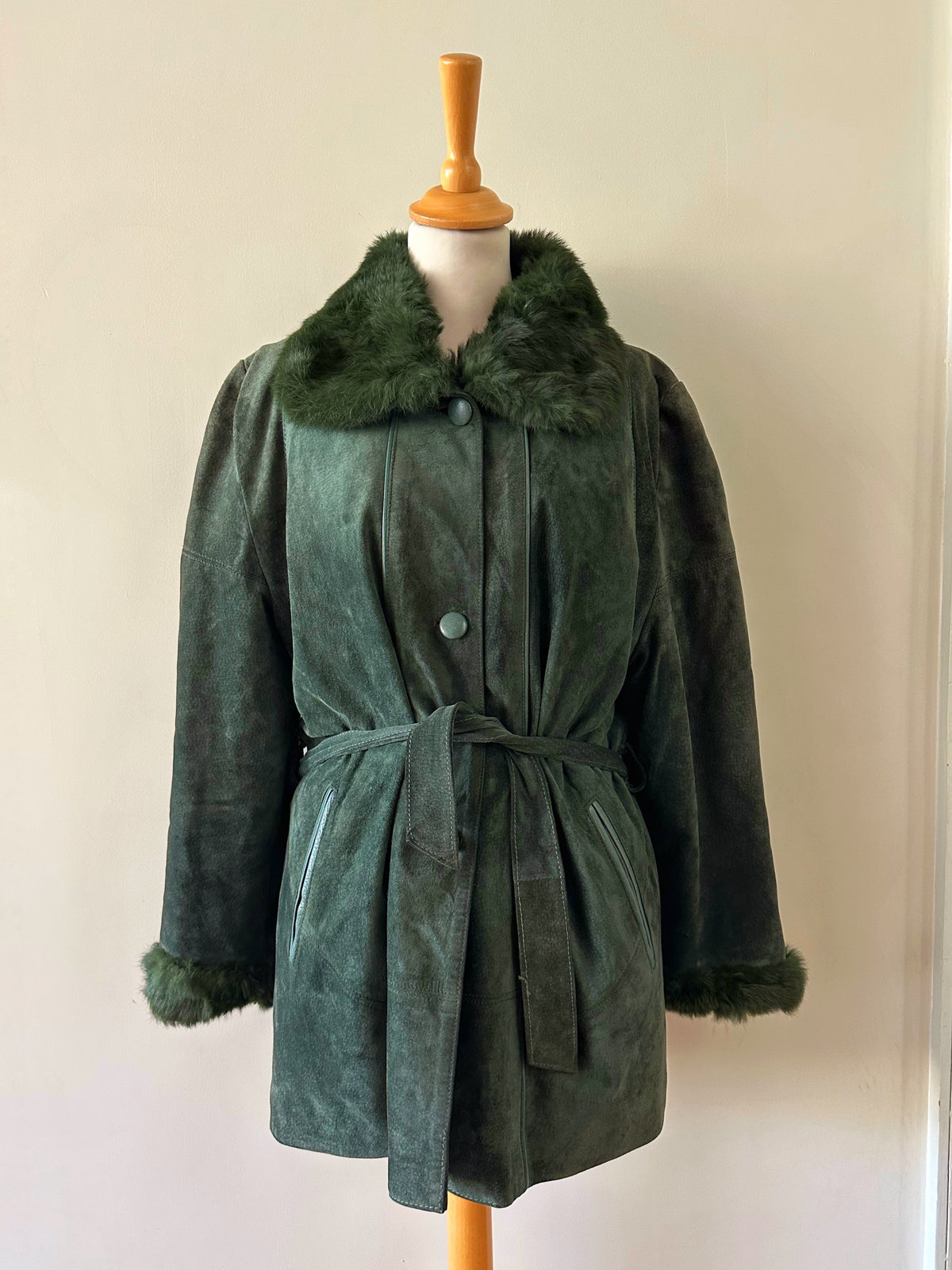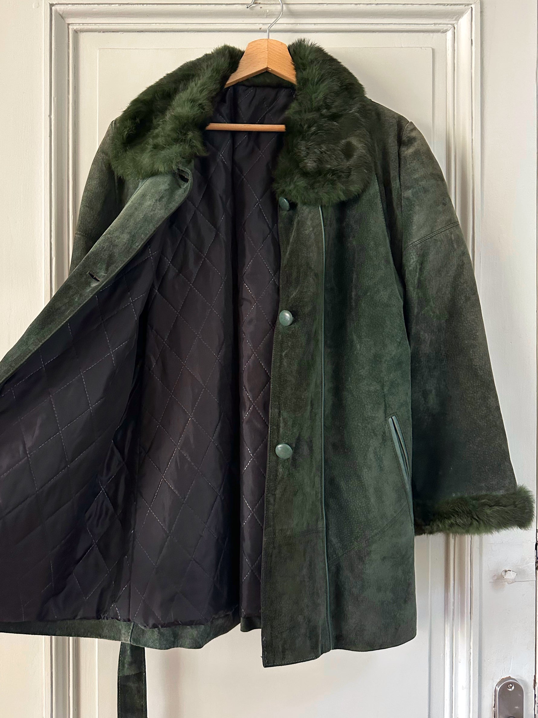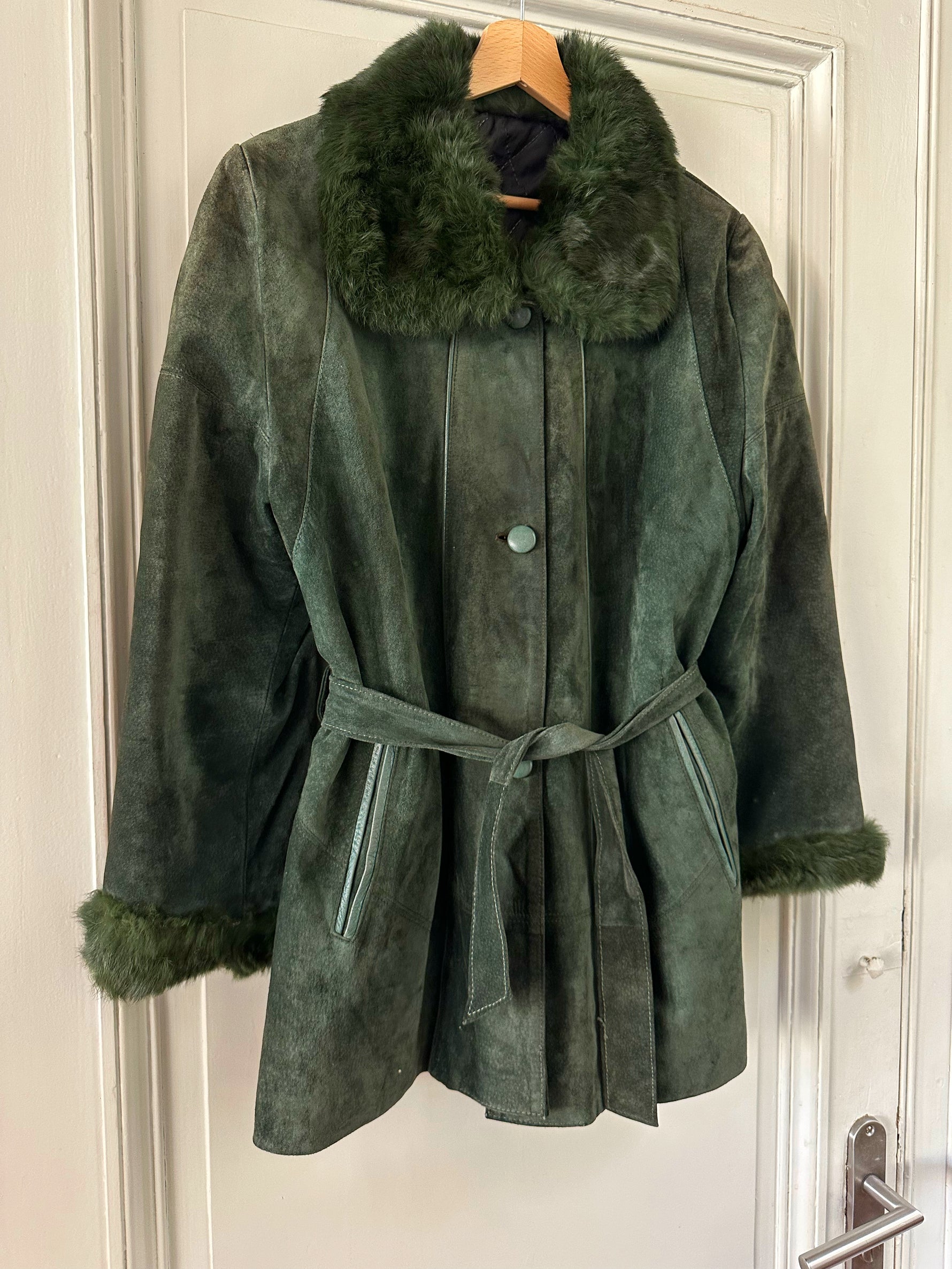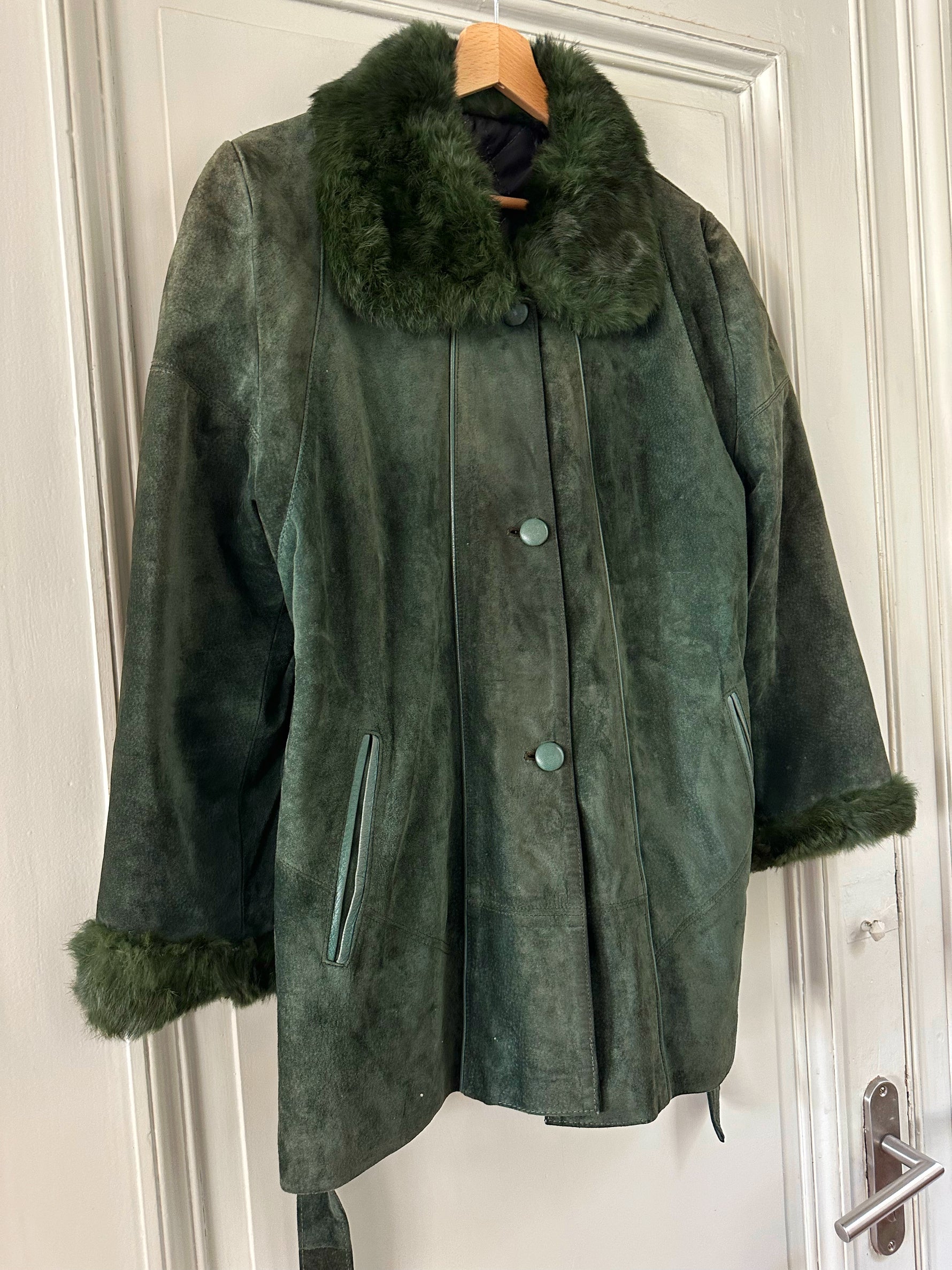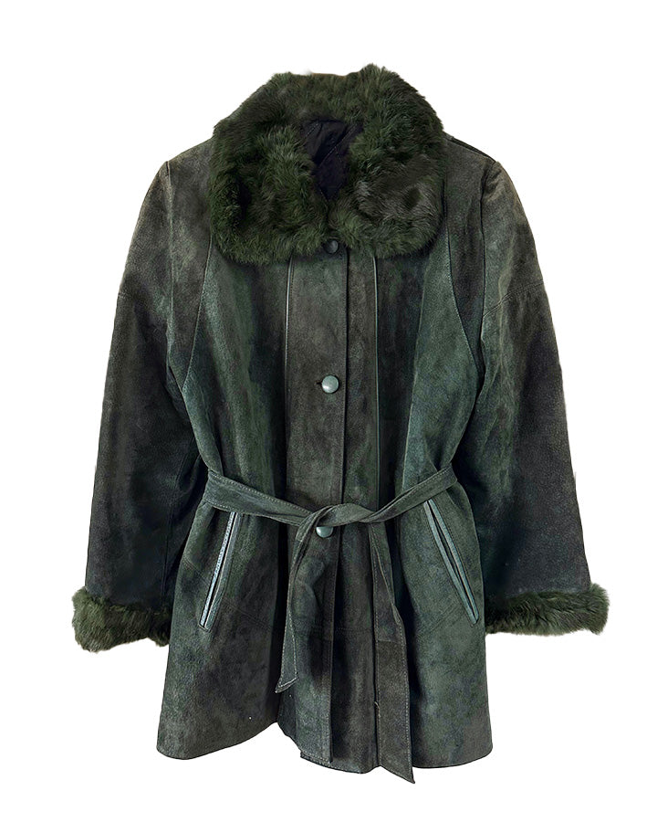 Saharienne en peau et fourrure, en daim vert bouteille, col et poignets en fourrure de lapin, interieur matelassé, ceinture taille à nouer, boutonné, fabriquée en Italie, taille 38 porté ici sur un mannequin T36 et sur une personne T40. Aisselles 48cm, longueur 75cm.