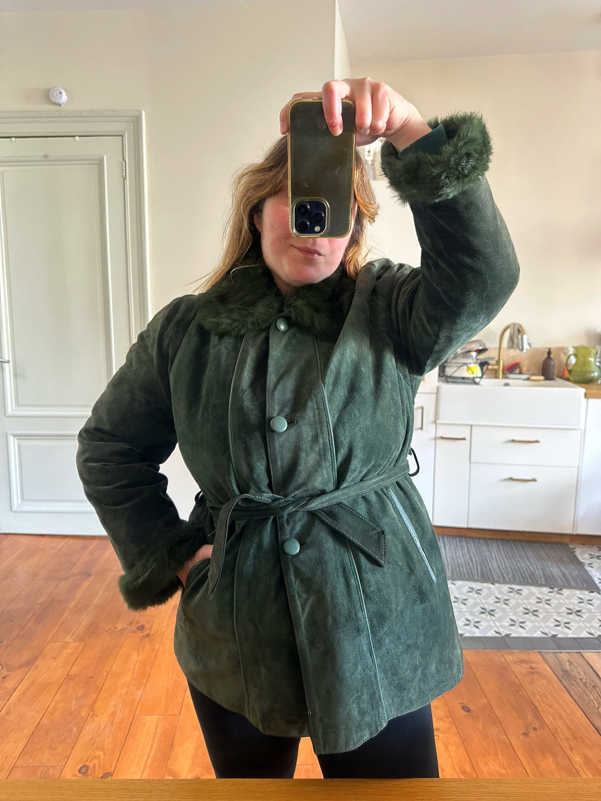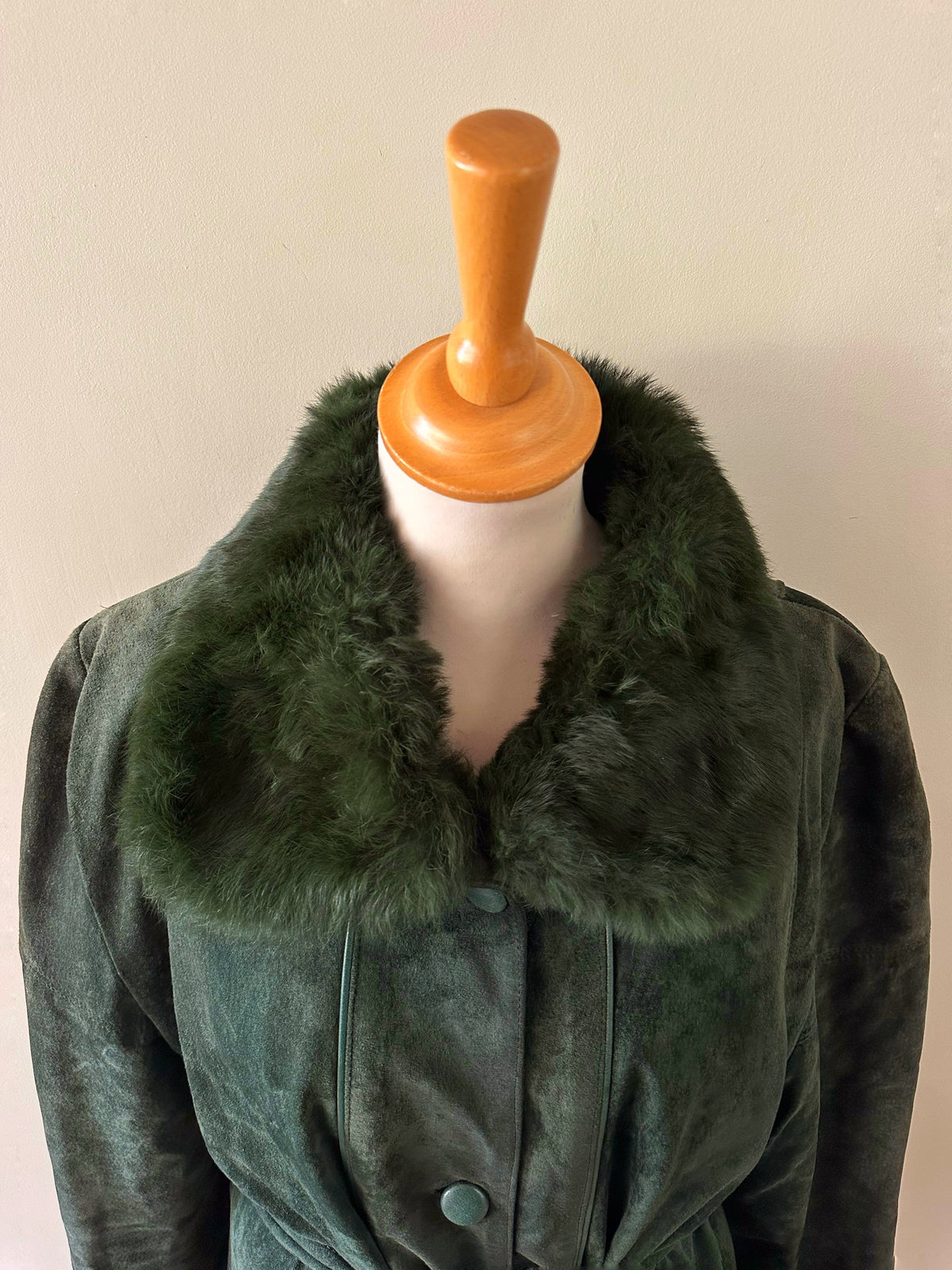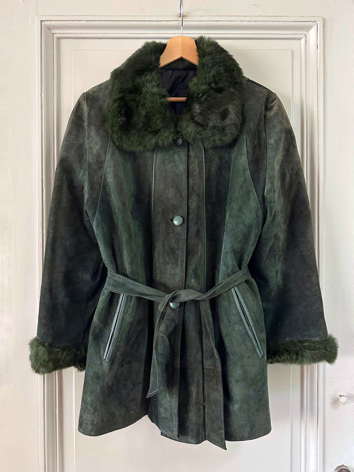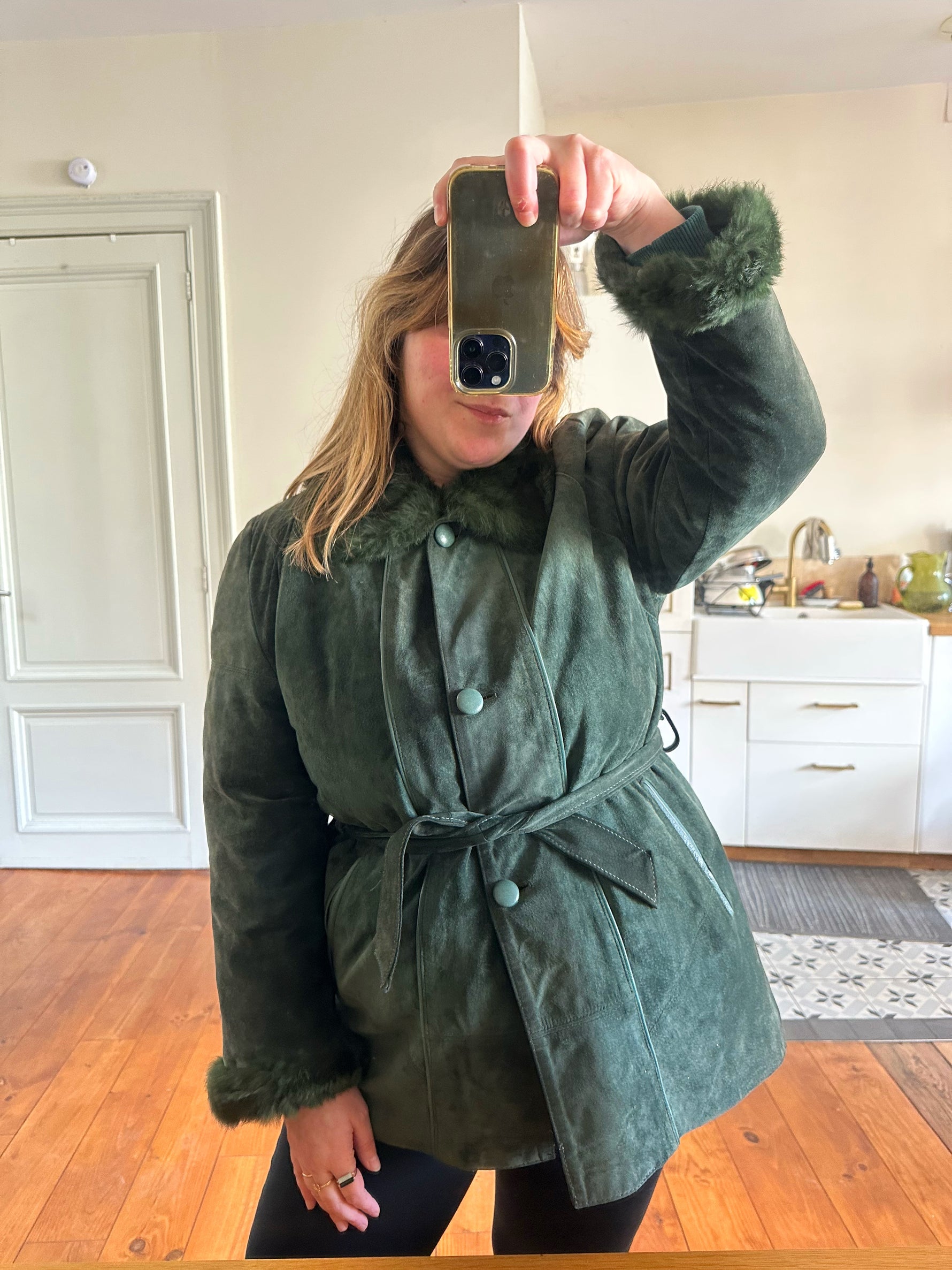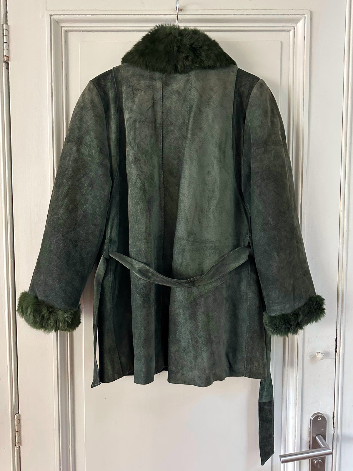 Saharienne en peau et fourrure, en daim vert bouteille, col et poignets en fourrure de lapin, interieur matelassé, ceinture taille à nouer, boutonné, fabriquée en Italie, taille 38 porté ici sur un mannequin T36 et sur une personne T40. Aisselles 48cm, longueur 75cm.