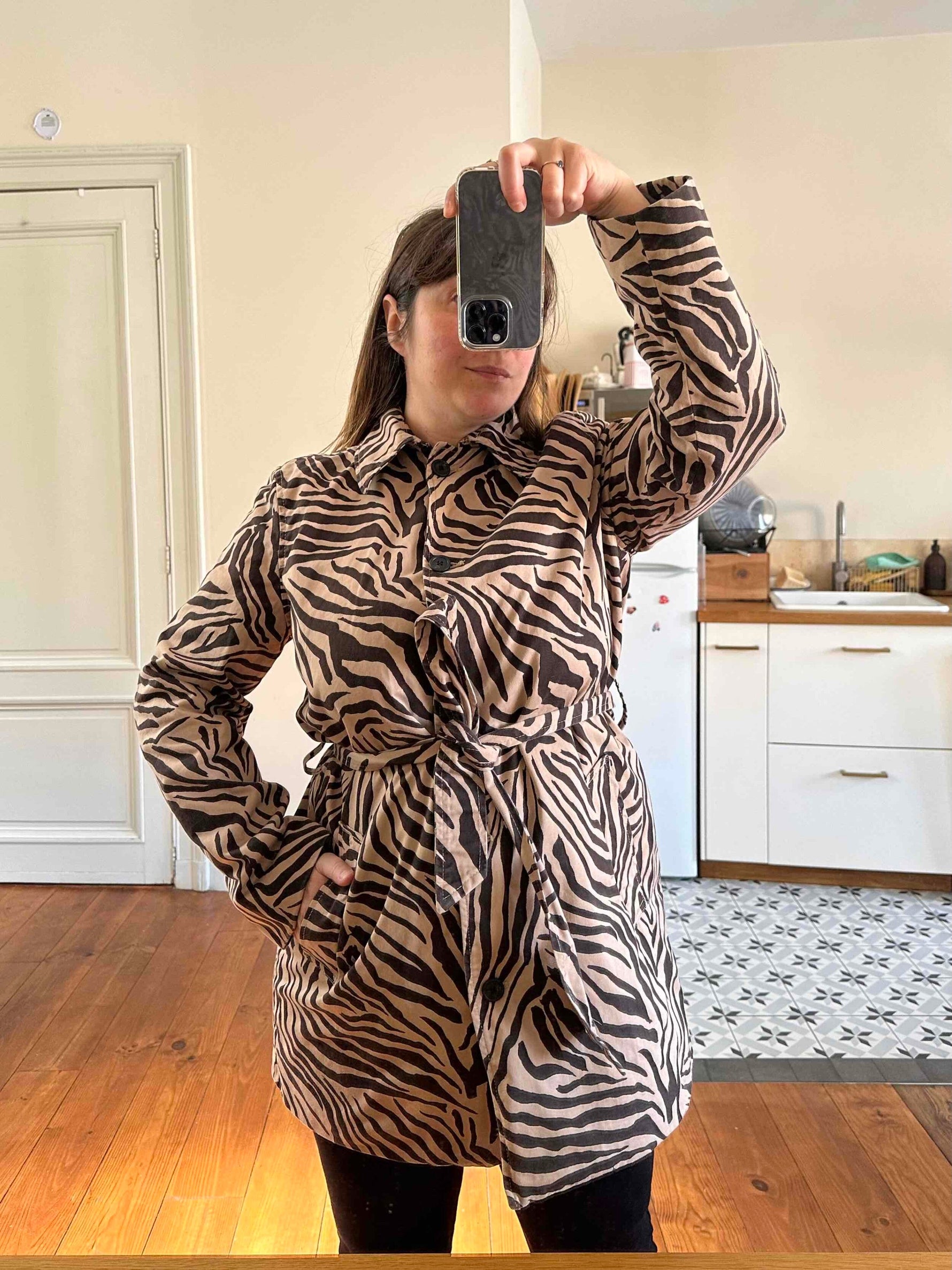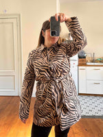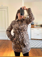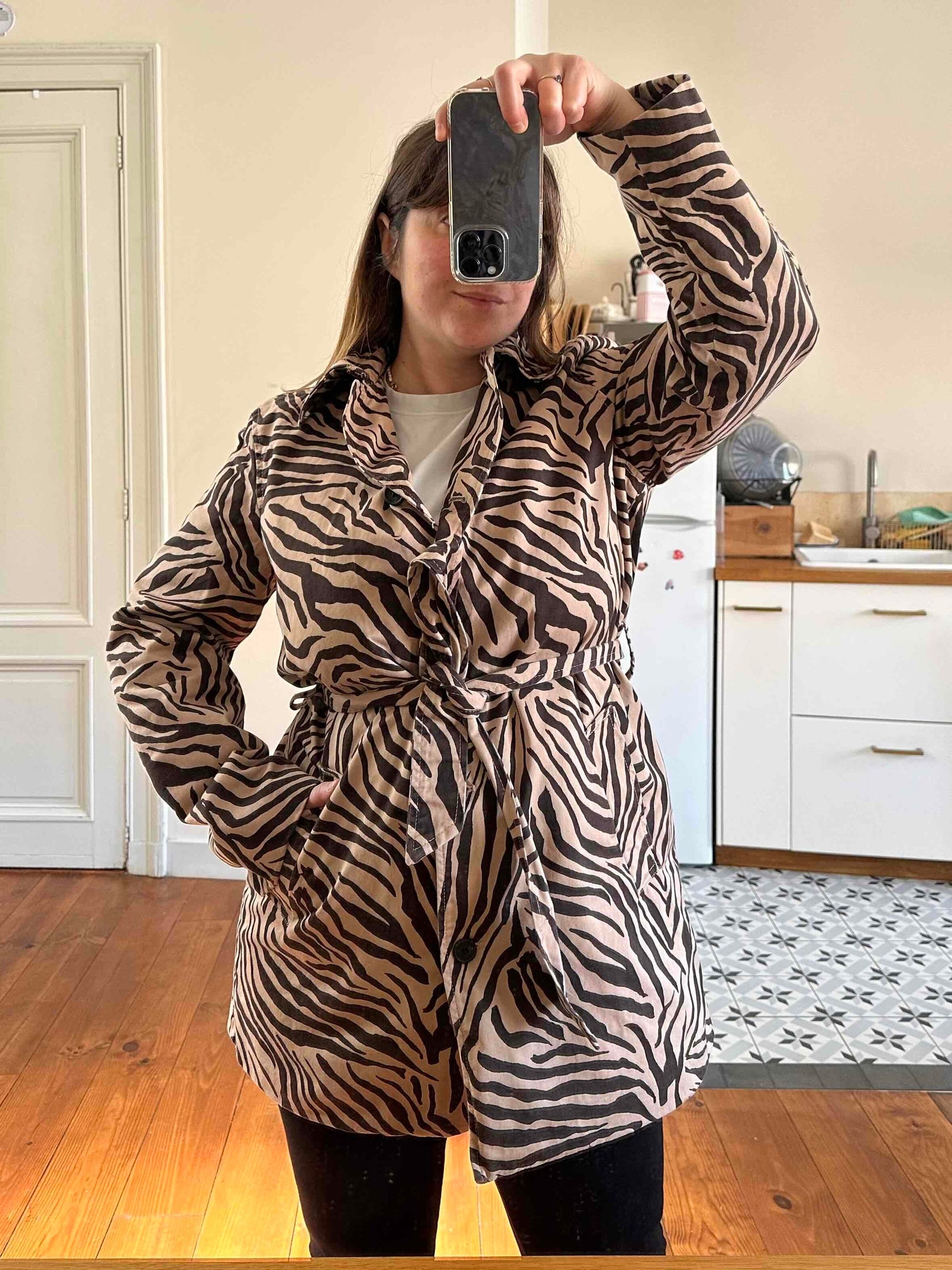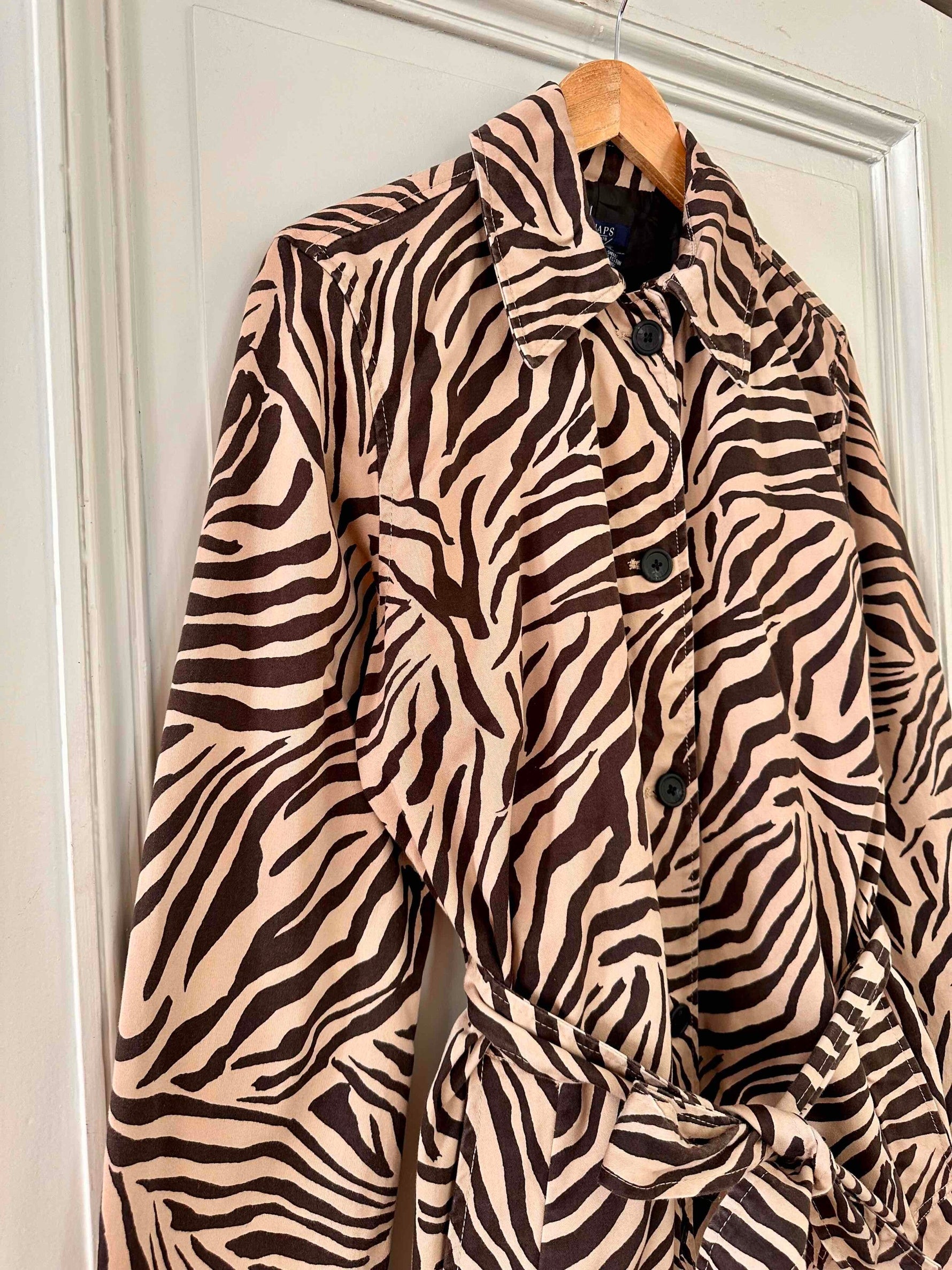 Prix unitaire parTrench saharienne Zébré, en 100% coton camel beige imprimé motifs zèbre chocolats, boutonné, ceinture taille à nouer, années 90s, taille 38 et 40, portée ici sur une personne T40.