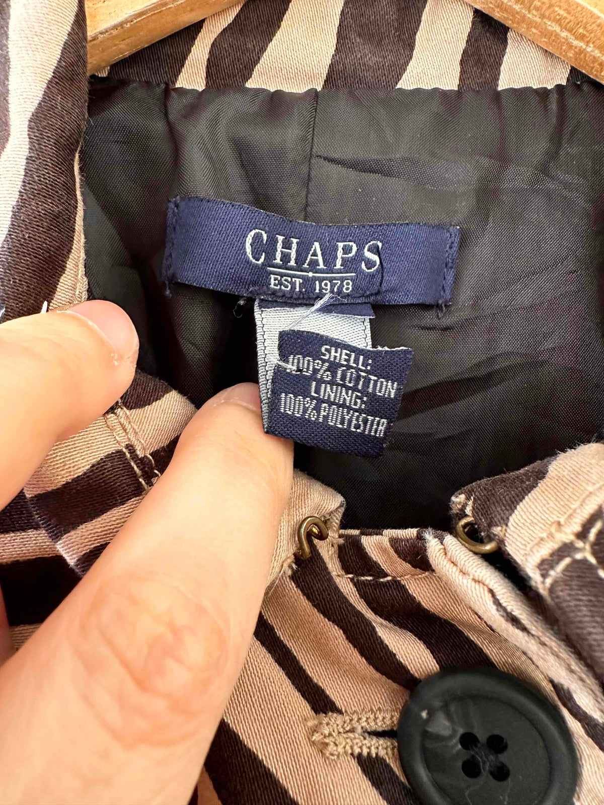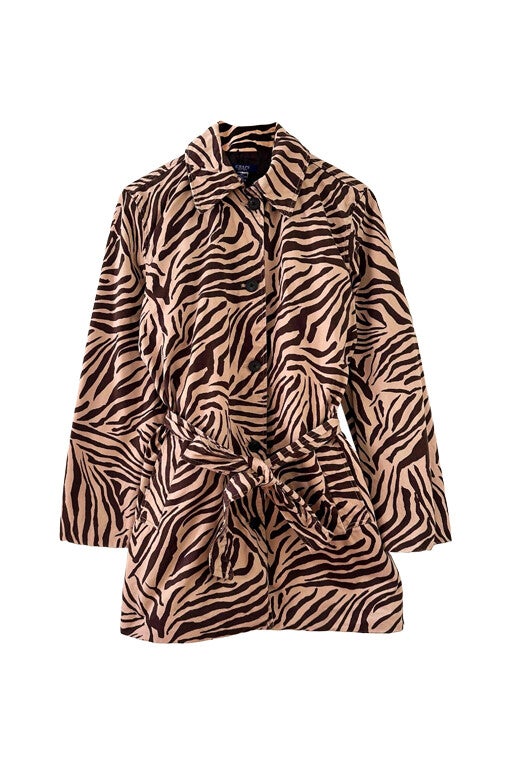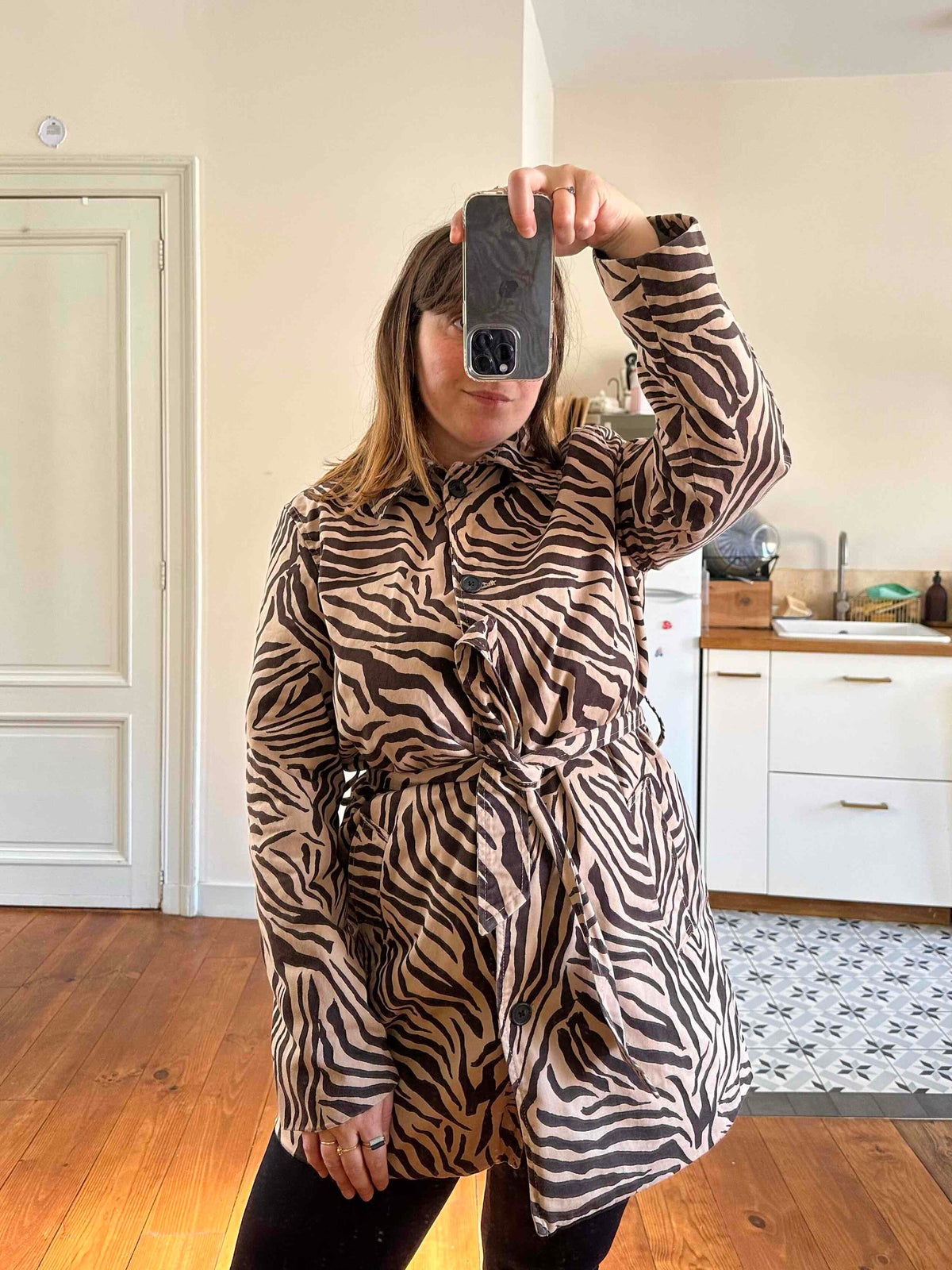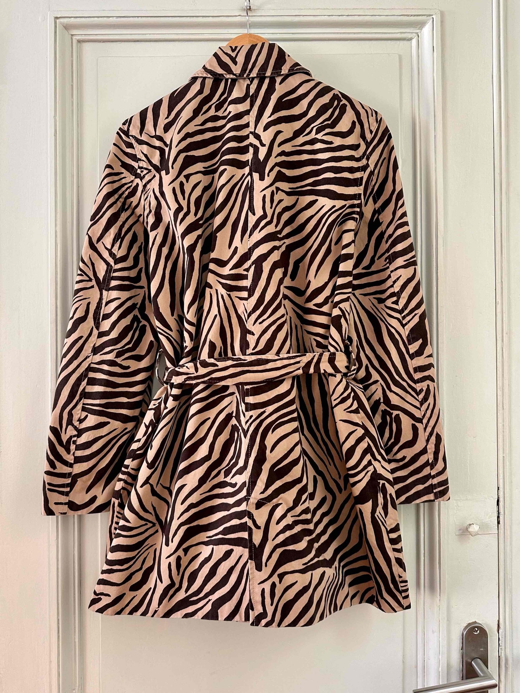Prix unitaire parTrench saharienne Zébré, en 100% coton camel beige imprimé motifs zèbre chocolats, boutonné, ceinture taille à nouer, années 90s, taille 38 et 40, portée ici sur une personne T40.