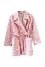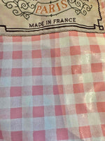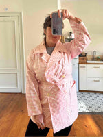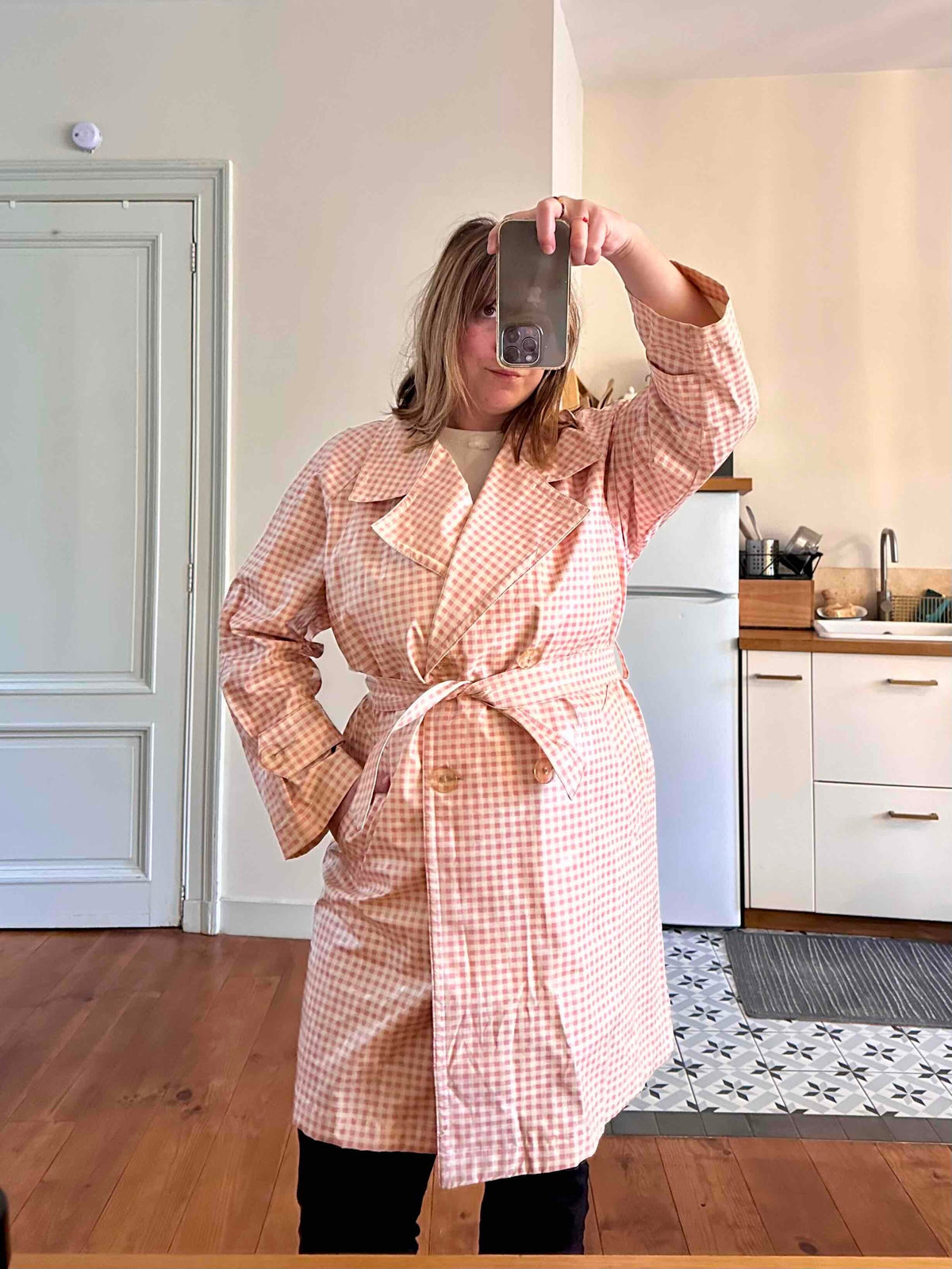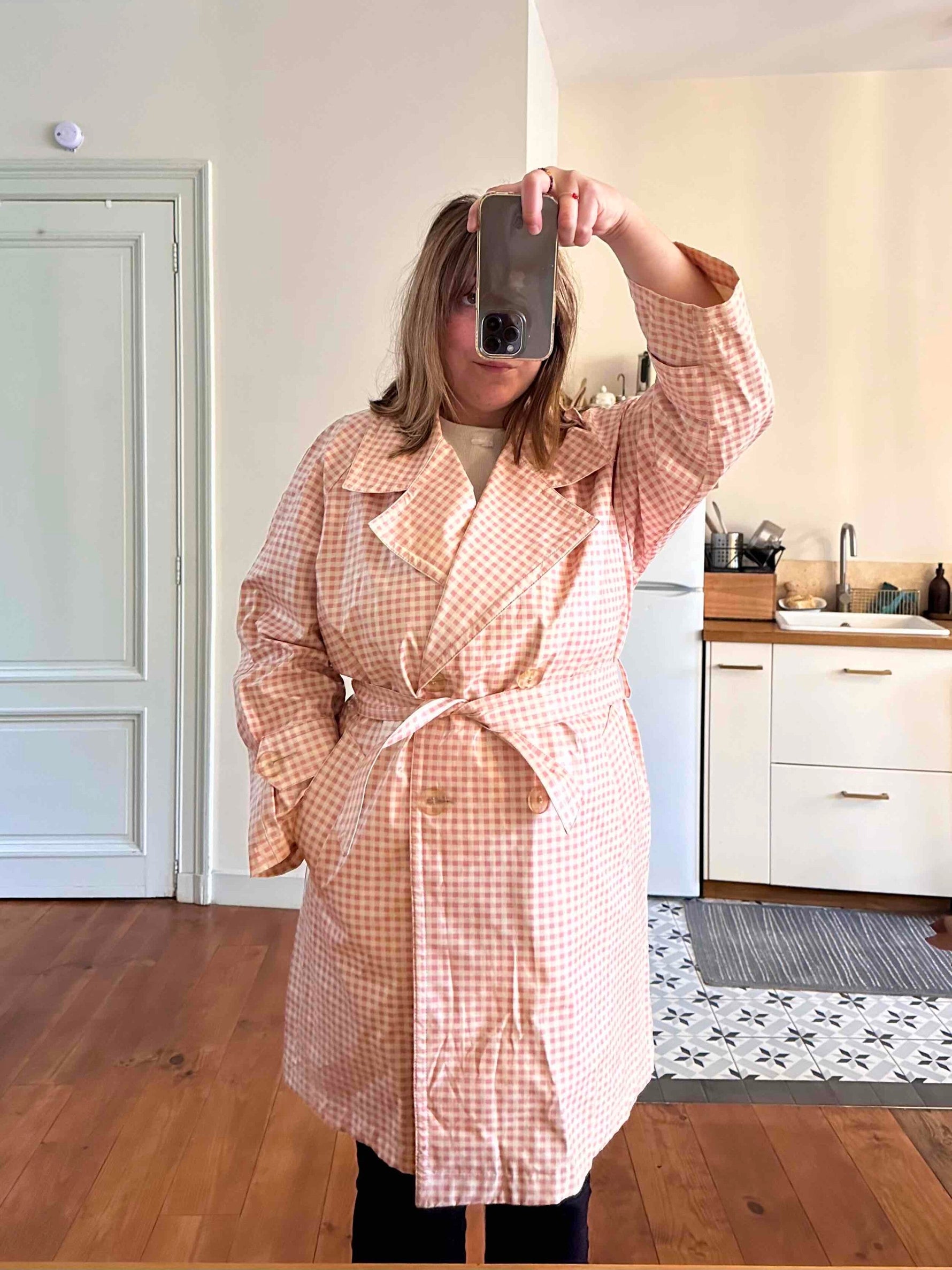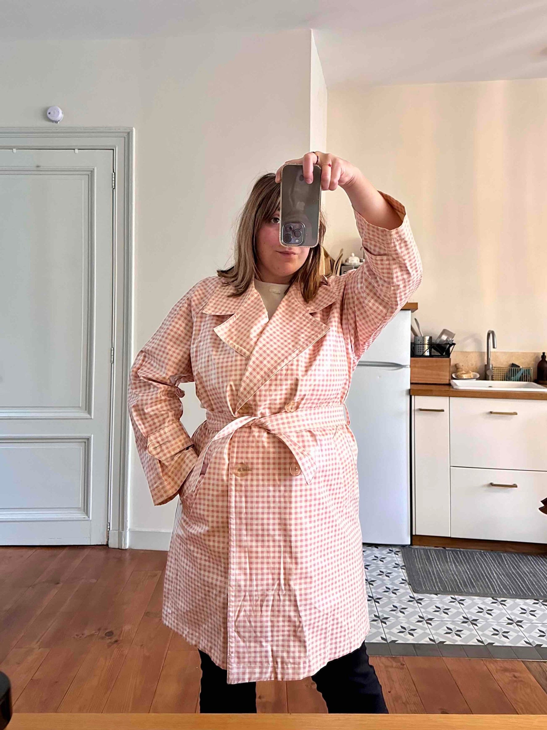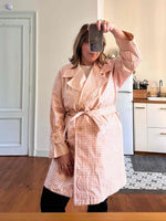 Prix unitaire parTrench ciré vichy, en toile cirée imperméable, carreaux vichy roses et blancs, boutonnage croisé, ceinture, taille à nouer, fabriqué en France, taille 40, portée ici sur une personne T40.