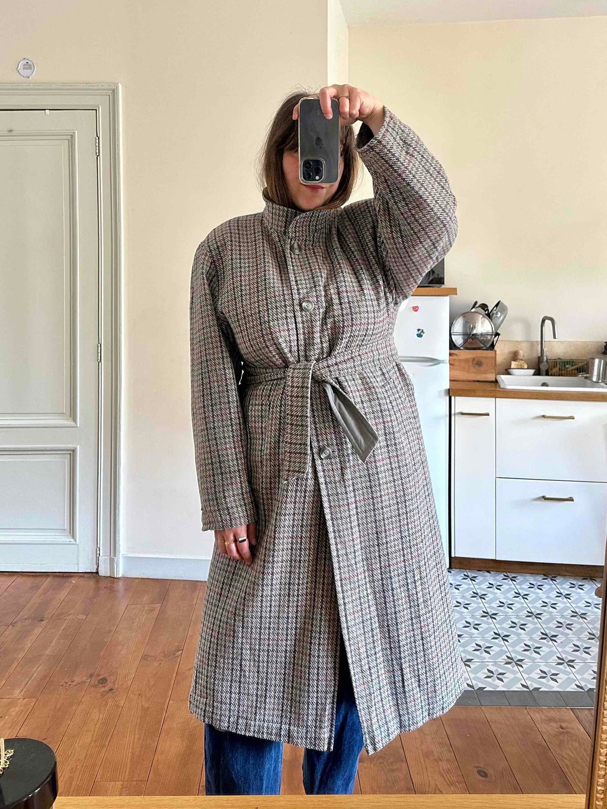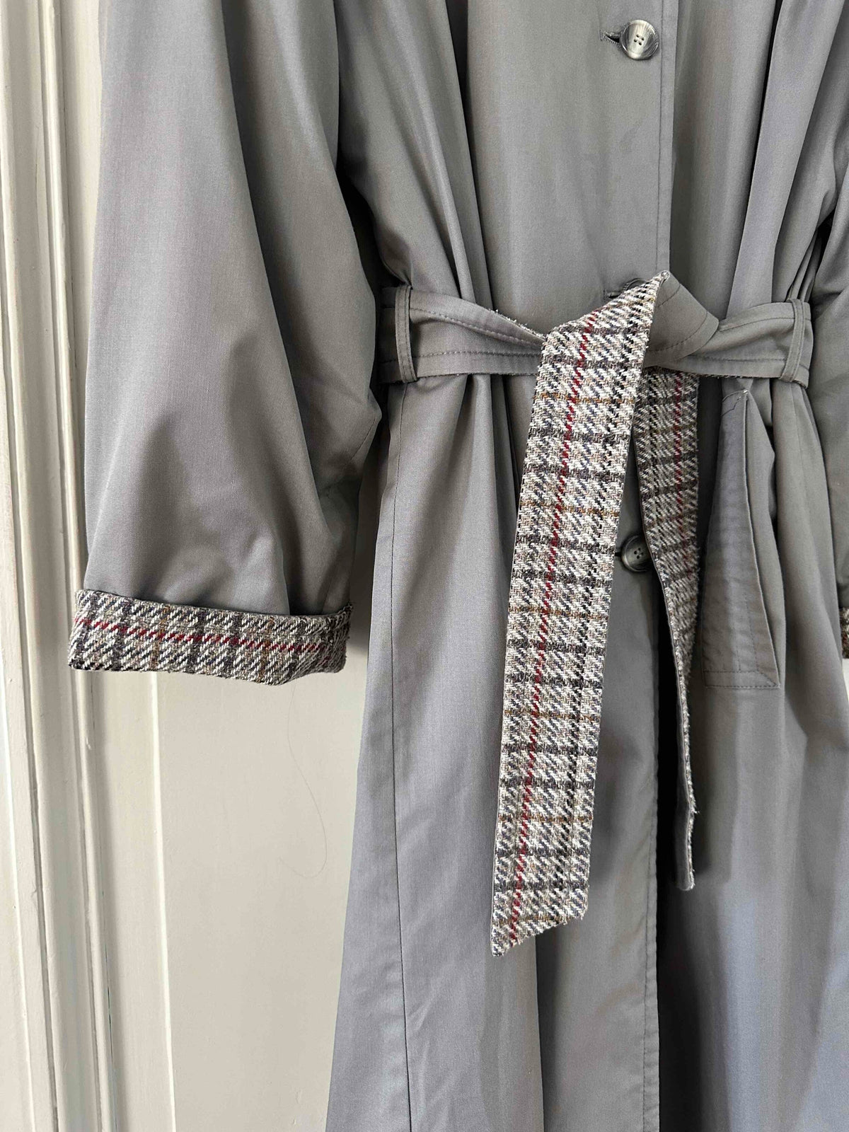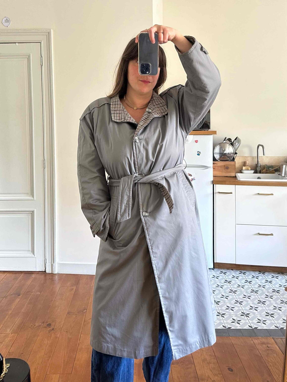 Prix unitaire parTrench réversible, en gabardine gris souris réversible, lainage carreaux, prince-de-galles blancs, gris et caramel et bordeaux, boutonnage des deux côtés, ceinture taille à nouer, taille 40, porté ici sur une personne taille 40.