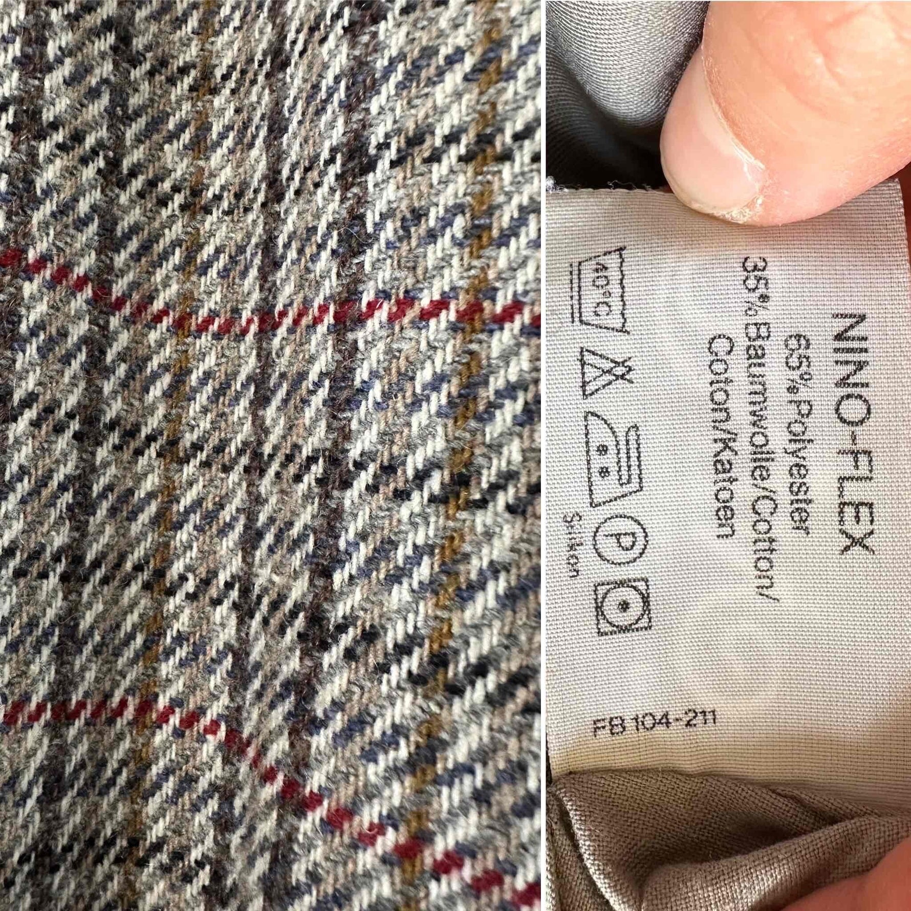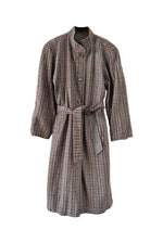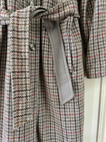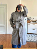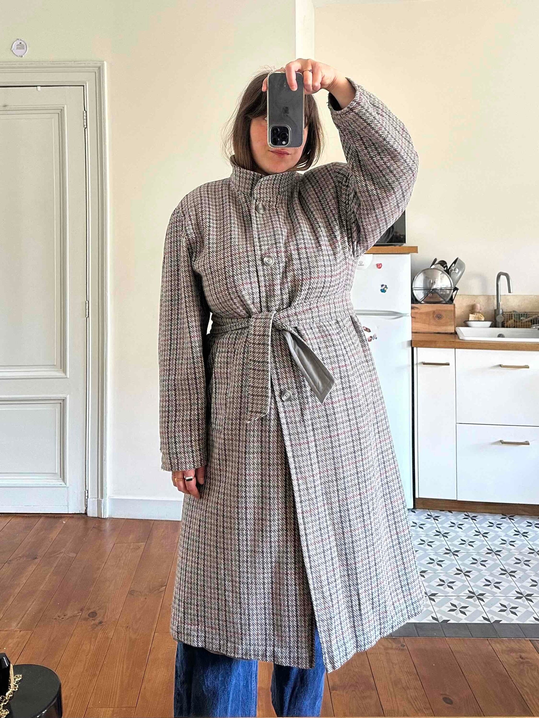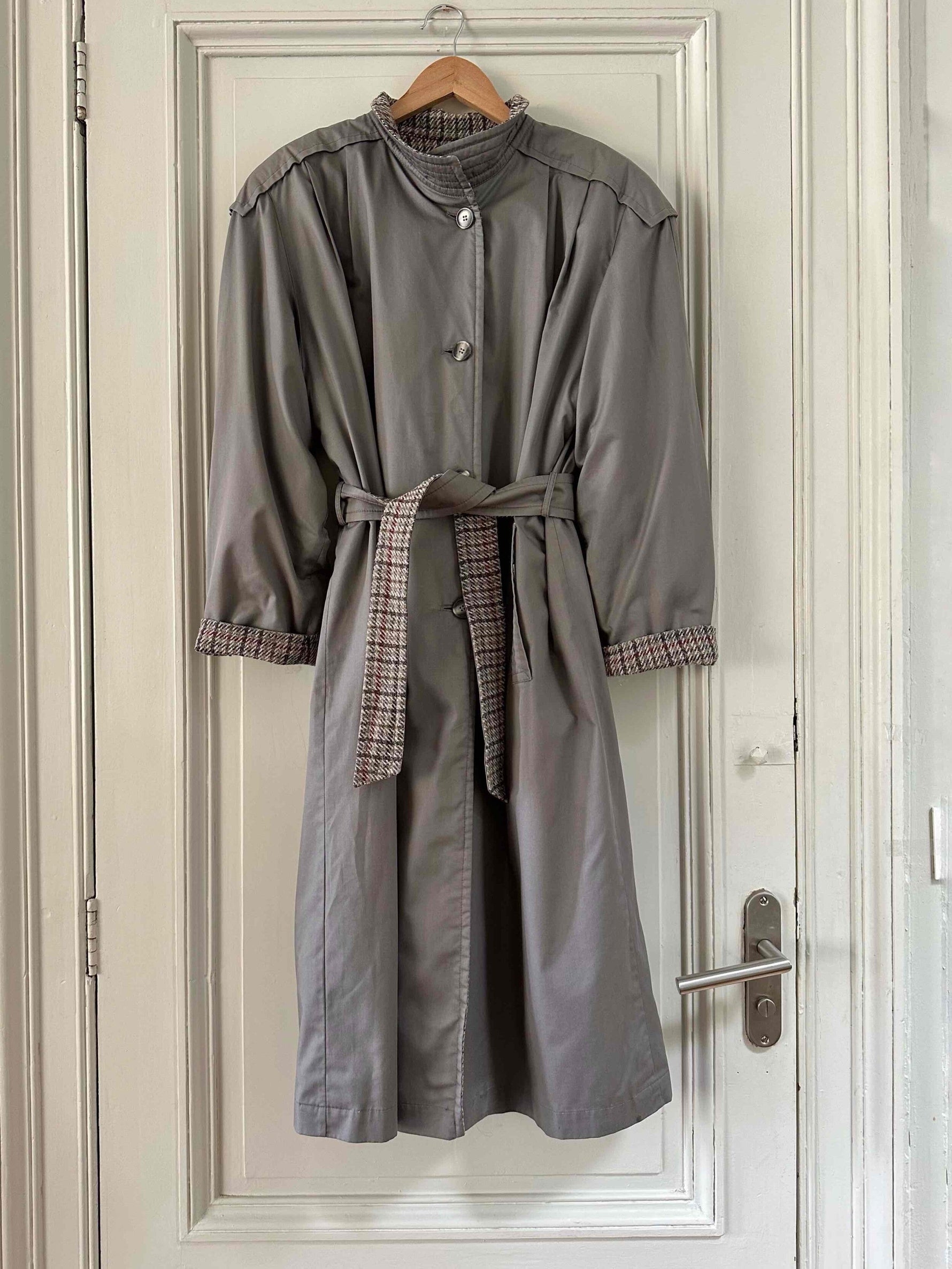 Prix unitaire parTrench réversible, en gabardine gris souris réversible, lainage carreaux, prince-de-galles blancs, gris et caramel et bordeaux, boutonnage des deux côtés, ceinture taille à nouer, taille 40, porté ici sur une personne taille 40.