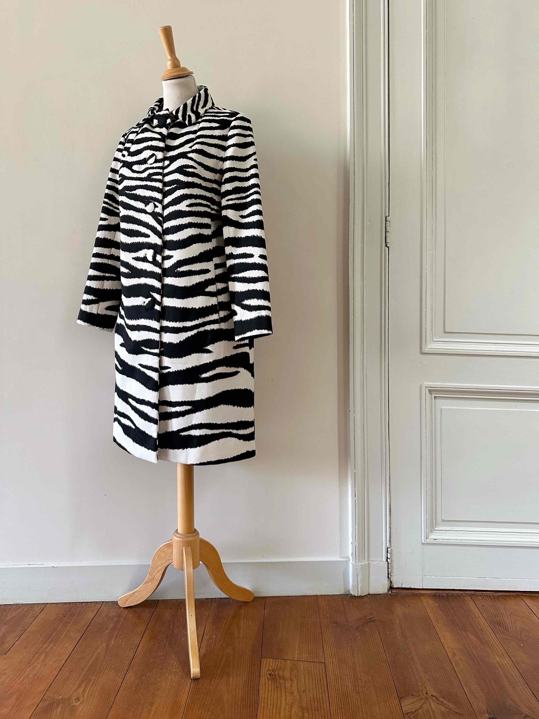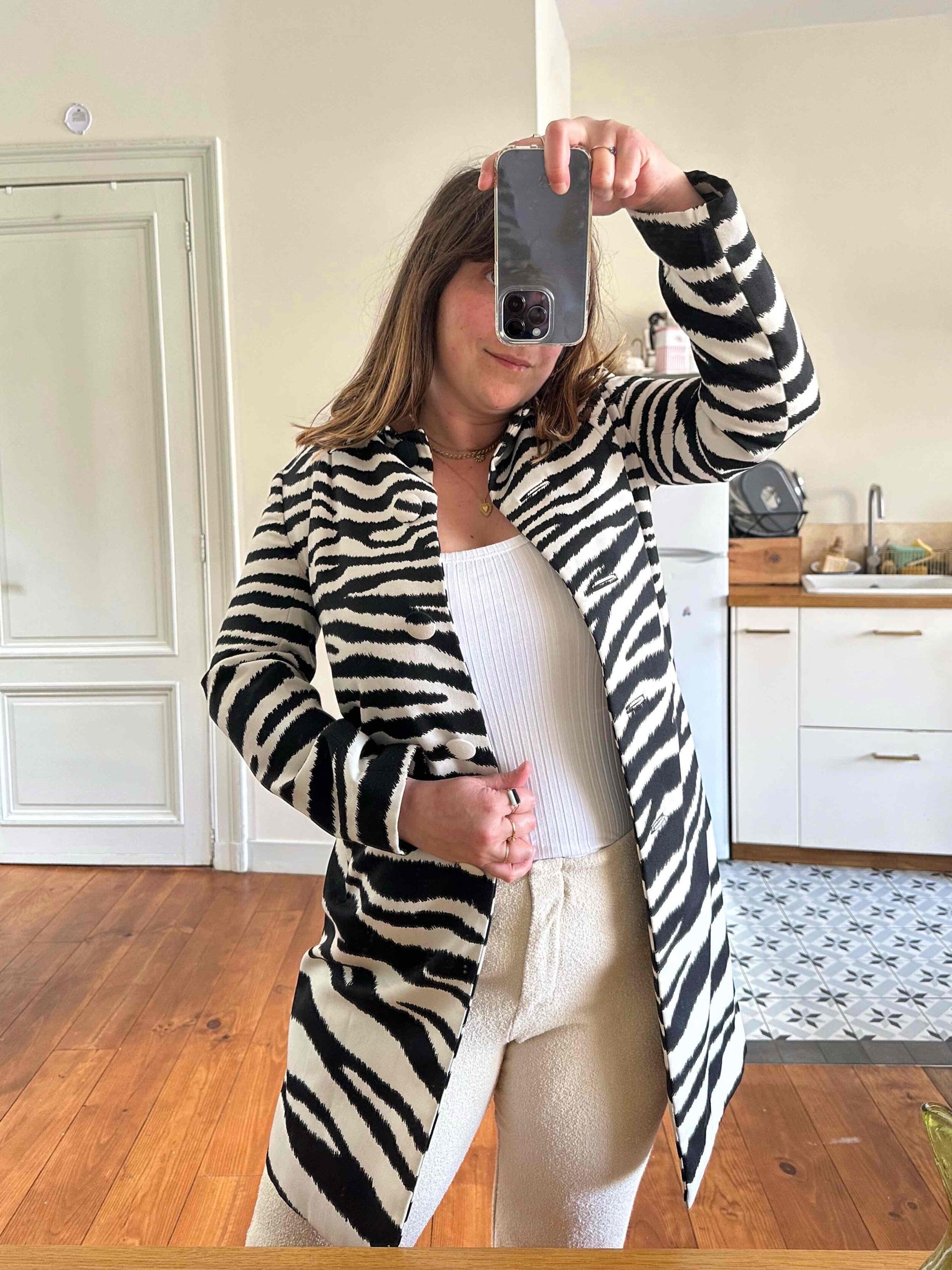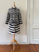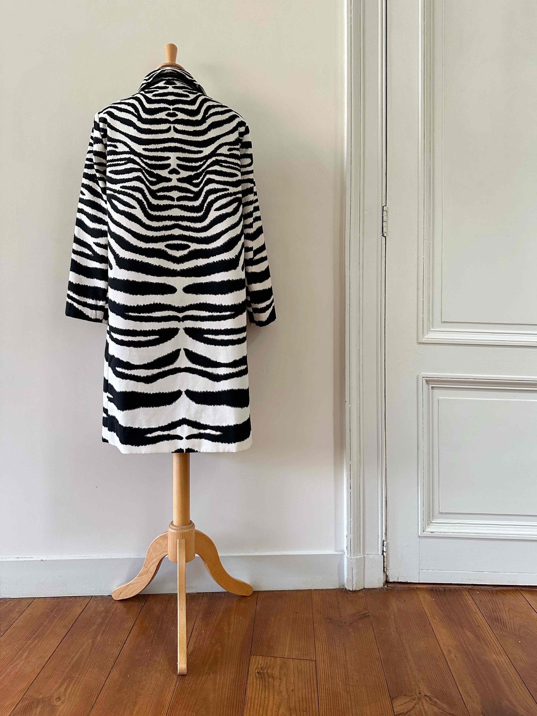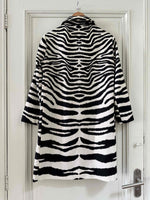 Prix unitaire parTrench Zébré, en tergal et coton blanc imprimé motifs zèbre, boutons recouverts, col Claudine, forme droite légèrement évasée, fabriqué en France, taille 36, portée ici sur un mannequin T36 et ouvert sur une personne T40.