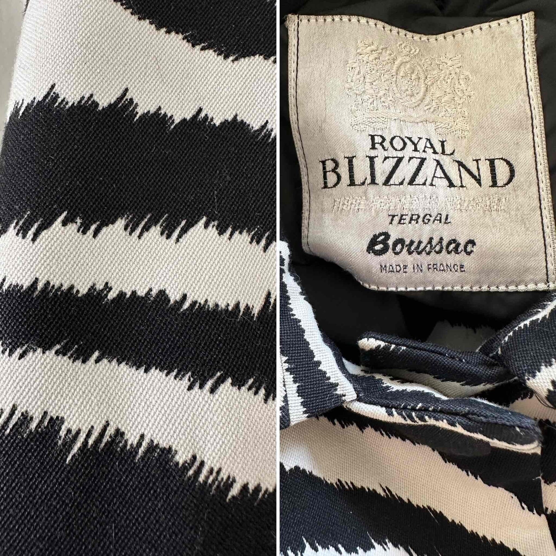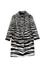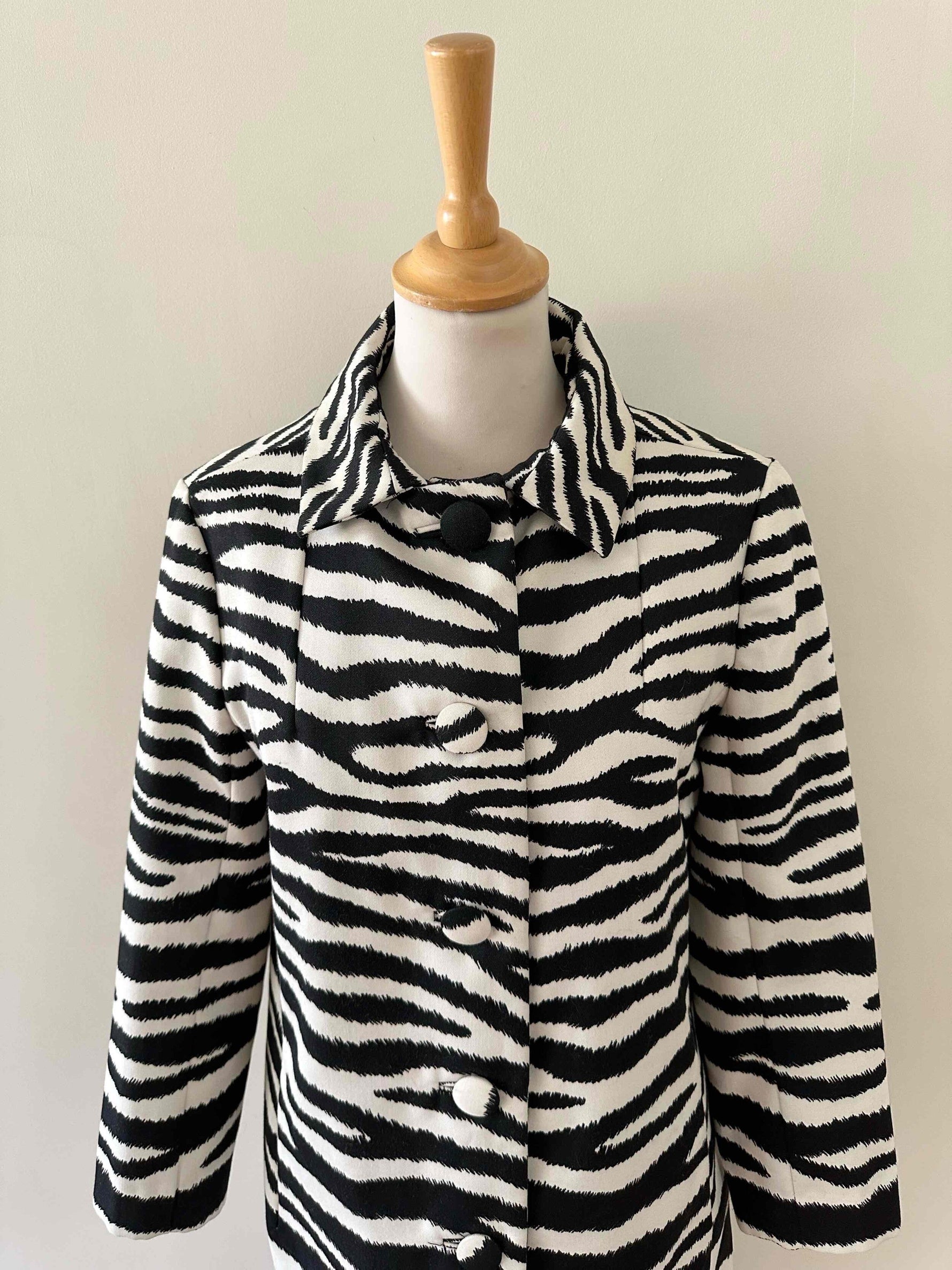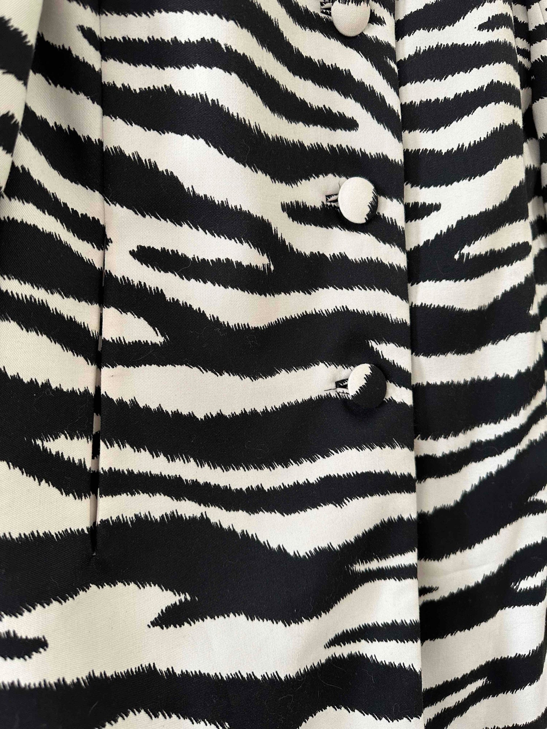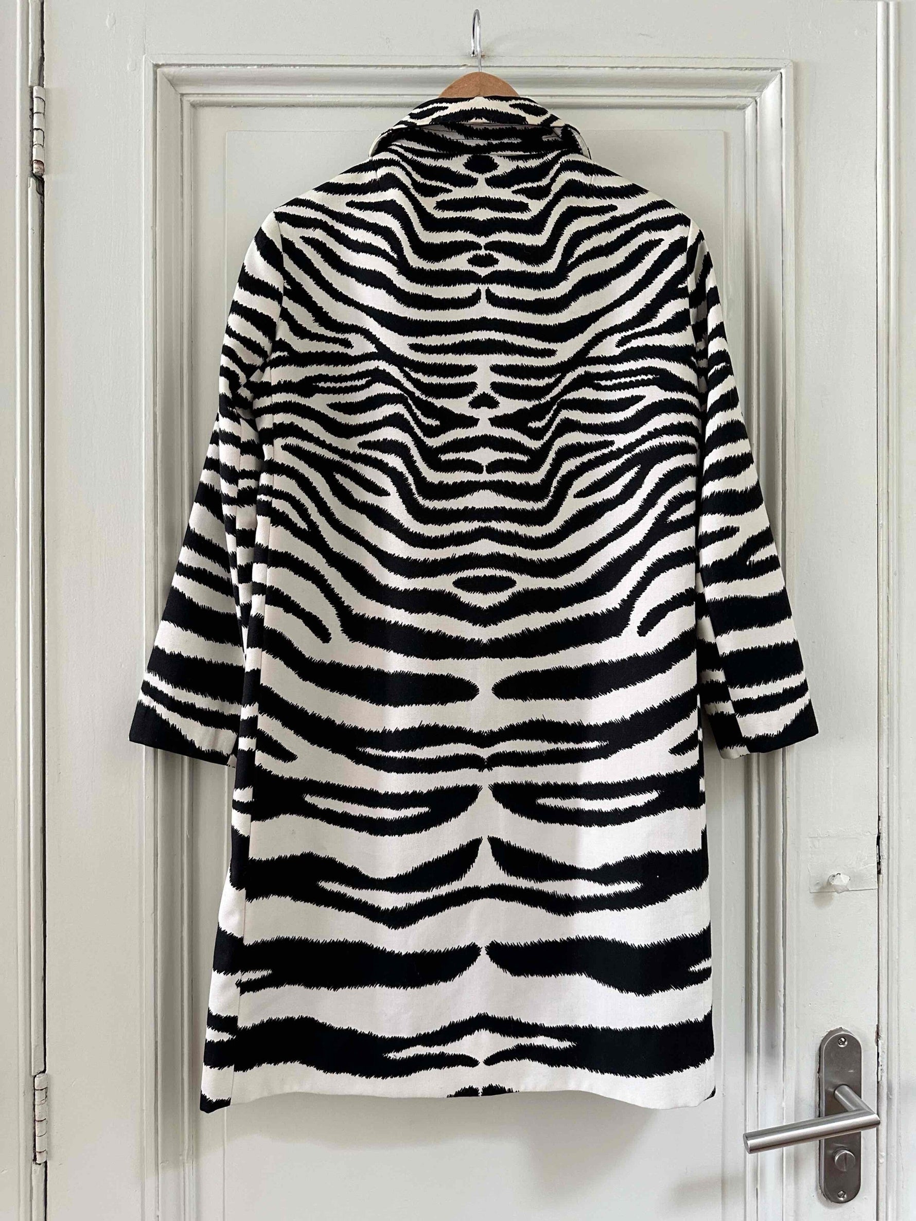 Prix unitaire parTrench Zébré, en tergal et coton blanc imprimé motifs zèbre, boutons recouverts, col Claudine, forme droite légèrement évasée, fabriqué en France, taille 36, portée ici sur un mannequin T36 et ouvert sur une personne T40.