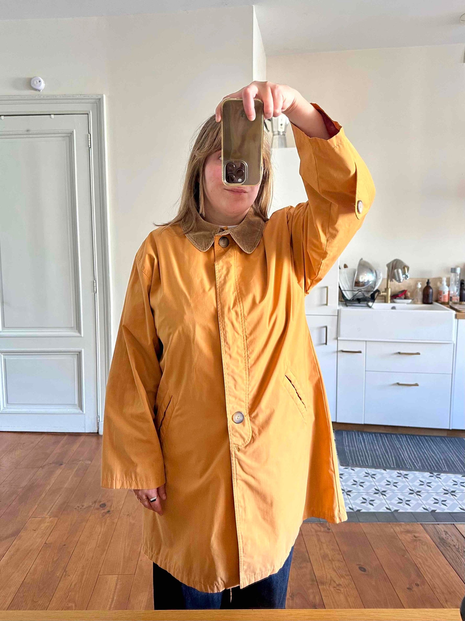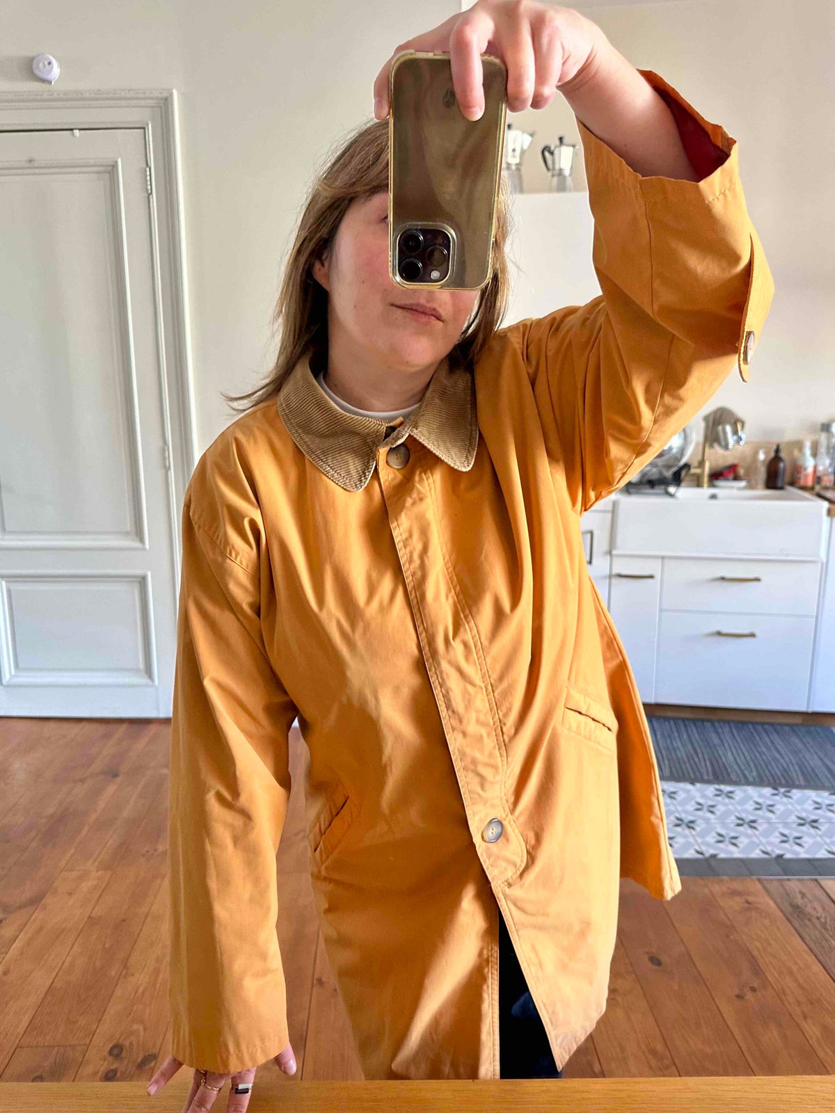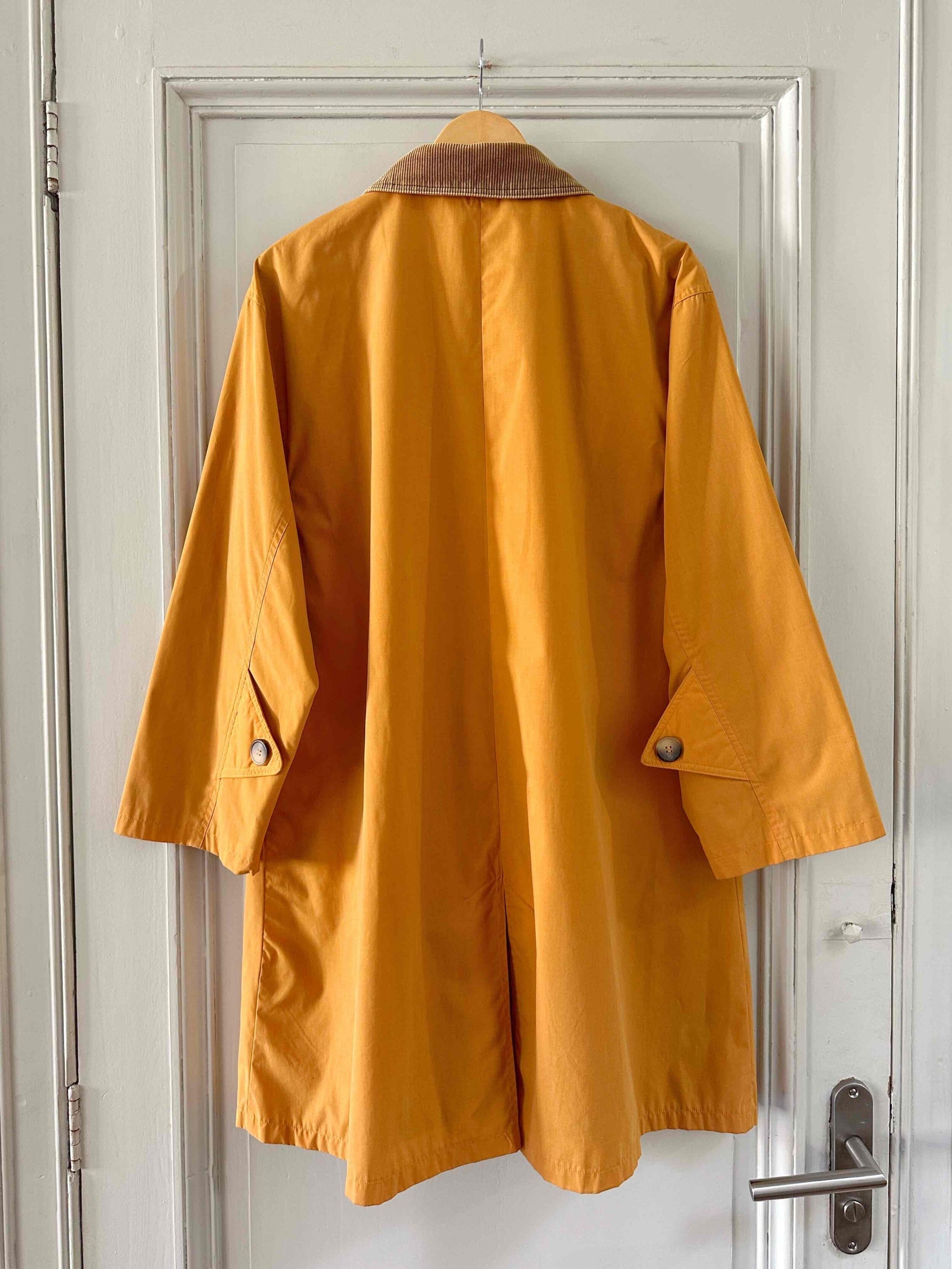 Trench col velours, style barbour en toile de coton mélangé jaune ocre, col en velours côtelé camel, boutonnage droit, forme évasée paletot.