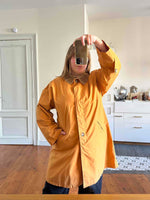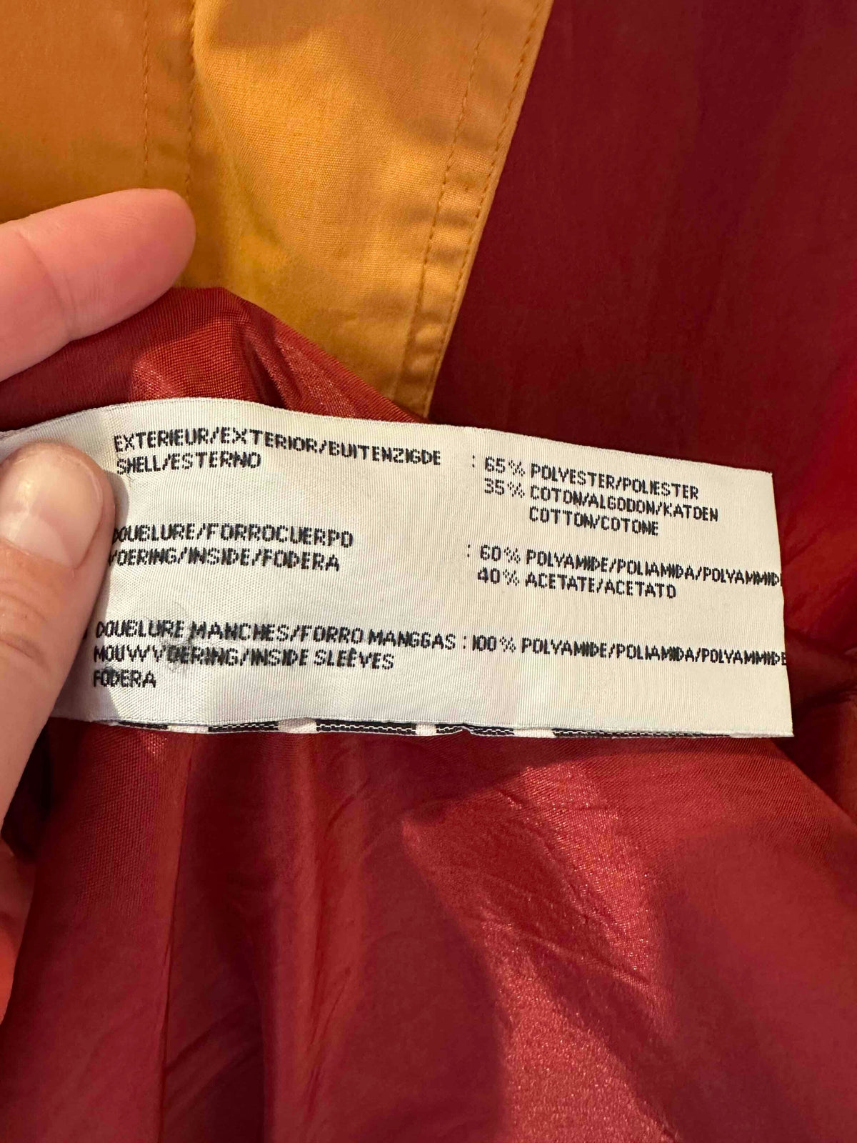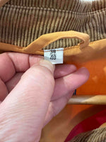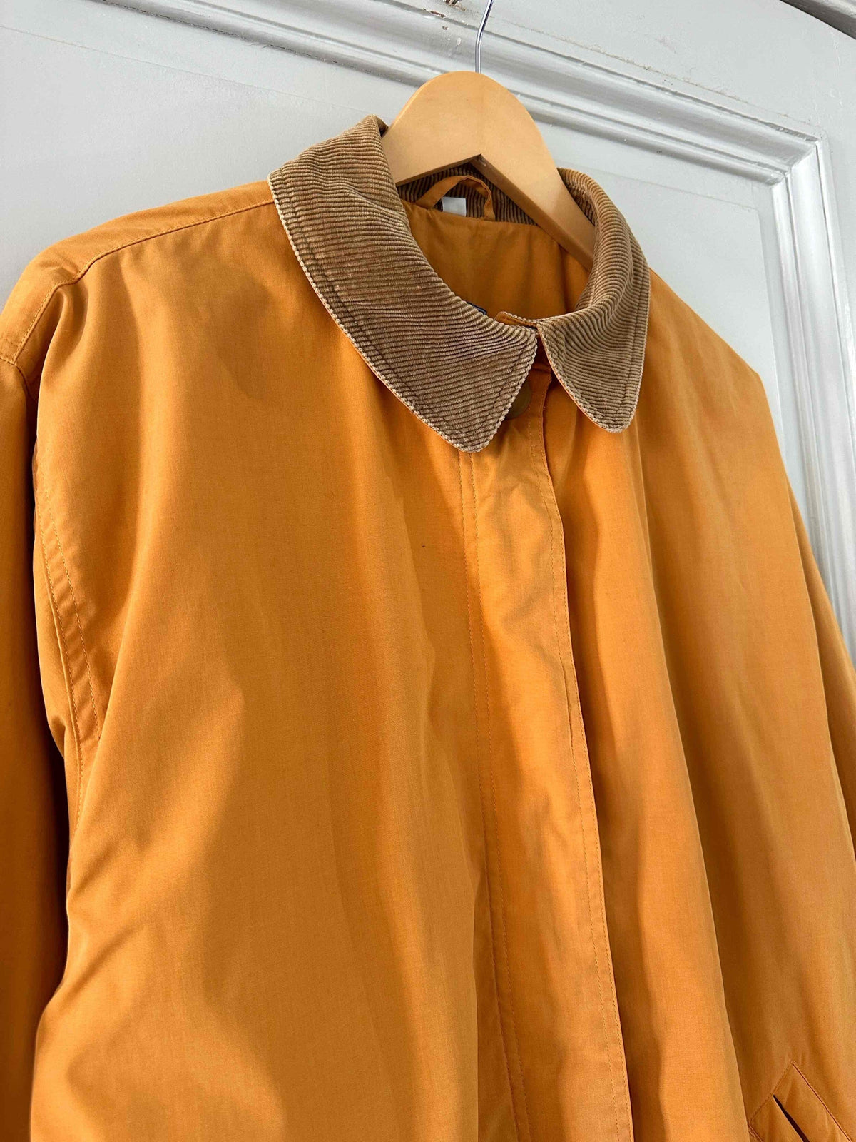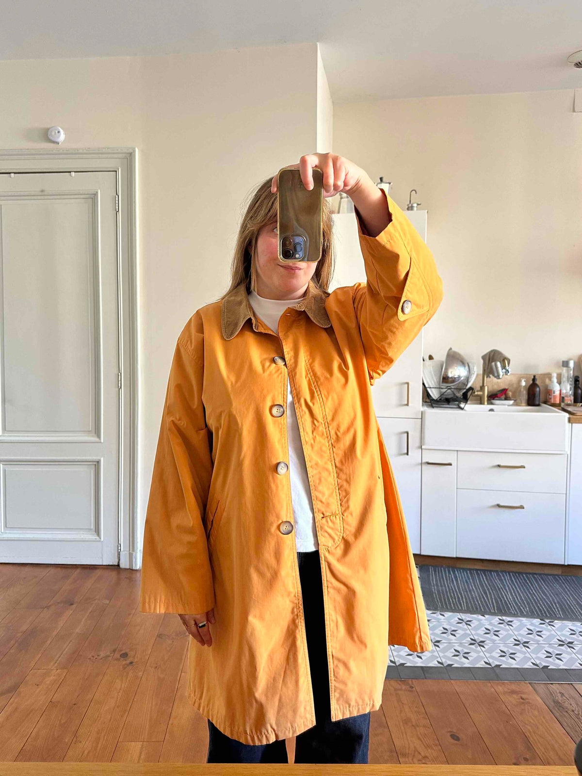 Trench col velours, style barbour en toile de coton mélangé jaune ocre, col en velours côtelé camel, boutonnage droit, forme évasée paletot.