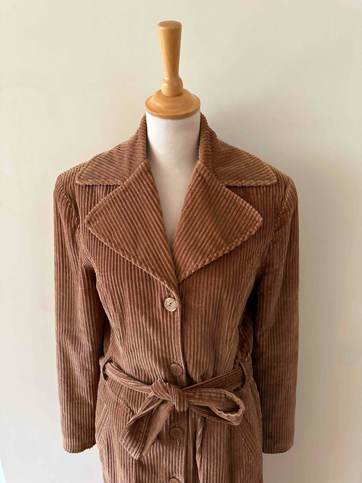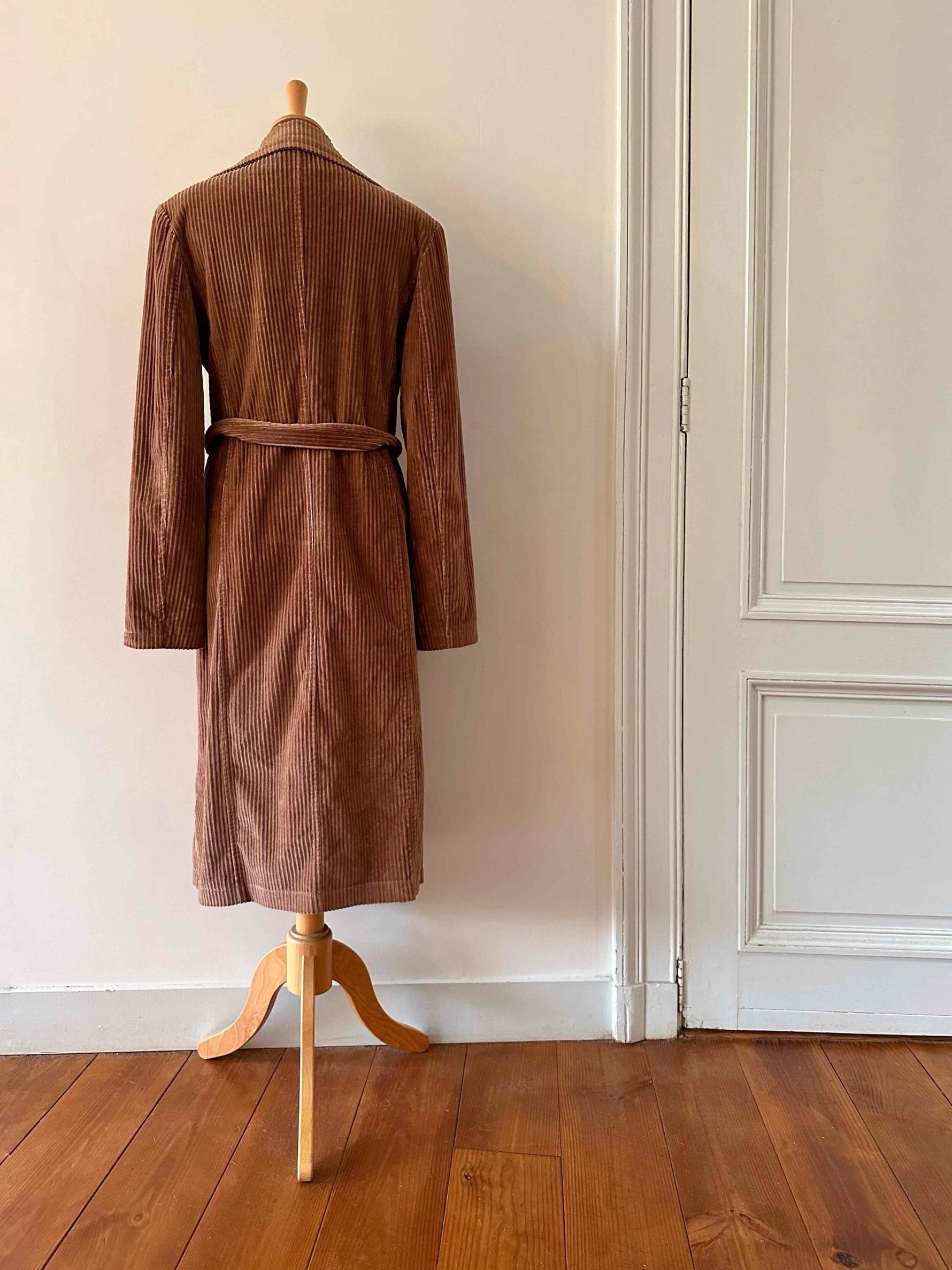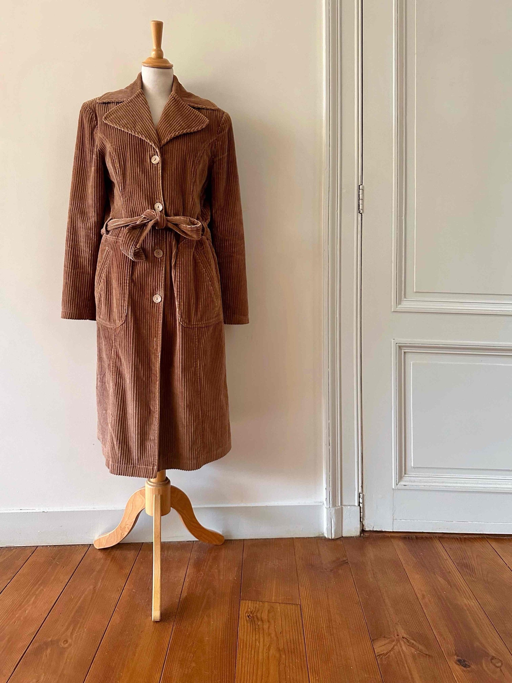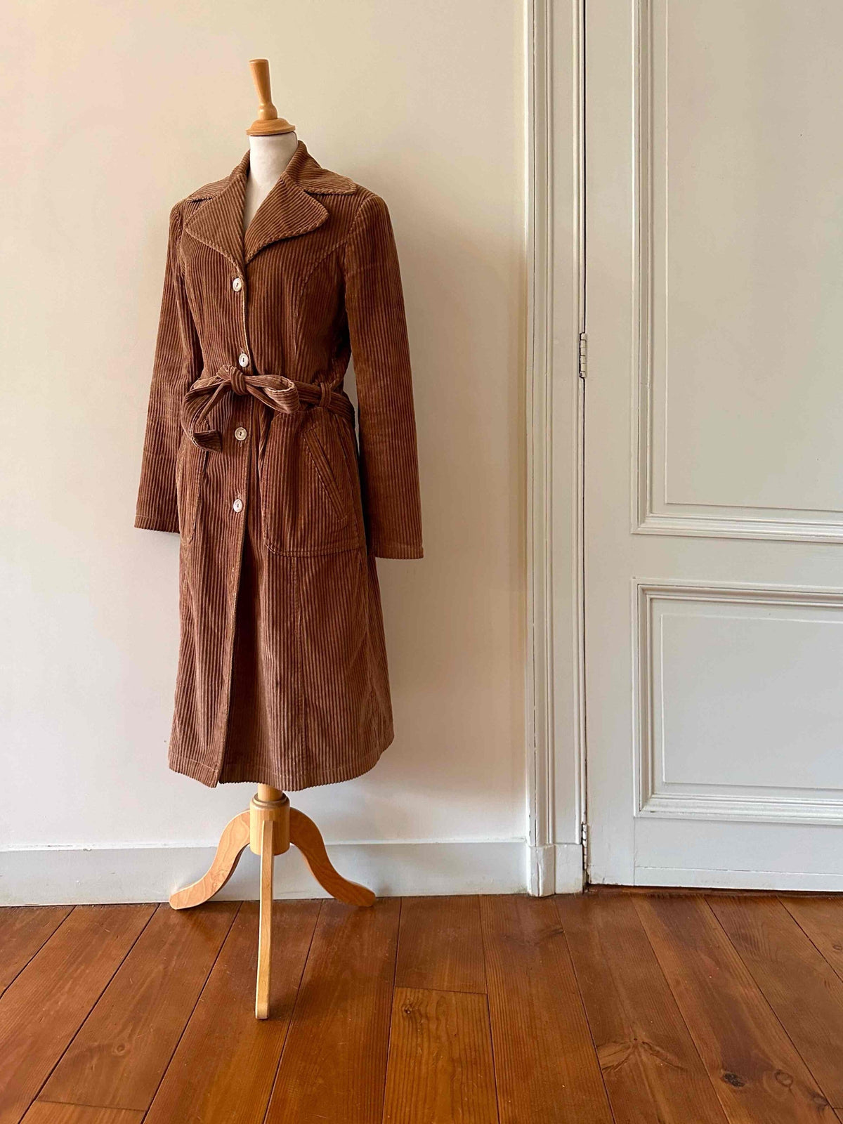 Prix unitaire parTrench en velours côtelé 70s, en velours corduroy de coton marron caramel, boutonné et ceinture taille à nouer, années 70s, taille 36 porté ici sur un mannequin T36 et ouvert sur une personne T40.