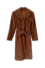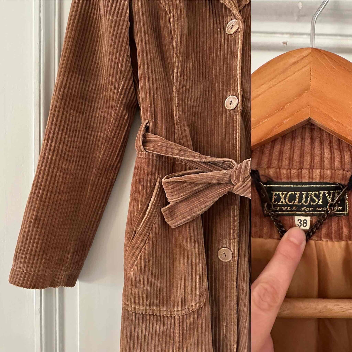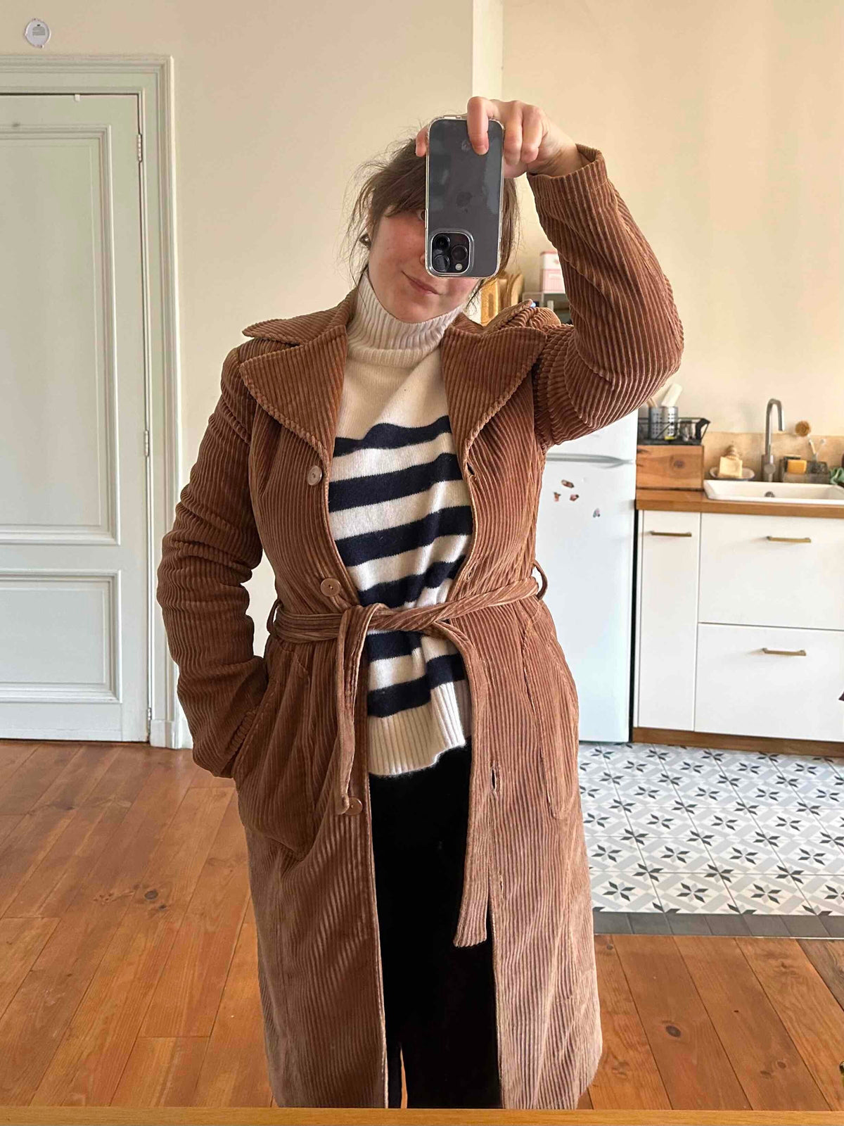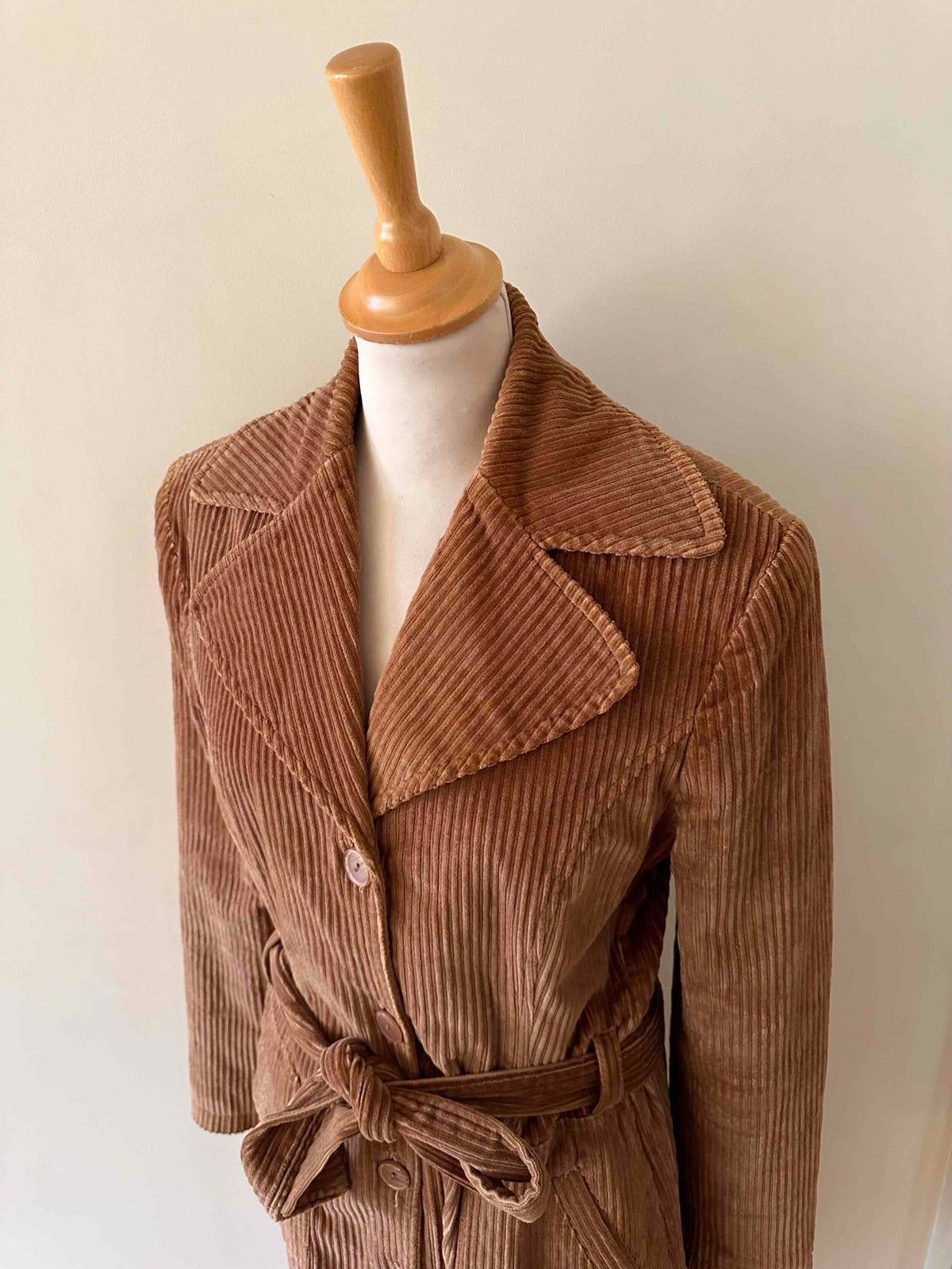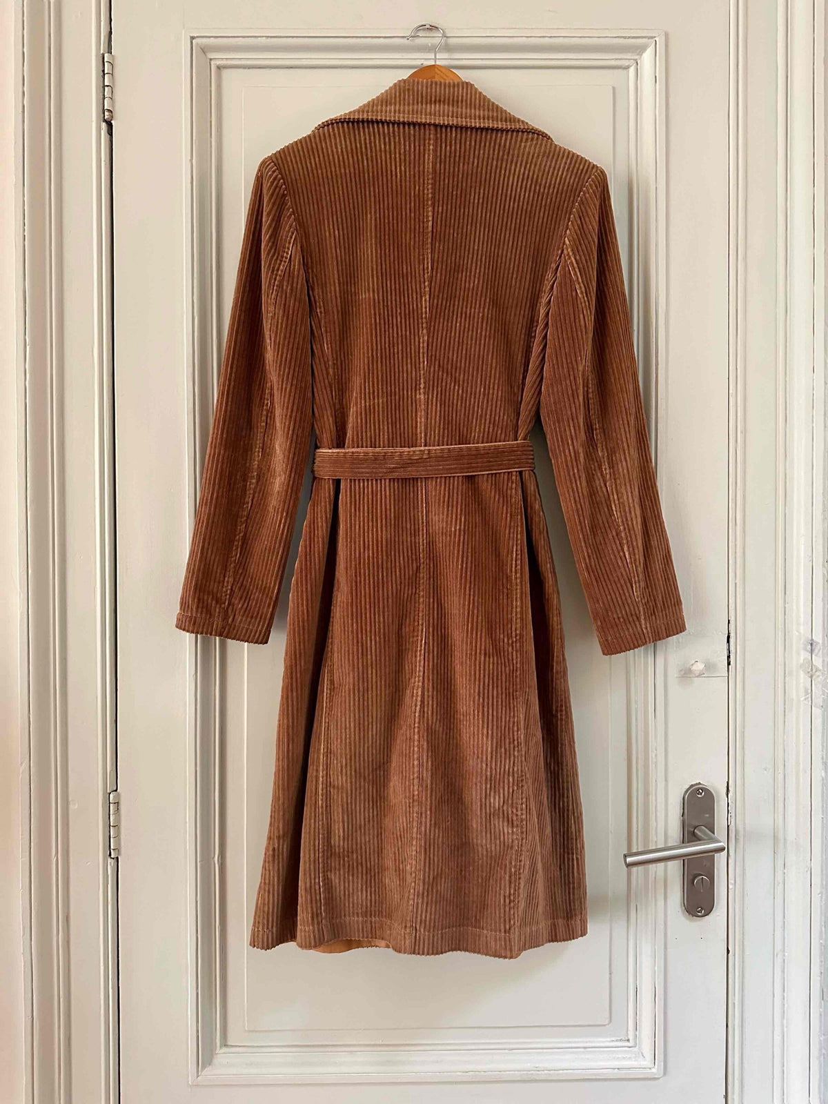Prix unitaire parTrench en velours côtelé 70s, en velours corduroy de coton marron caramel, boutonné et ceinture taille à nouer, années 70s, taille 36 porté ici sur un mannequin T36 et ouvert sur une personne T40.