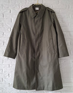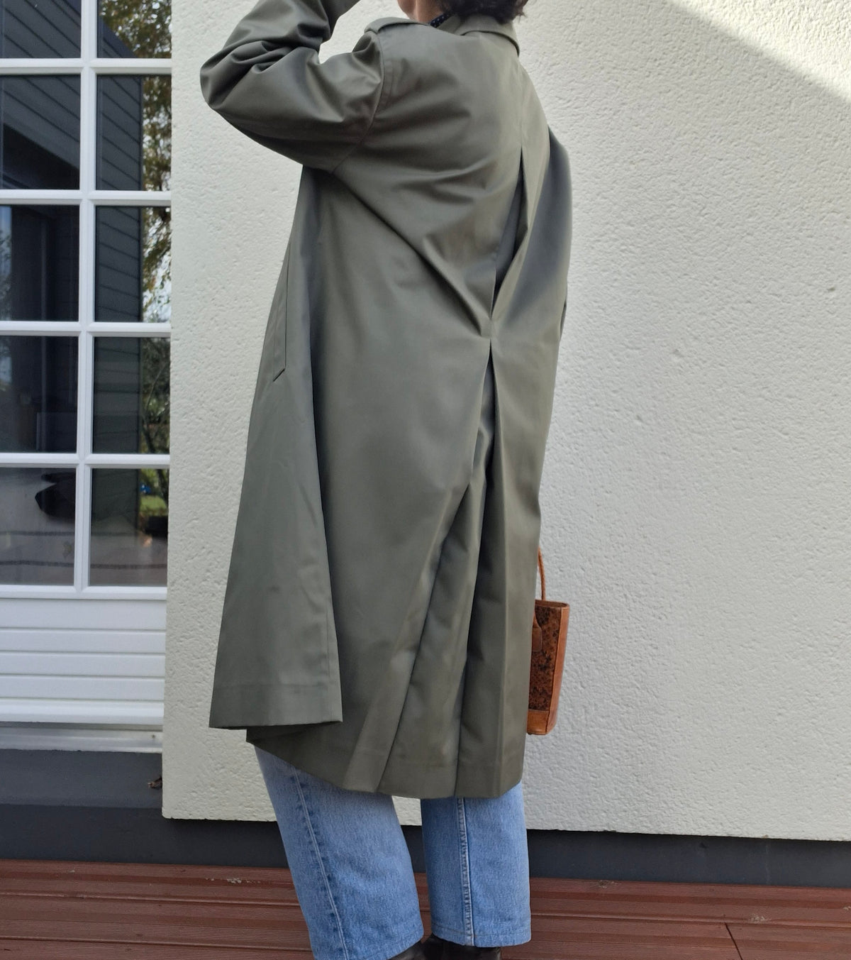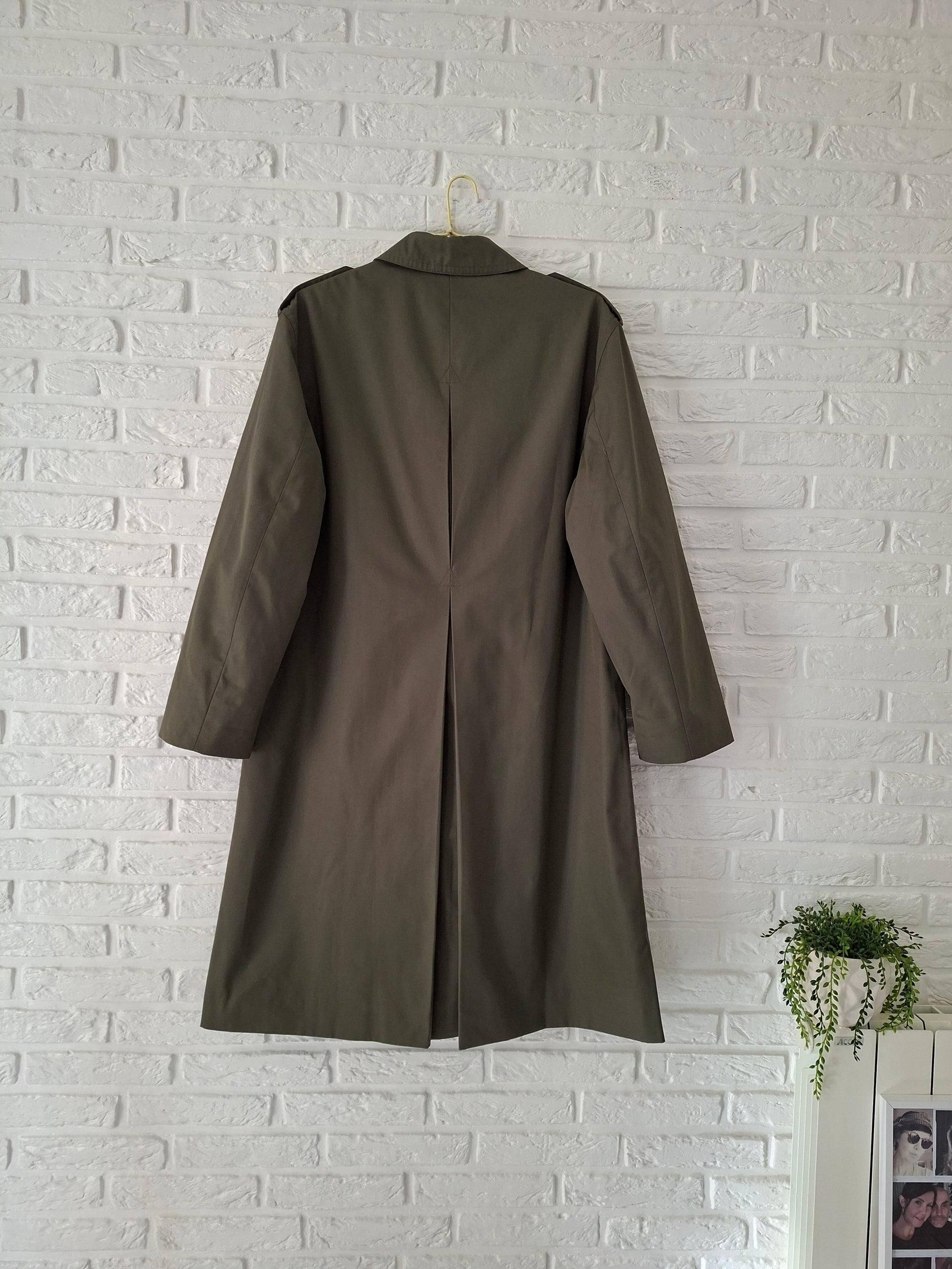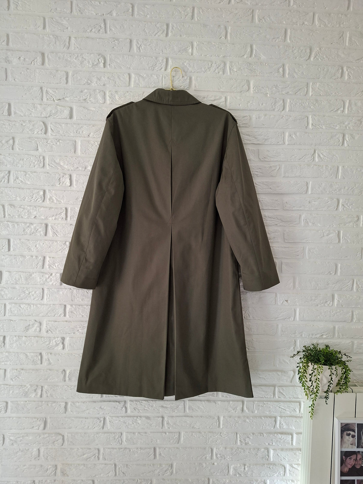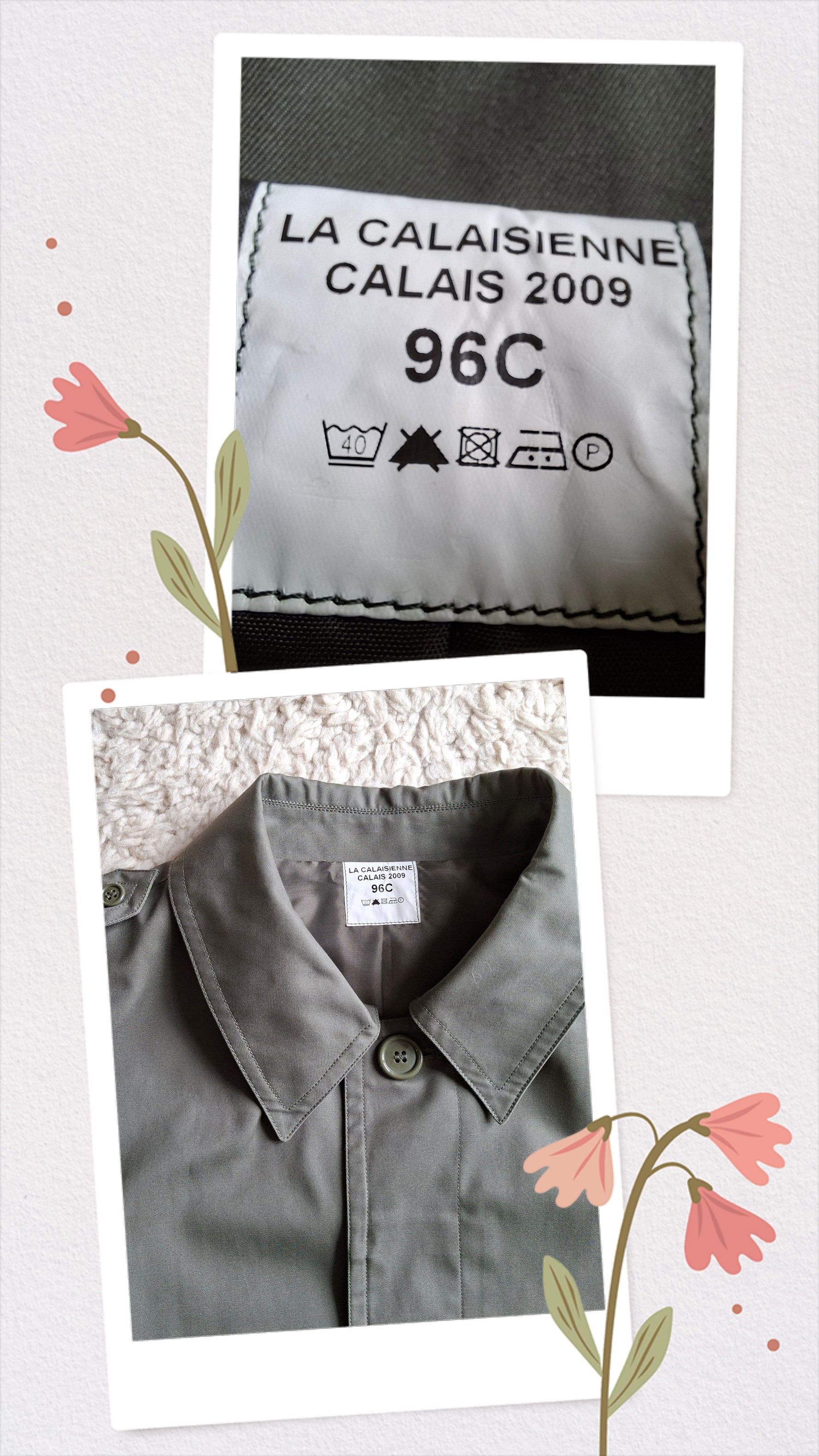Trench "La Calaisienne" Made in France. Forme droite, ample avec un long pli creux dans le dos. 2 poches. Doublé.Epaulettes.Conviendra de la taille 40 à la taille 44. Épaules 44cm Poitrine 57cm Longueur 110cm