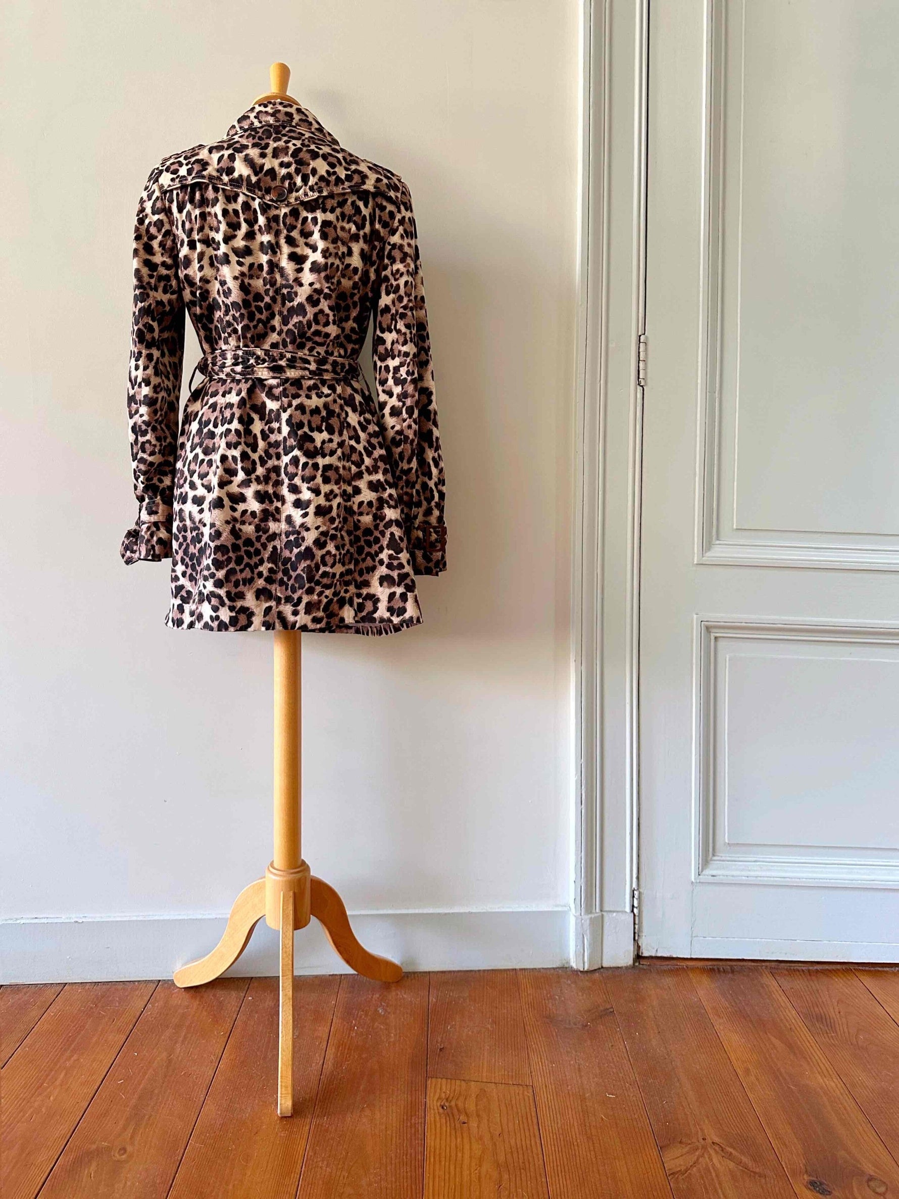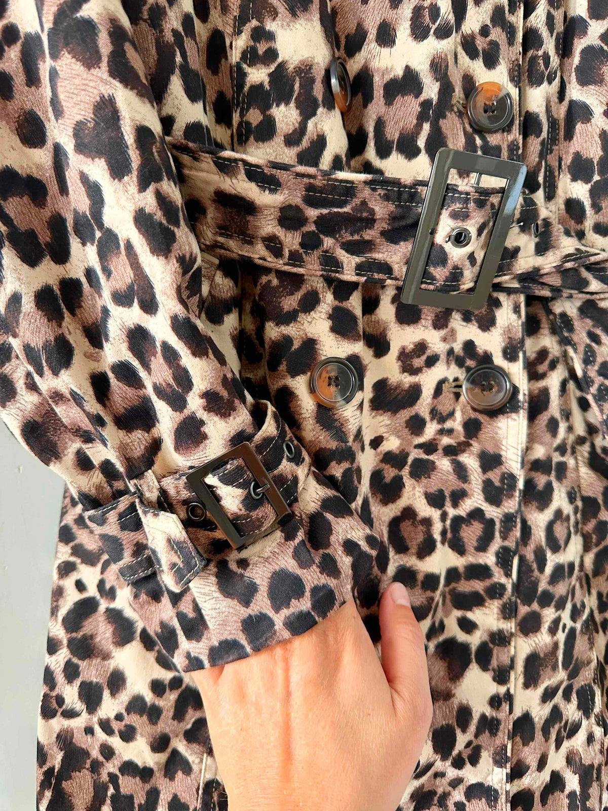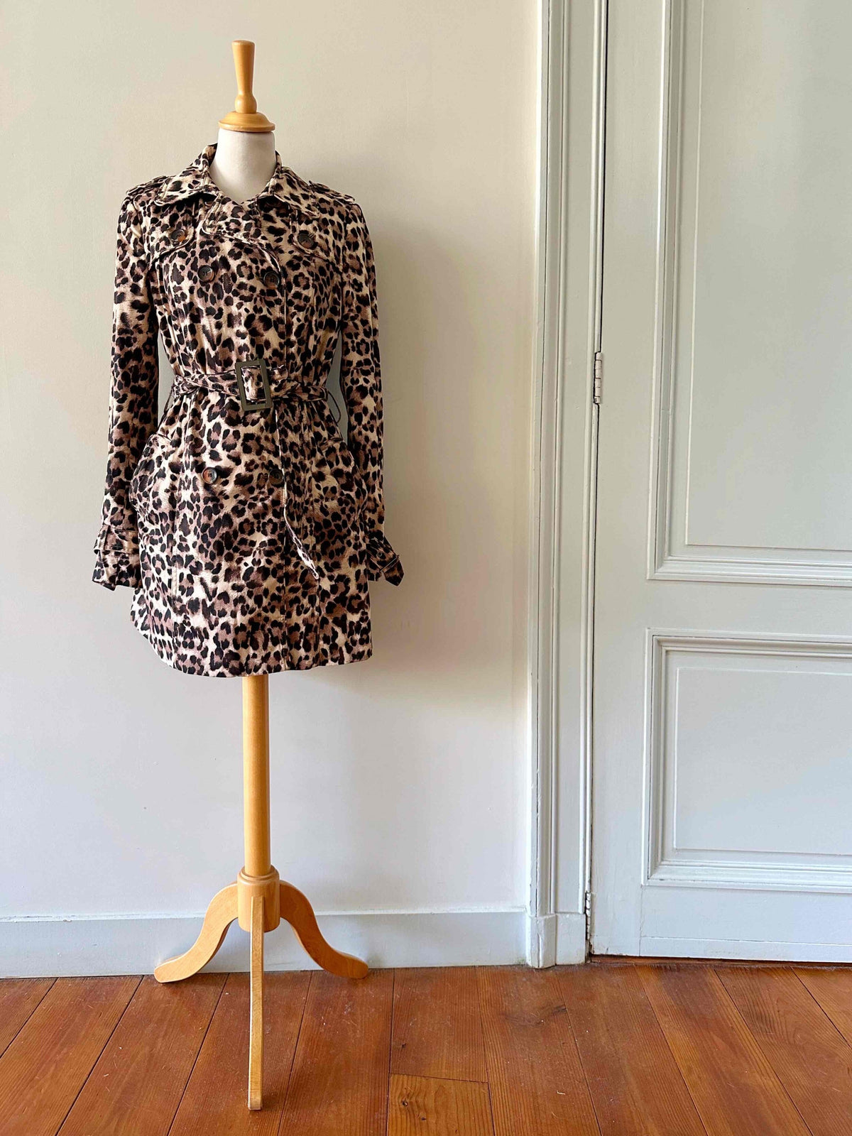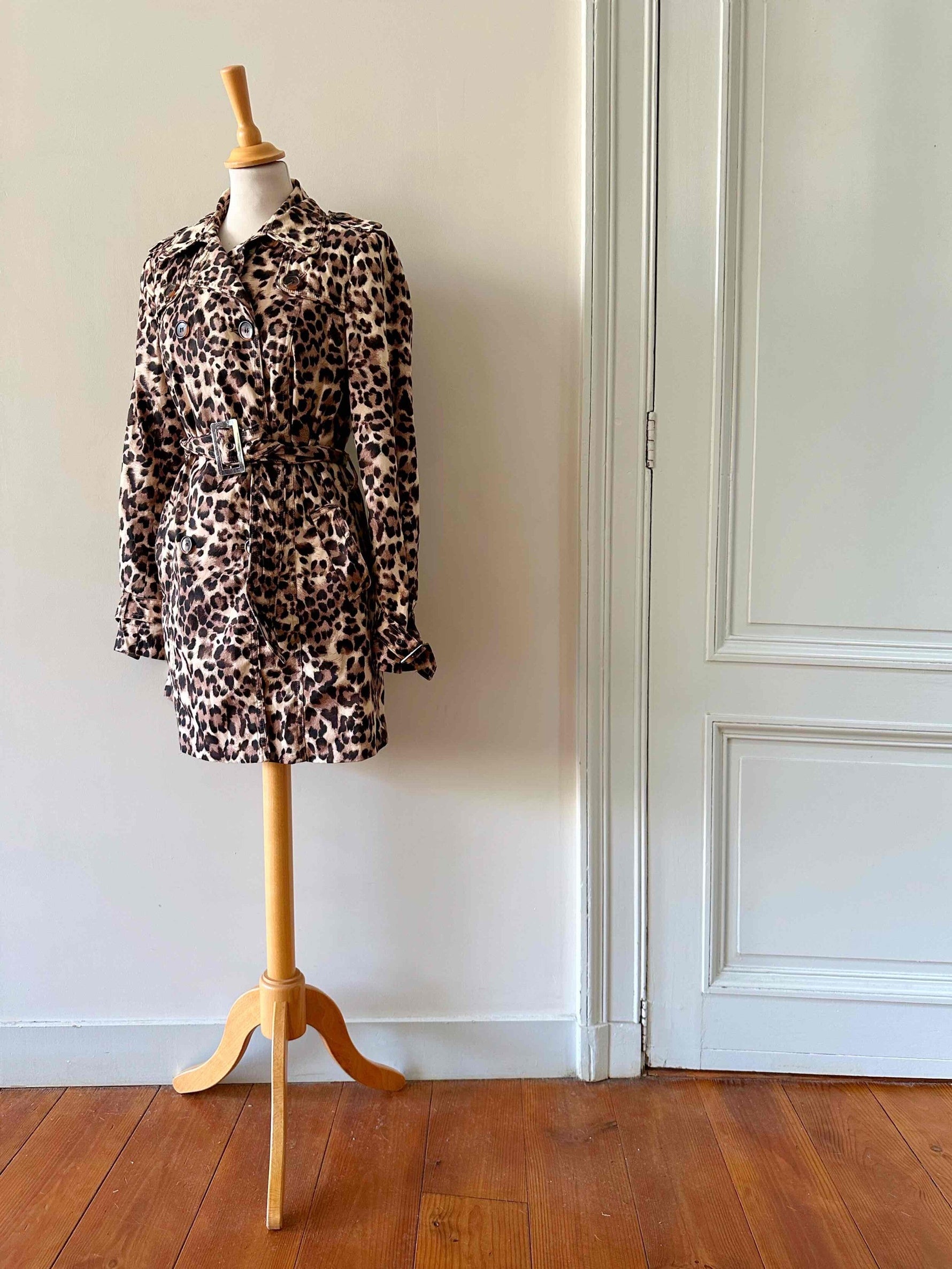 Prix unitaire parTrench leopard en coton, 100% coton imprimé léopard, boutonnage croisé, sangles à boucles aux poignets, ceinture taille a boucle métallique, taille 36 porté ici sur un mannequin T36.