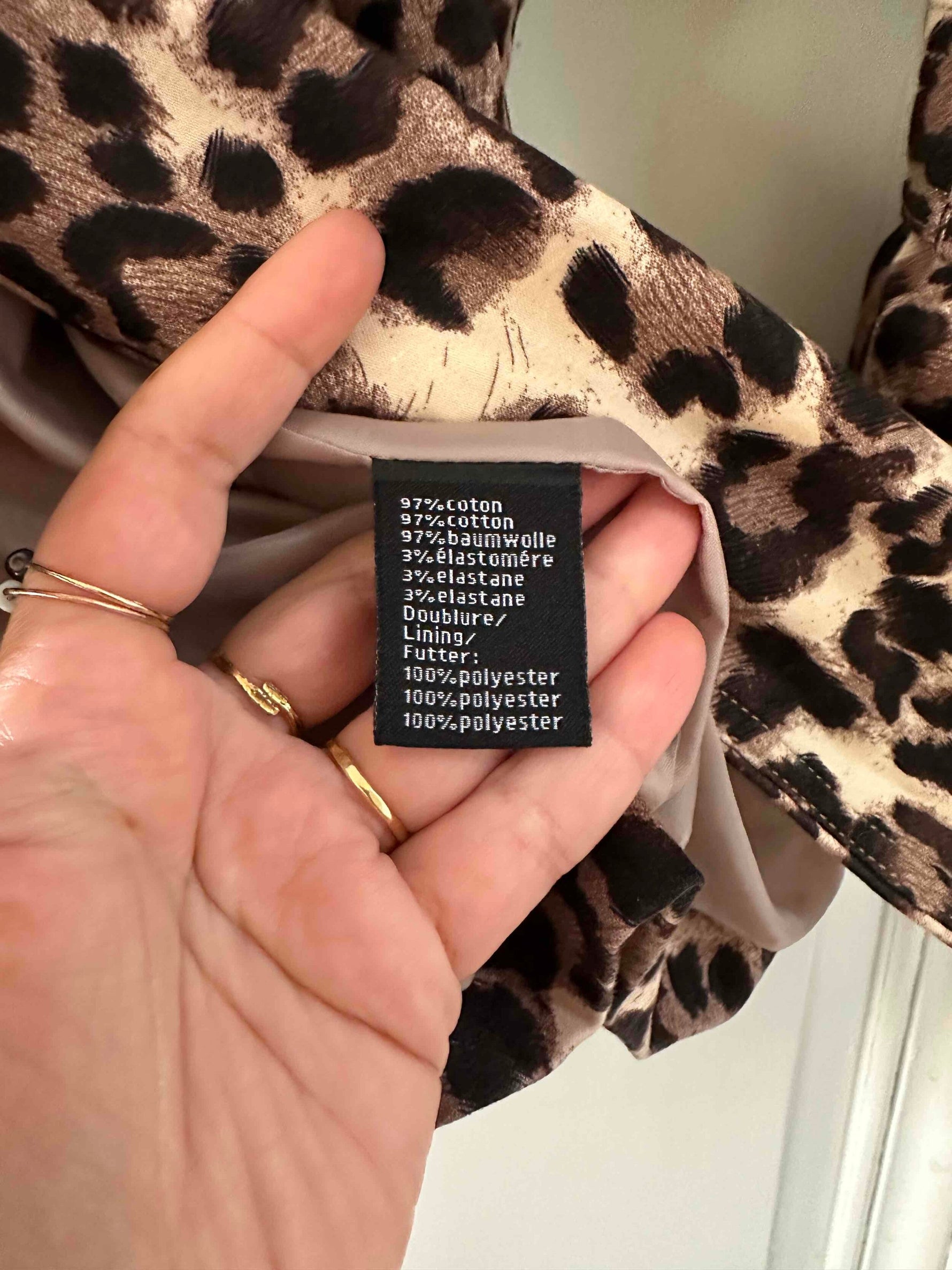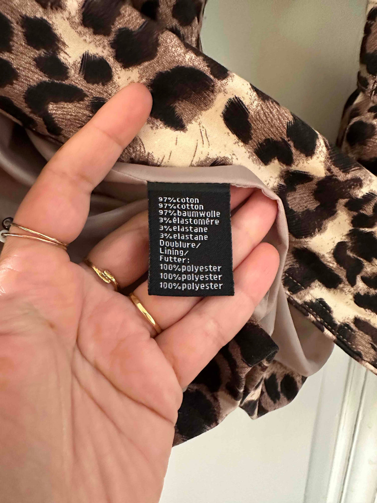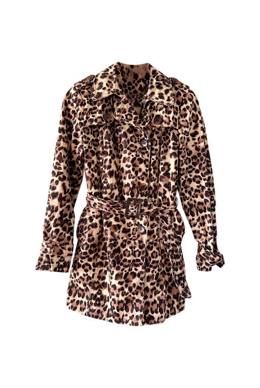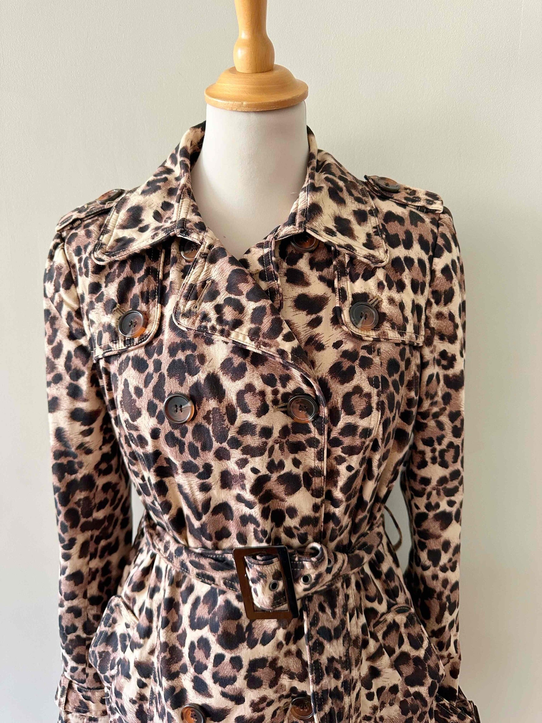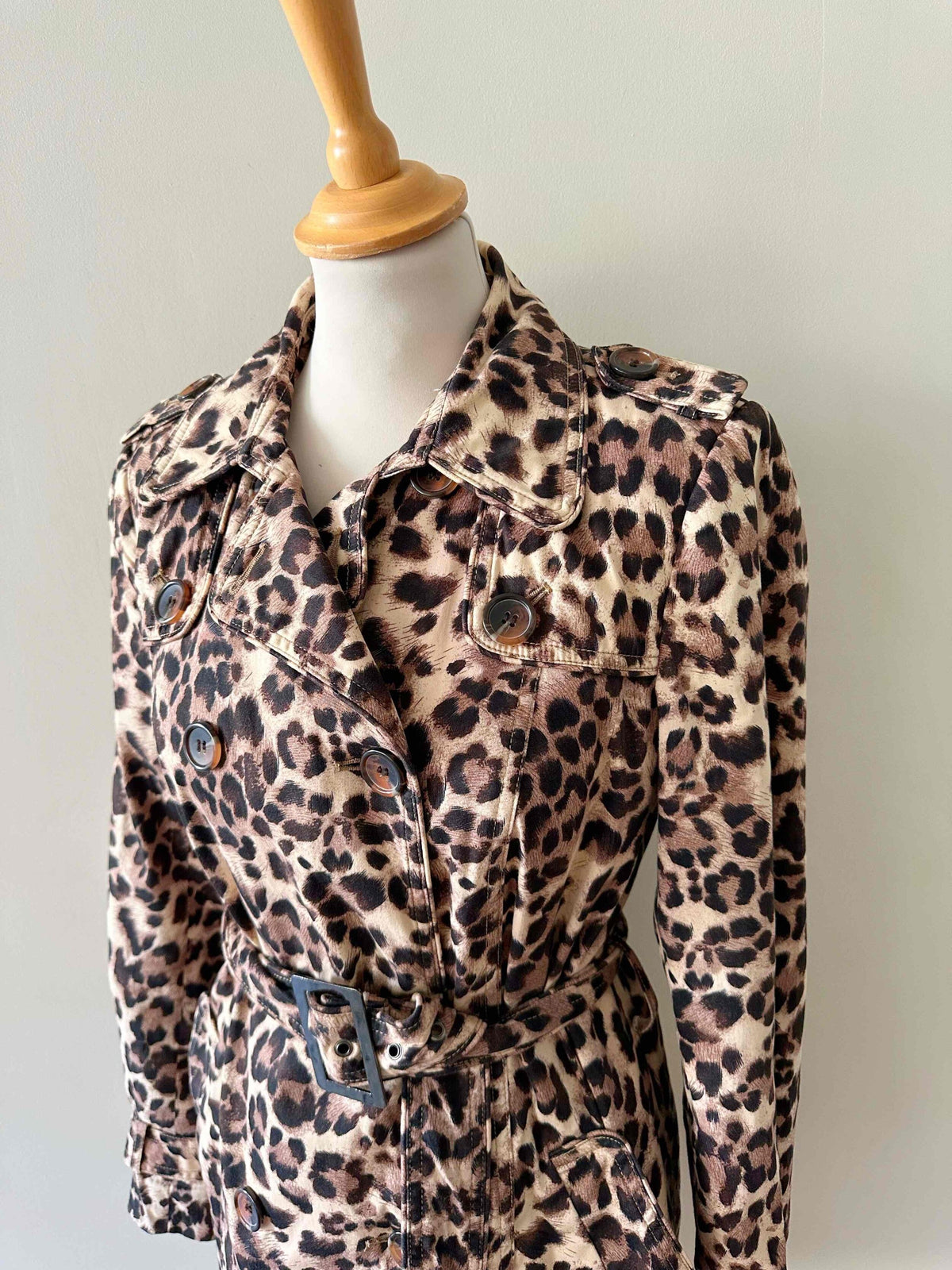 Prix unitaire parTrench leopard en coton, 100% coton imprimé léopard, boutonnage croisé, sangles à boucles aux poignets, ceinture taille a boucle métallique, taille 36 porté ici sur un mannequin T36.