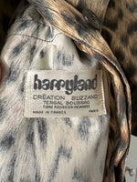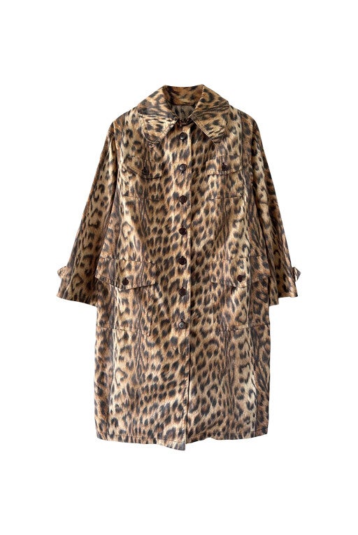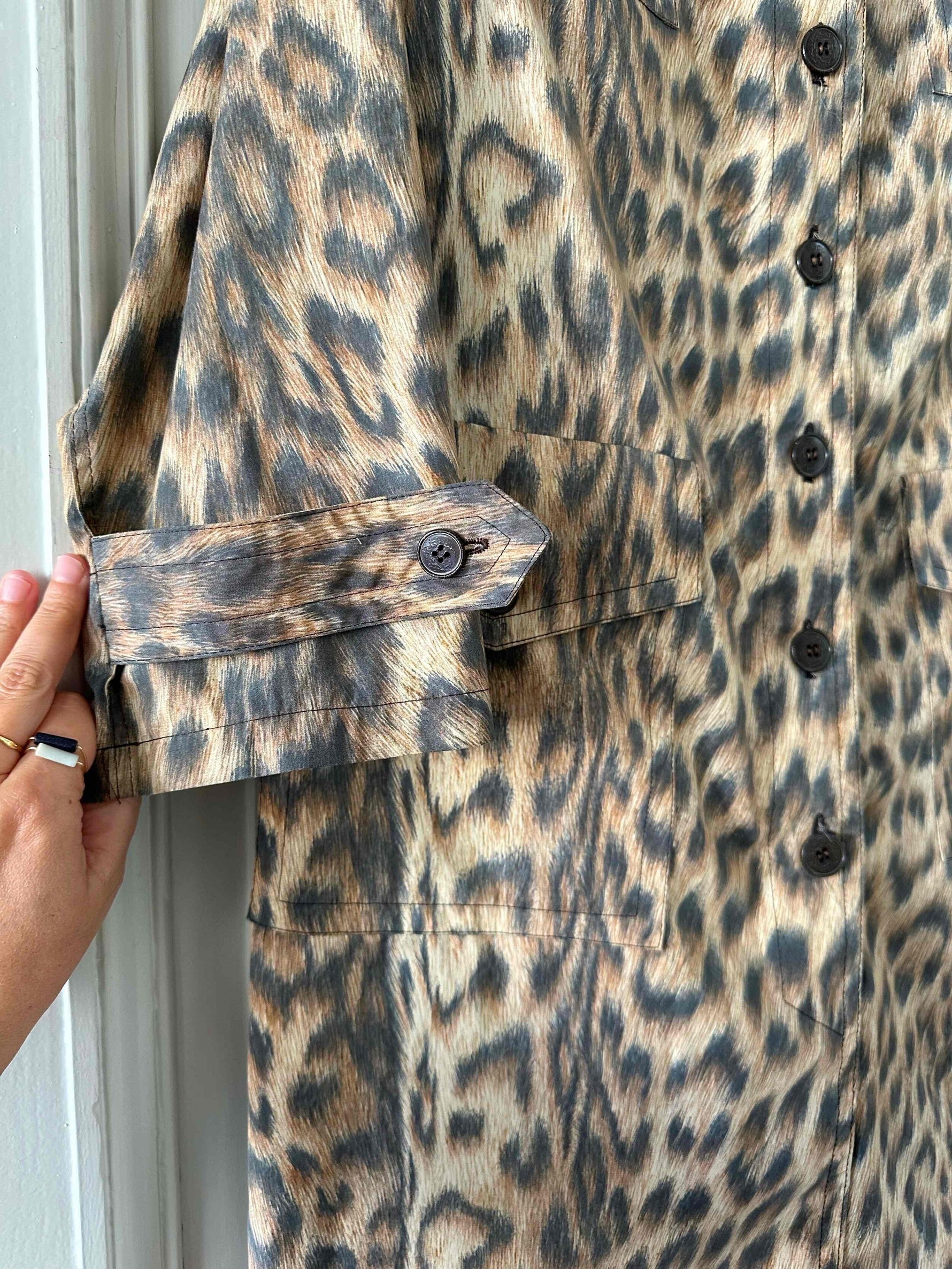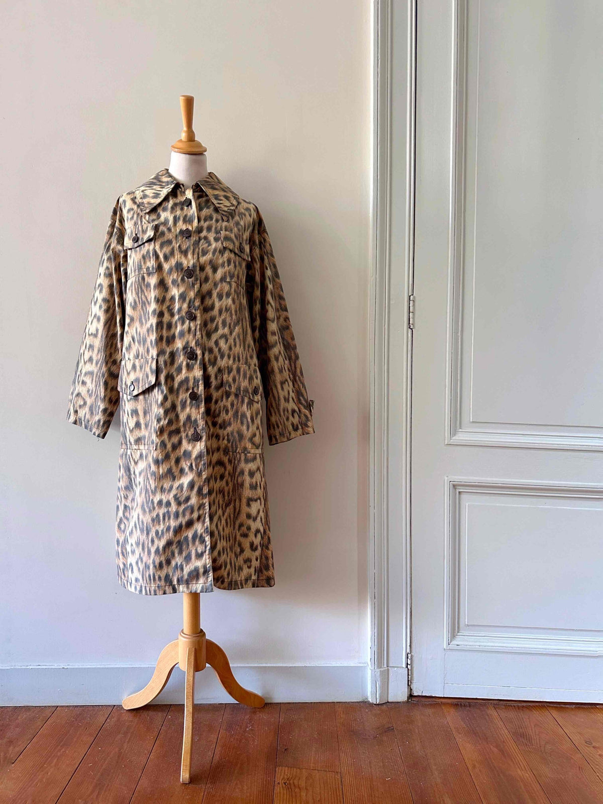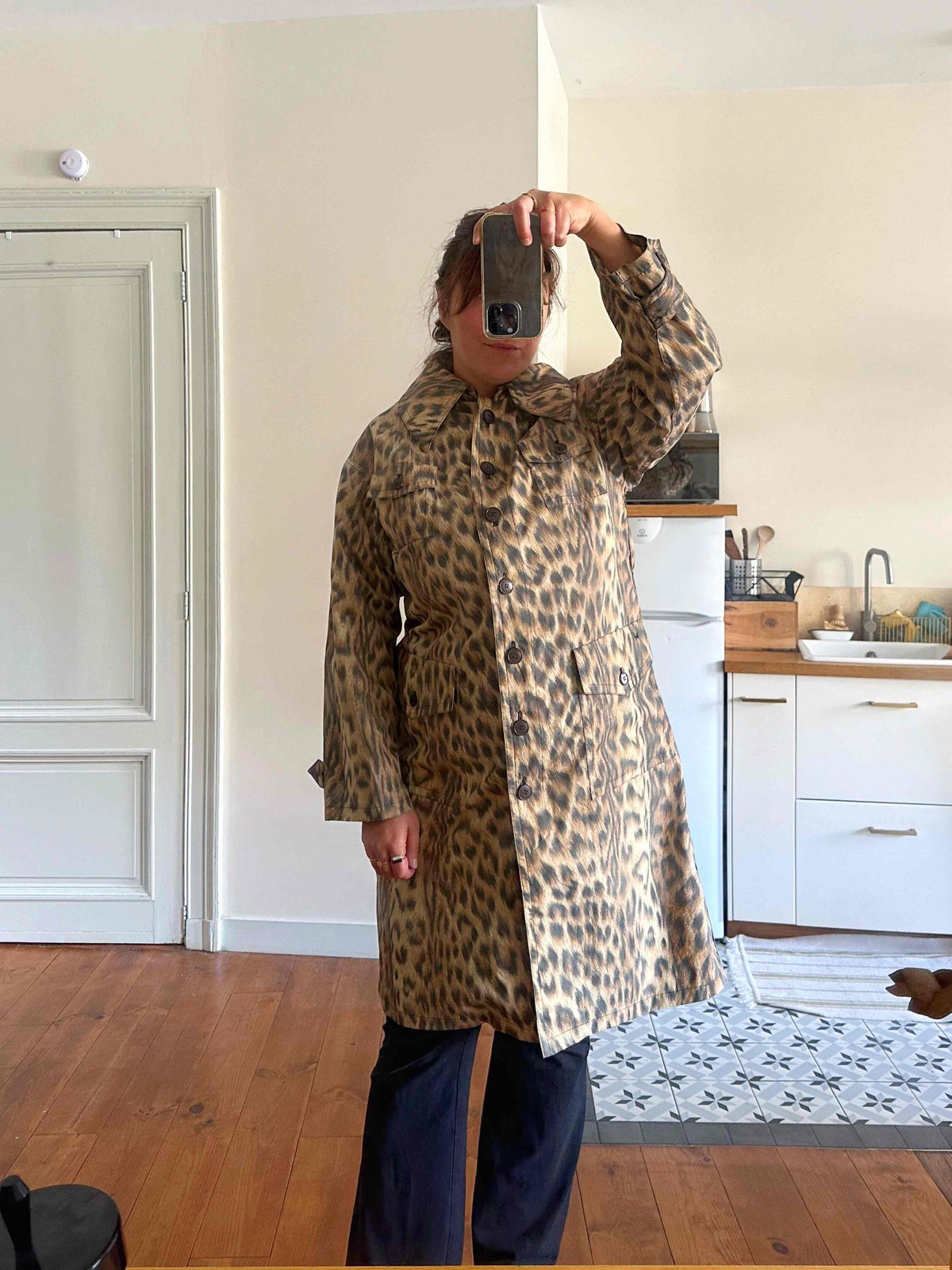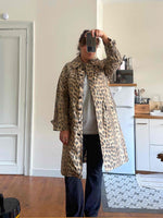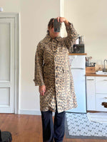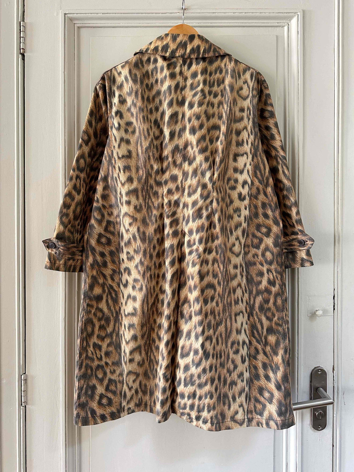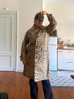 Prix unitaire parTrench leopard, en tergal impression leopard, boutonnage droit, poignets a sangles boutonnées, forme droite légèrement trapèze, fabriqué en France, taille 38 porté ici sur une personne T40 et un mannequin T36.