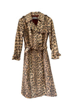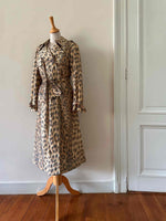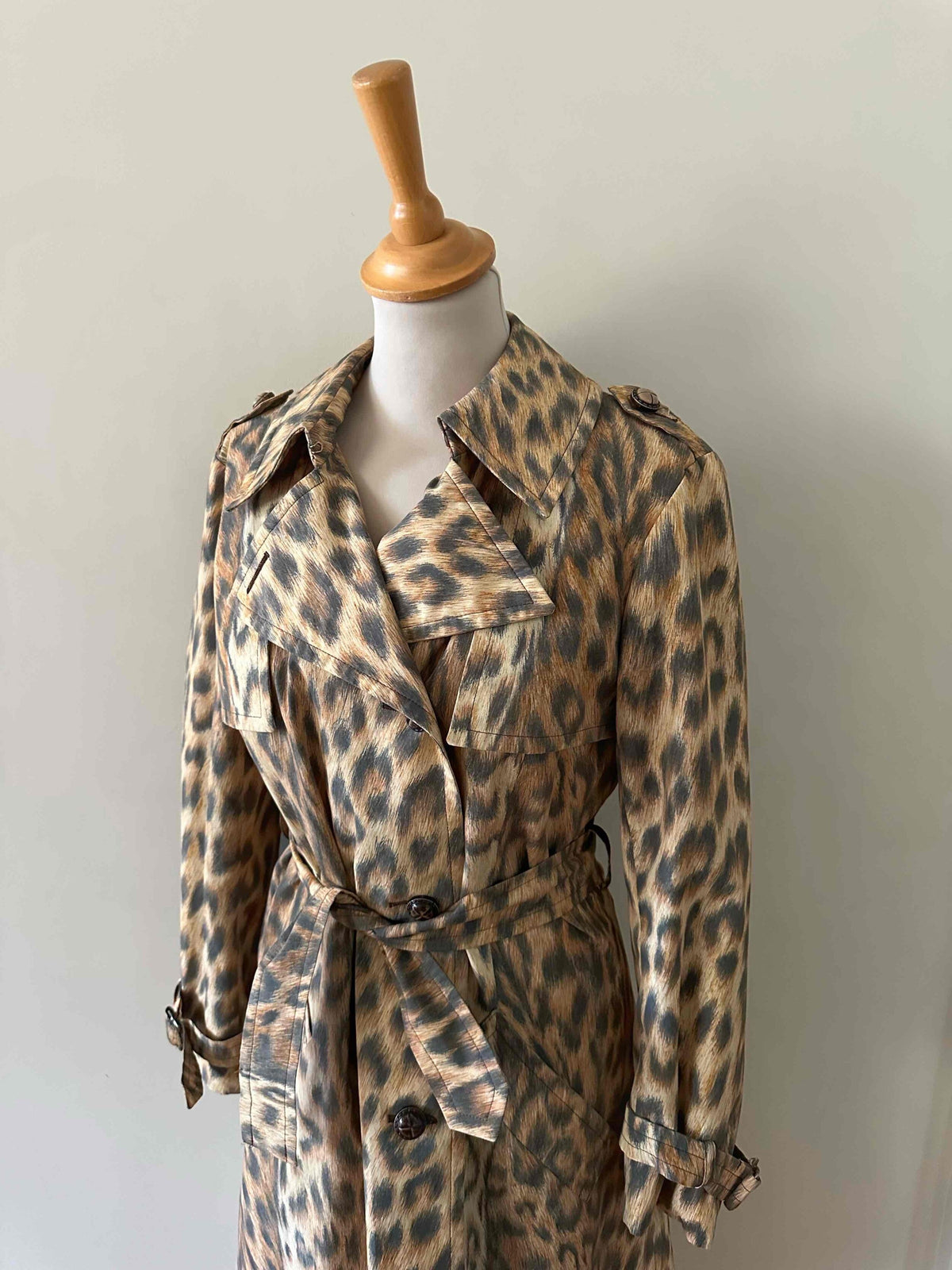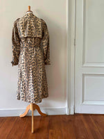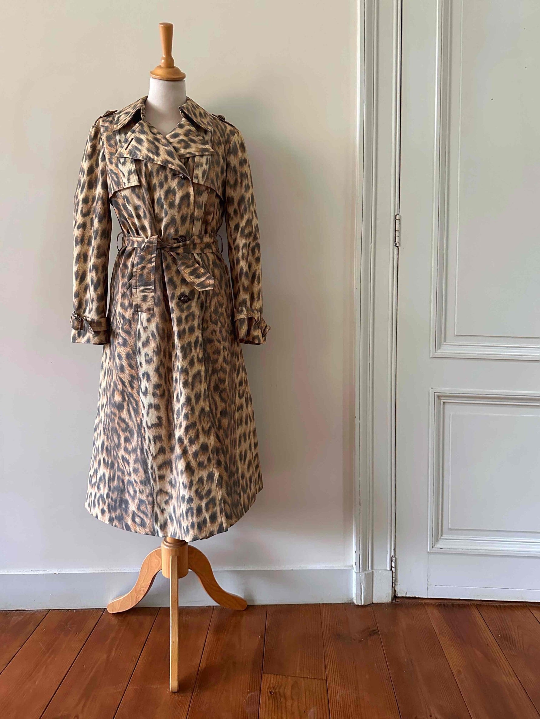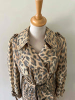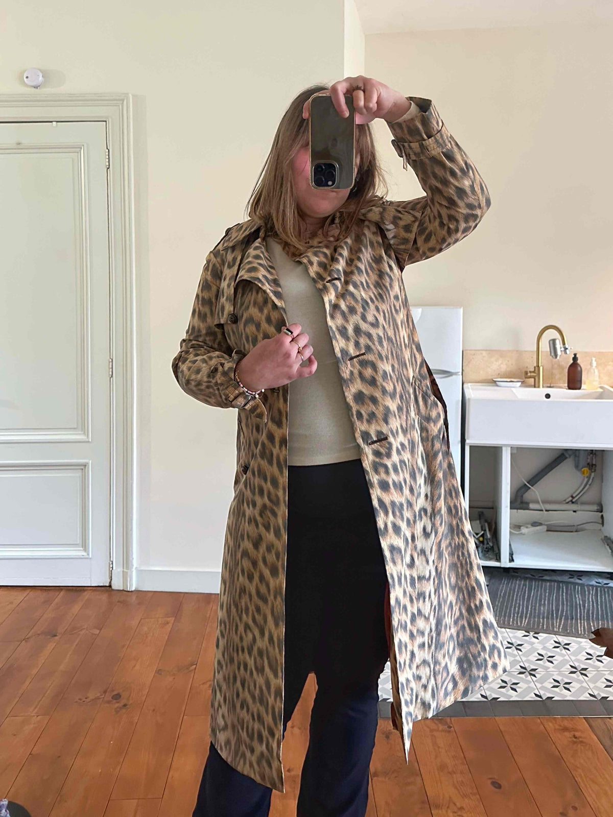 Prix unitaire parTrench léopard, en toile impermeable imprimé léopard beige, camel et noir, boutonnage droit, ceinture à boucle carrée noire, fabriqué en France, convient aux tailles 34 et 36 porté ici sur un mannequin T36 et ouvert sur une personne T40.