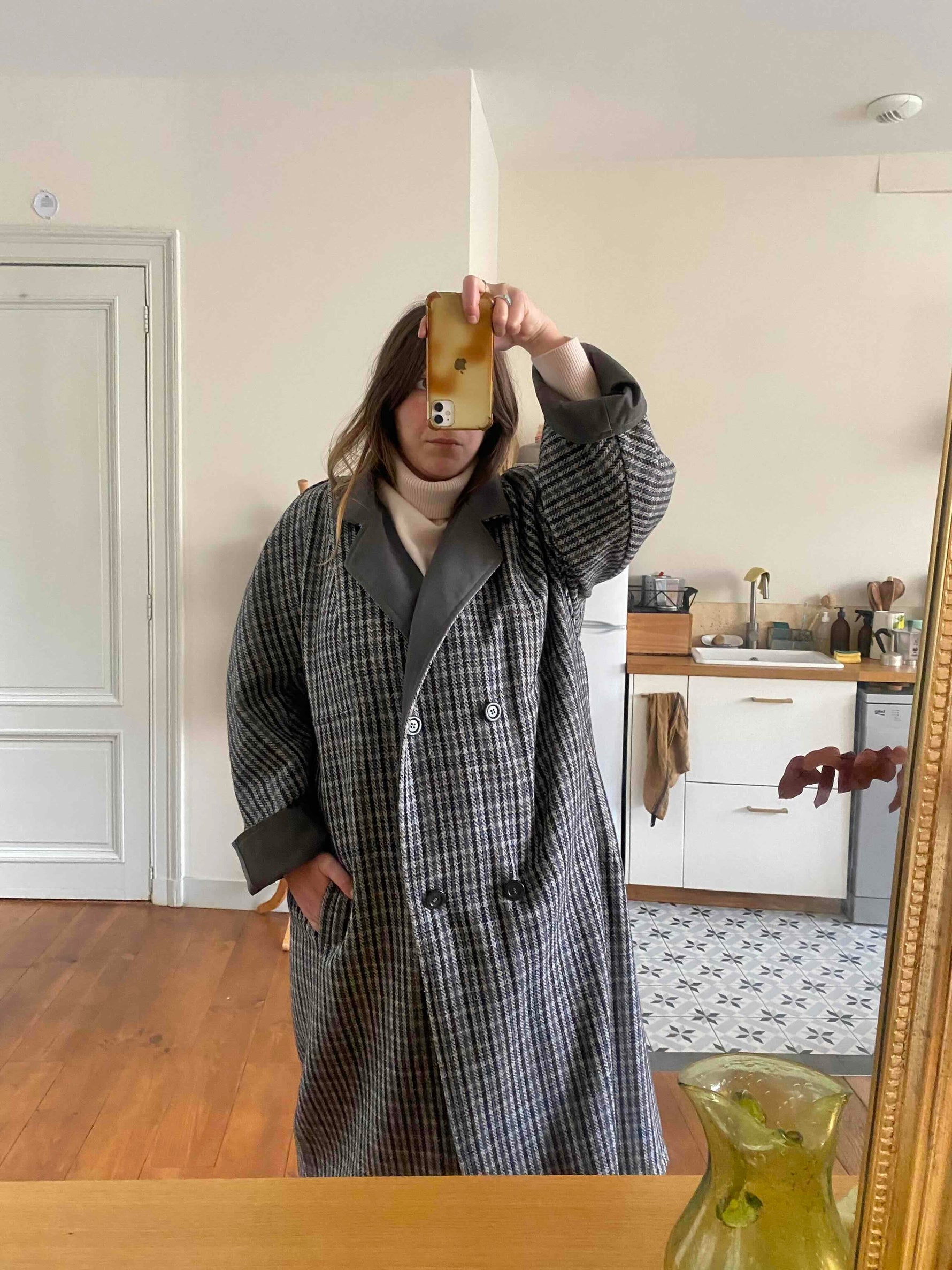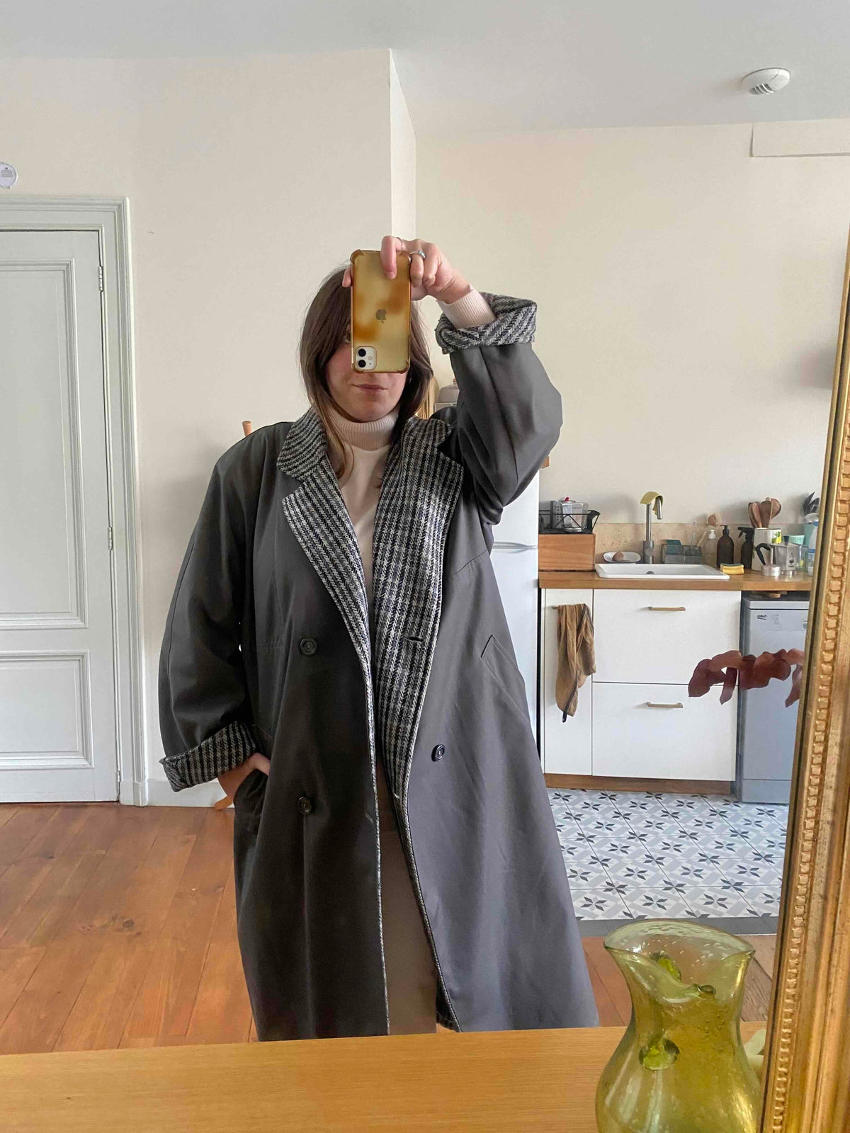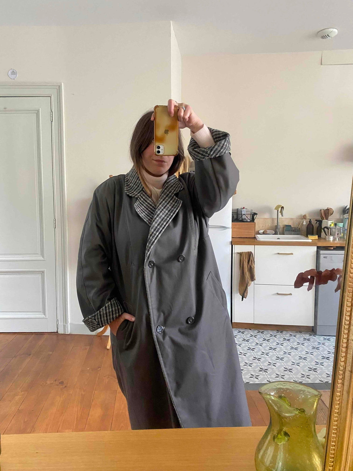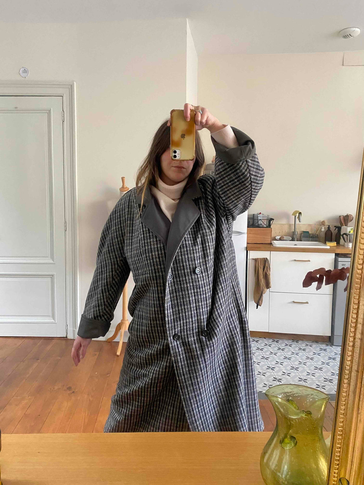 Prix unitaire parTrench réversible, en laine et gabardine anthracite bleuté, côté lainage carreaux, prince-de-galles blancs, gris et caramel, boutonnage croisé des deux côtés, forme enveloppante, taille 40 et 42 porté ici sur une personne taille 40.