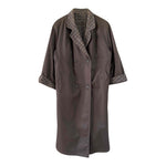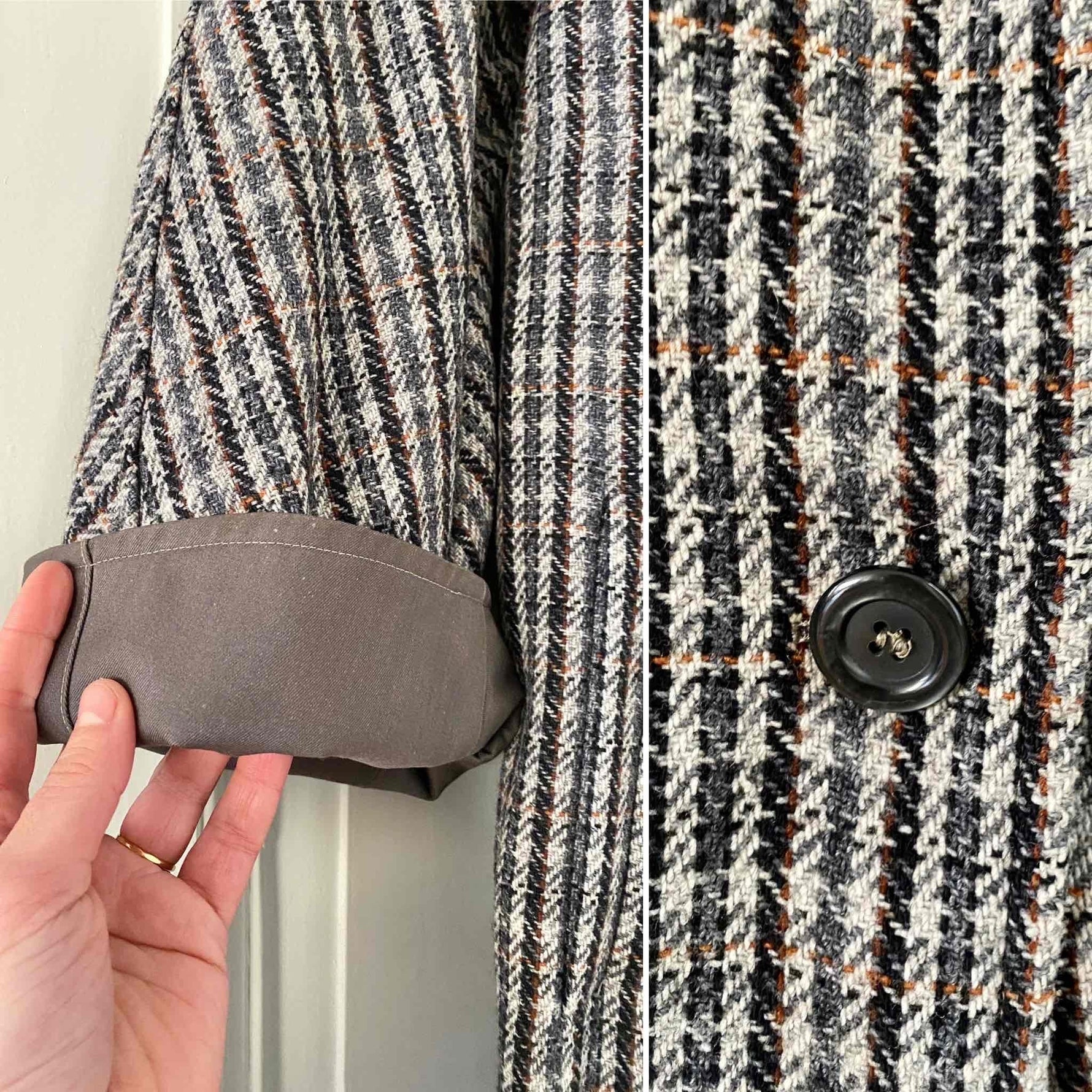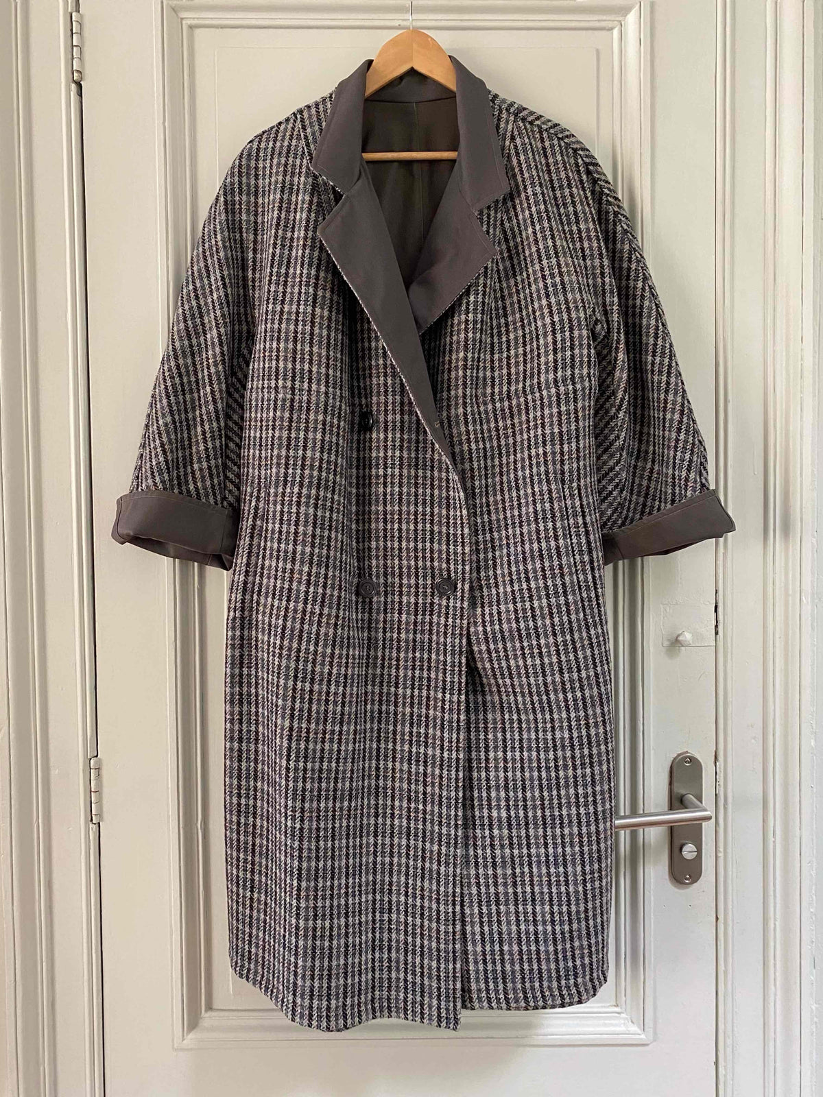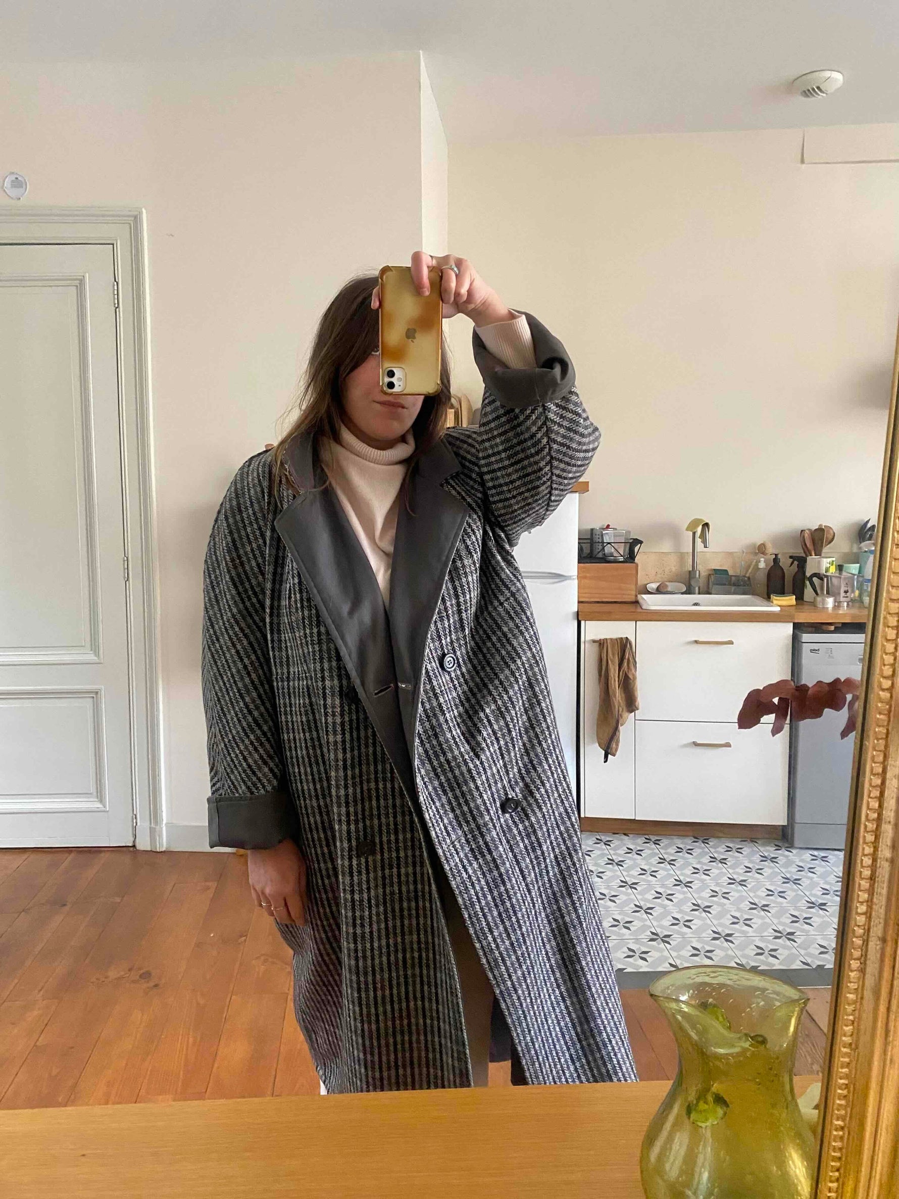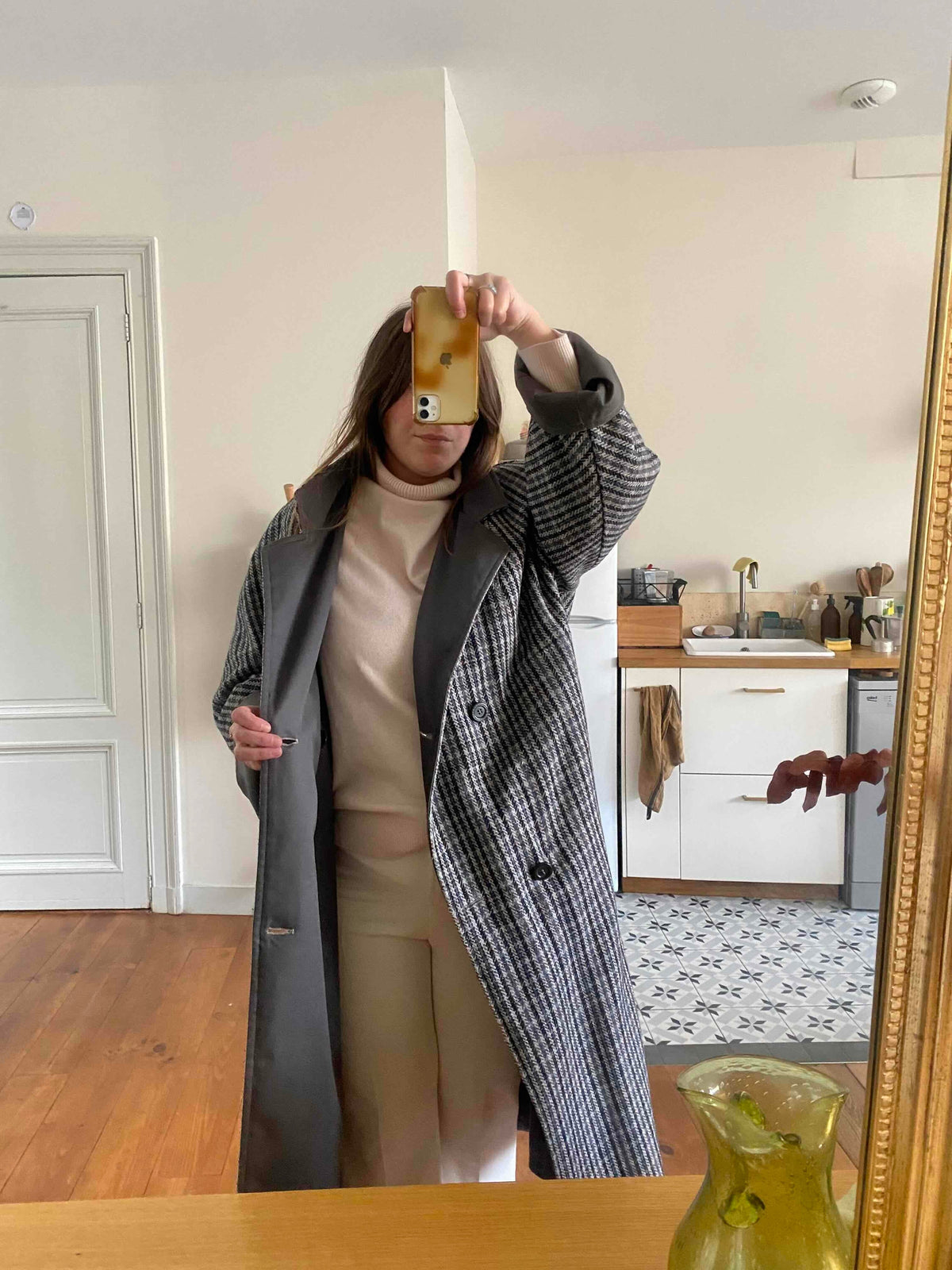 Prix unitaire parTrench réversible, en laine et gabardine anthracite bleuté, côté lainage carreaux, prince-de-galles blancs, gris et caramel, boutonnage croisé des deux côtés, forme enveloppante, taille 40 et 42 porté ici sur une personne taille 40.