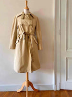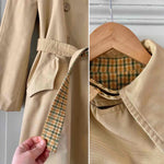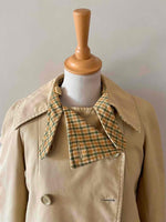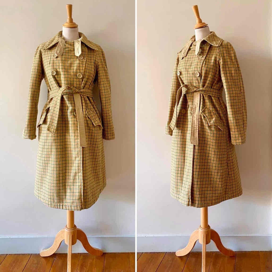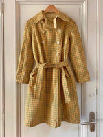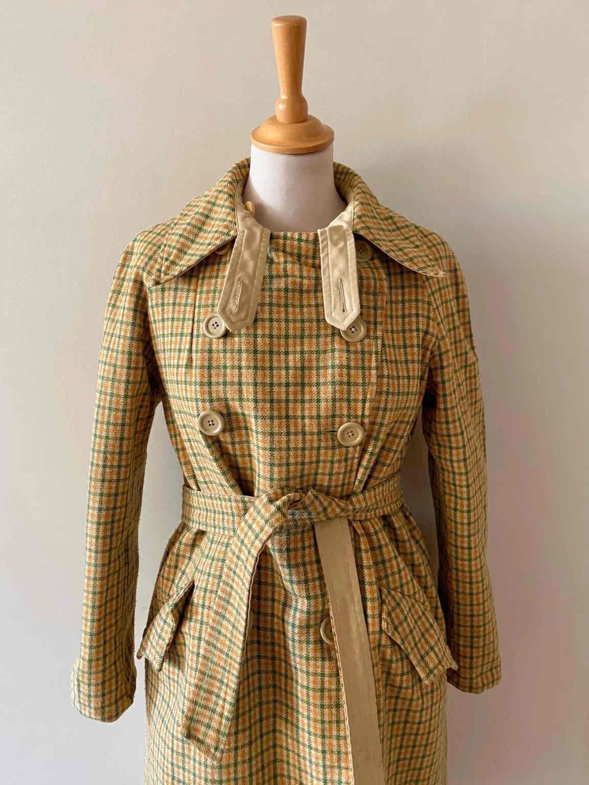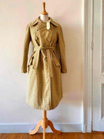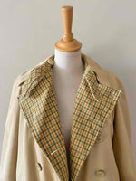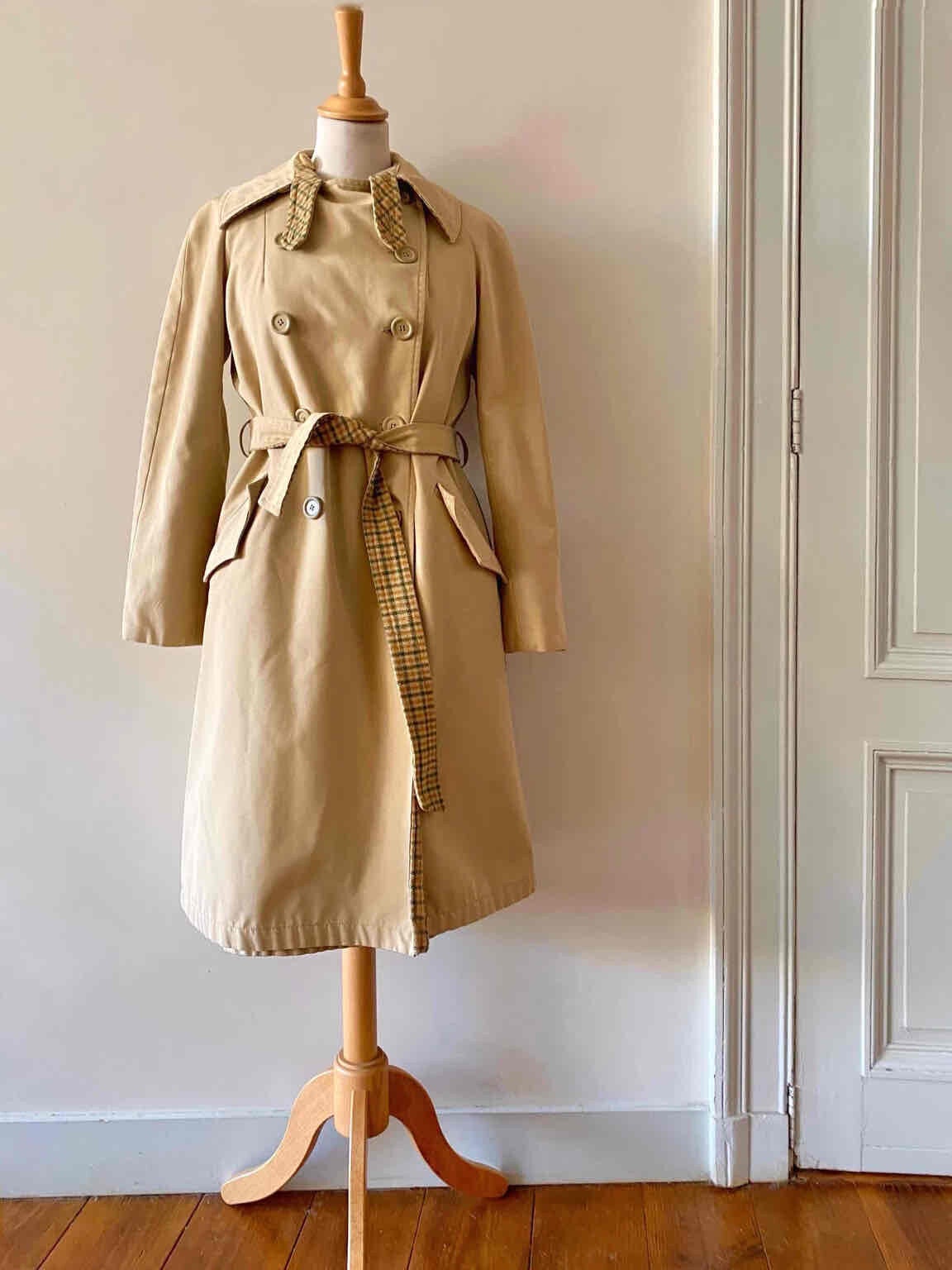 Prix unitaire parTrench reversible en gabardine de coton beige camel, double-face en laine à carreaux prince de galle verts prairie et jaune ocre, ceinture réversible à nouer taille , double boutonnage croisé, boutons en bois des deux côtés, années 70, taille 36 porté ici sur un mannequin T36.