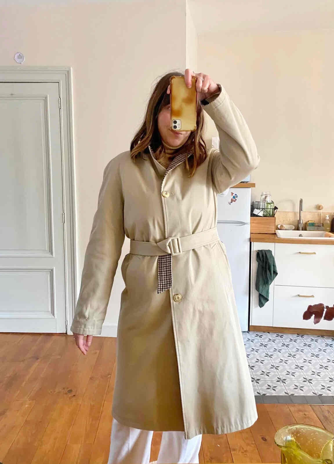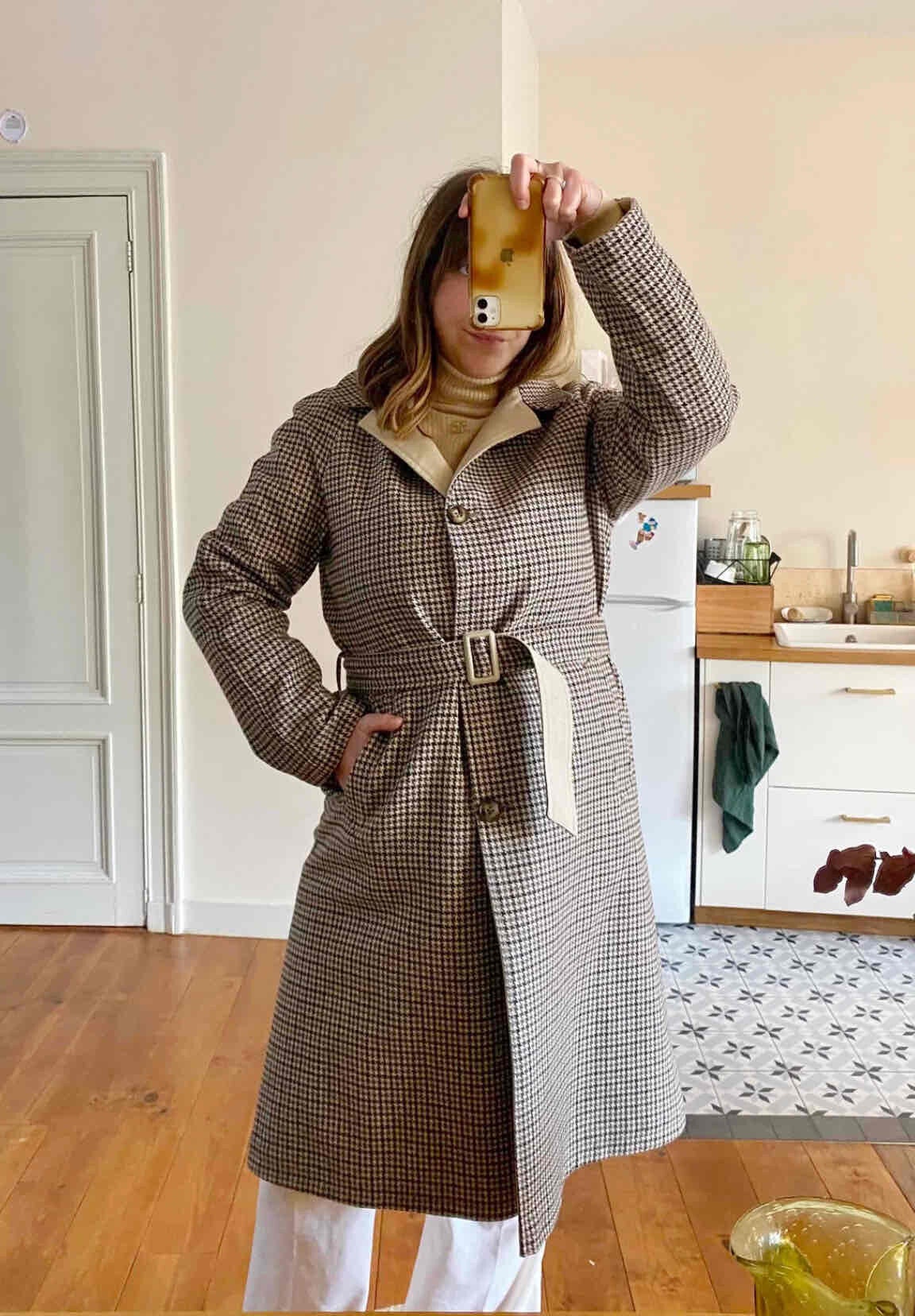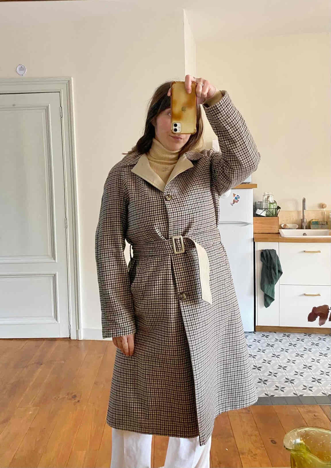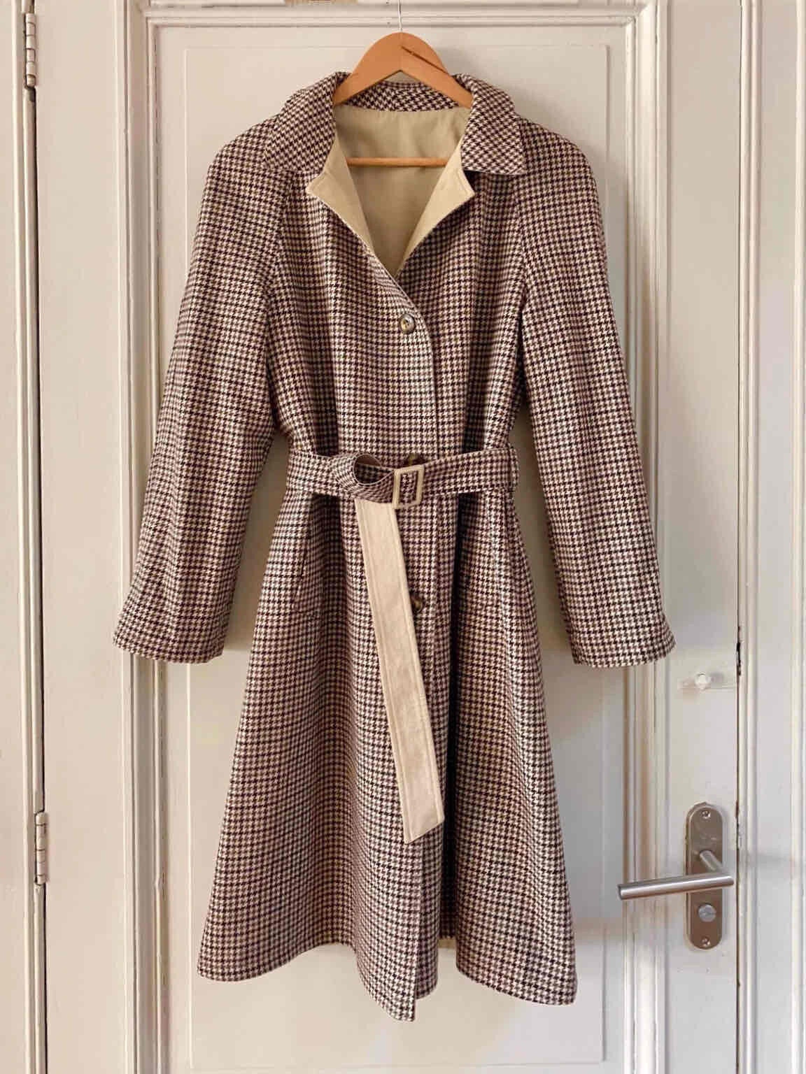 Prix unitaire parTrench reversible en gabardine de coton beige clair, double-face en laine à carreaux pied de puce bruns, écrus et gris, ceinture réversible à boucle carrée beige, boutons des deux côtés, fabriqué en Italie, tailles 38 porté ici serré sur une personne T40