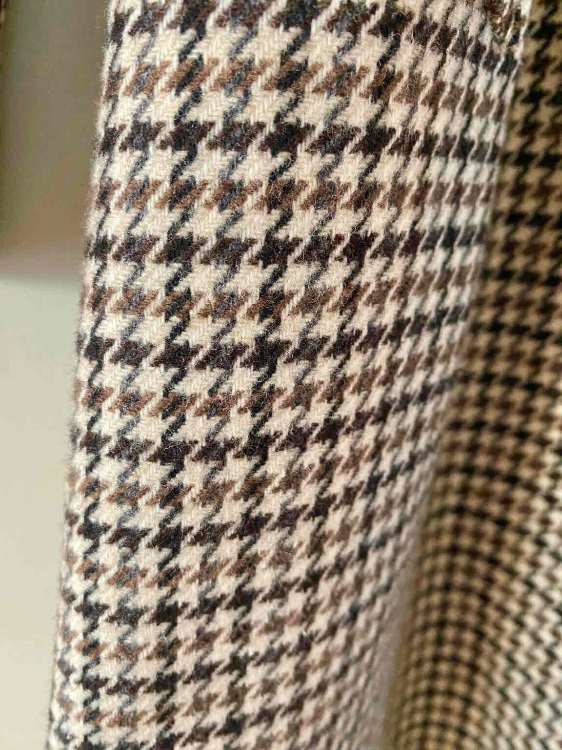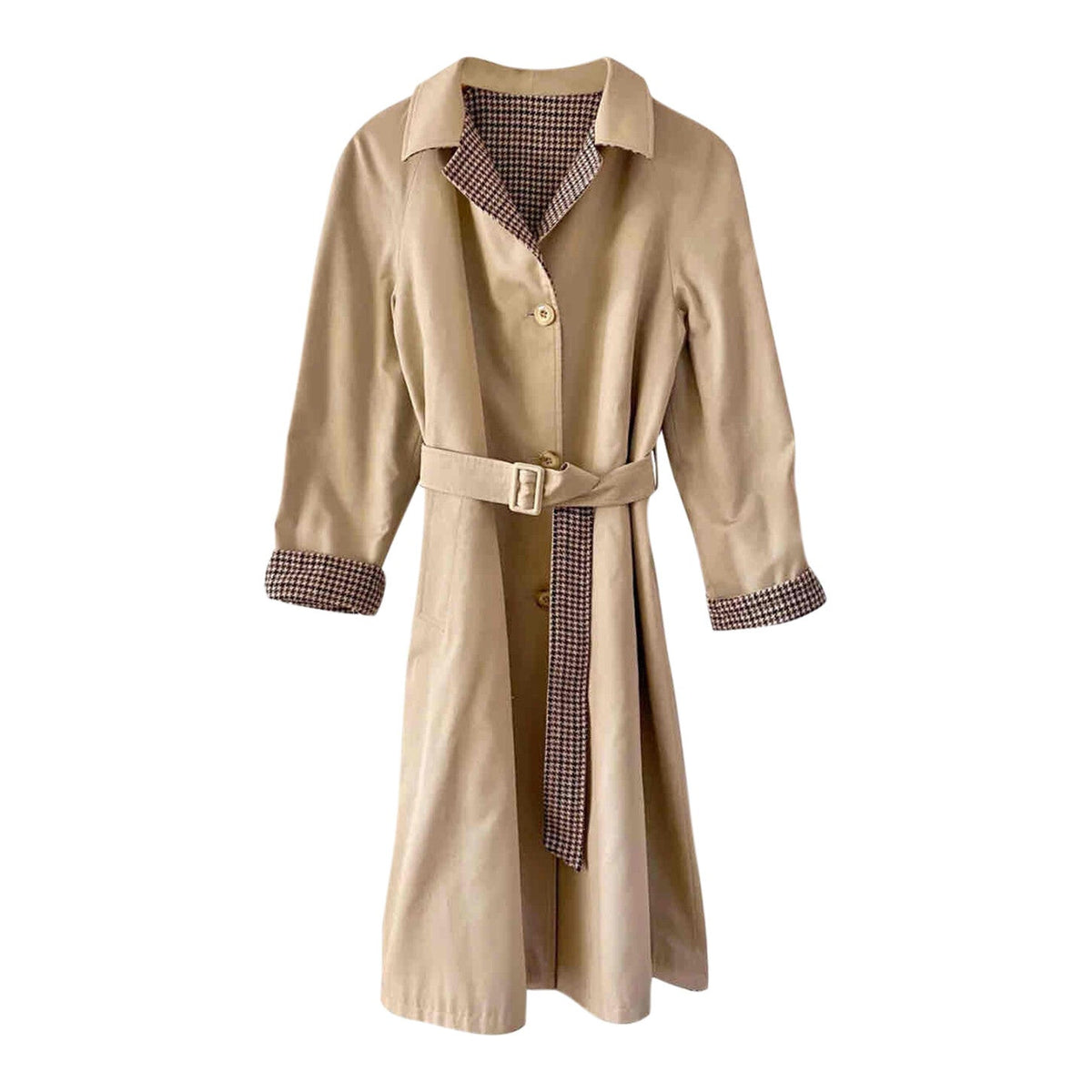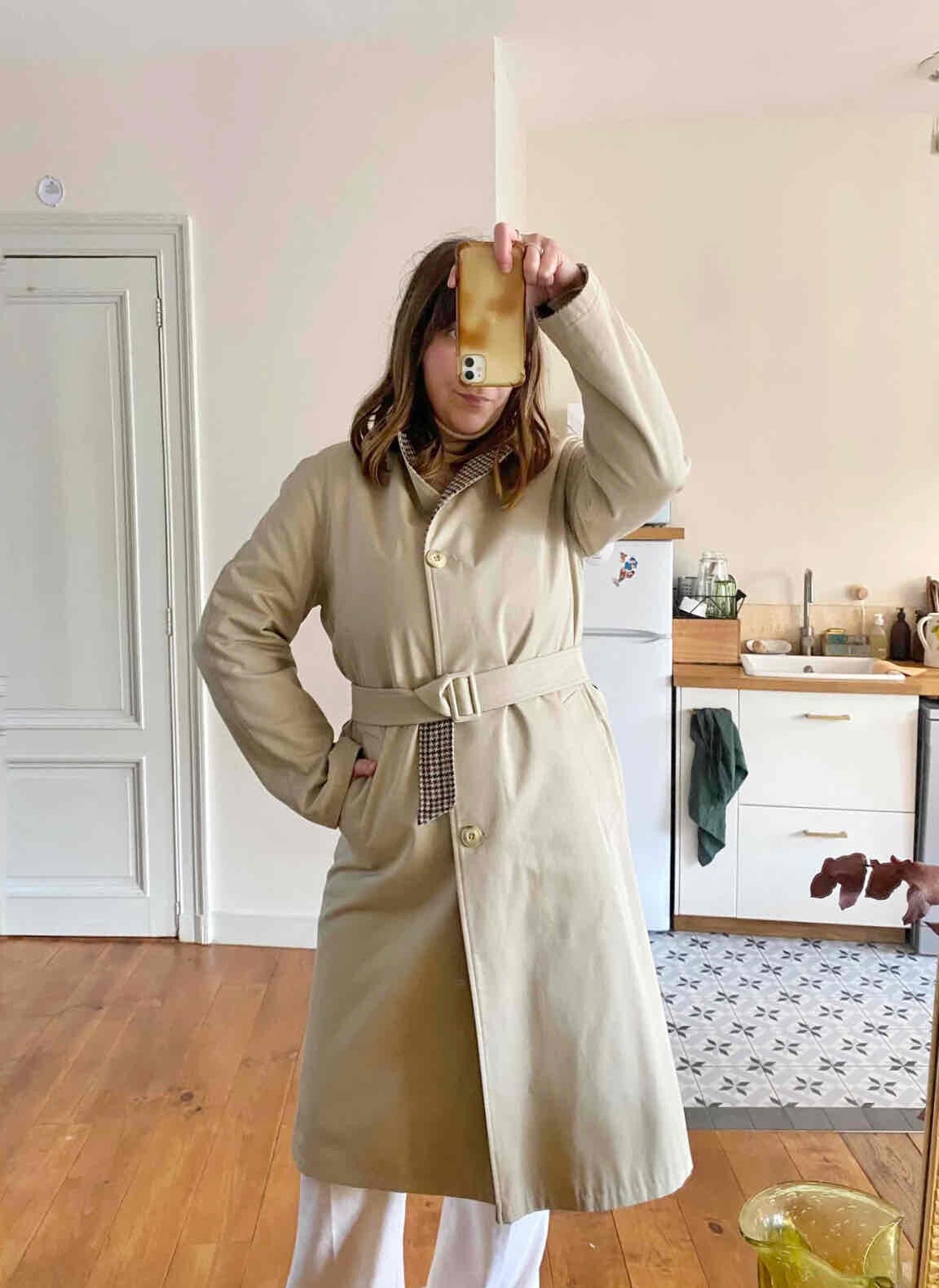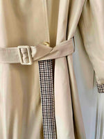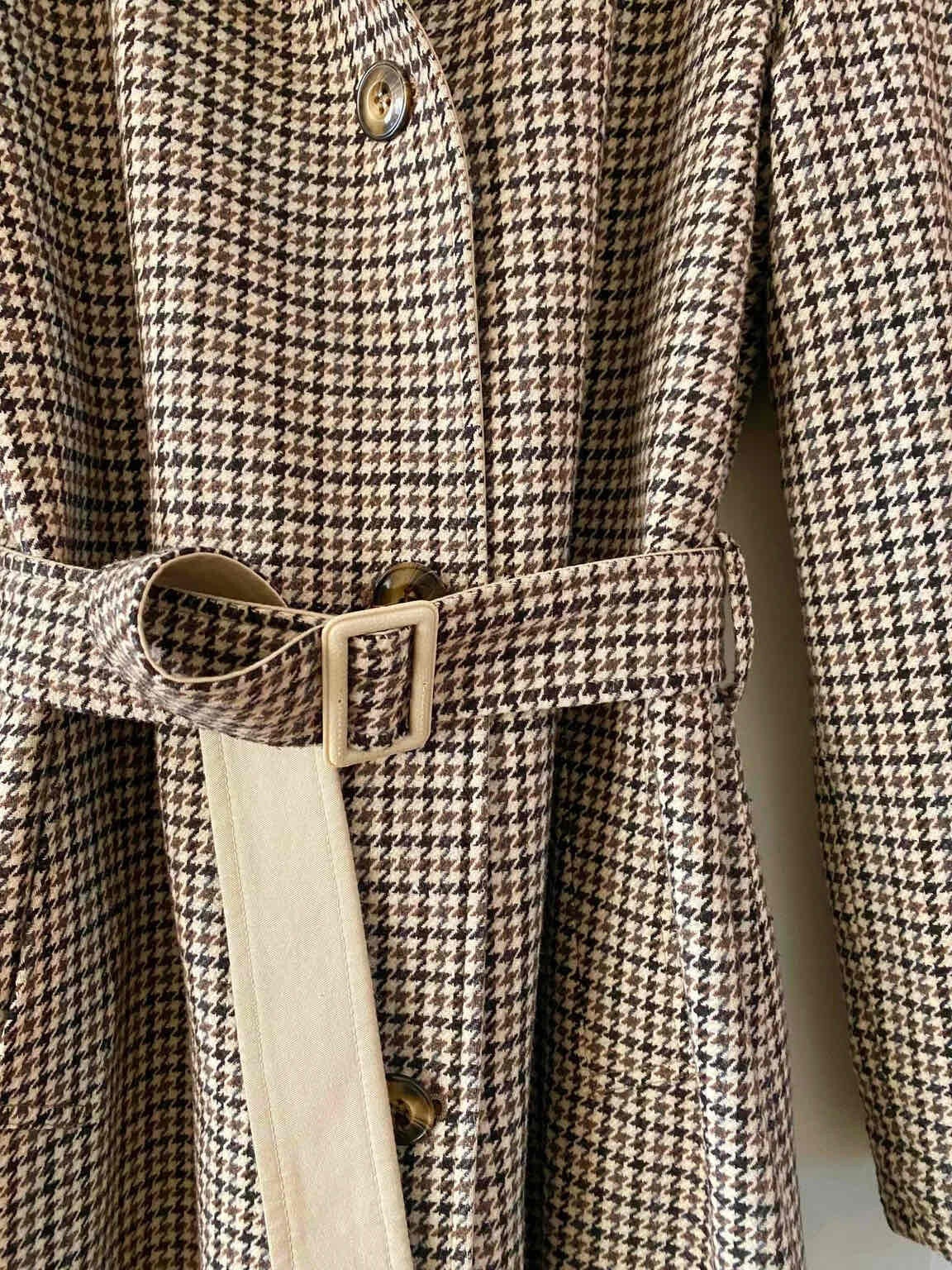Prix unitaire parTrench reversible en gabardine de coton beige clair, double-face en laine à carreaux pied de puce bruns, écrus et gris, ceinture réversible à boucle carrée beige, boutons des deux côtés, fabriqué en Italie, tailles 38 porté ici serré sur une personne T40