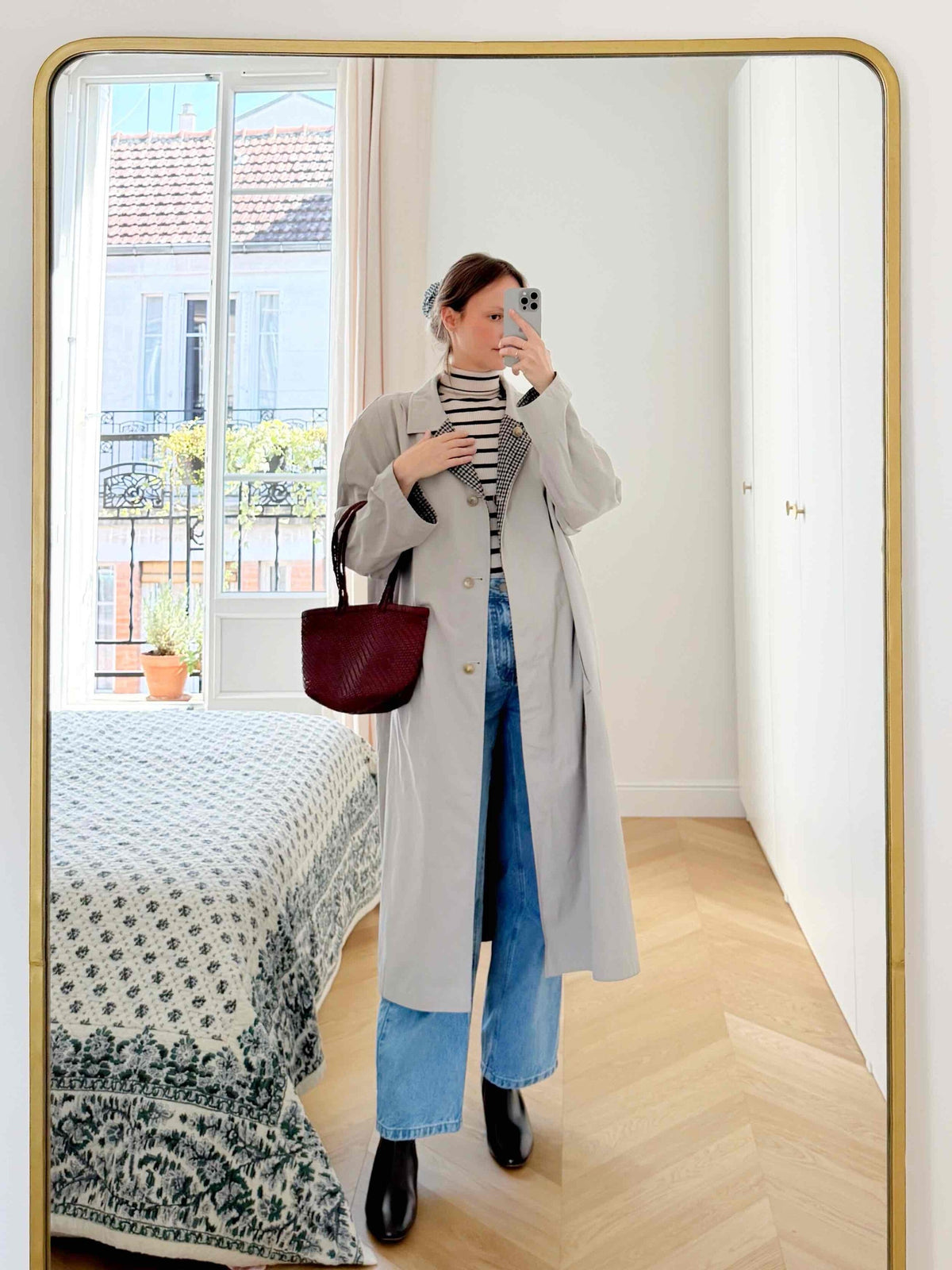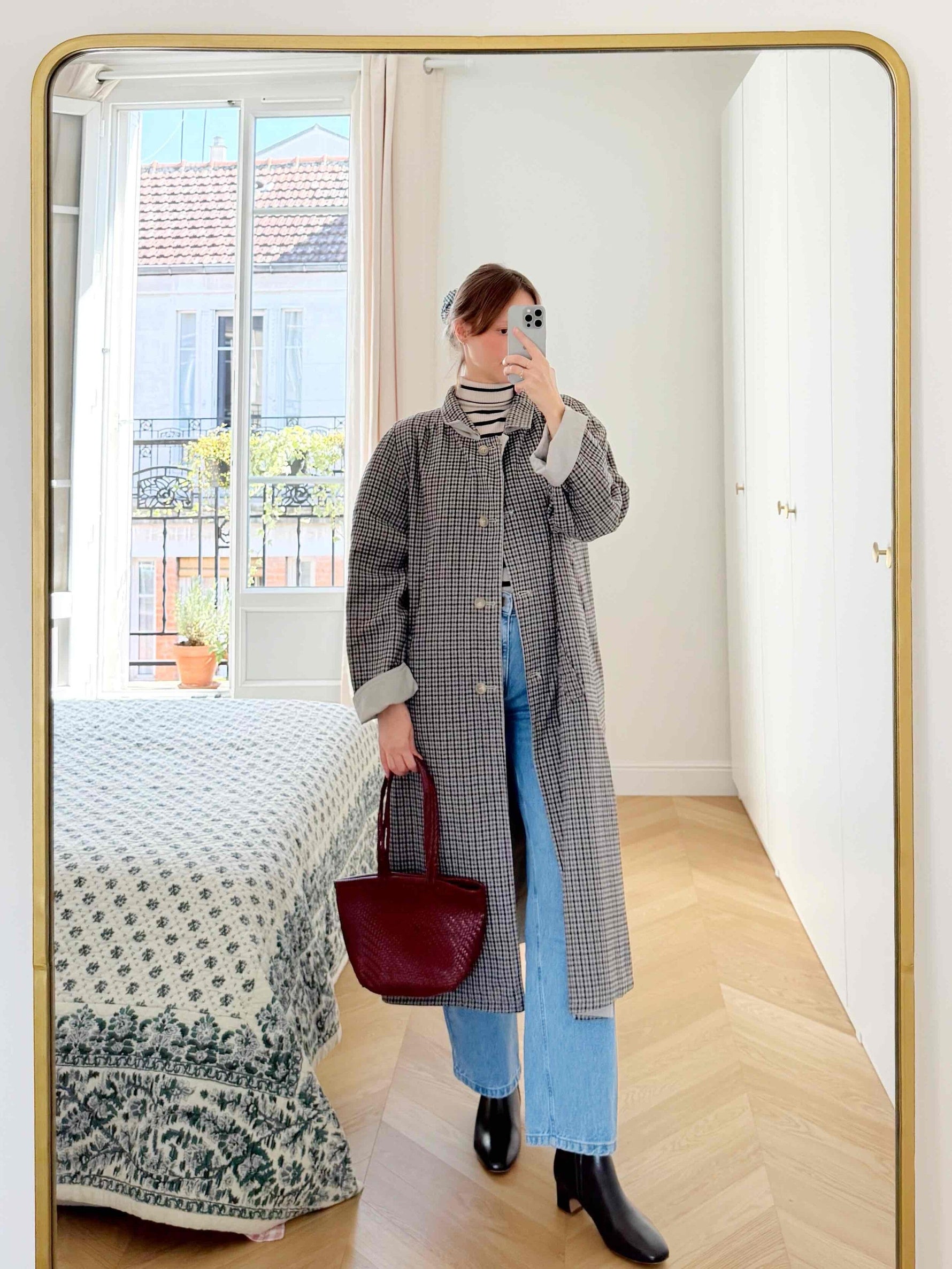Prix unitaire parTrench reversible, un côté en laine à carreaux, un côté trench, boutons et poches des deux côtés, porté ici de façon oversize sur une T36 pour 1m64