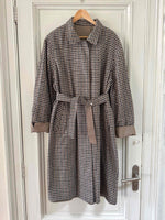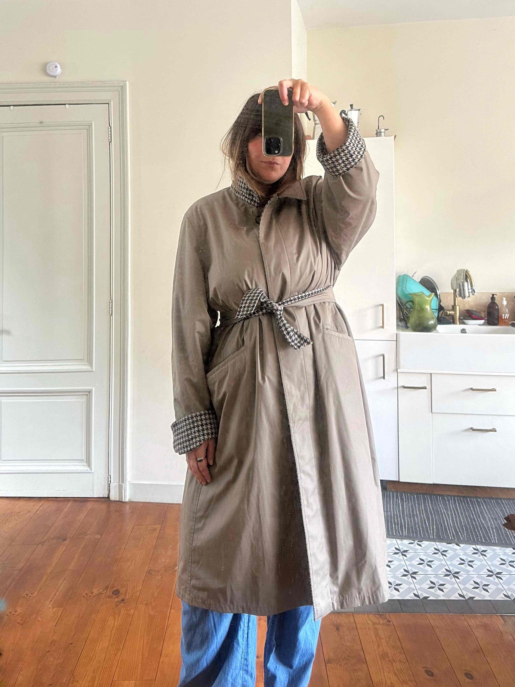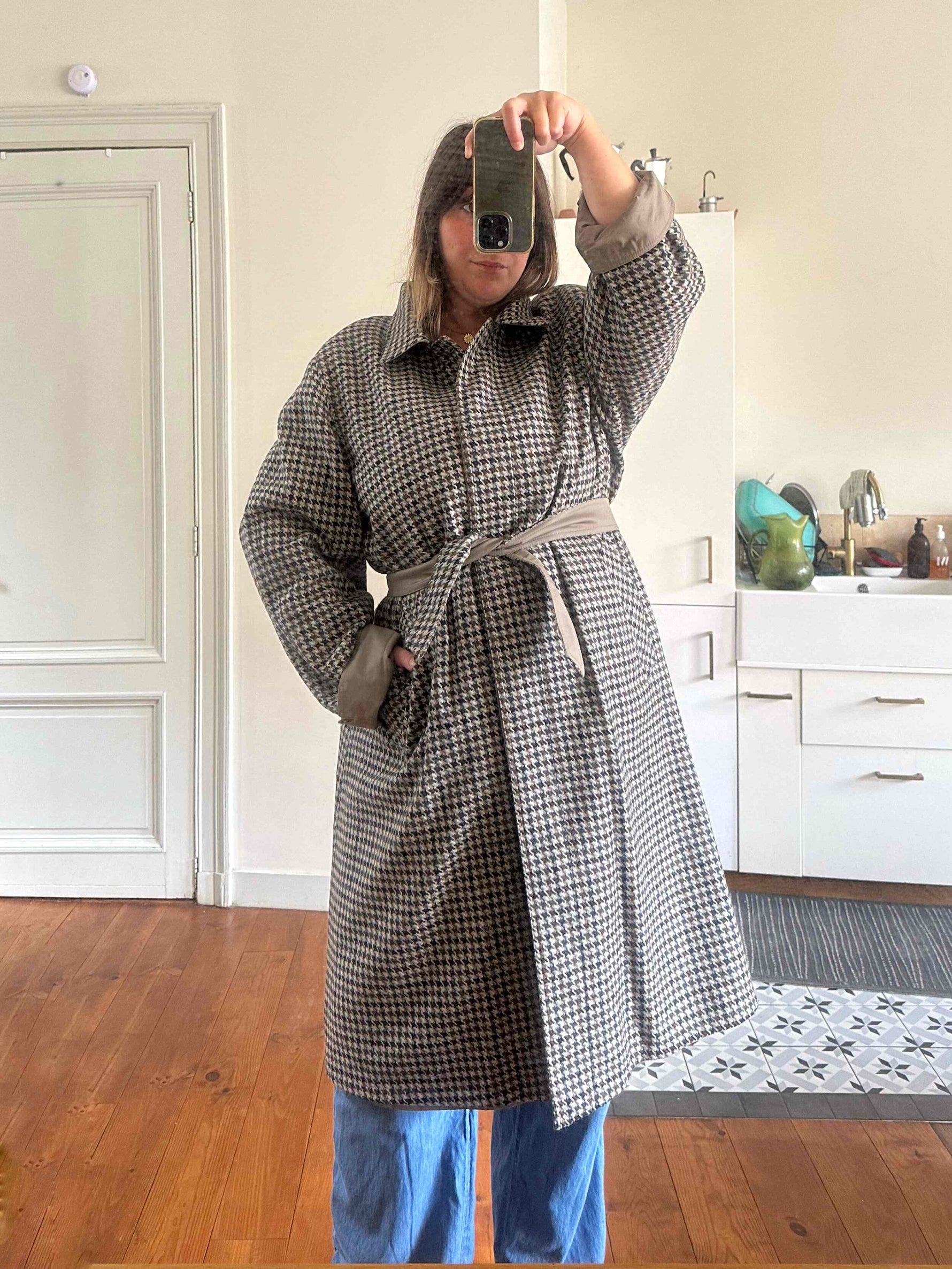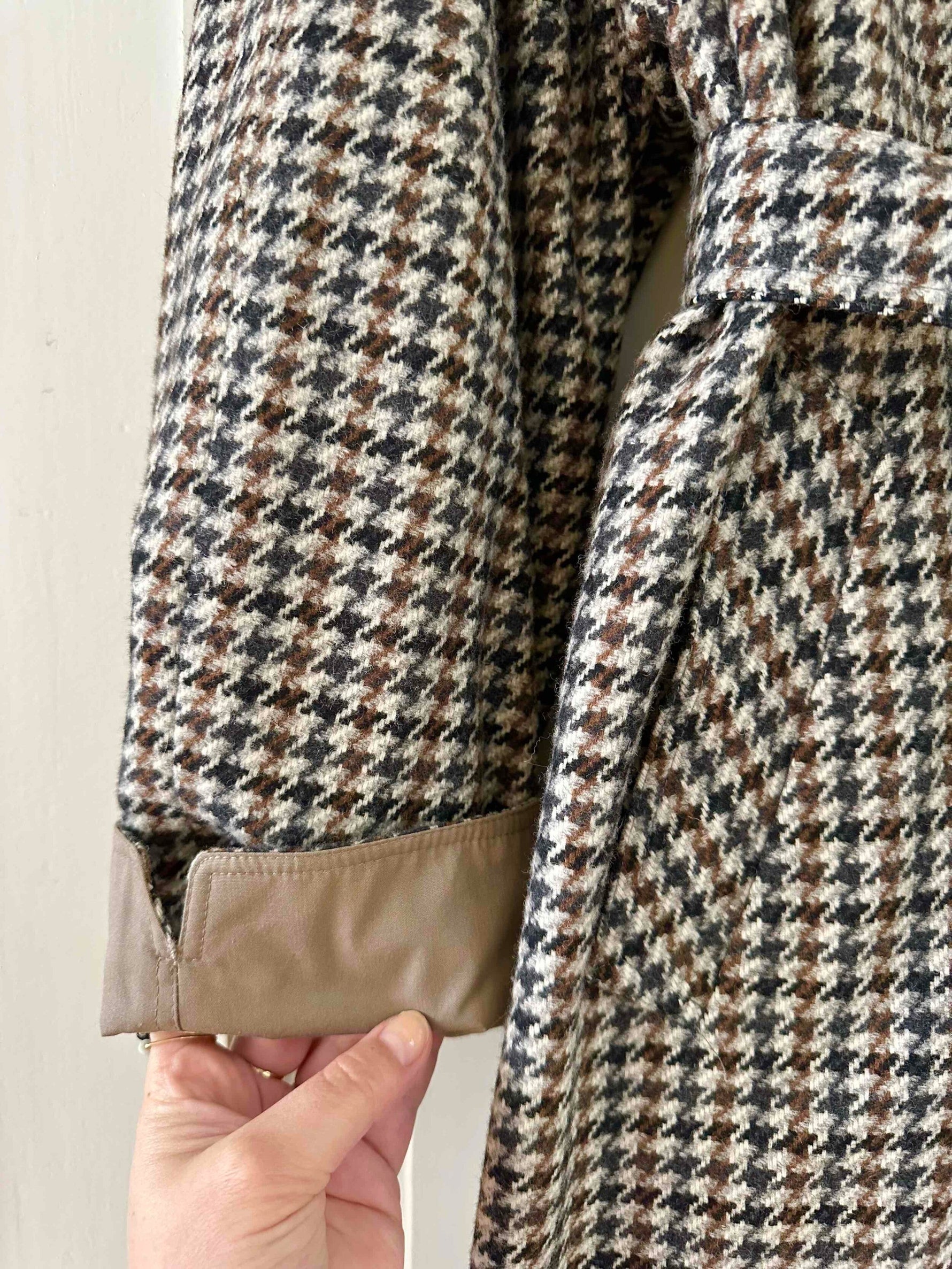 Prix unitaire parTrench réversible en laine, gabardine beige foncé réversible en laine à carreaux pied de puce couleurs caramel, anthracites et blancs.