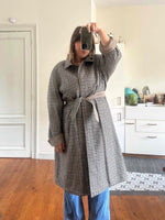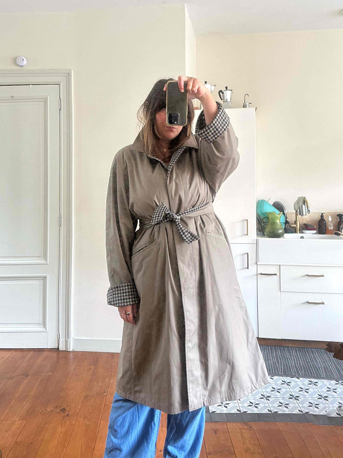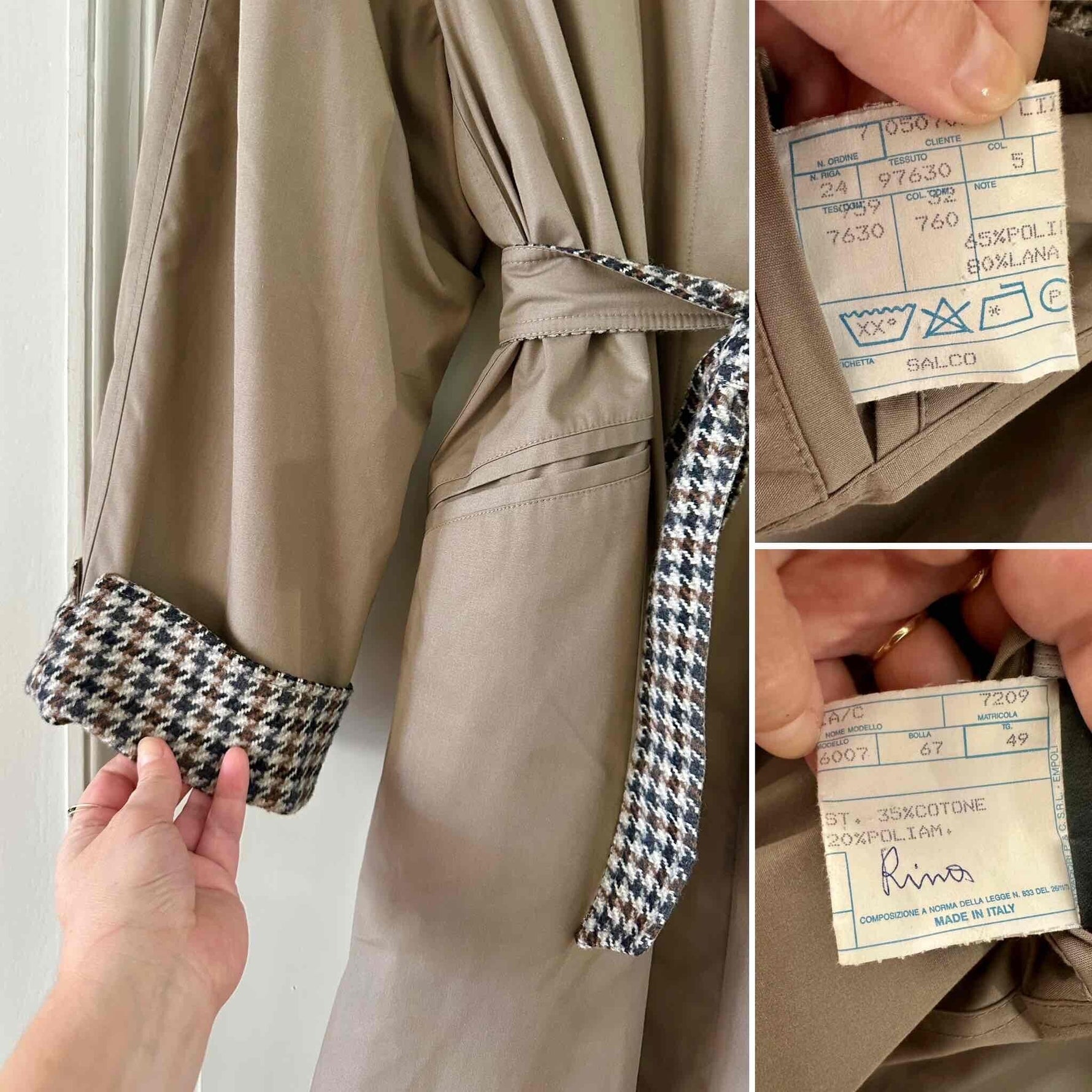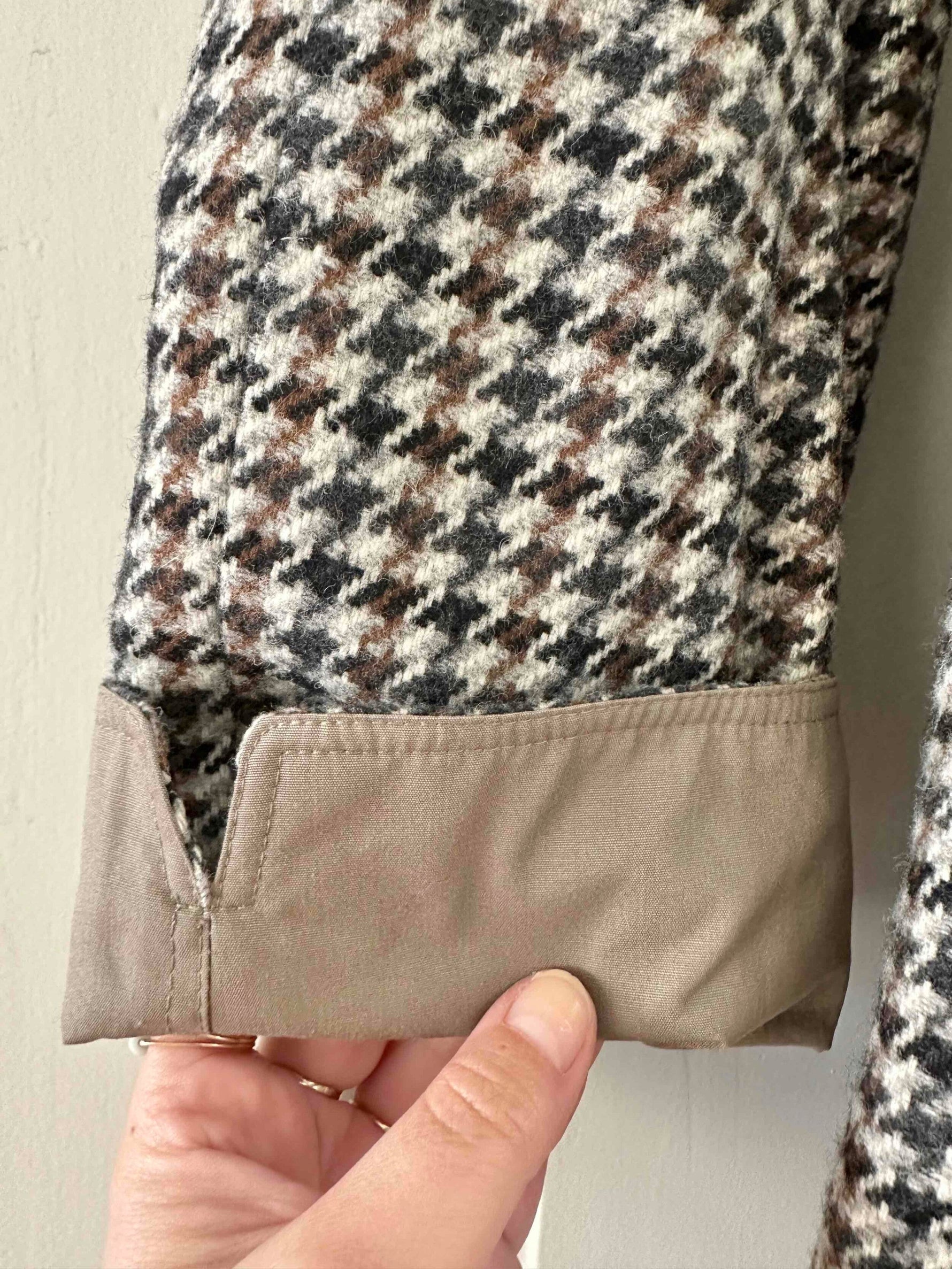 Prix unitaire parTrench réversible en laine, gabardine beige foncé réversible en laine à carreaux pied de puce couleurs caramel, anthracites et blancs.