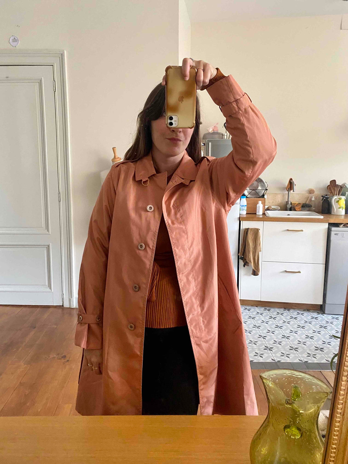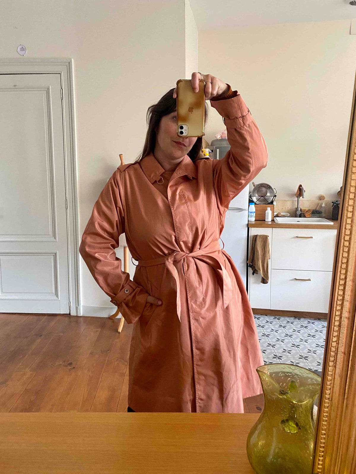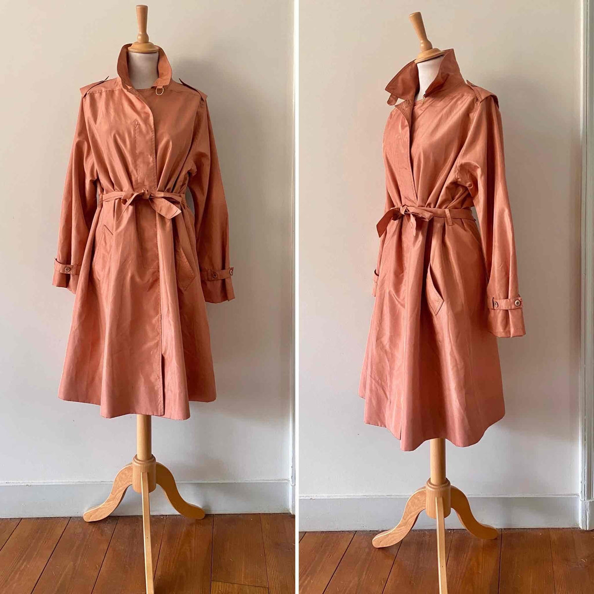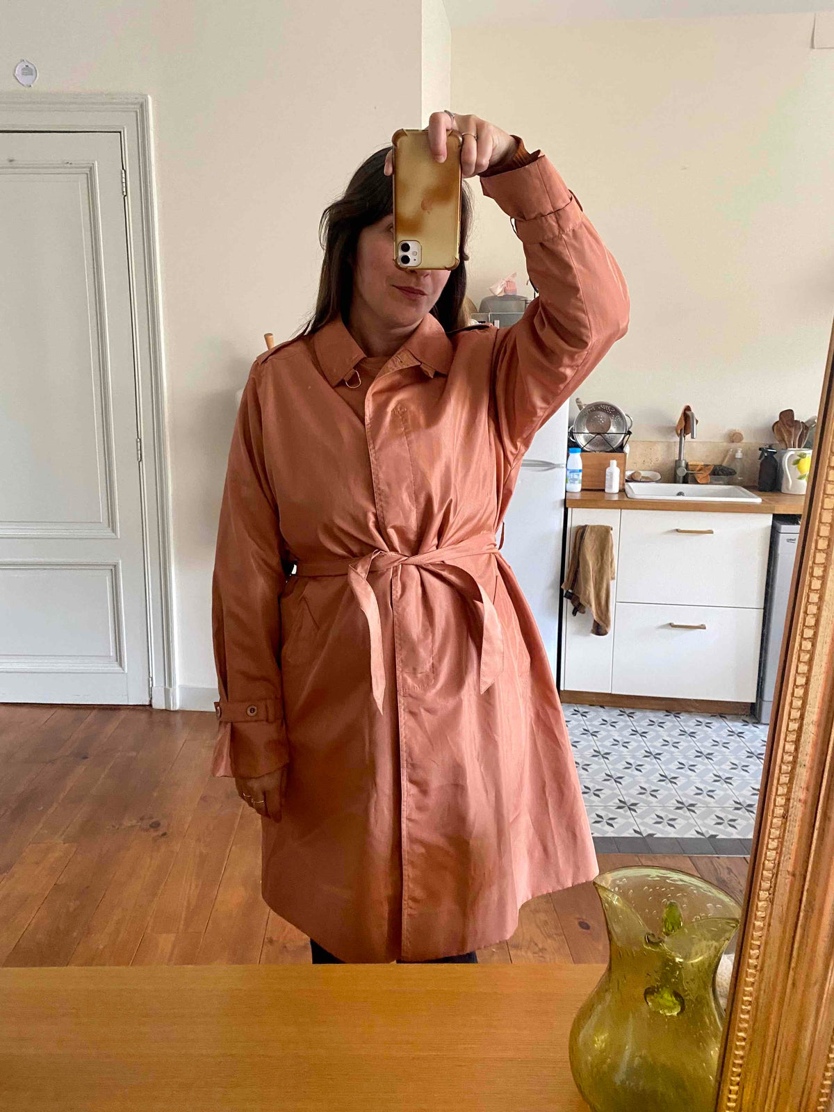 Prix unitaire parTrench rose ceinturé, en polyester rose poudré, manches à boutonner, fabriqué en France, taille 38 porté ici sur un mannequin T36 et une personne T40.