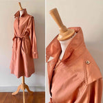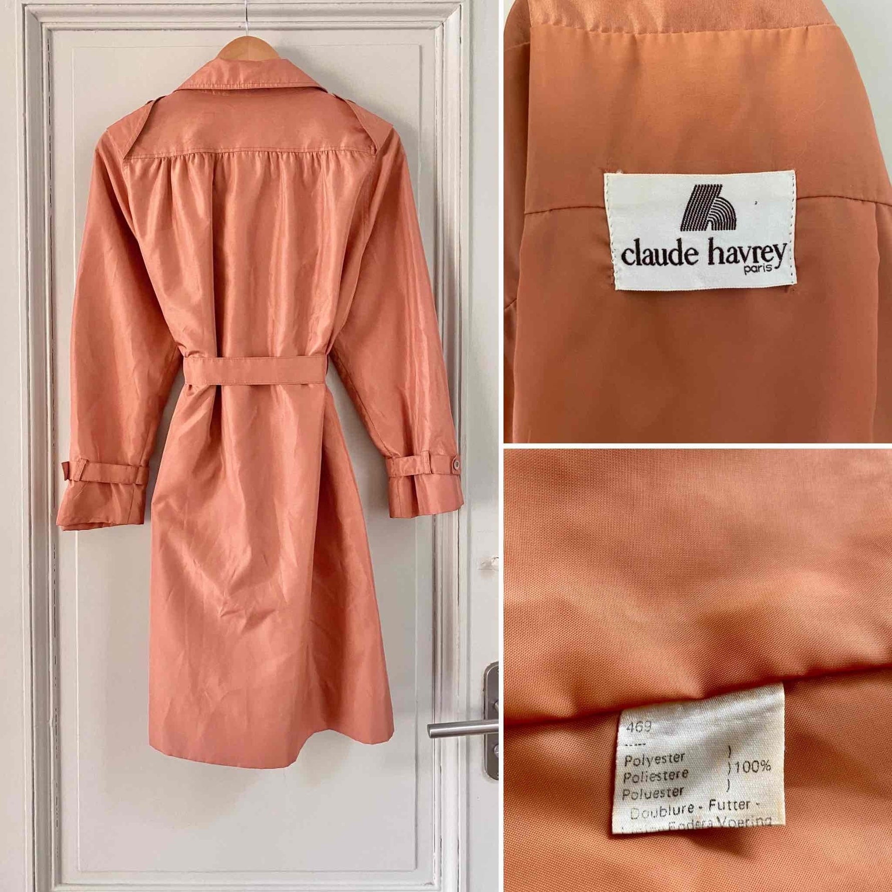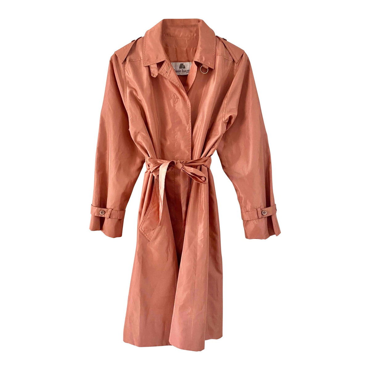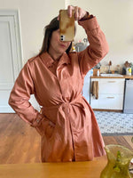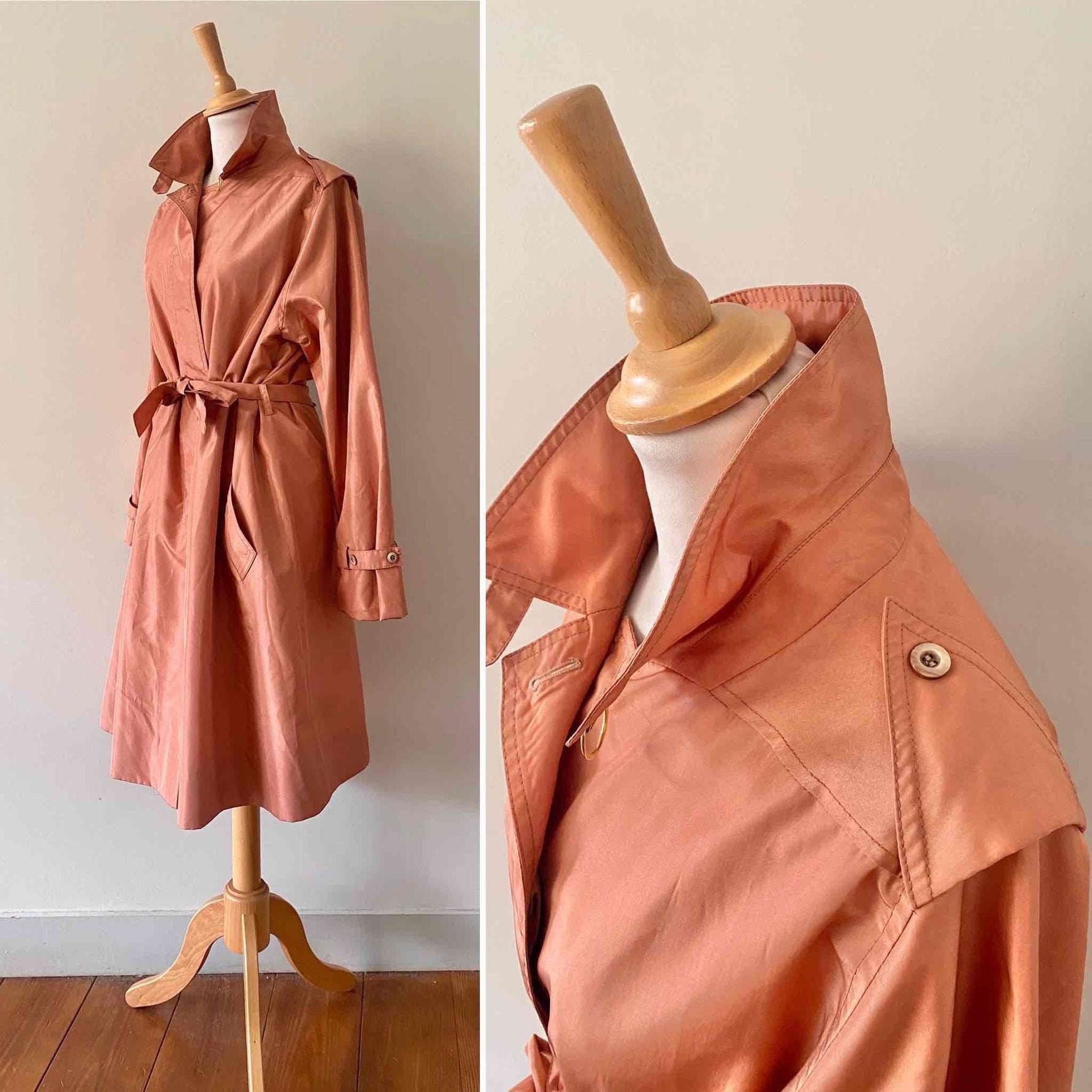 Prix unitaire parTrench rose ceinturé, en polyester rose poudré, manches à boutonner, fabriqué en France, taille 38 porté ici sur un mannequin T36 et une personne T40.