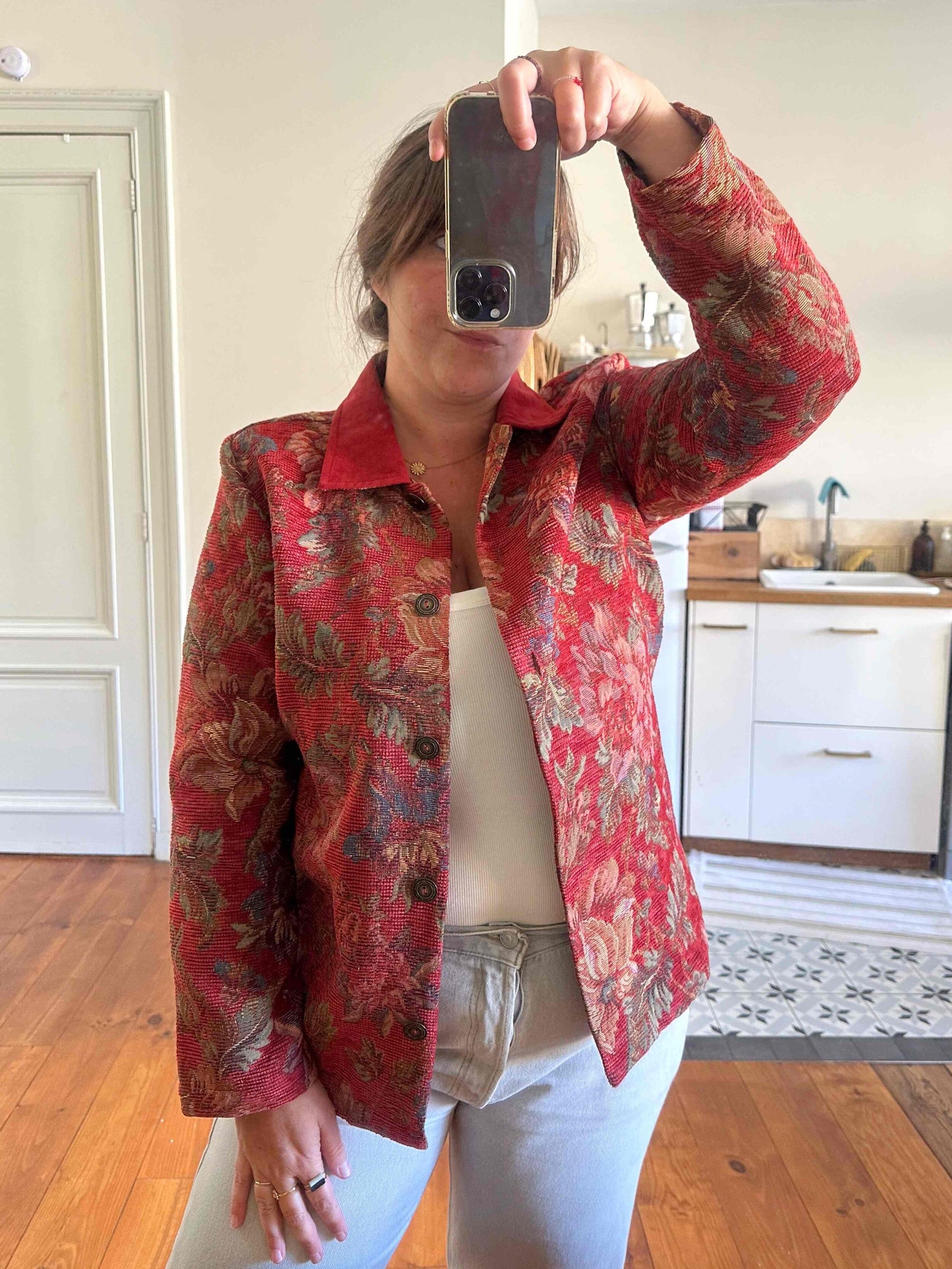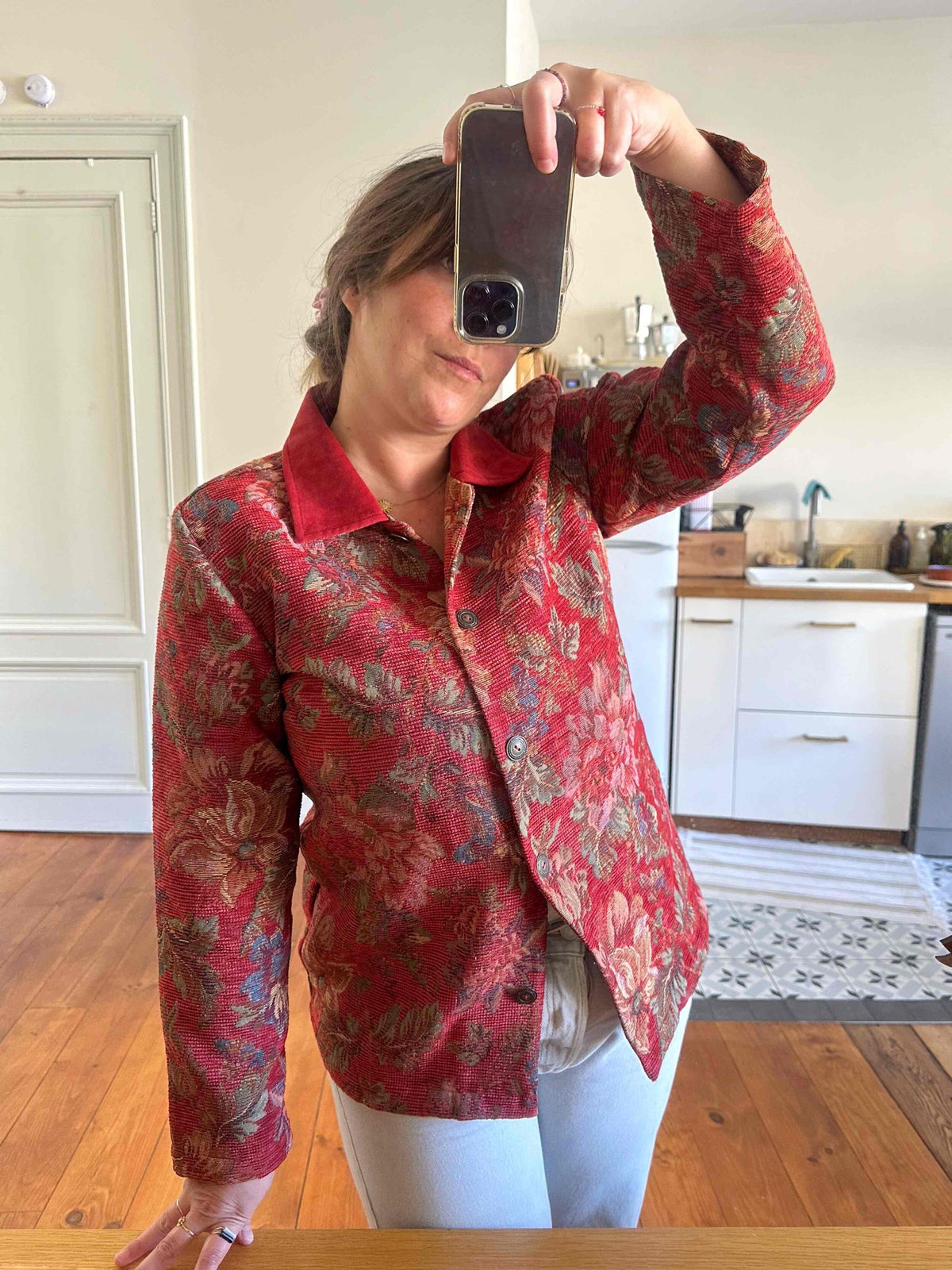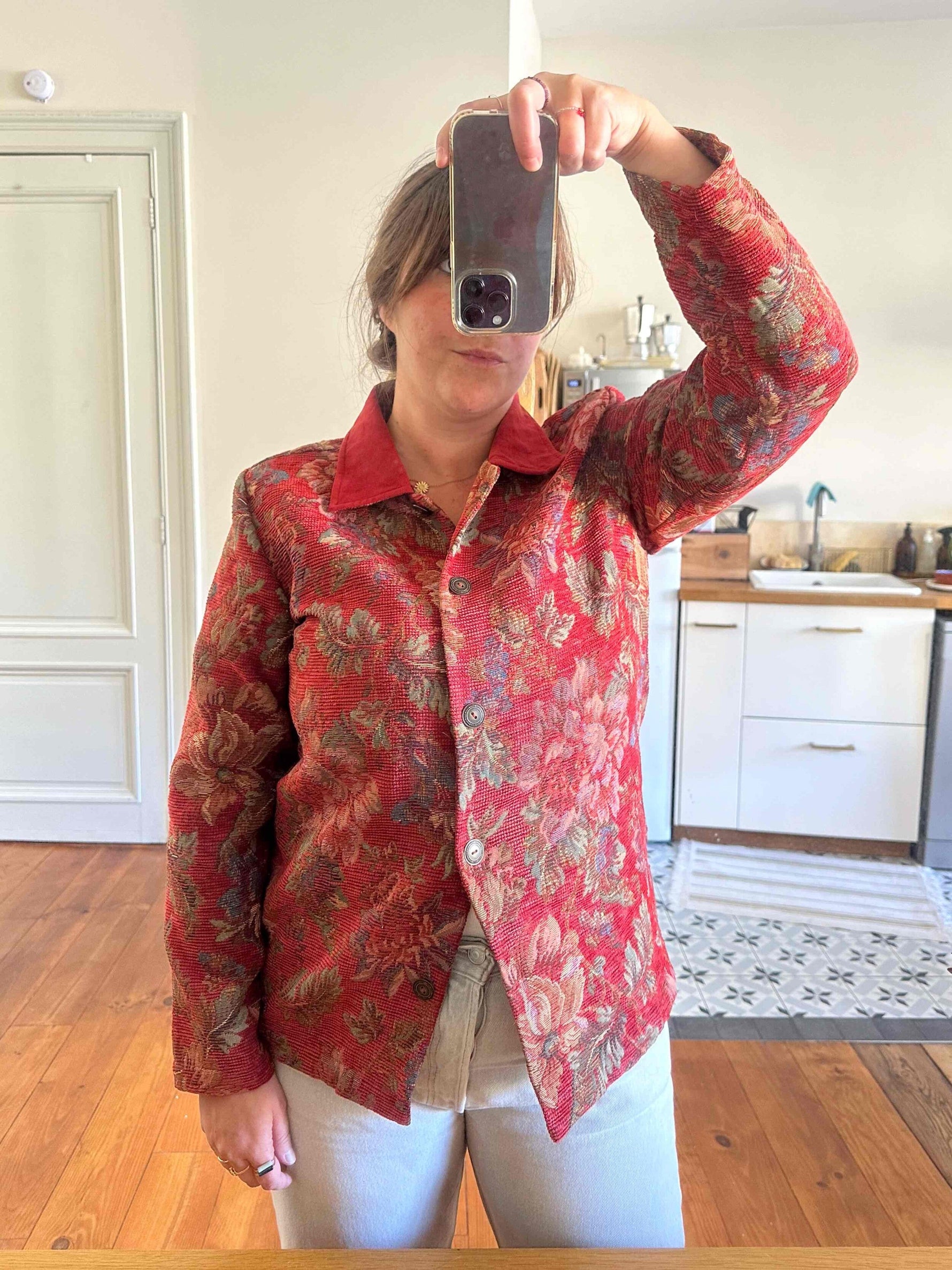 Veste à fleurs en velours, jacquard de velours de coton mélangé fleuri rouge, et col velours ras, années 90s, taille 38 portée ici ouverte sur une personne T40.
