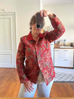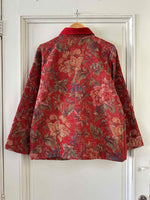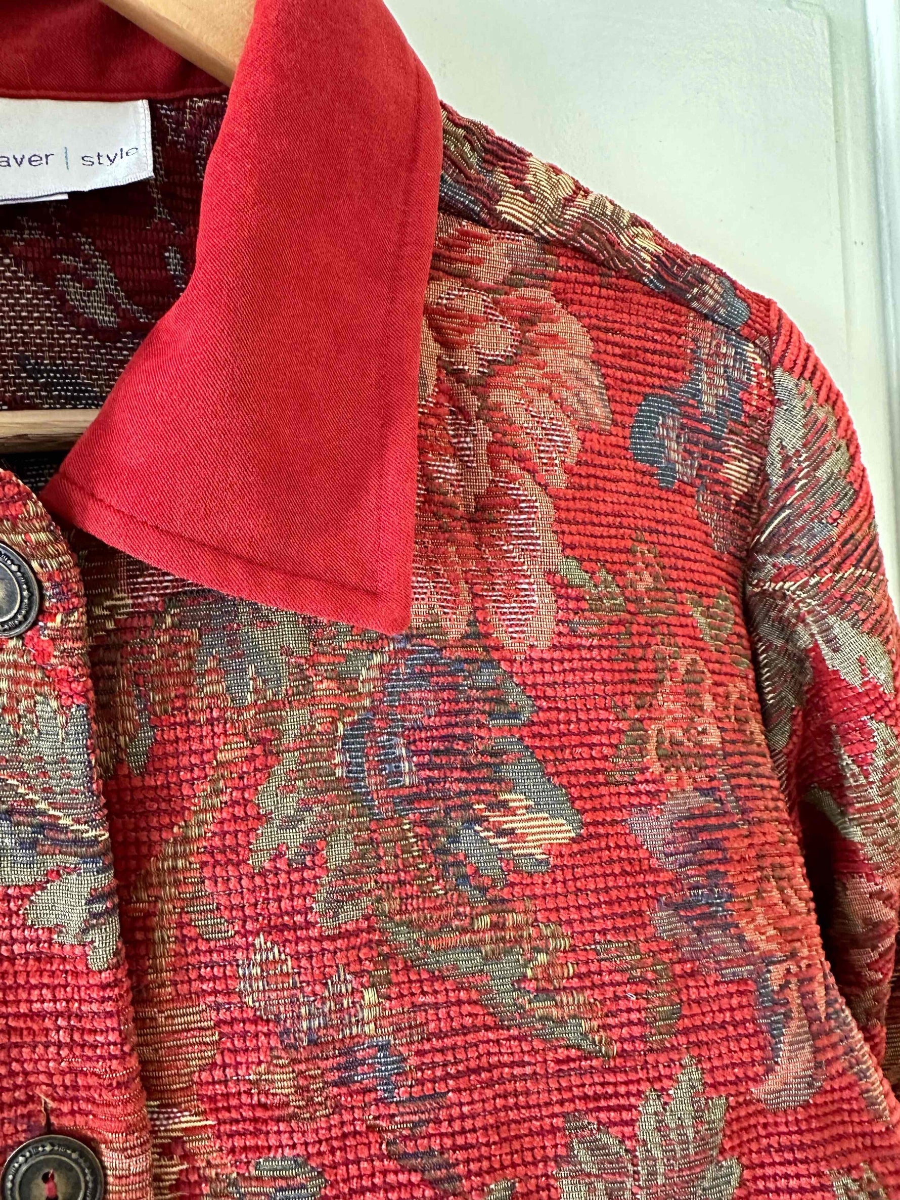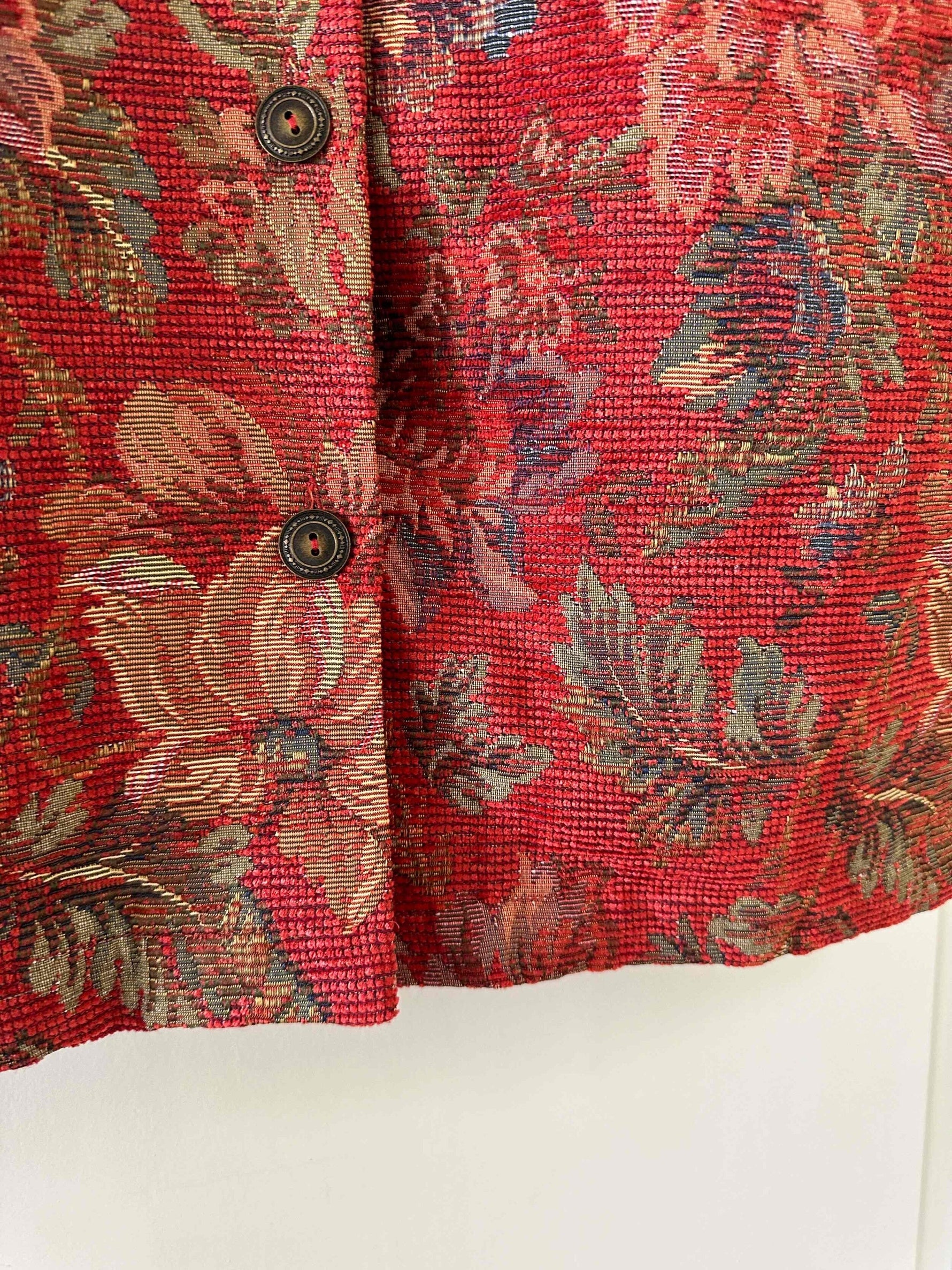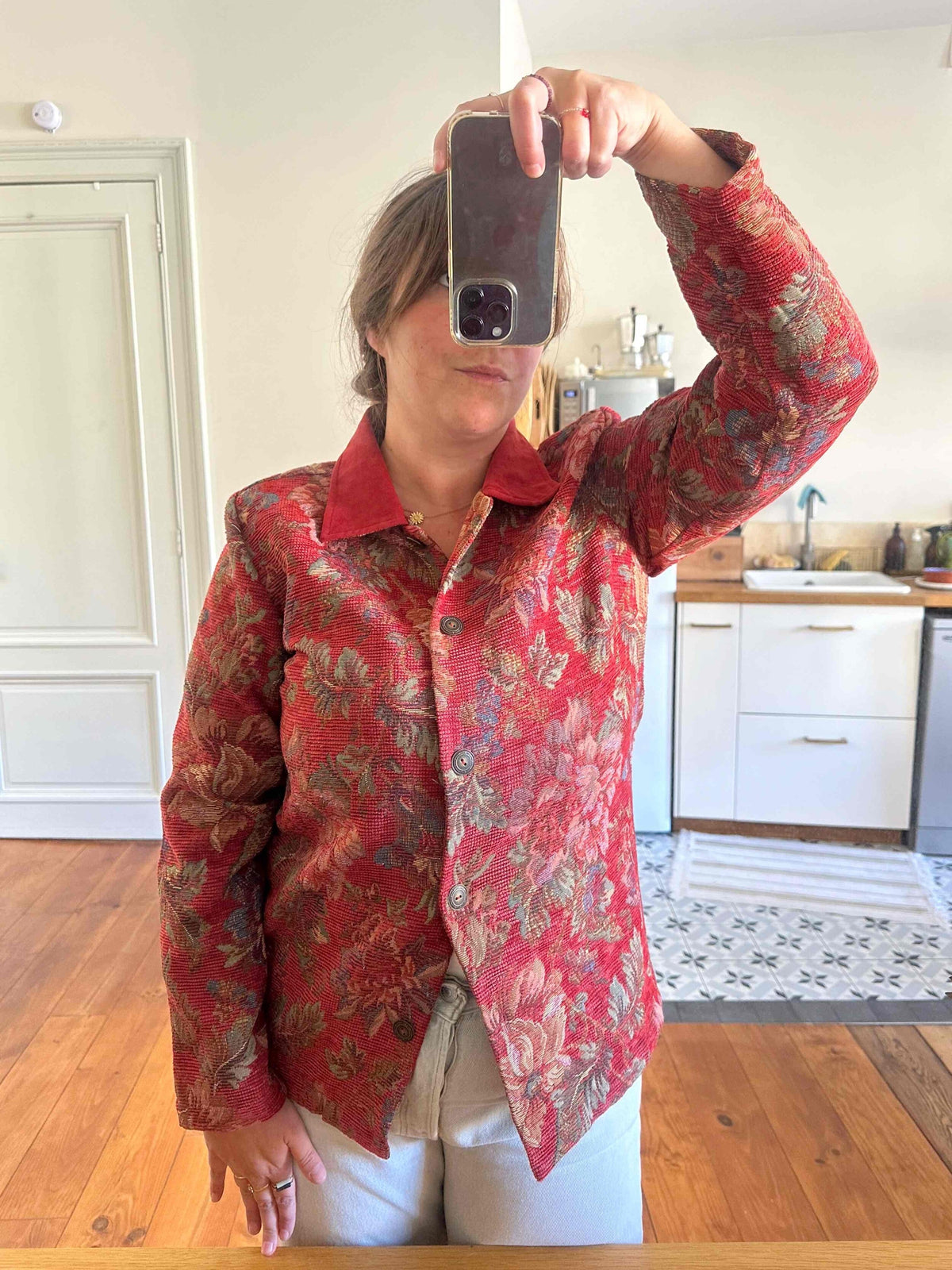 Veste à fleurs en velours, jacquard de velours de coton mélangé fleuri rouge, et col velours ras, années 90s, taille 38 portée ici ouverte sur une personne T40.