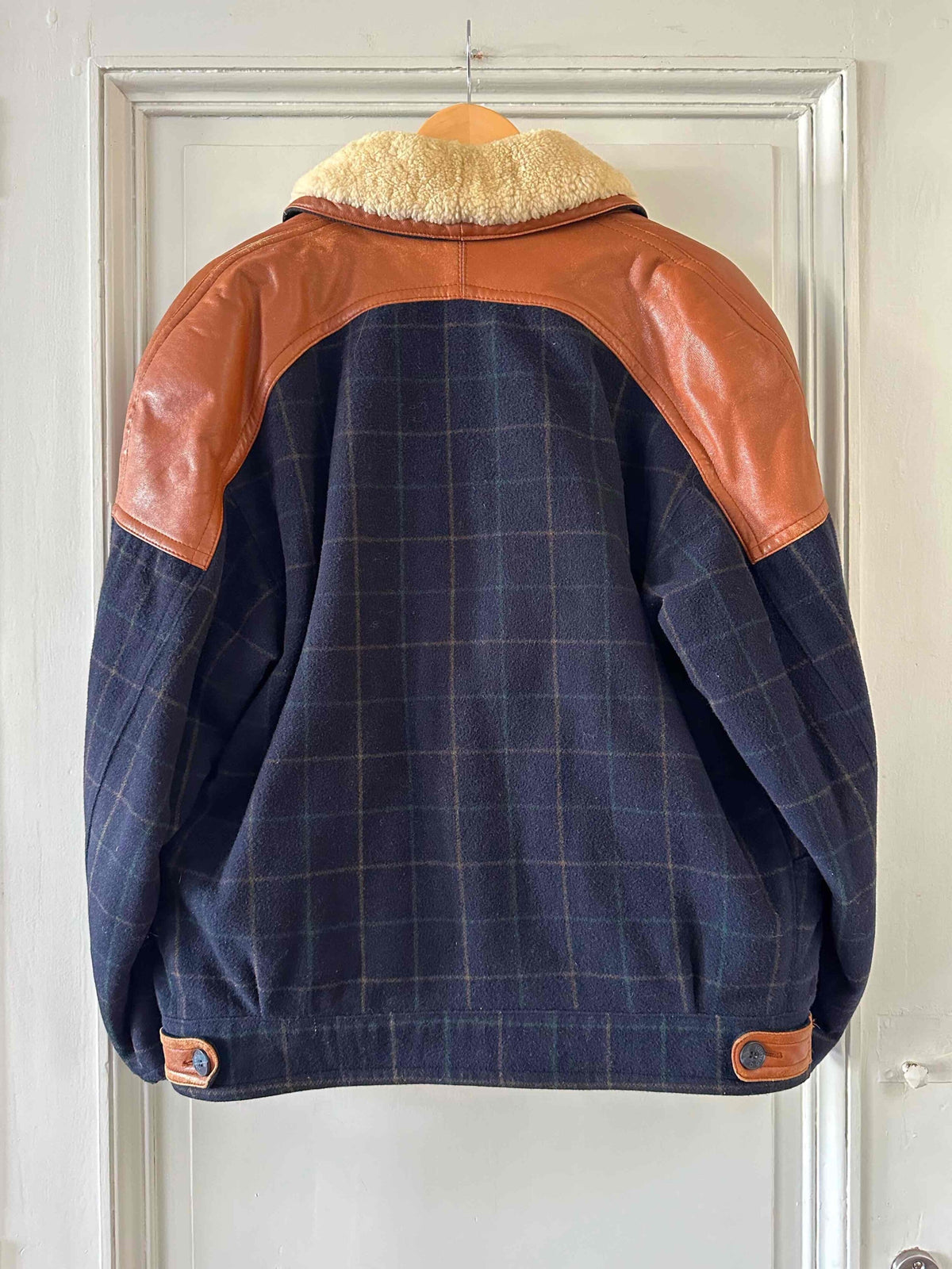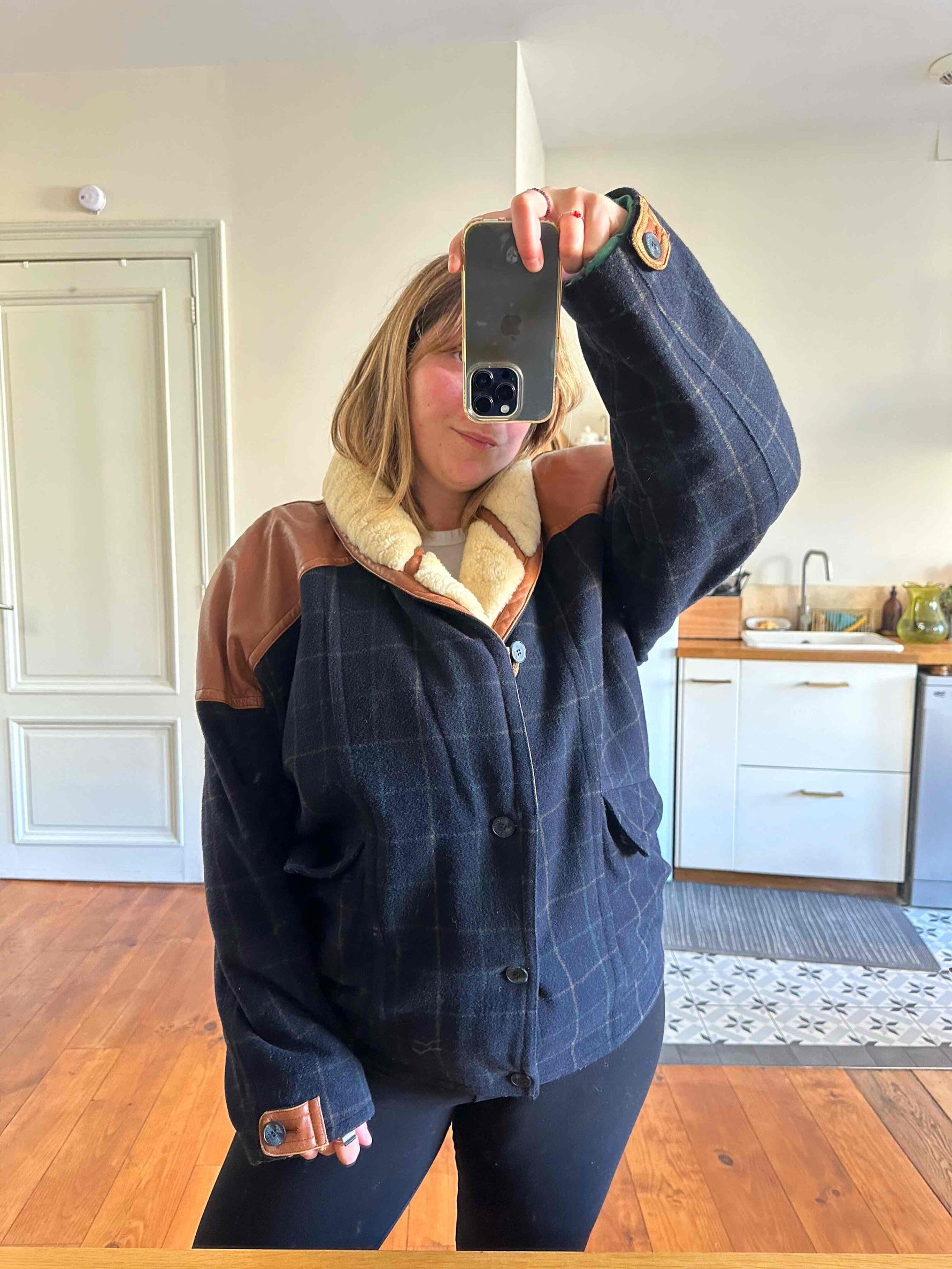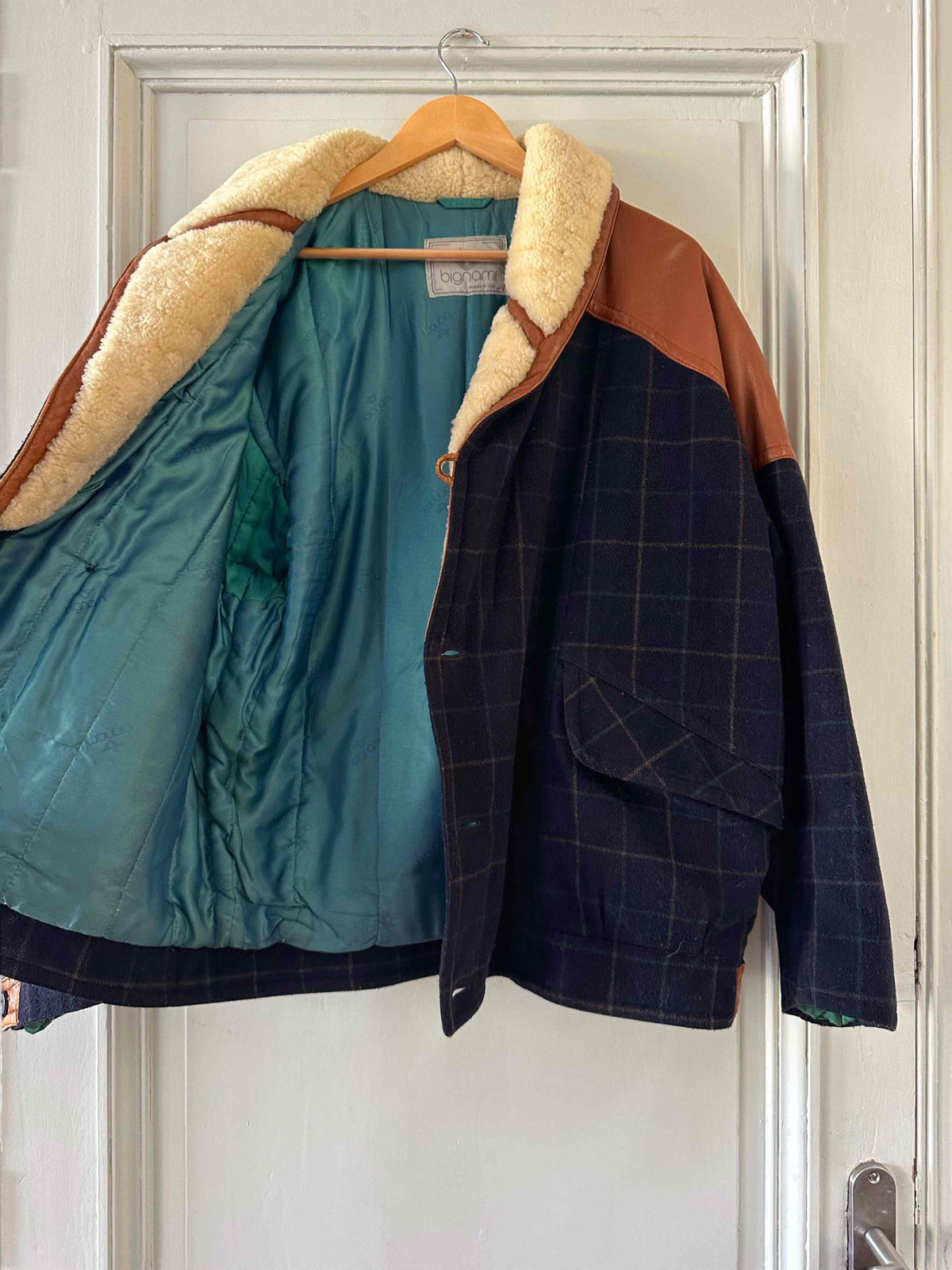Prix unitaire parBlouson peau lainée, en 100% laine bleu foncé carreaux écossais verts et camel, empiecement en cuir cognac, et col en laine de mouton retourné, intérieur matelassé, fabriqué en Italie, convient aux tailles 38 et 40 porté ici sur une personne T40.