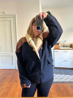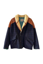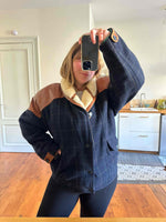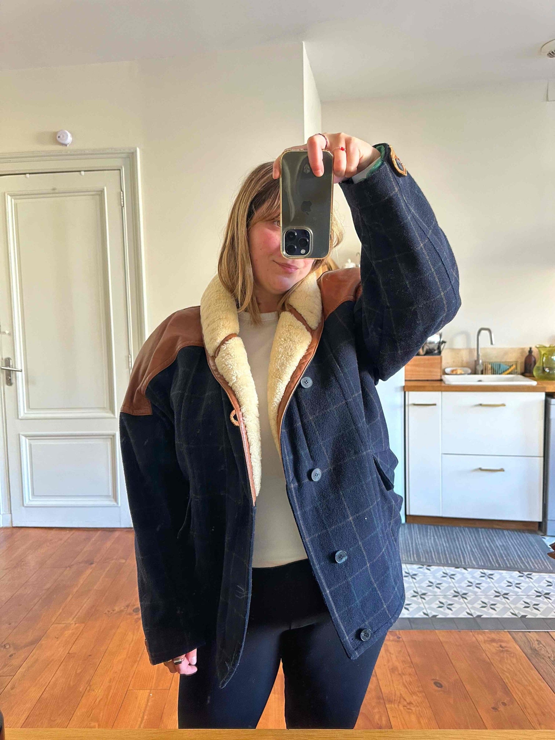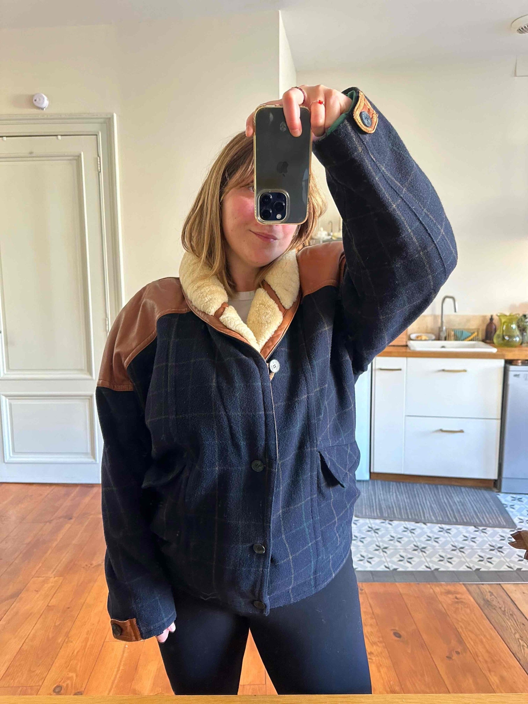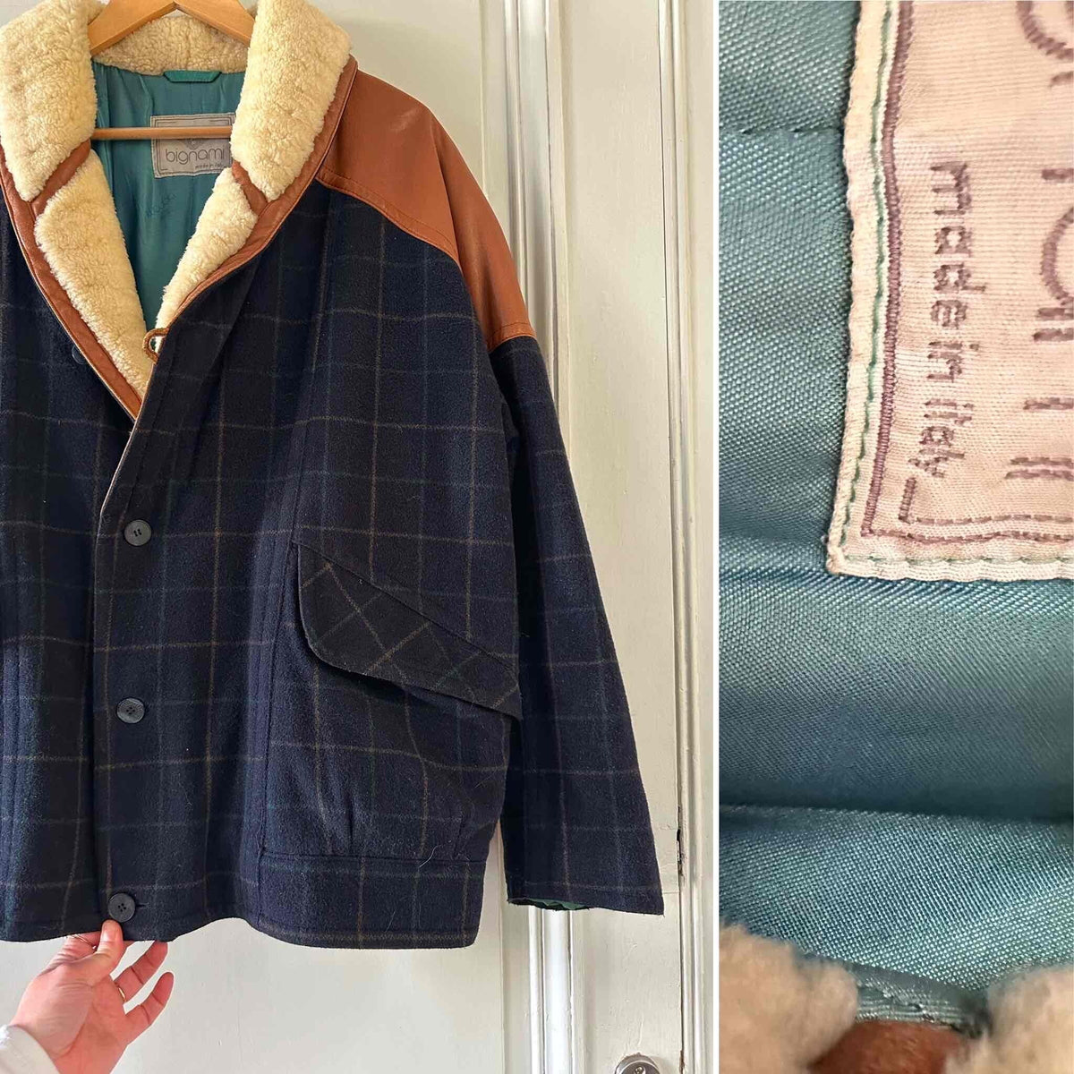 Prix unitaire parBlouson peau lainée, en 100% laine bleu foncé carreaux écossais verts et camel, empiecement en cuir cognac, et col en laine de mouton retourné, intérieur matelassé, fabriqué en Italie, convient aux tailles 38 et 40 porté ici sur une personne T40.