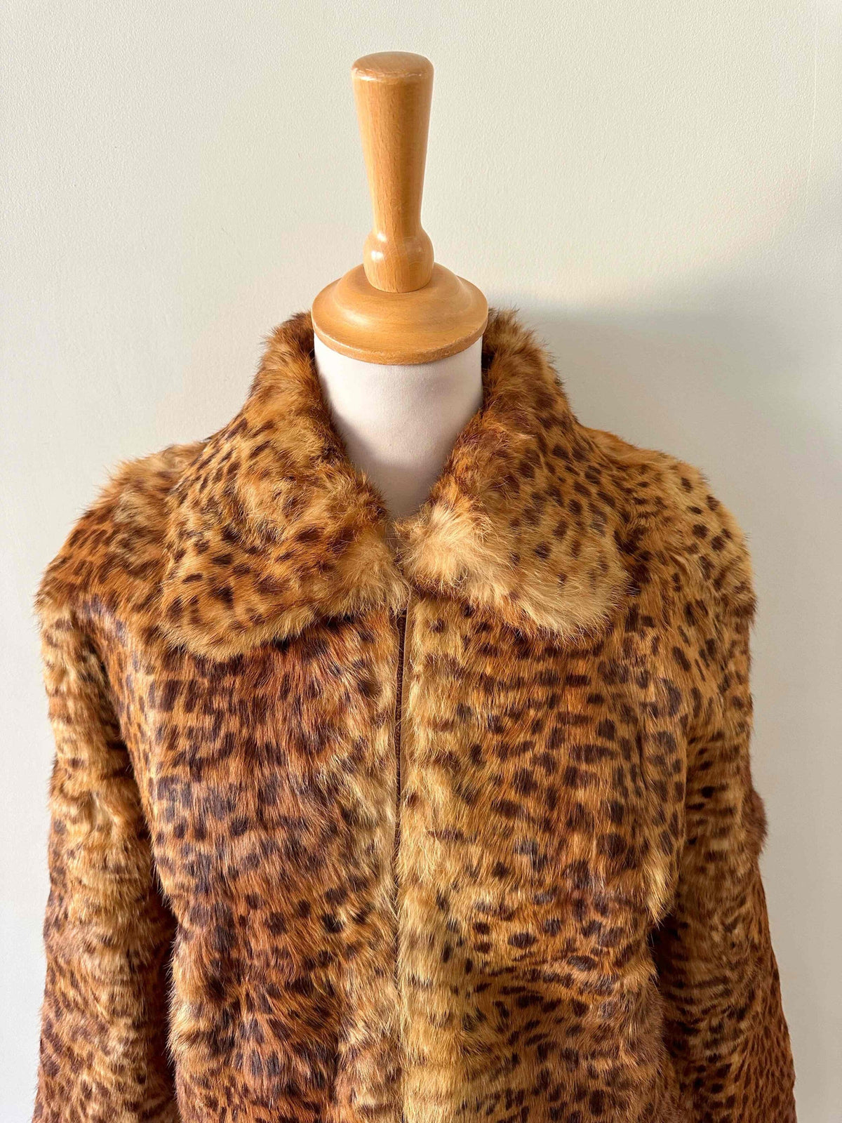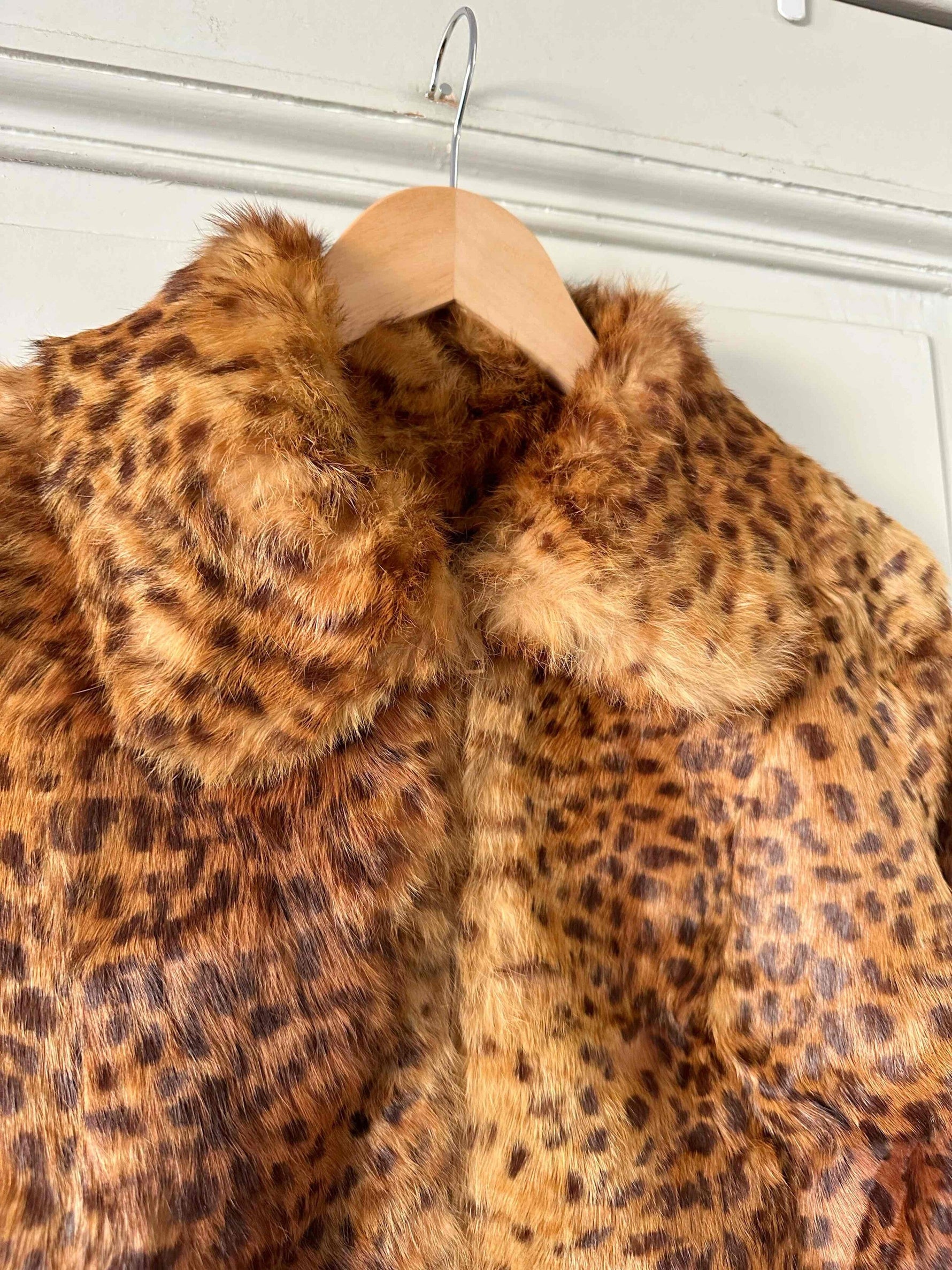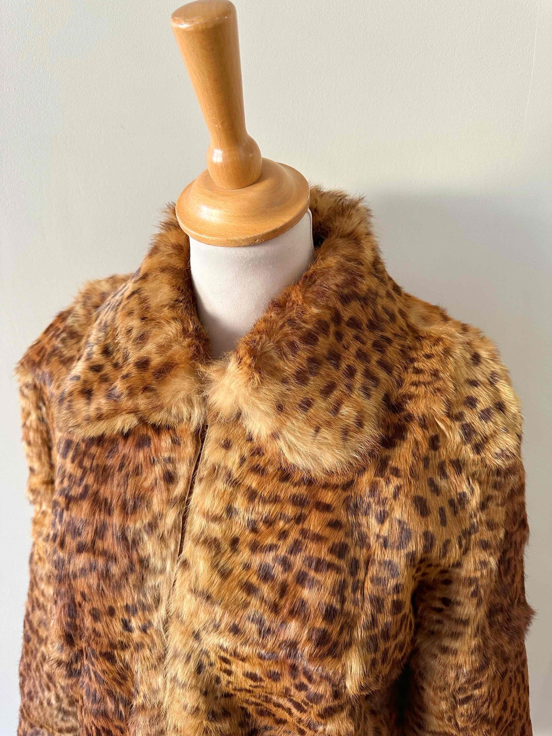 Blouson en fourrure leopard, fourrure de lapin motif leopard, col claudine, forme courte, fermeture éclair, fabriqué artisanalement en Italie, convient aux tailles 34 et 36 porté ici sur un mannequin T36.