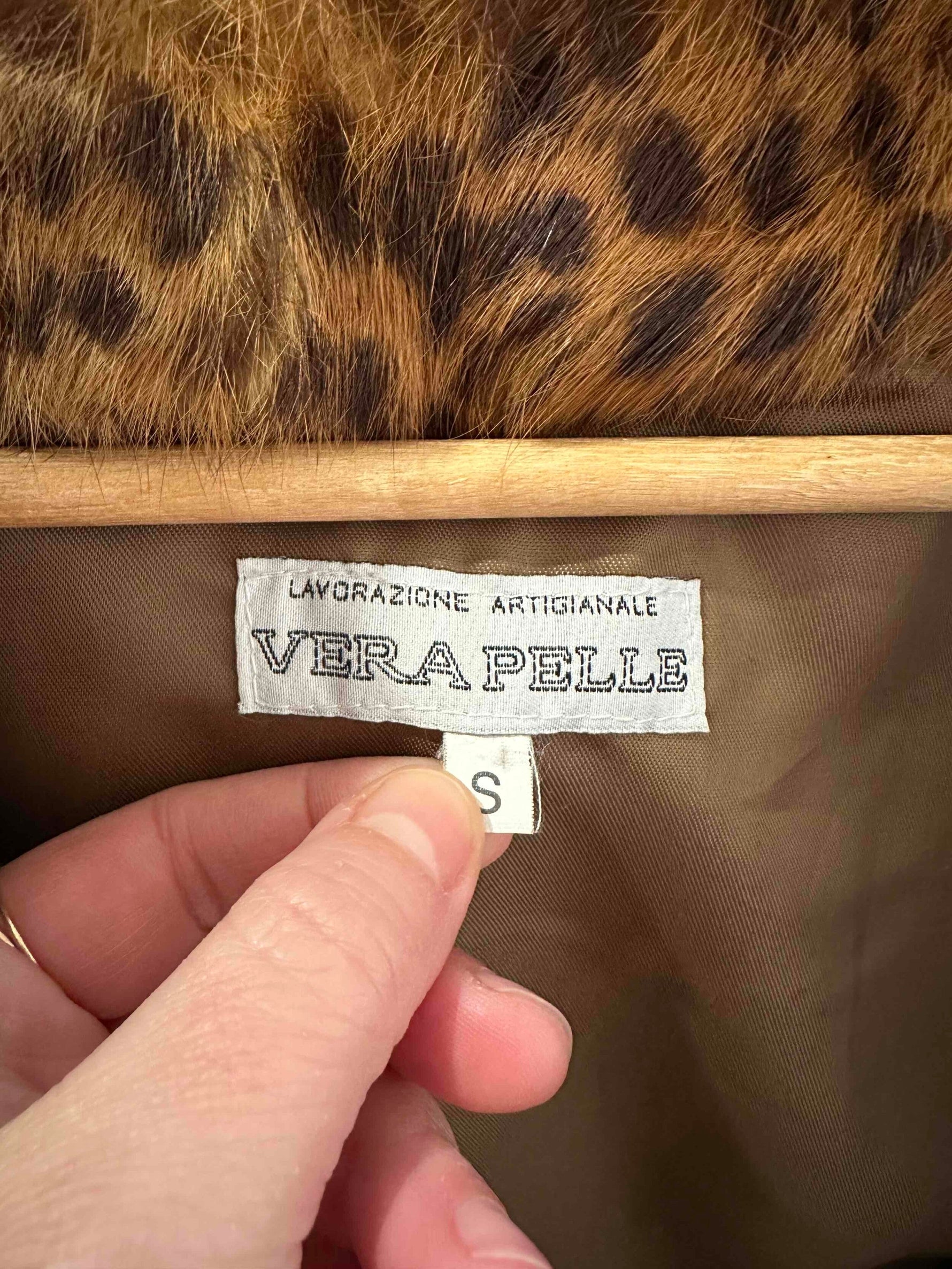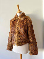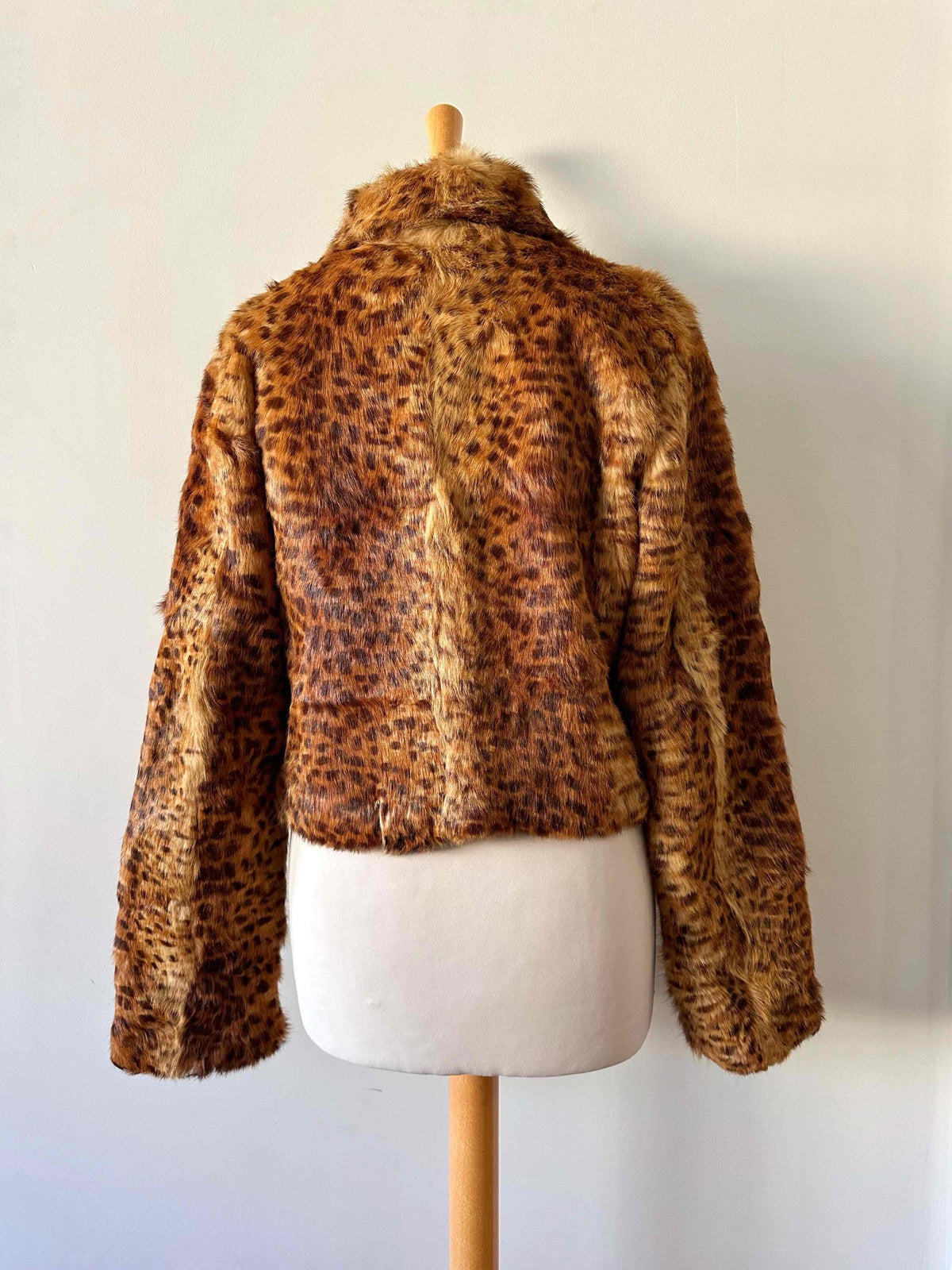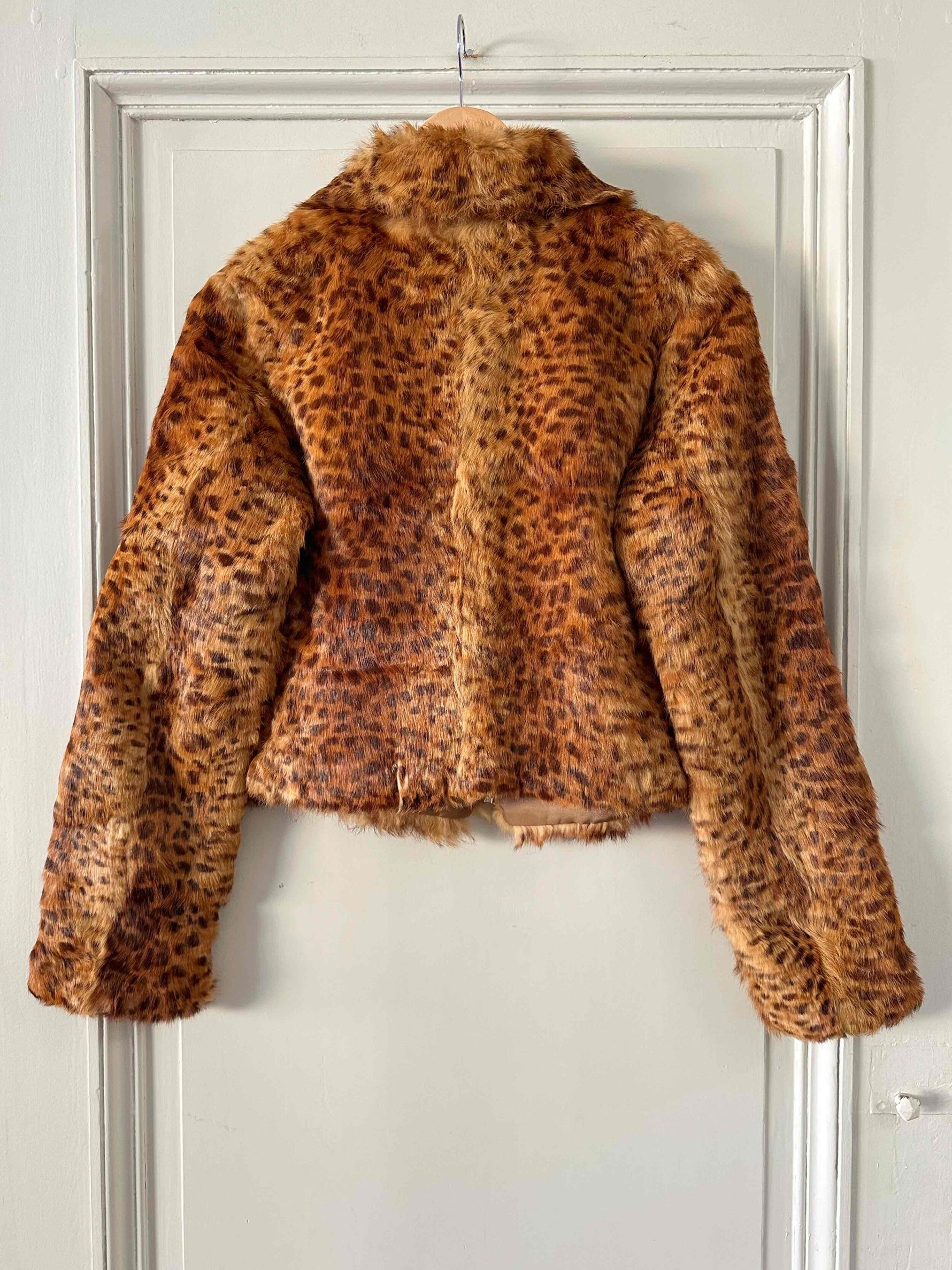 Blouson en fourrure leopard, fourrure de lapin motif leopard, col claudine, forme courte, fermeture éclair, fabriqué artisanalement en Italie, convient aux tailles 34 et 36 porté ici sur un mannequin T36.