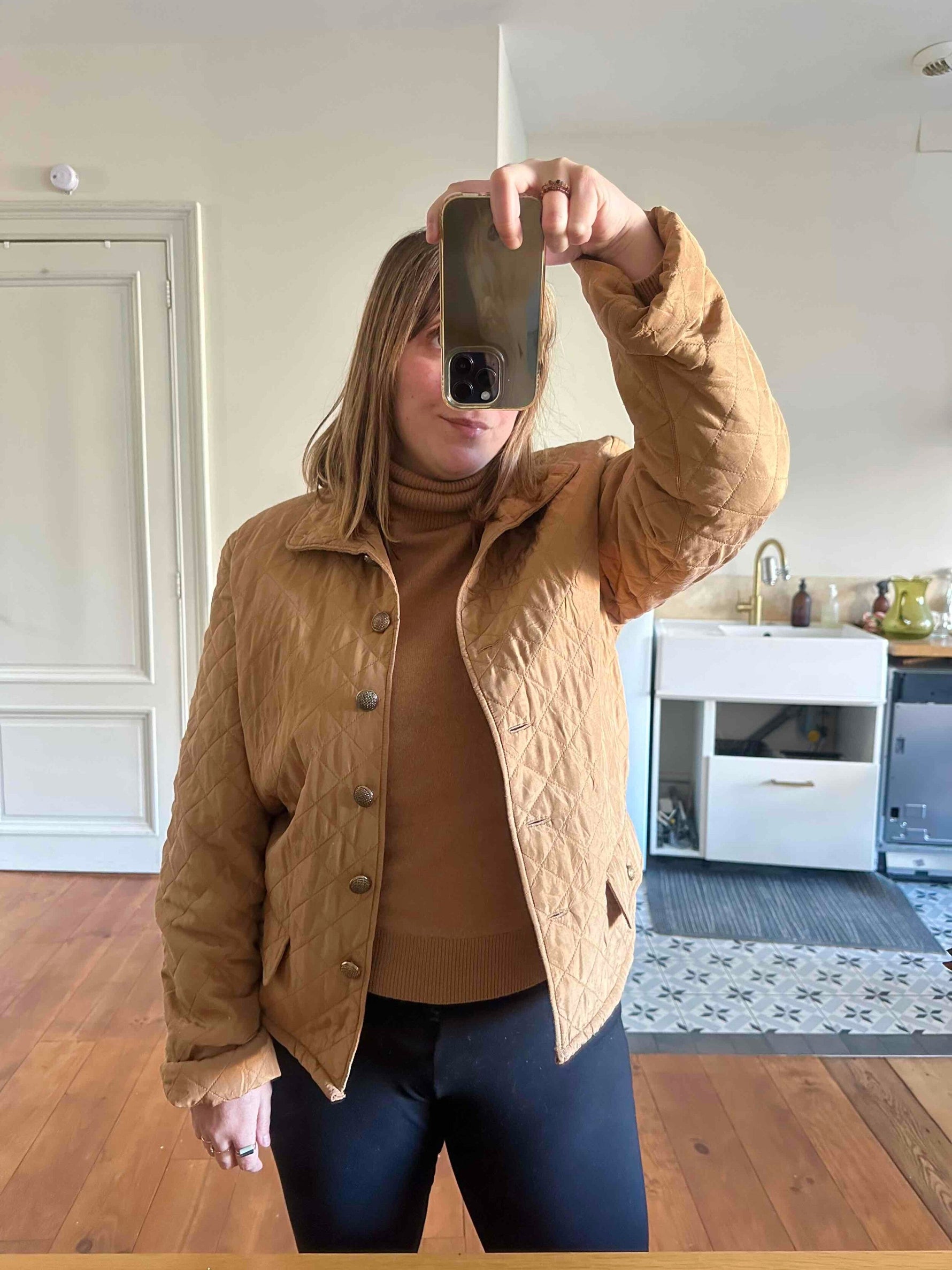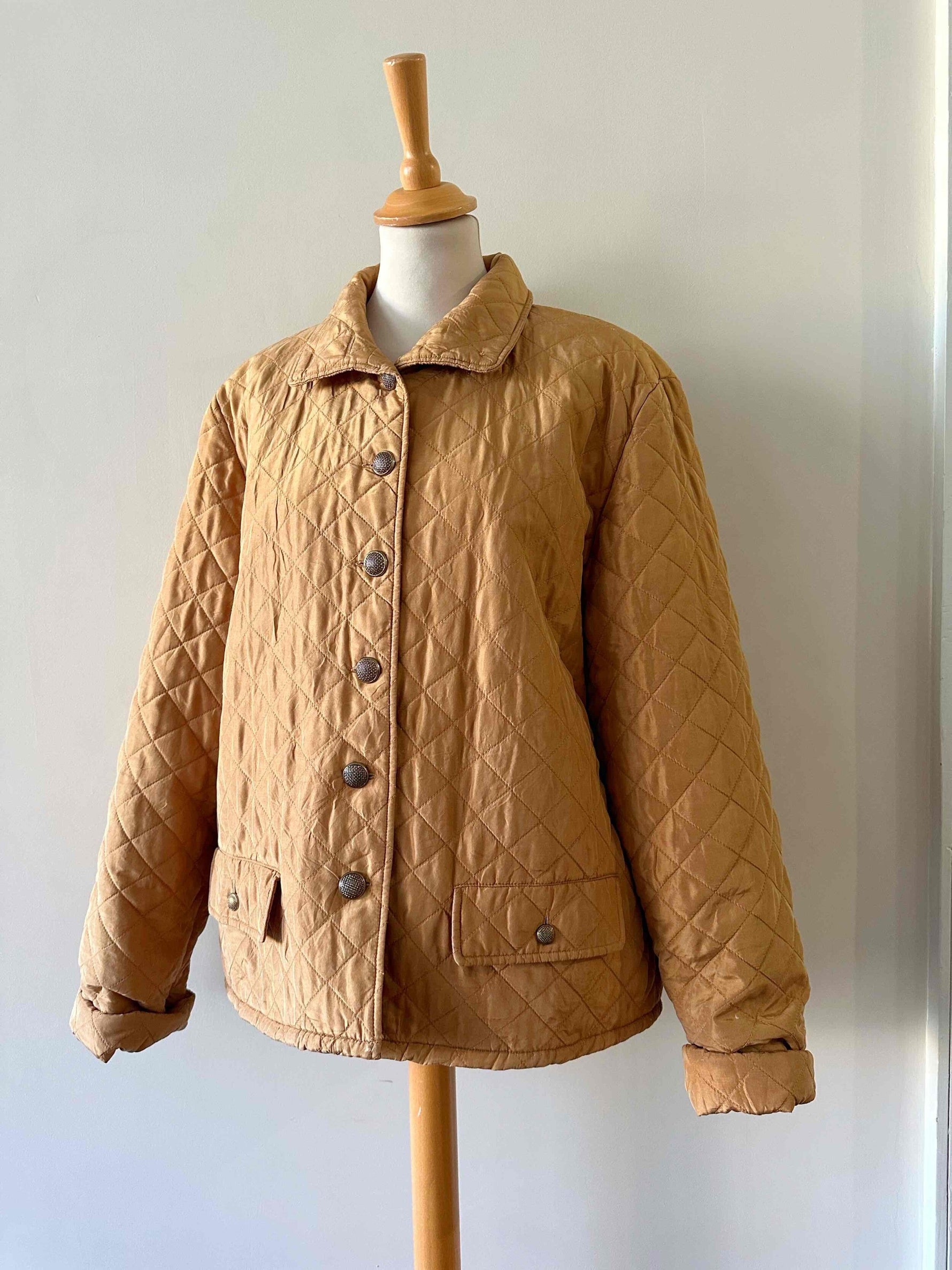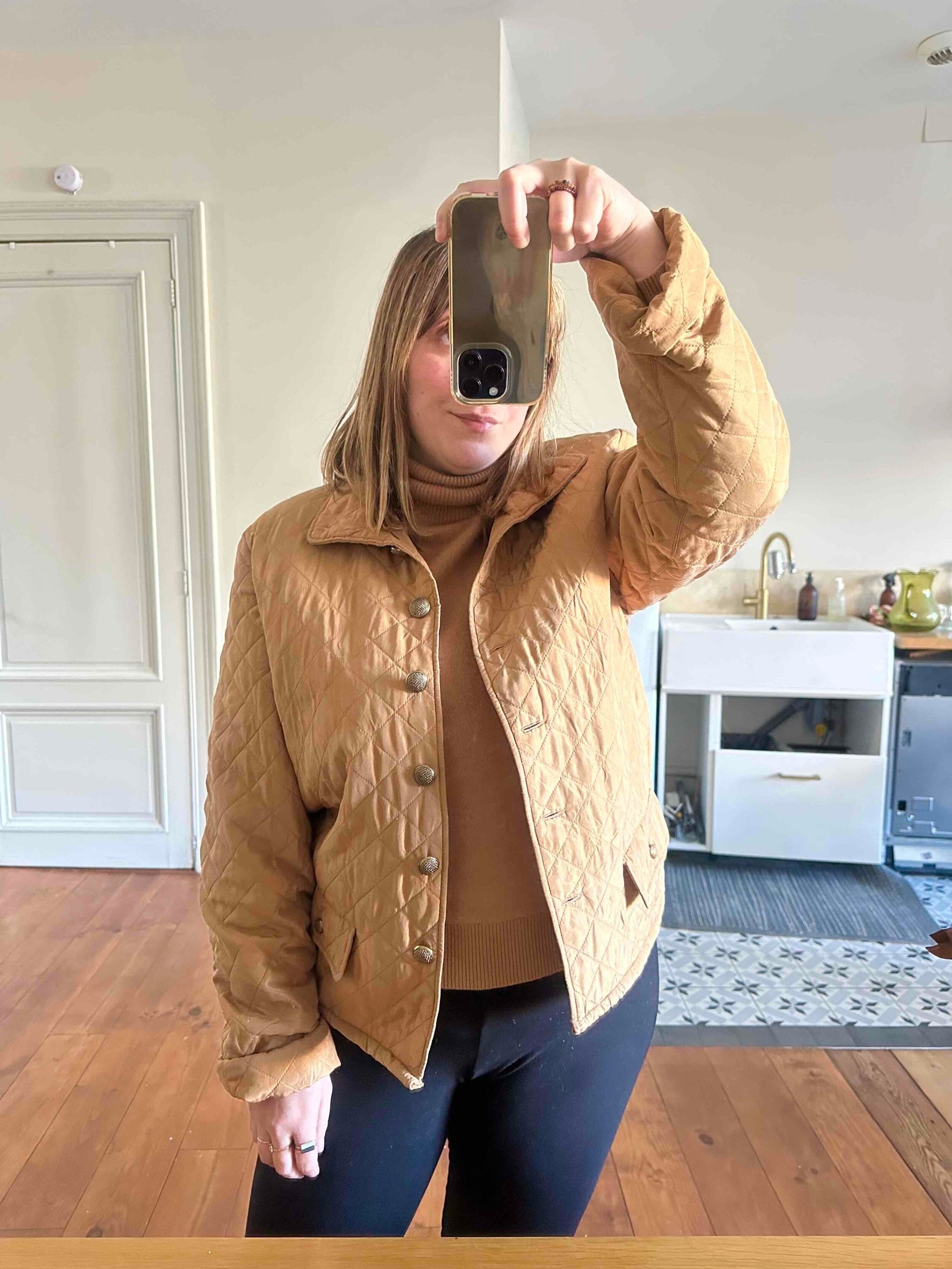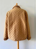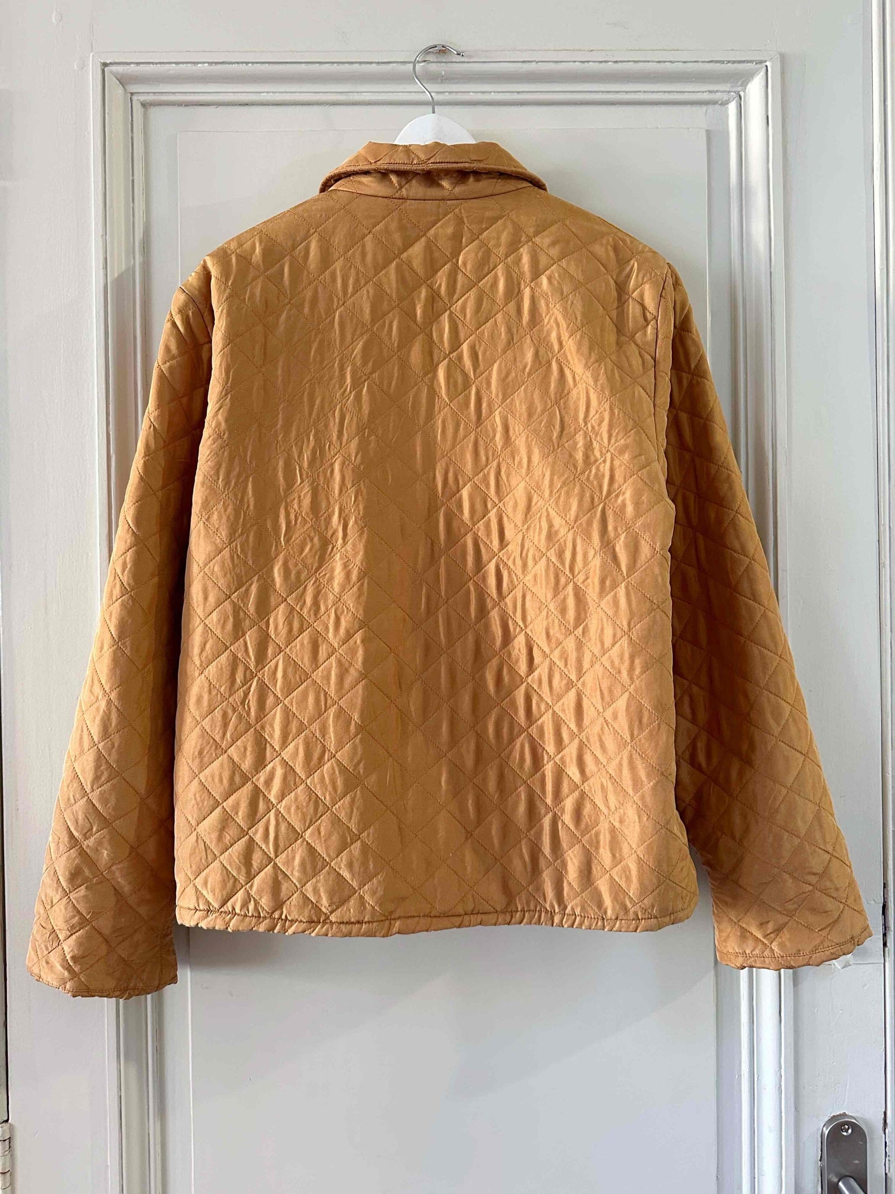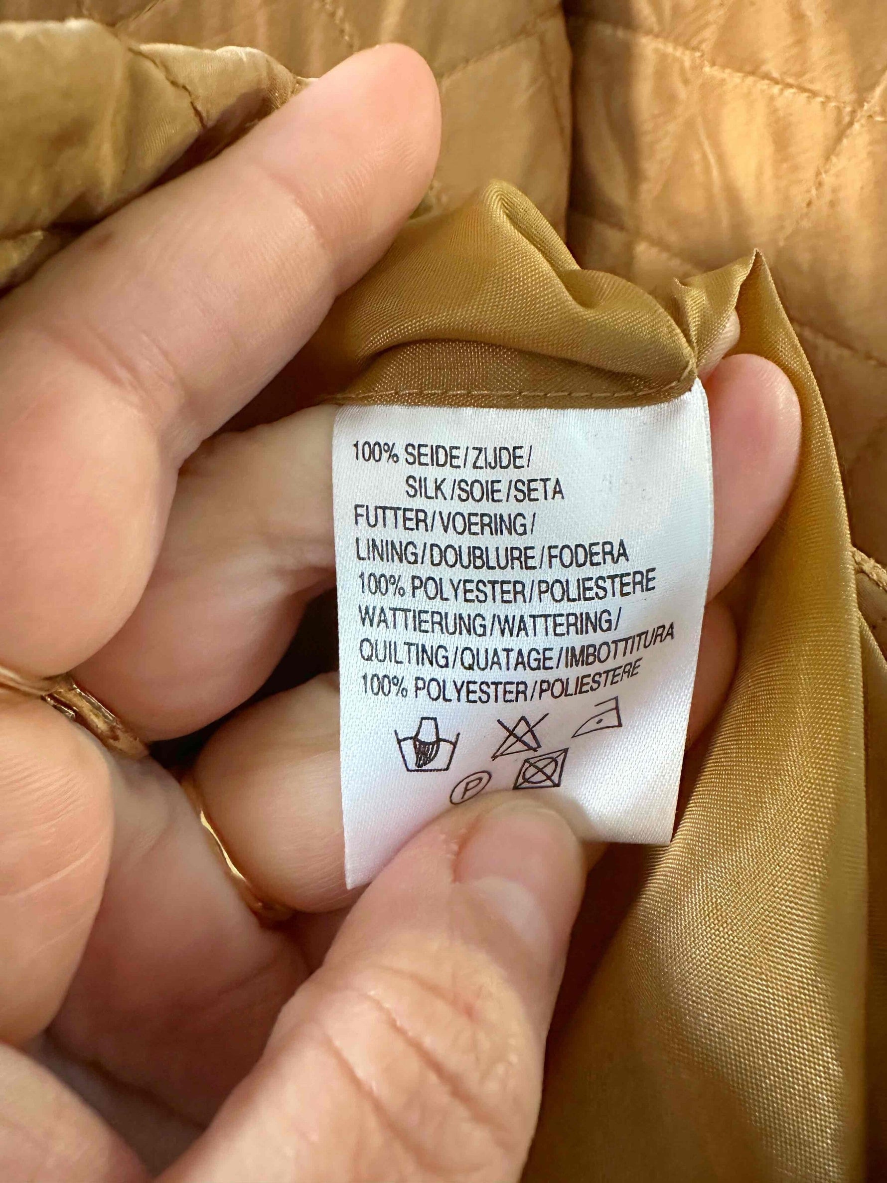 Prix unitaire parDoudoune en soie, 100% soie camel doré, matelassé croisillons et ouatinée, boutons bijoux dorés, forme courte, revers aux manches, années 90s, convient aux tailles 36 et 38 portée ici sur un mannequin T36 et ouverte sur une personne T40.