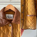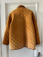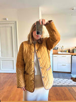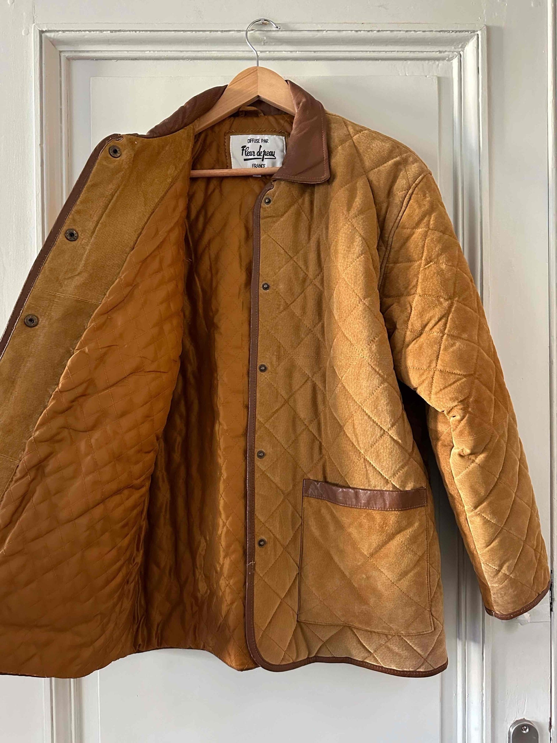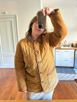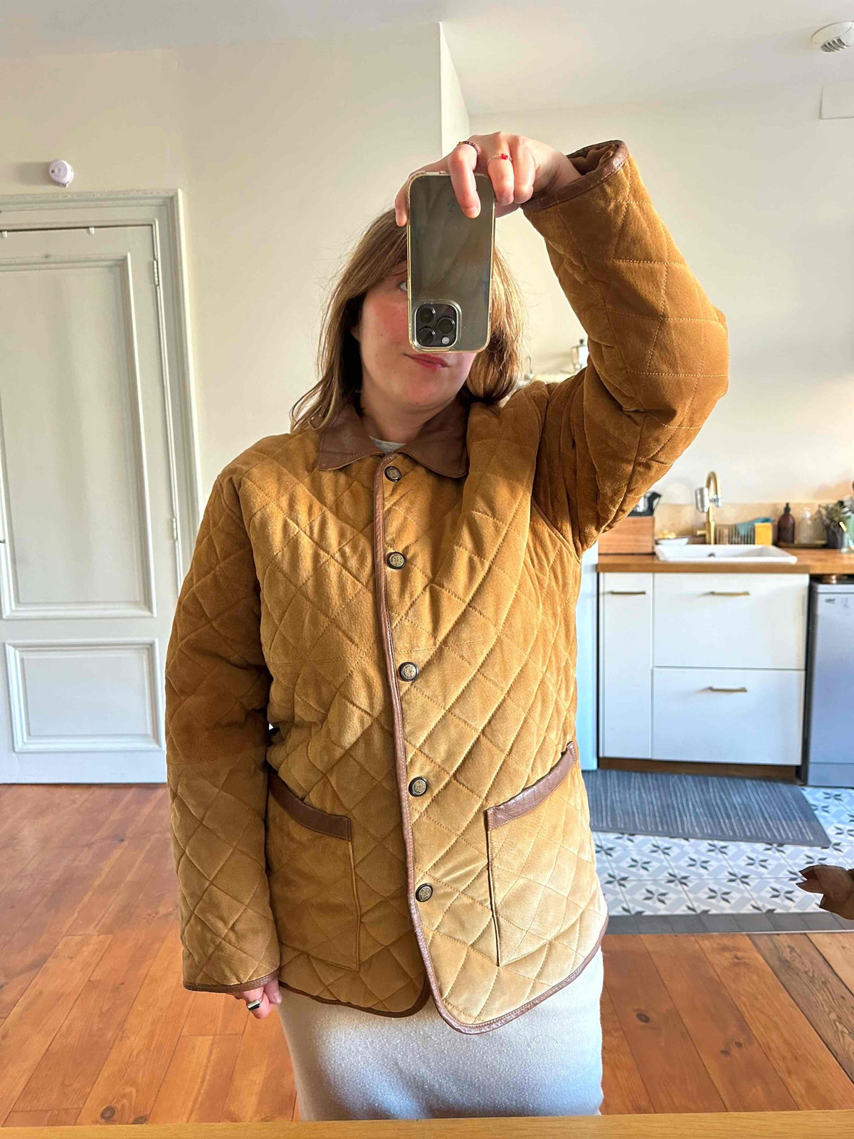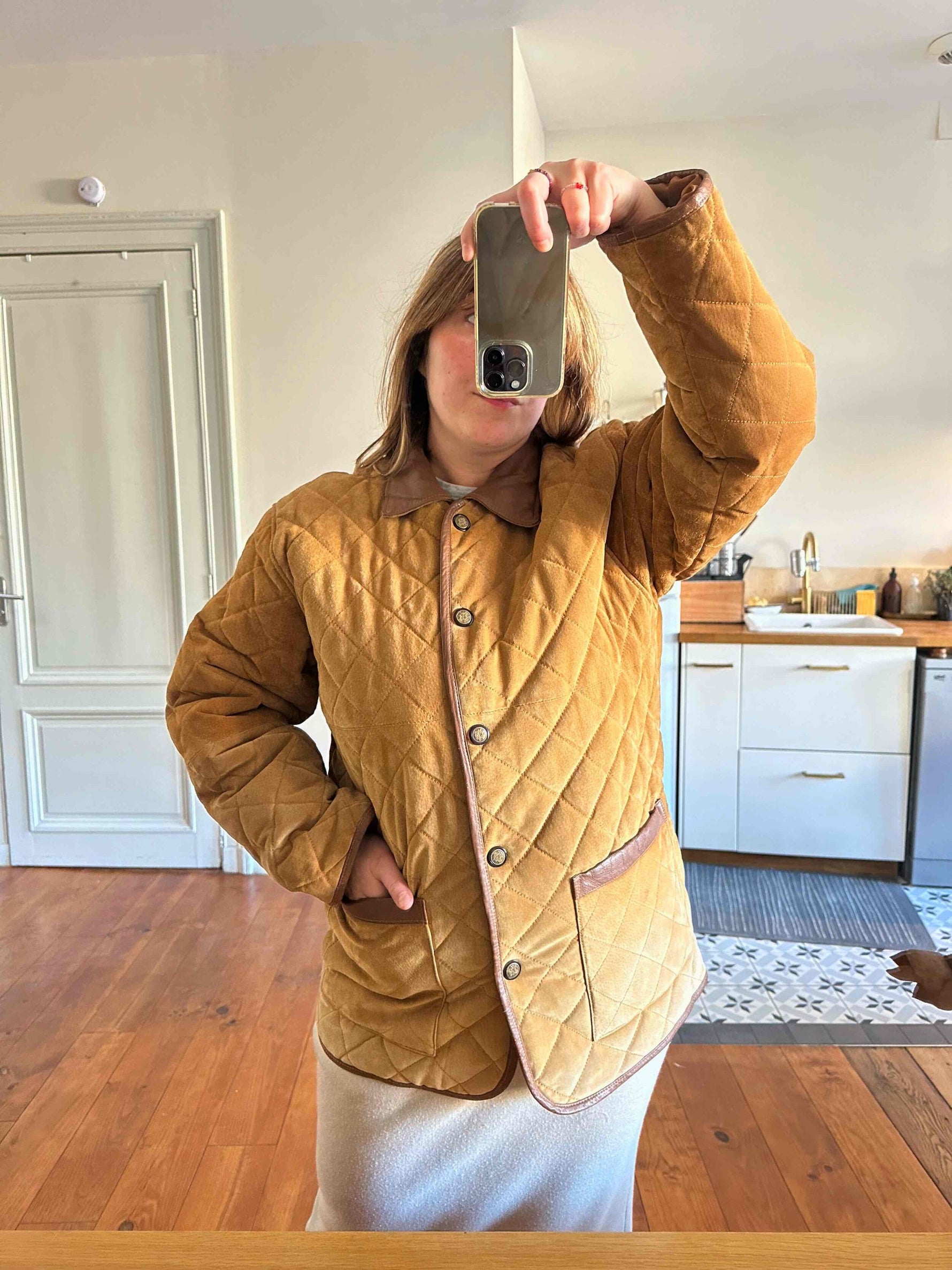 Prix unitaire parVeste matelassée en daim, daim cognac matelassé croisillons et rembourrage ouate, col et passepoils en cuir lisse caramel, forme esprit Barn Jacket, fabriquée en France, convient aux tailles 38 et 40 portée ici sur un mannequin T36 et sur une personne T40.