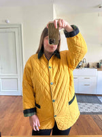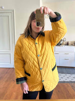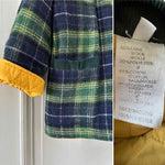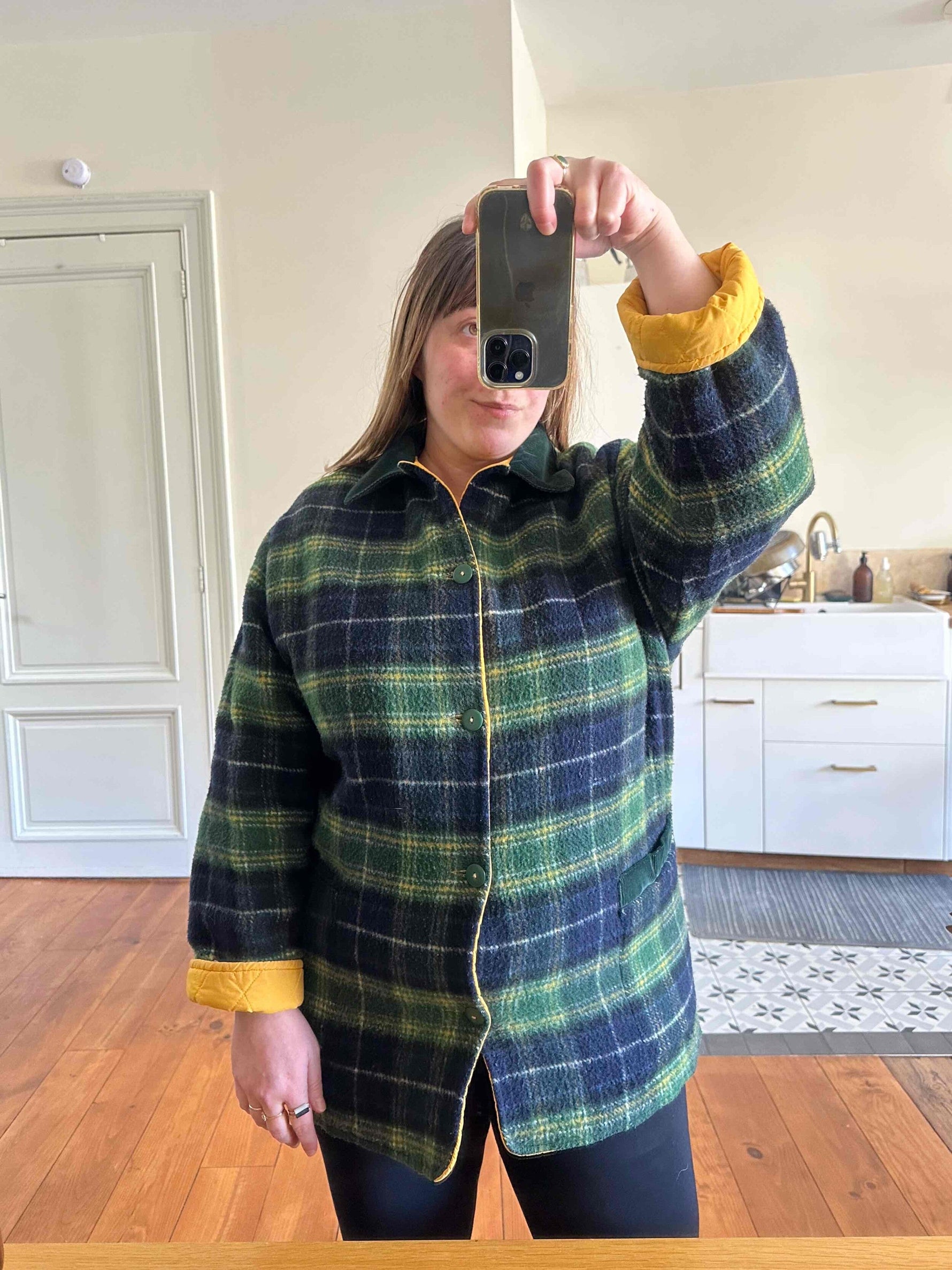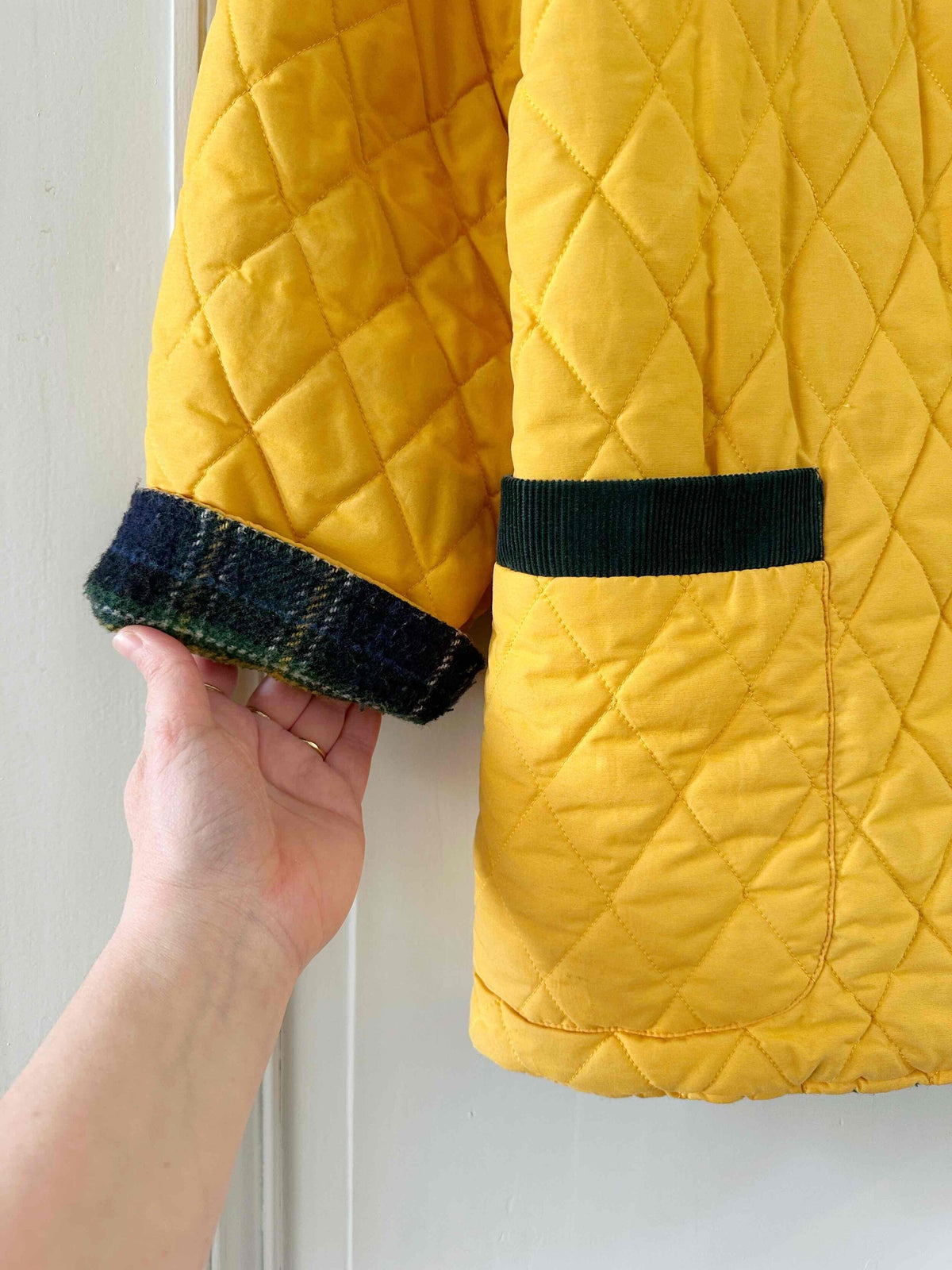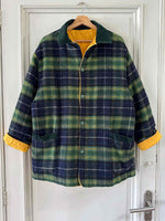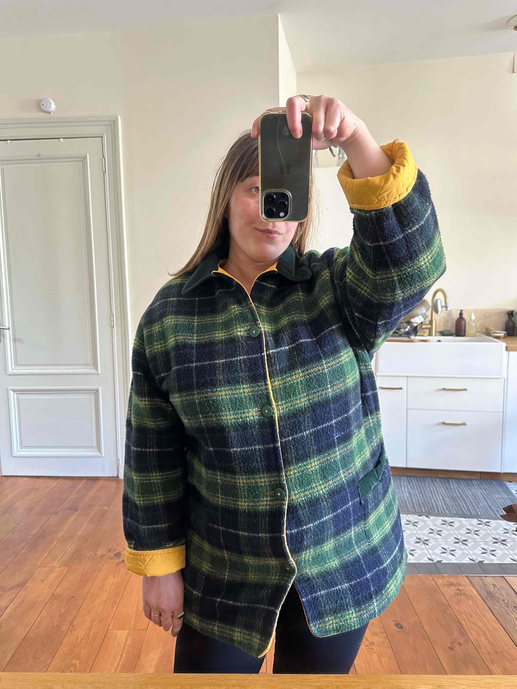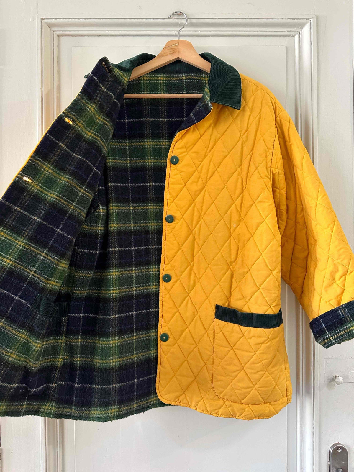 Prix unitaire parVeste matelassée réversible, jaune réversible en laine motifs tartan écossais, col et bordures de poches en velours côtelé vert bouteille, esprit barn jacket, fabrication française, taille 38 et 40 portée sur une personne T40.