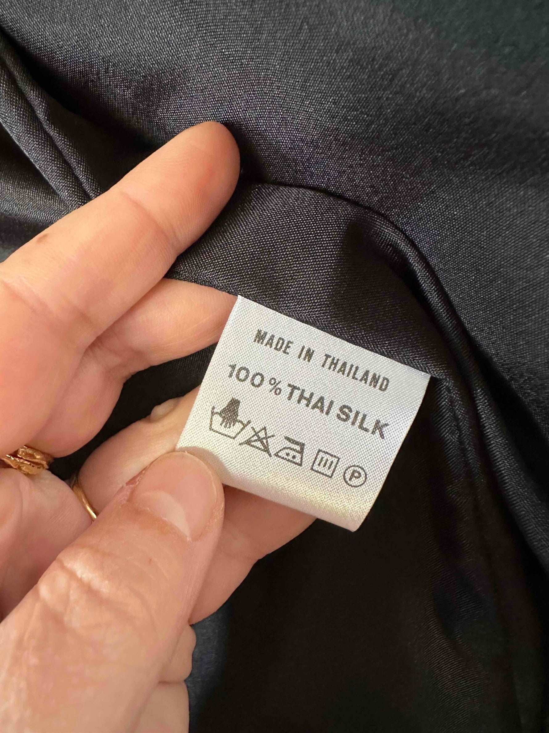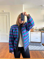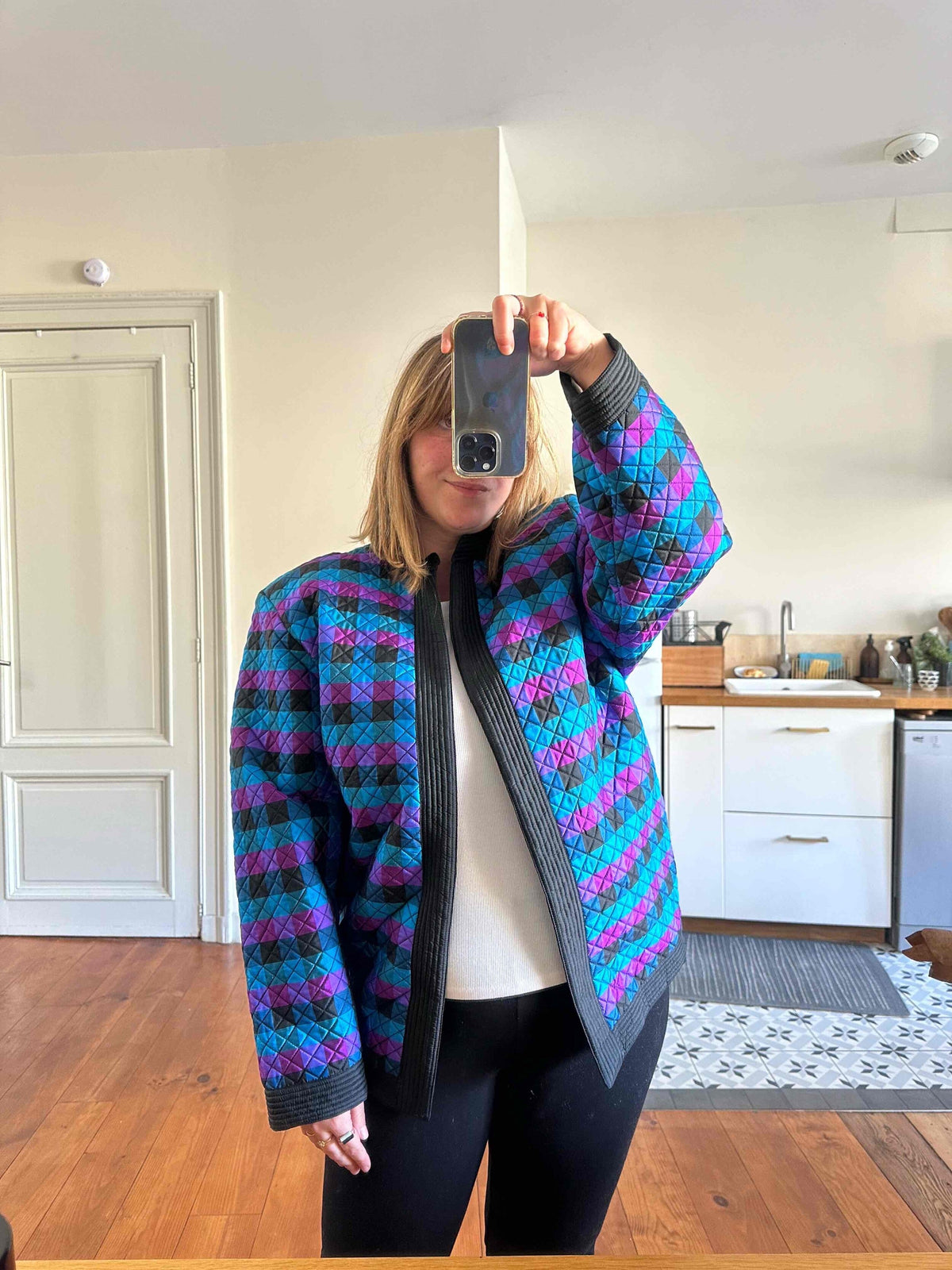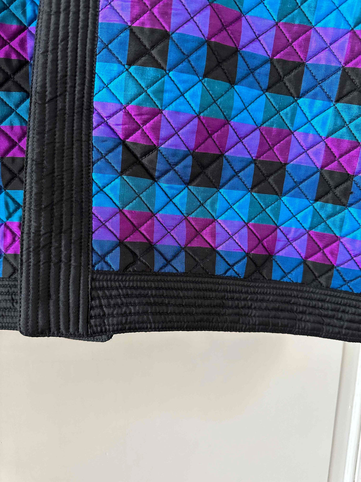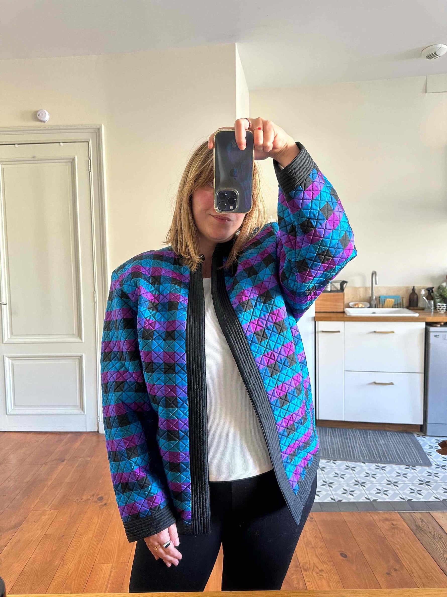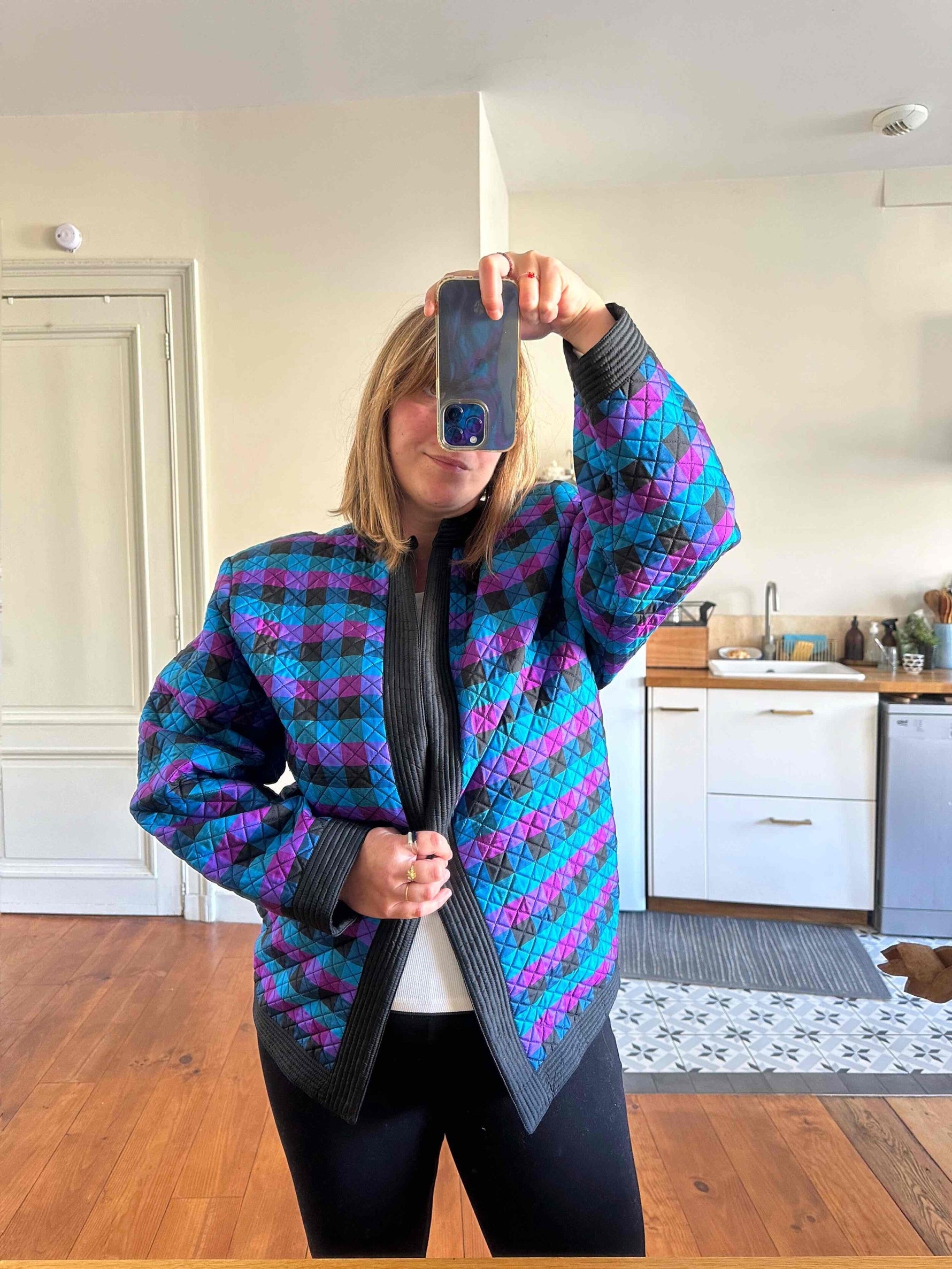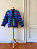 Prix unitaire parVeste matelassée en soie, soie naturelle tissée bleu, fuschia violine et noire, à carreaux, forme et col kimono, fabriquée en Thaïlande, années 80s, convient aux tailles 38 et 40 portée ici sur un mannequin T36 et sur une personne T40.