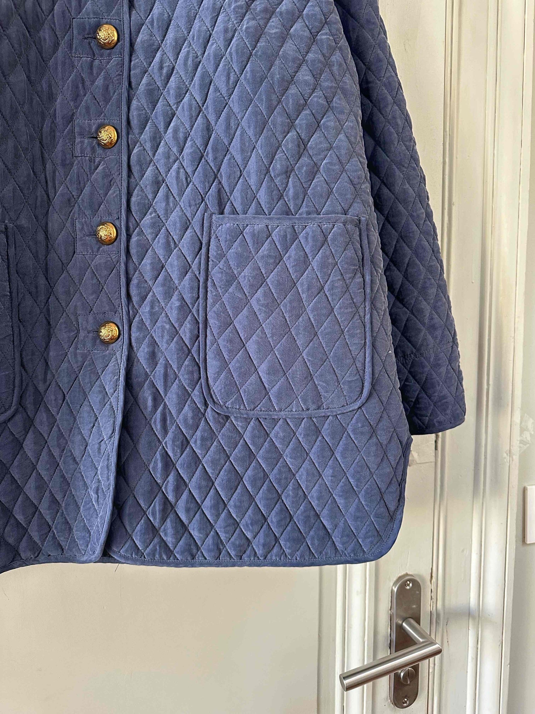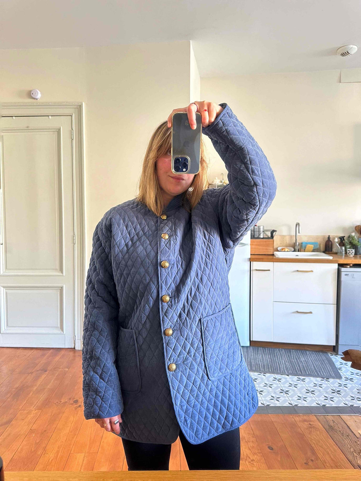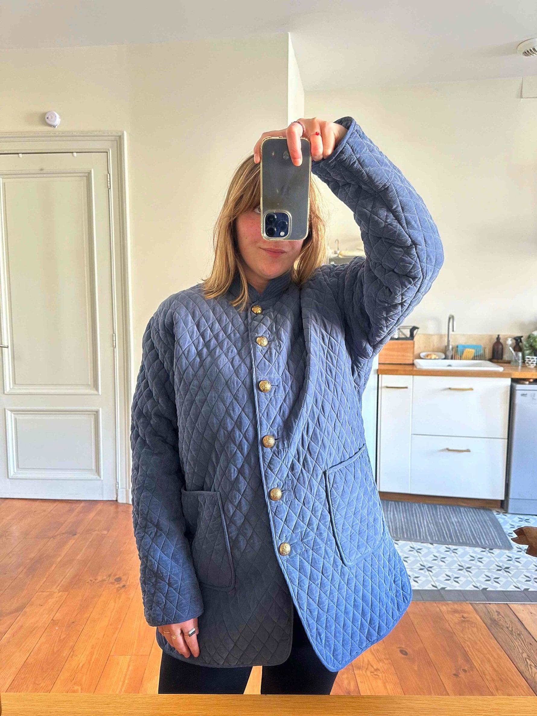 Prix unitaire parVeste matelassée en soie, soie bleu jeans matelassé ouate croisillons, forme esprit barn jacket, boutons dorés marins, années 80s, convient aux tailles 38 et 40 portée ici sur une personne T40.