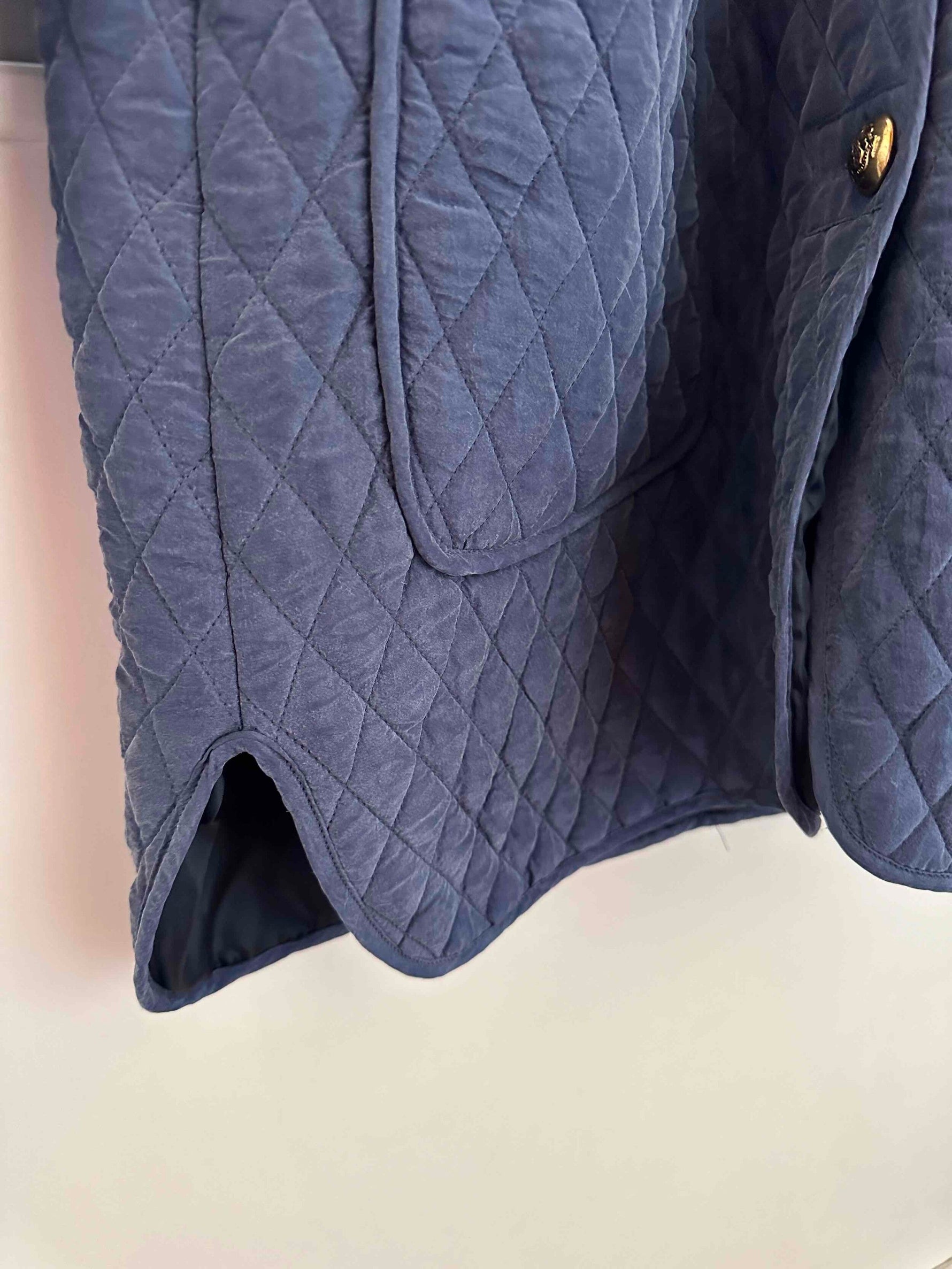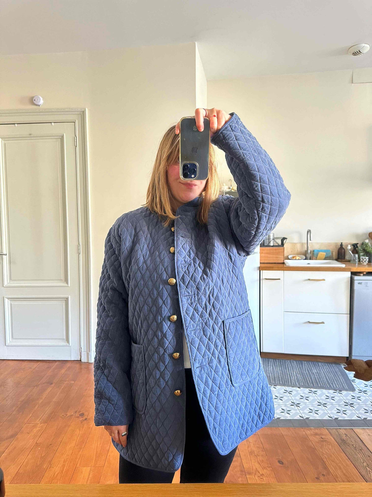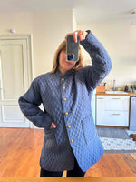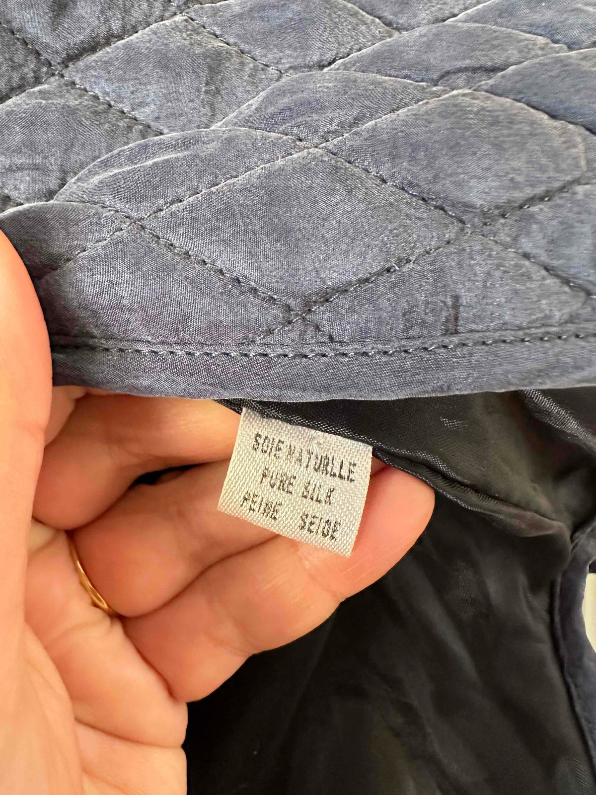 Prix unitaire parVeste matelassée en soie, soie bleu jeans matelassé ouate croisillons, forme esprit barn jacket, boutons dorés marins, années 80s, convient aux tailles 38 et 40 portée ici sur une personne T40.